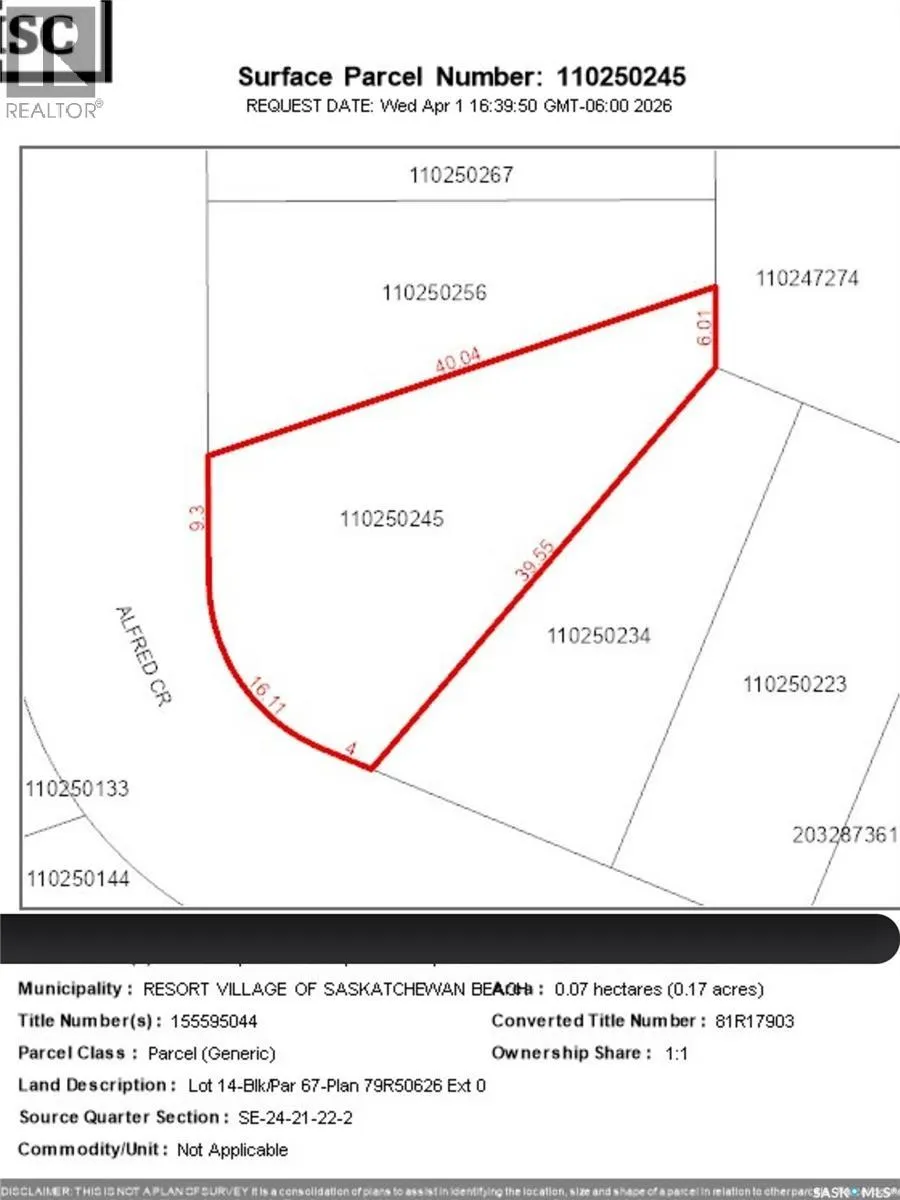 Discover the perfect place to build your dream home or summer getaway at 220 Alfred Crescent. Nestled on a quiet and peaceful crescent in the charming resort community of Saskatchewan Beach, this exceptional flat lot offers .17 acres of space to bring your vision to life. Enjoy the serenity of lake life just a short 40-minute drive from Regina. According to the seller, natural gas and power run conveniently along the crescent, making this an ideal site for development. Whether you're dreaming of a seasonal cottage retreat or a year-round residence, this lot offers the ideal backdrop for relaxed living, surrounded by nature and just minutes from the beach and community amenities. Build your future hereâtranquility and potential await! (id:27476)