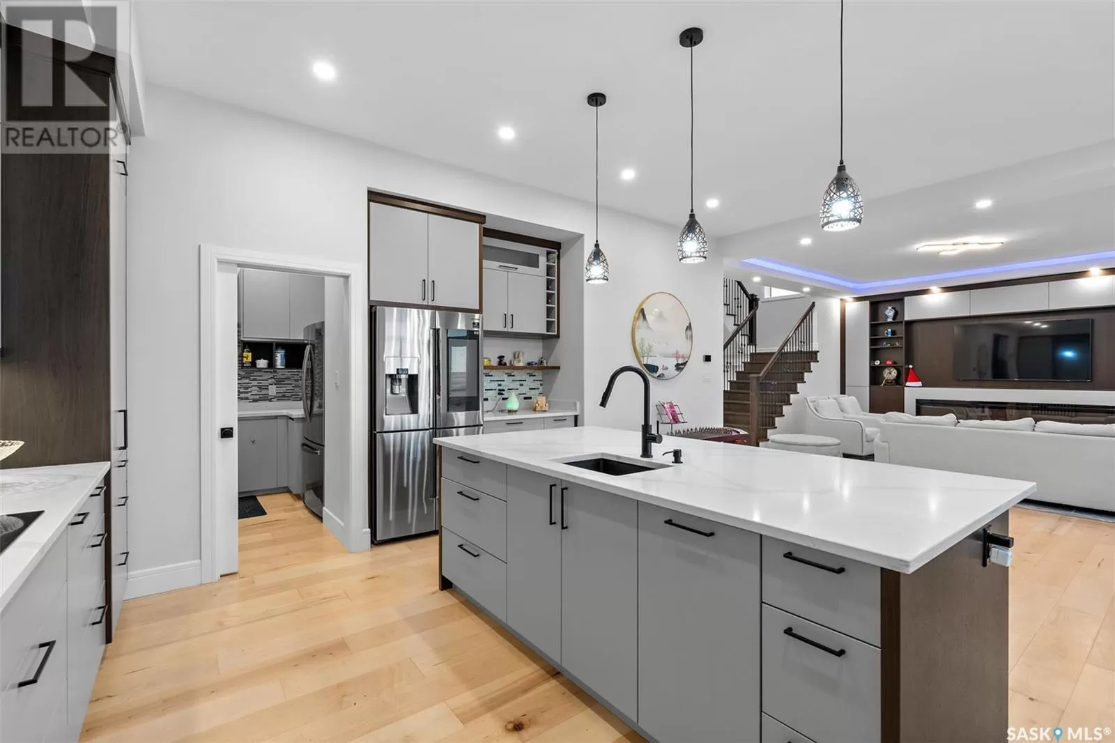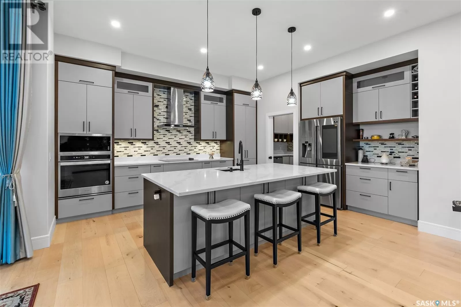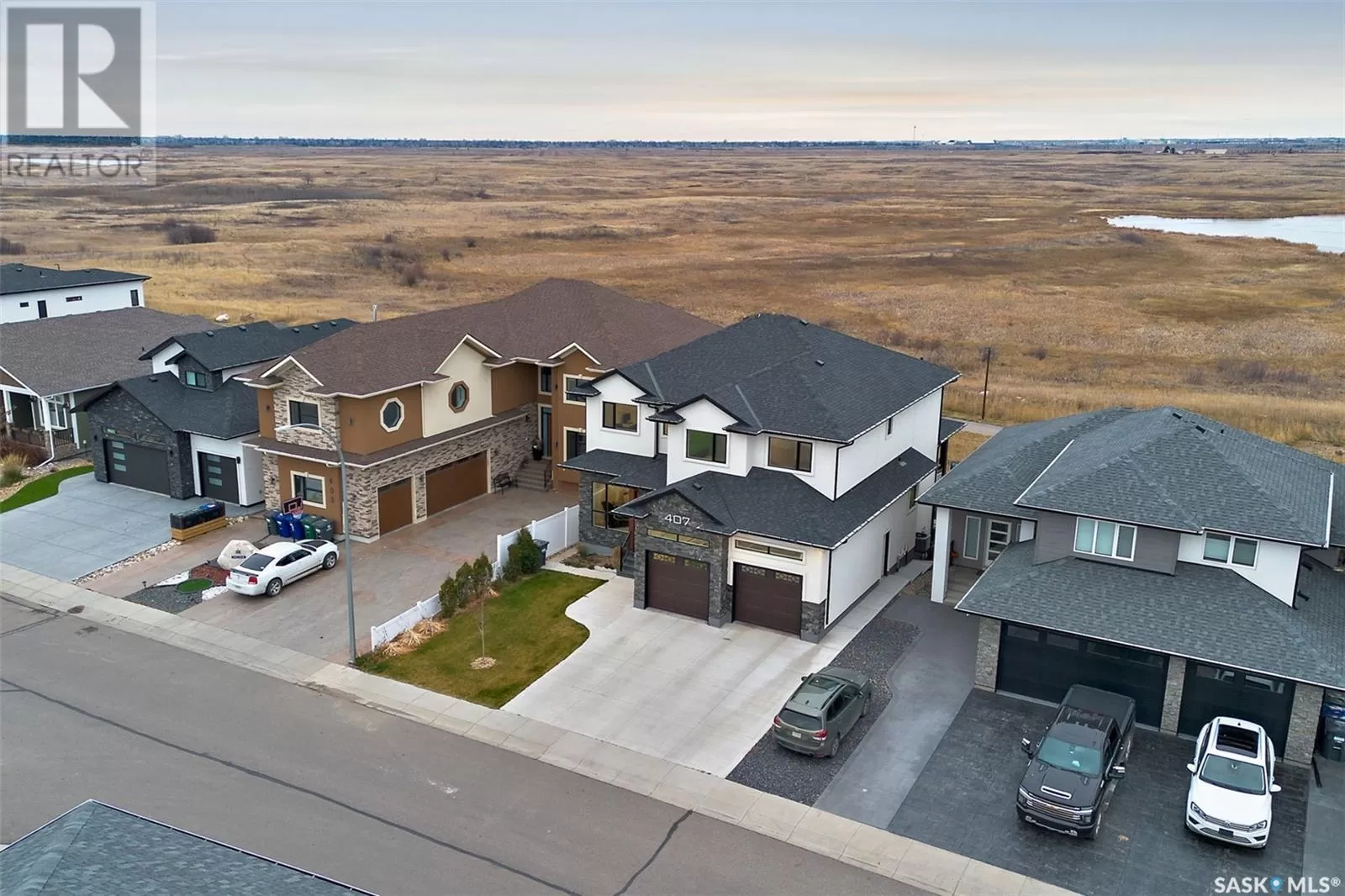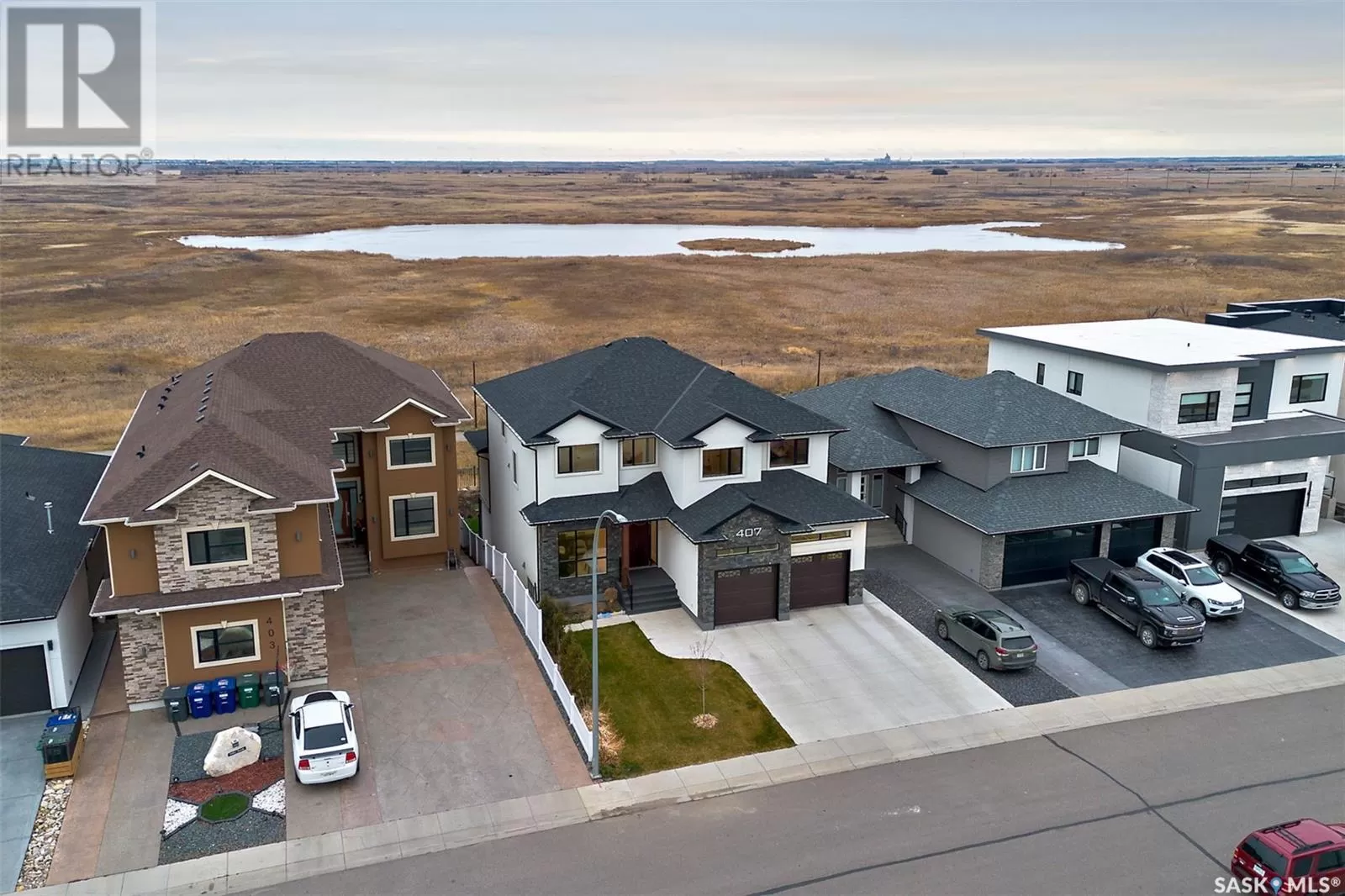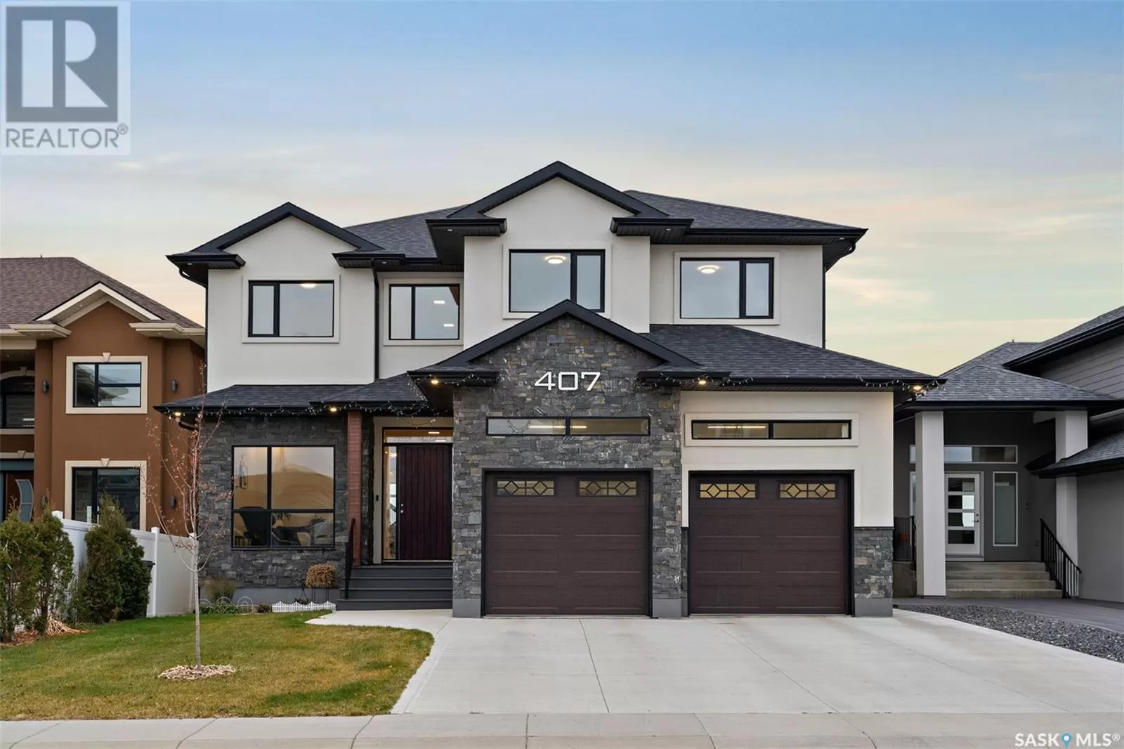 Welcome to 407 Kenashusk Cres. This exceptional home with more than 4400 sq ft living space represents luxurious simplicity. Fantastic location backing the NE swale with panorama view of the serene park, pond and walking paths. This gorgeous home offers 6 bedroom, 5 bath, 2 kitchen, 1 living room, 1 family room, professionally finished walkout basement with bedroom, den, bathroom and family room,. No expense has been spared. The exterior features Sagiper boarding and EFIS stucco completed with stone for better sound and heat insulation. Large covered deck is maintenance free. Inside the house you will find all the bells and whistles! Spacious foyer with soaring ceiling, spacious living room with tray ceiling, electrical fireplace, built-in cabinets and featured wall, gourmet kitchen plus a enclosed spice kitchen with custom cabinets, quartz counter tops, back splash and high end stainless steal appliance package including gas stove. Large dining space has a patio door leading to the back deck. High-end engineering floor throughout. The up level has 9 feet ceiling and awesome layout with 5 generous-sized bedrooms, 3 bathrooms and a bonus space. Master bedroom is spacious and features a walk in closet, large 5 piece bath including soaking tub and his and her sinks; thereâs another bedroom which also has a 3 piece ensuite. Laundry room is conveniently located on the 2nd floor as well. The walkout basement is professionally developed and it features 9ft ceilings, laminate flooring, very bright family room, spacious game room / recreation space, 1 extra bedroom and 4 piece bathrooms. Backyard features patio area, garden area, underground sprinkler system and maintenance-free composite fence. Other notable features include 3 zoned heating control system, heated two car garage with 3 car driveway in the front, HRV, humidifier, and central AC. This property is one of a kind. Absolutely must-see!*** Take a look at VIRTUAL TOUR to get a sense of this fantastic house.*** (id:27476)