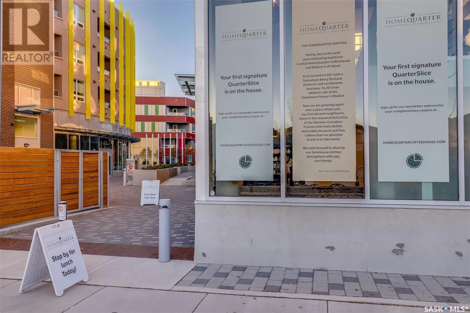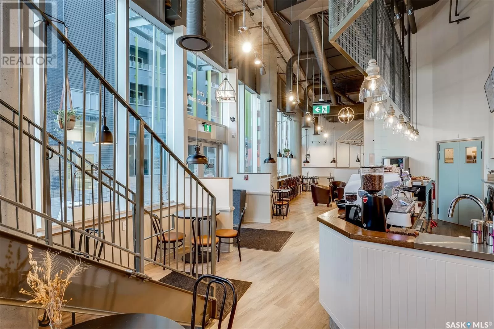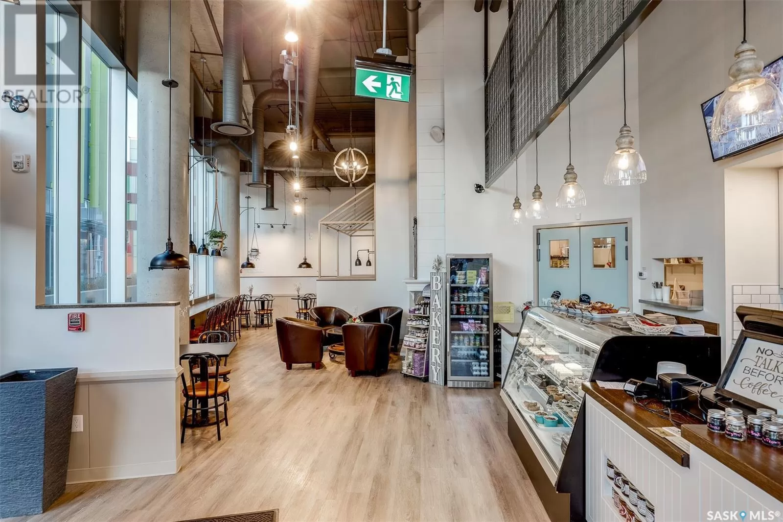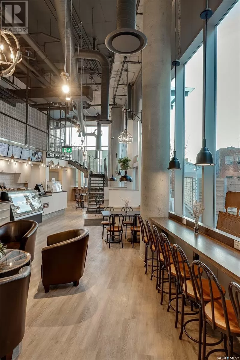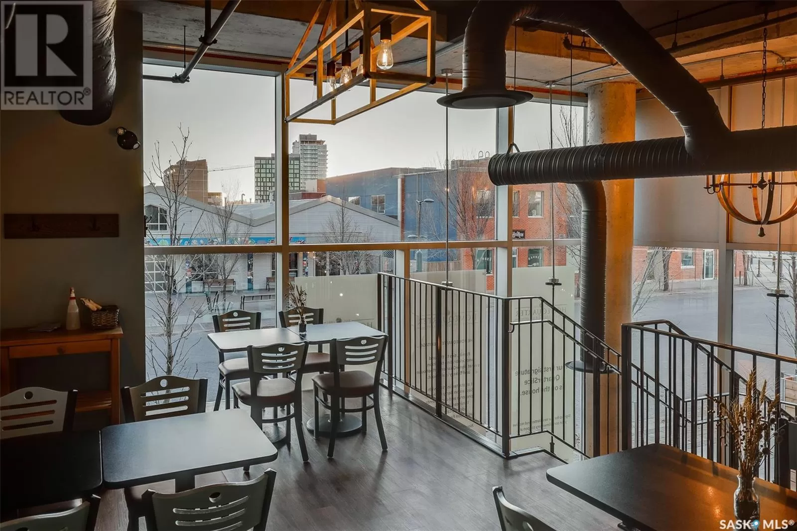 Home Quarter Coffeehouse & Bakery is a beloved space to grab a coffee and delicious baking, however they also offer many other options ie: breakfast foods. This popular business is located within The Banks condominiums on the corner of 19th Street and Avenue B, sharing a courtyard with other prominent businesses, conveniently below over 100 residences that love supporting the business, and across from Gather Local market. This concrete space has 18' ceilings, a steel mezzanine for extra seating, and beautiful windows spanning the length of the space creating a bright and airy space to enjoy all year around. Plenty of seating, and a gas fireplace give you a place to cozy up during cold winter days. Being only 1 block from the River Landing trails, and quick access to downtown by foot or bike, this is definitely a lifestyle location that is reminiscent of Vancouver & Victoria BC. Future upside potential value is strong as Riversdale continues to improve year over year. (id:27476)