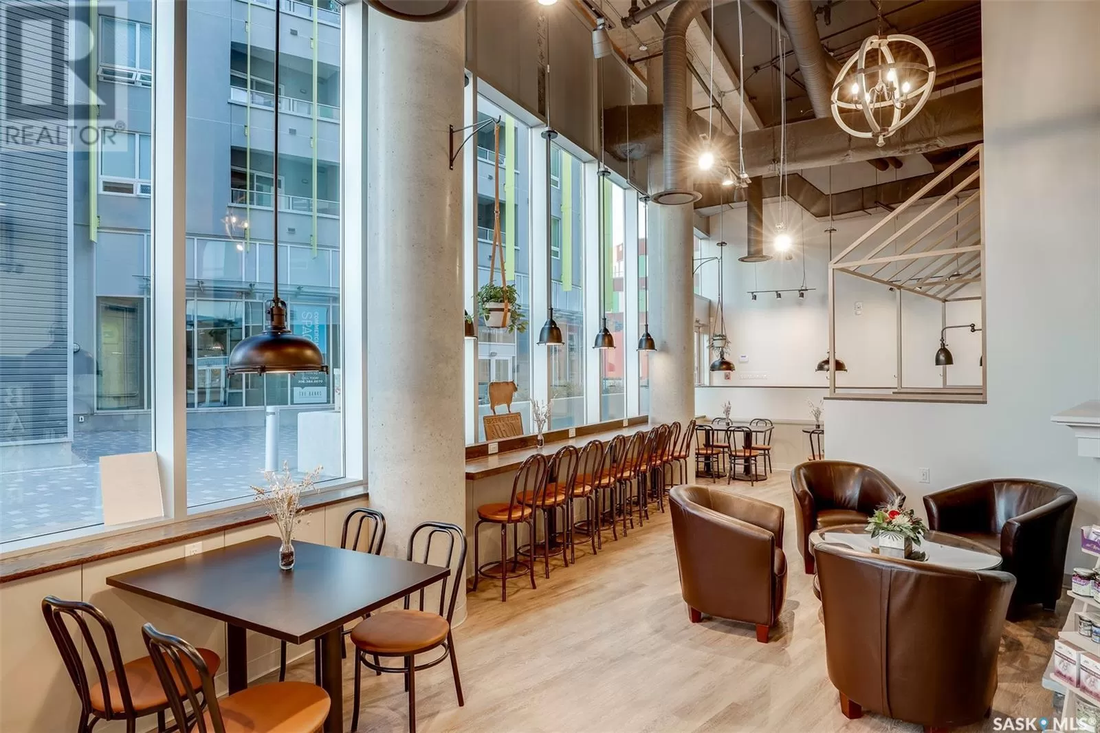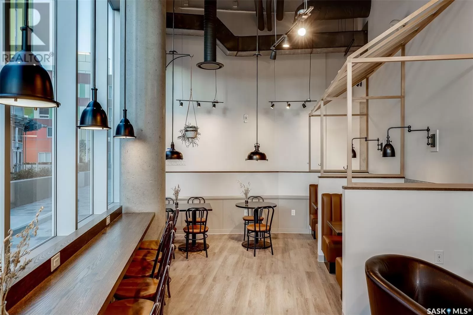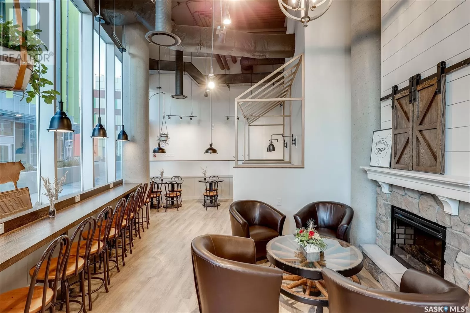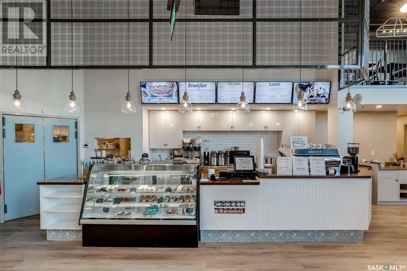 Home Quarter Coffeehouse & Bakery is a beloved space to grab a coffee and delicious baking, however they also offer many other options ie: breakfast foods. This popular business is located within The Banks condominiums on the corner of 19th Street and Avenue B, sharing a courtyard with other prominent businesses, conveniently below over 100 residences that love supporting the business, and across from Gather Local market. This concrete space has 18' ceilings, a steel mezzanine for extra seating, and beautiful windows spanning the length of the space creating a bright and airy space to enjoy all year around. Plenty of seating, and a gas fireplace give you a place to cozy up during cold winter days. Being only 1 block from the River Landing trails, and quick access to downtown by foot or bike, this is definitely a lifestyle location that is reminiscent of Vancouver & Victoria BC. Future upside potential value is strong as Riversdale continues to improve year over year. (id:27476)