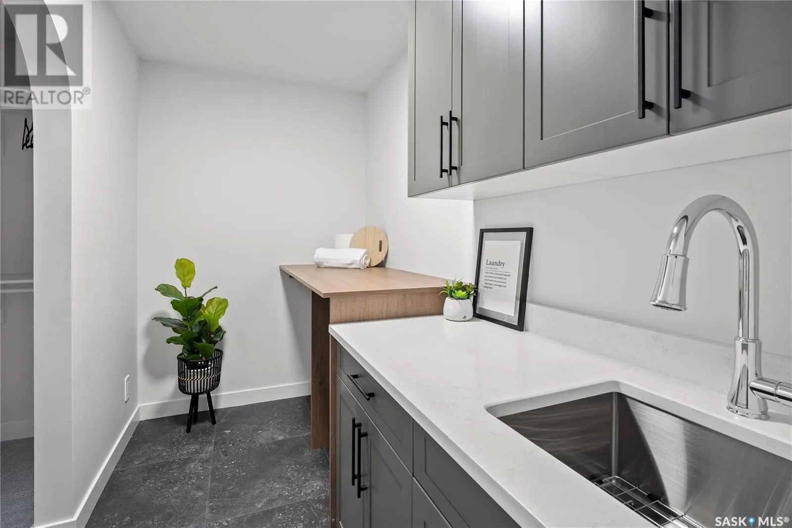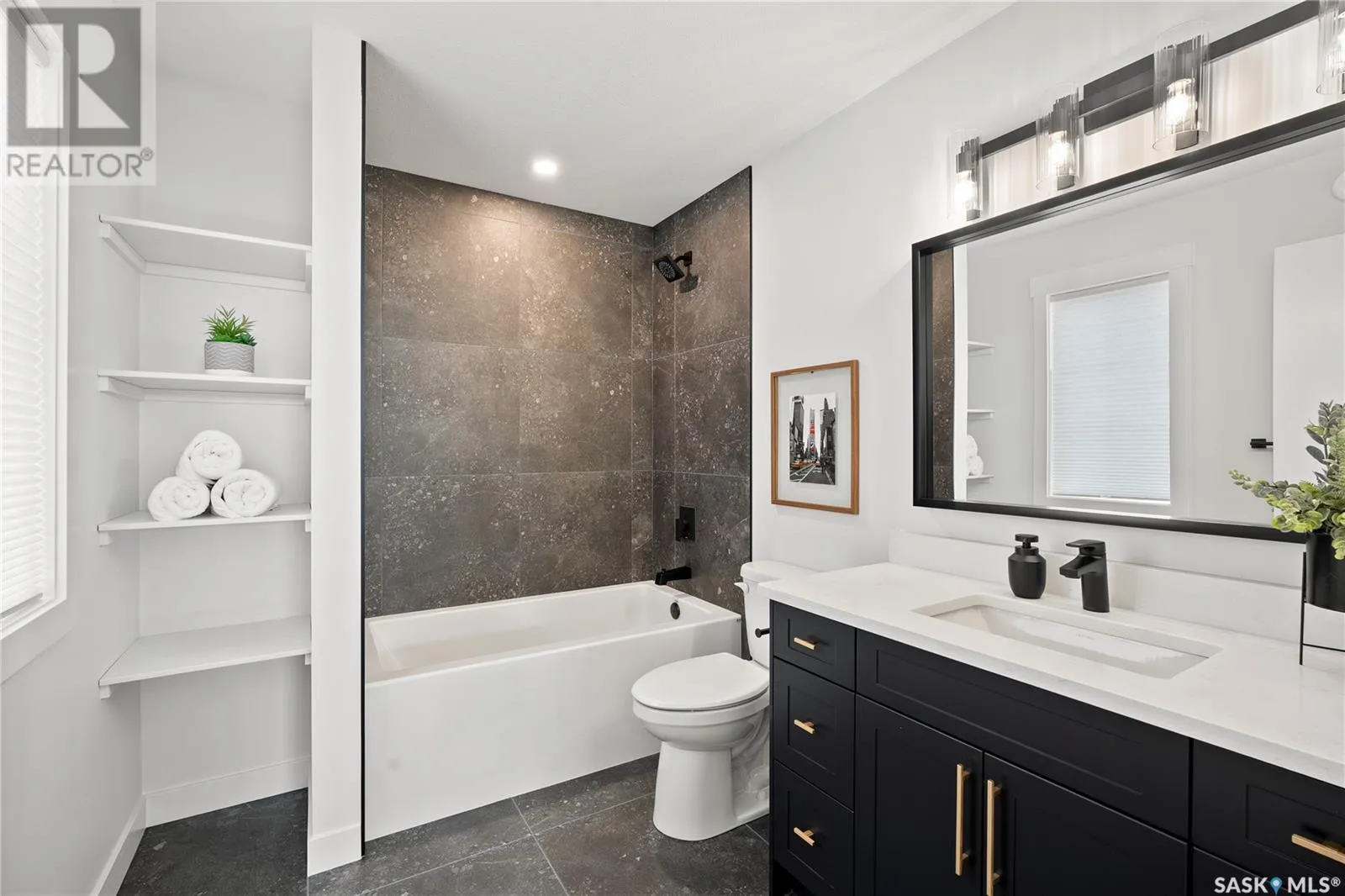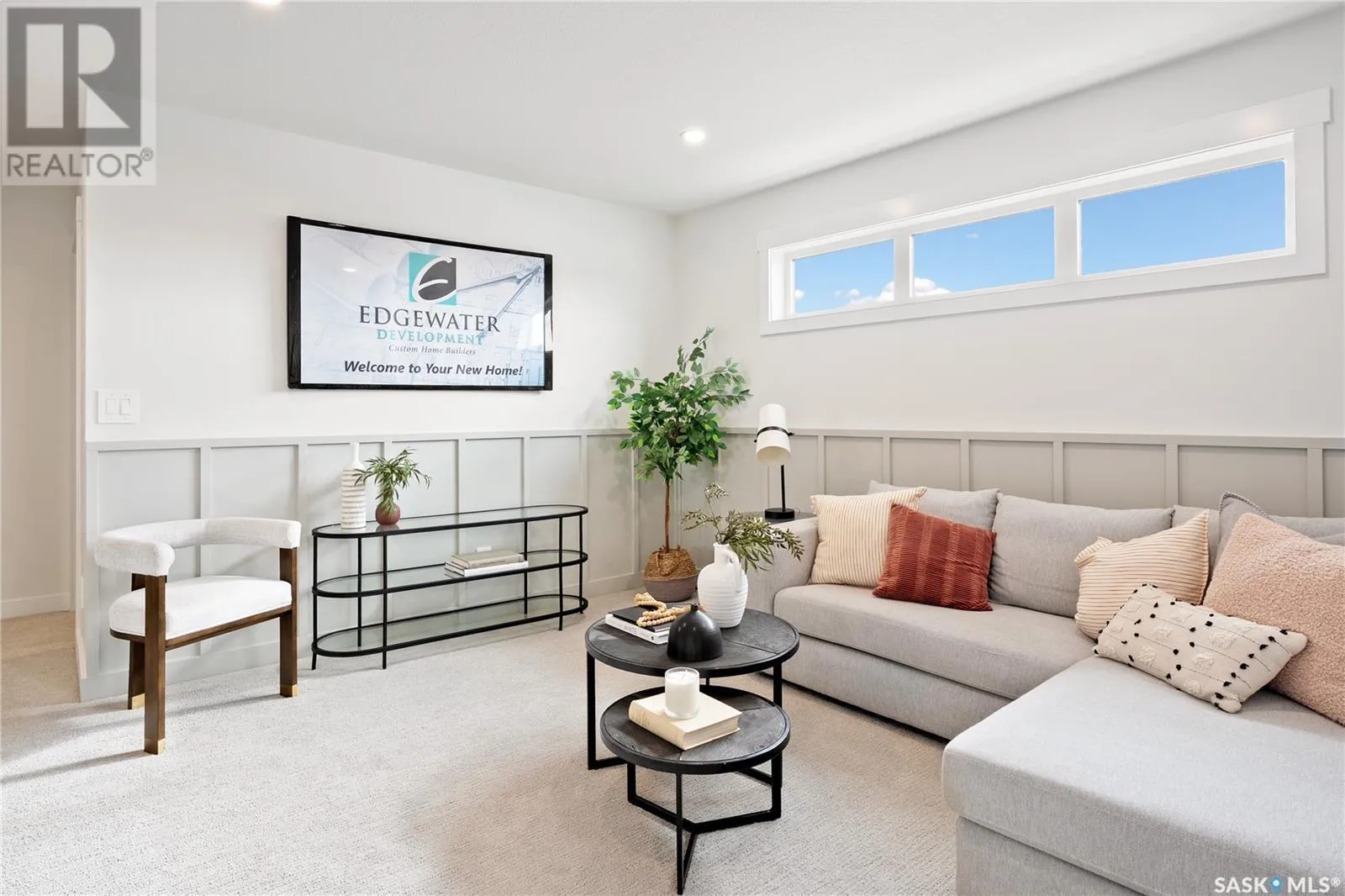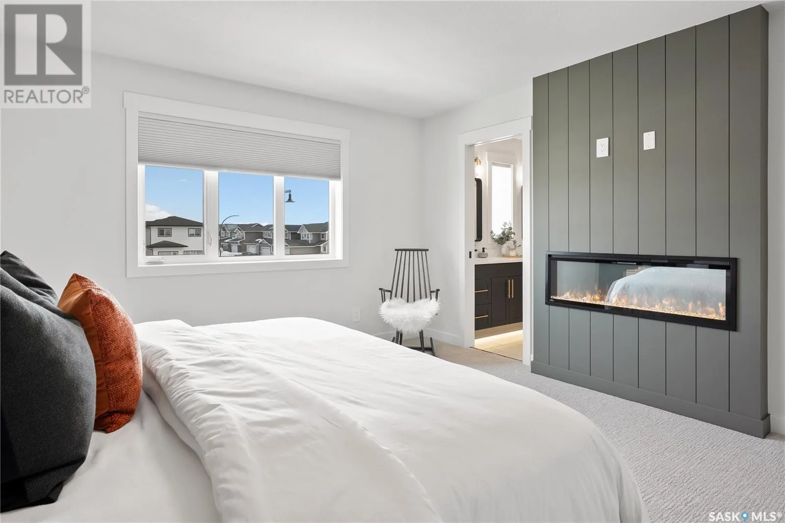 "The Queens", a 2088 square foot home, Entering the home from the oversized fully insulated garage, you step into the mudroom which is conveniently attached to the walk through pantry with lower cabinets and separate sink. The kitchen features an oversize island with eating ledge, gorgeous backsplash and gleaming quartz countertops. The great room features large windows, and oversize patio doors for an abundance of light. The fireplace is a stunning focal point in the room. The addition of the office/flex area adjacent to the front entrance is a perfect work from home space. Upstairs, the primary bedroom is spacious. The ensuite has an 8' vanity with double sinks with a generous amount of drawers for storage, a 5' custom tiled shower and stand alone tub, and a private water closet. From there, you enter directly into the walk through closet with lots of double rods and shelving for your wardrobe. Exiting the closet, you pass directly into the laundry room equipped with lower cabinets and quartz countertop and sink for easy laundry tasks. 2 additional bedrooms, a 4 piece bath and a central bonus/flex area finish this floor. All Pictures may not be exact representations of the home, to be used for reference purposes only. Errors and omissions excluded. Prices, plans, specifications subject to change without notice. All Edgewater homes are covered under the Saskatchewan New Home Warranty program. PST & GST included with rebate to builder (id:27476)