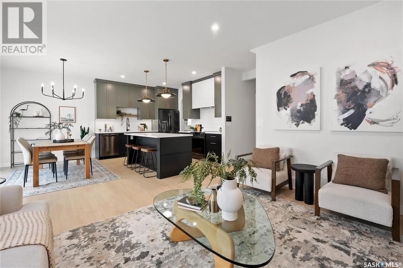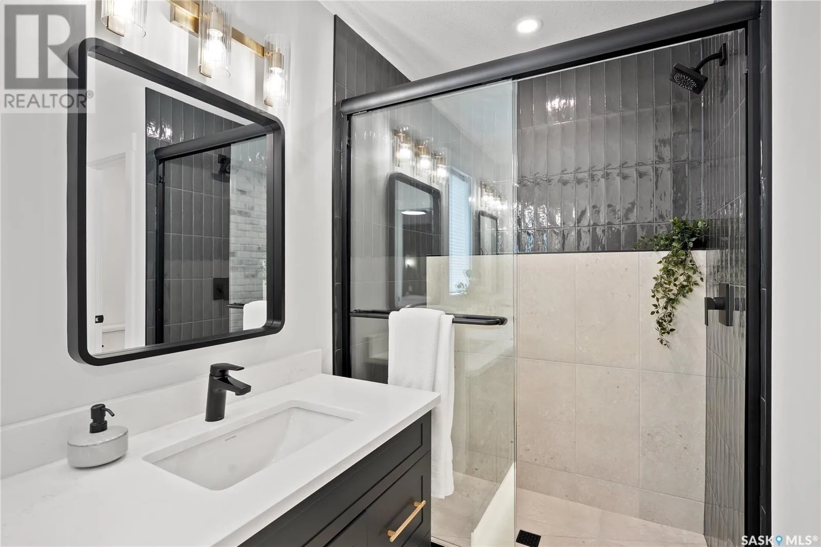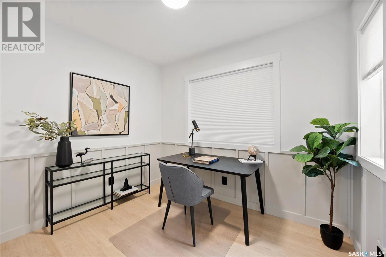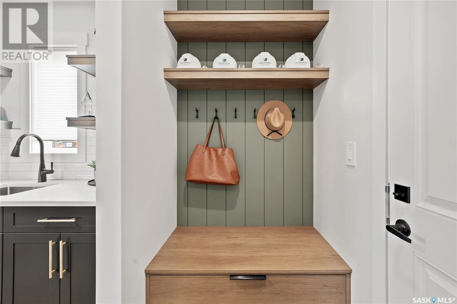 "The Queens", a 2088 square foot home, Entering the home from the oversized fully insulated garage, you step into the mudroom which is conveniently attached to the walk through pantry with lower cabinets and separate sink. The kitchen features an oversize island with eating ledge, gorgeous backsplash and gleaming quartz countertops. The great room features large windows, and oversize patio doors for an abundance of light. The fireplace is a stunning focal point in the room. The addition of the office/flex area adjacent to the front entrance is a perfect work from home space. Upstairs, the primary bedroom is spacious. The ensuite has an 8' vanity with double sinks with a generous amount of drawers for storage, a 5' custom tiled shower and stand alone tub, and a private water closet. From there, you enter directly into the walk through closet with lots of double rods and shelving for your wardrobe. Exiting the closet, you pass directly into the laundry room equipped with lower cabinets and quartz countertop and sink for easy laundry tasks. 2 additional bedrooms, a 4 piece bath and a central bonus/flex area finish this floor. All Pictures may not be exact representations of the home, to be used for reference purposes only. Errors and omissions excluded. Prices, plans, specifications subject to change without notice. All Edgewater homes are covered under the Saskatchewan New Home Warranty program. PST & GST included with rebate to builder (id:27476)