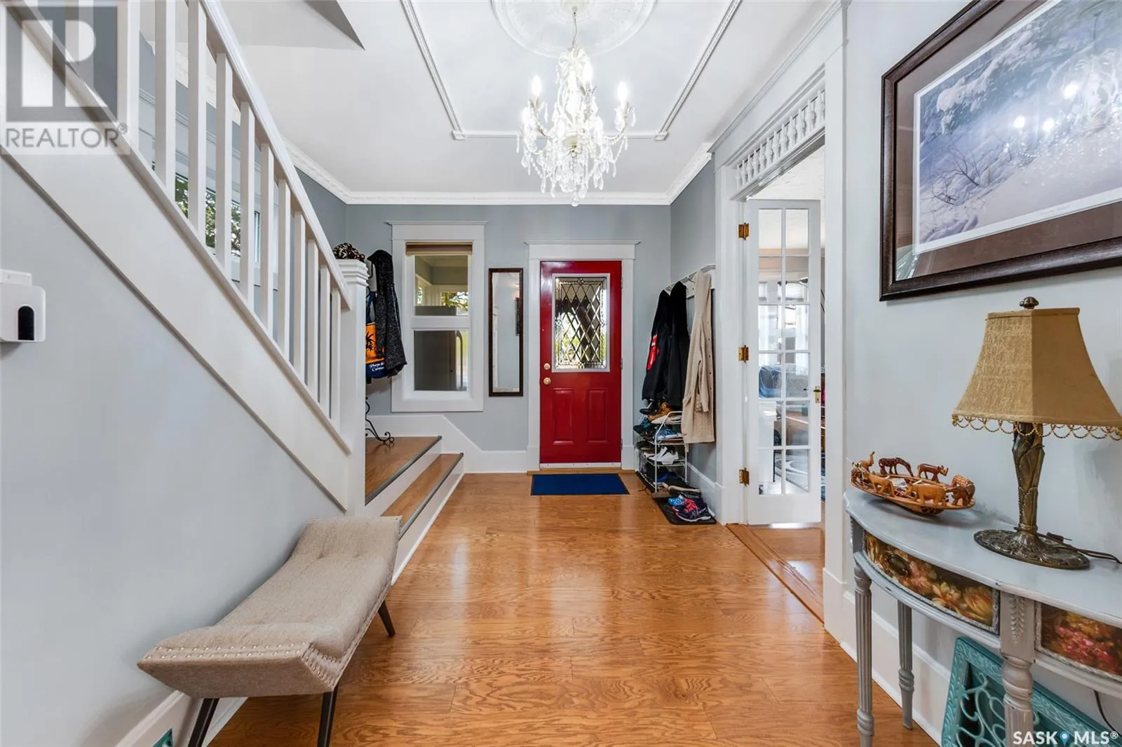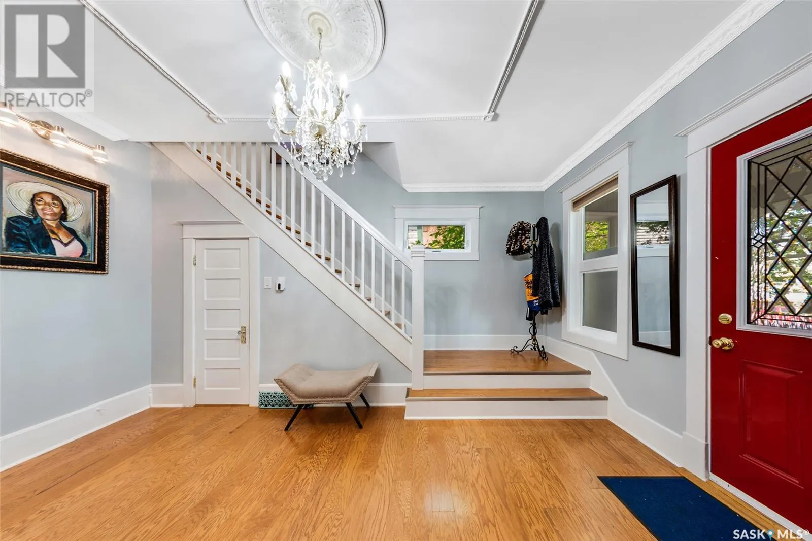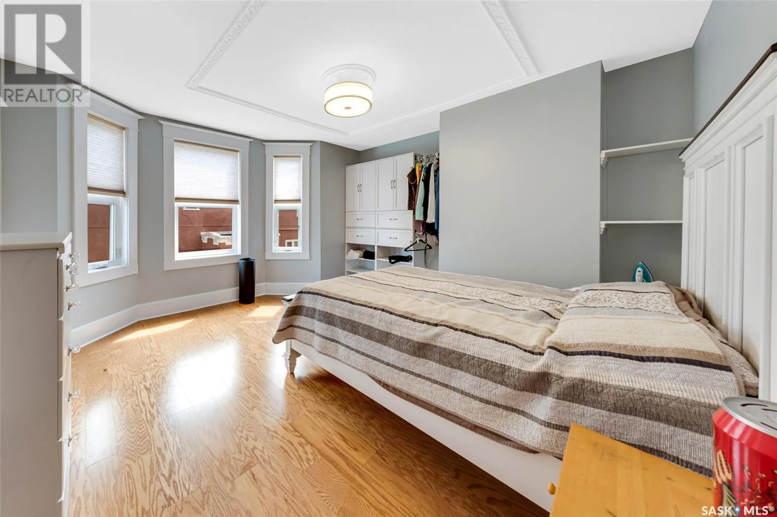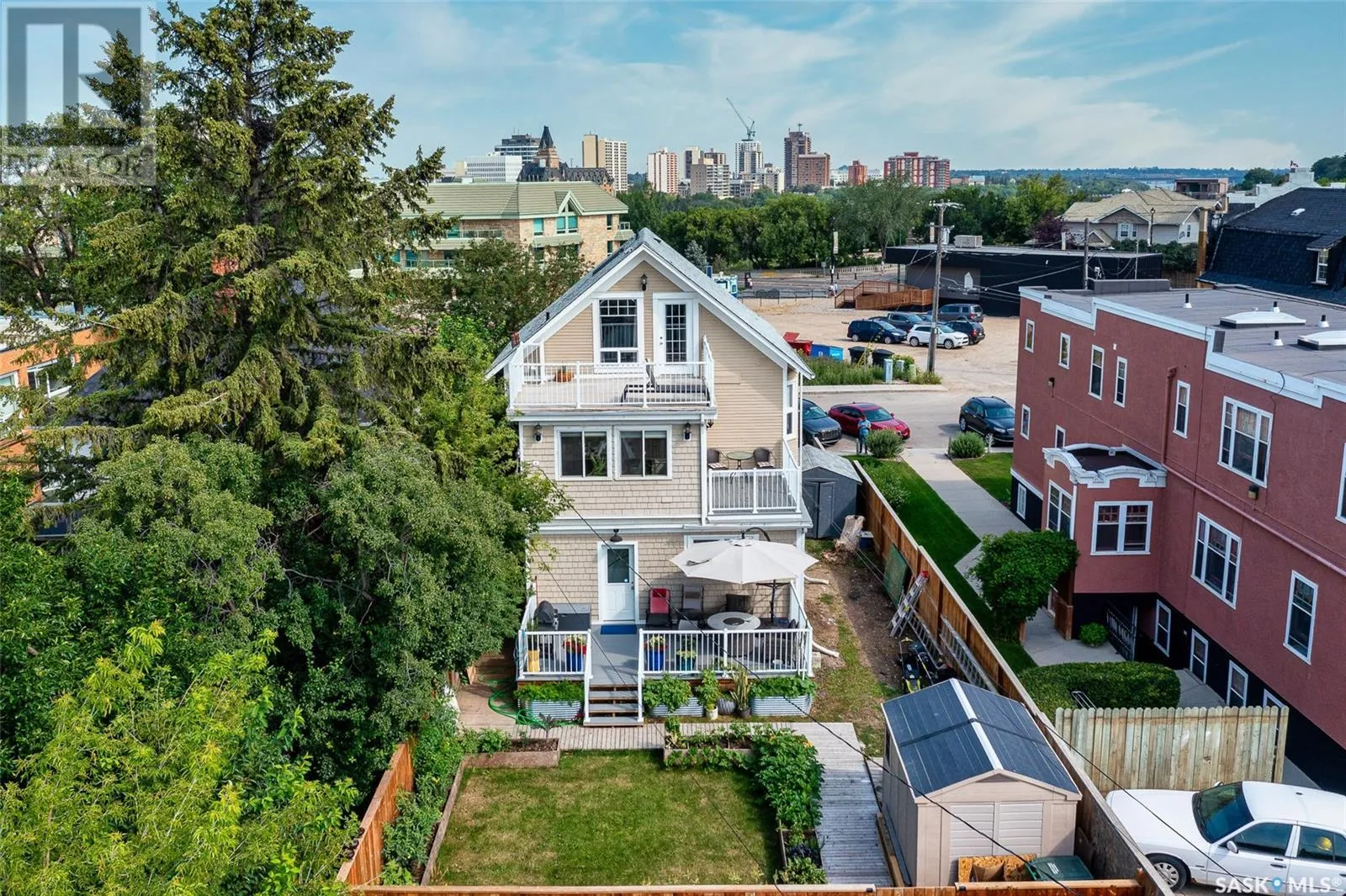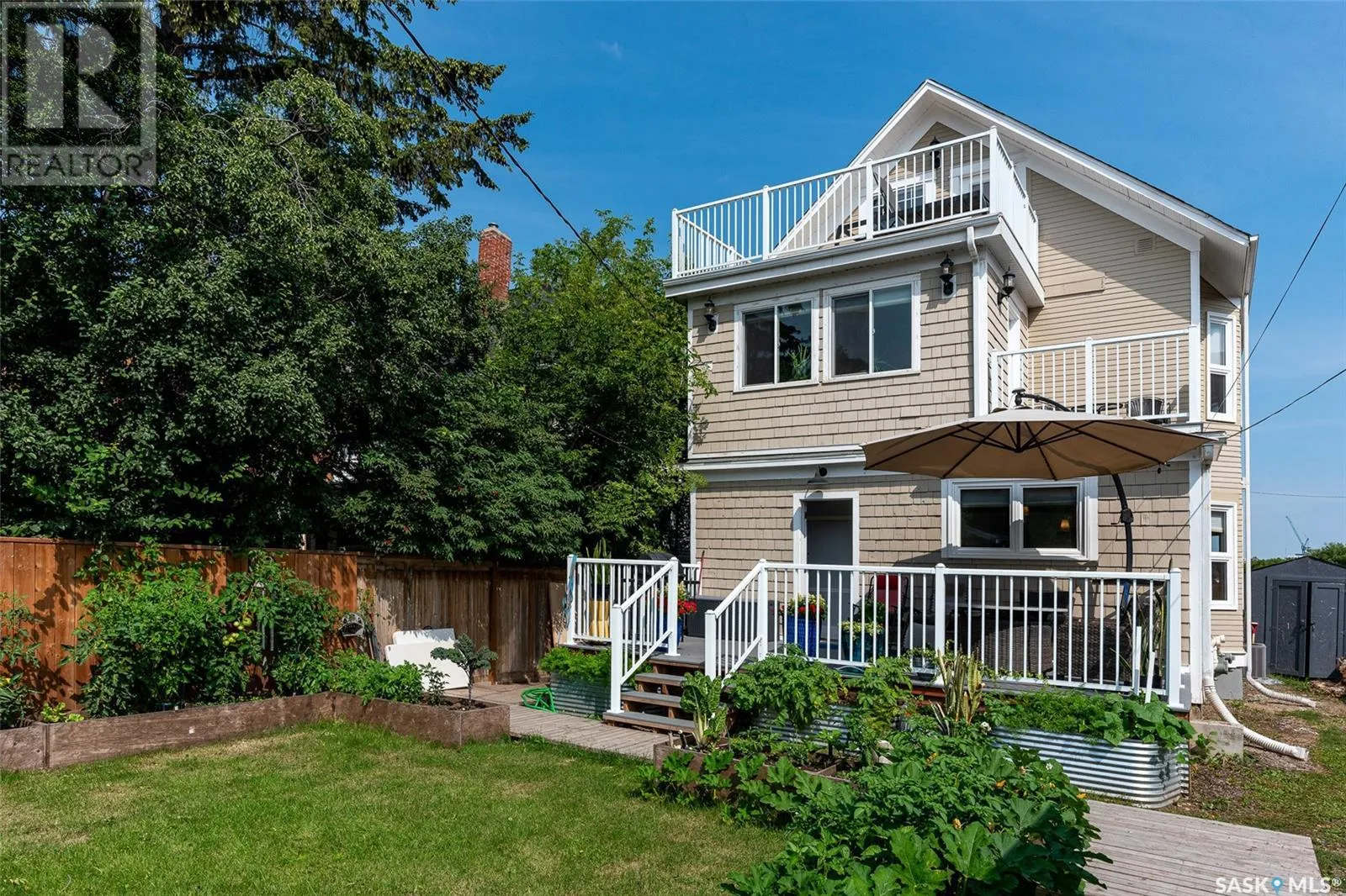 Just steps from the Saskatchewan River, tucked into the historic Nutana Neighbourhood, this Character 1911 home has been lovingly restored for clients who appreciate the history and location of this property. This spacious home has a completely renovated kitchen with quartz countertops, new cupboards and backsplash, under counter lighting, all new appliances, including a newer large wine and beer fridge and a nice open floorplan flowing through to the dining room and living room. An office space and main floor laundry are a great convenience on the main floor. Four- piece bathrooms on each of first two floors and half bath on third floor are convenient. Three large bedrooms on the second floor, one with a very large walk-in closet with window. (Could be used as a nursery.) One of the bedrooms on the second floor can also be used as a Sunroom. A new staircase leads to the third floor where the primary bedroom could be located. This room could also be used as a bonus room or very large office. Owner has replaced much of the crown molding to return this property to its original glory. There are South facing decks off the second and third floor as well as a back deck off the kitchen, also South facing. Most windows are new. Furnace, water heater and reverse osmosis recently changed. New paint everywhere and new engineered hardwood flooring make this is a turnkey property (Vinyl planking on the 3rd floor). Arches, tall baseboards, bay windows and glass doors complete the historic look of this home. This property has a completely fenced in backyard with board sidewalk leading to parking off the back alley. There is room for a garage. The owner has also created a small oasis of gardening boxes tucked around the back yard which is drenched in sunshine most of the day. Come and visit this beautifully renovated historic home, youâll be glad you did. (id:27476)