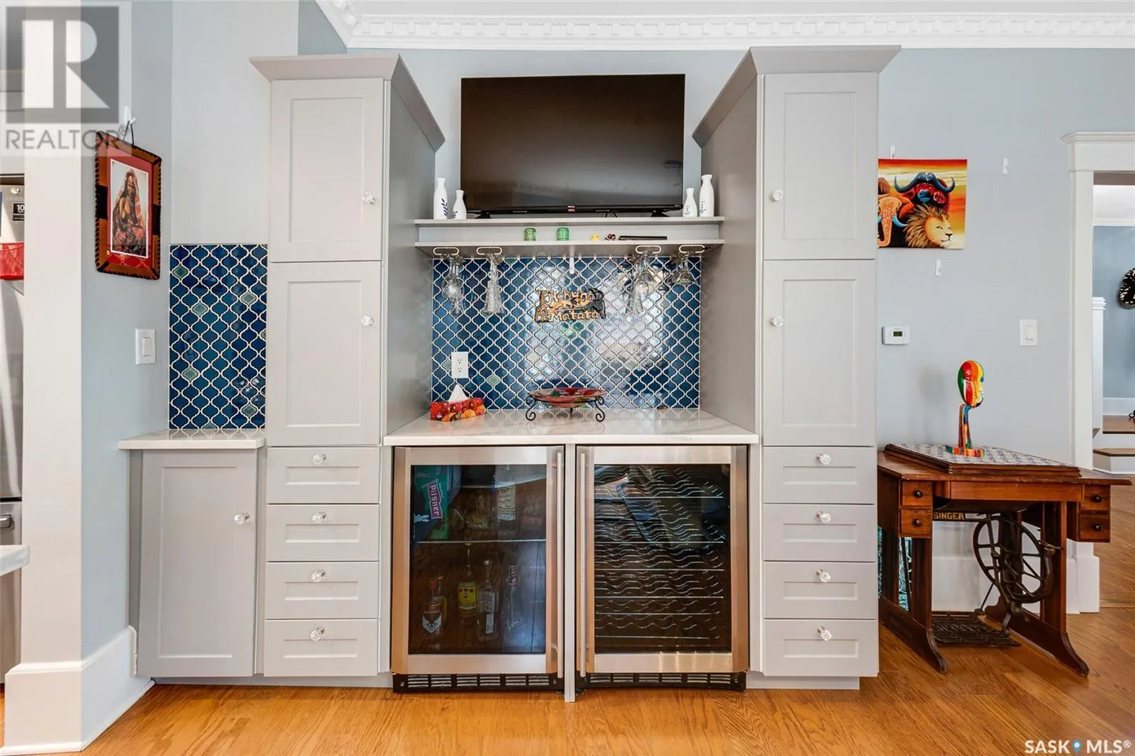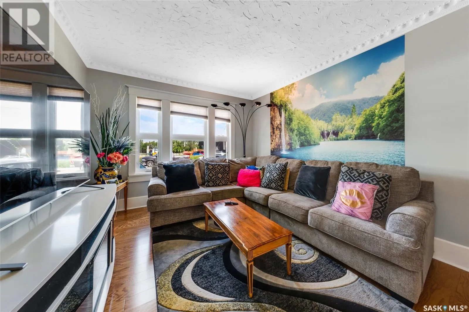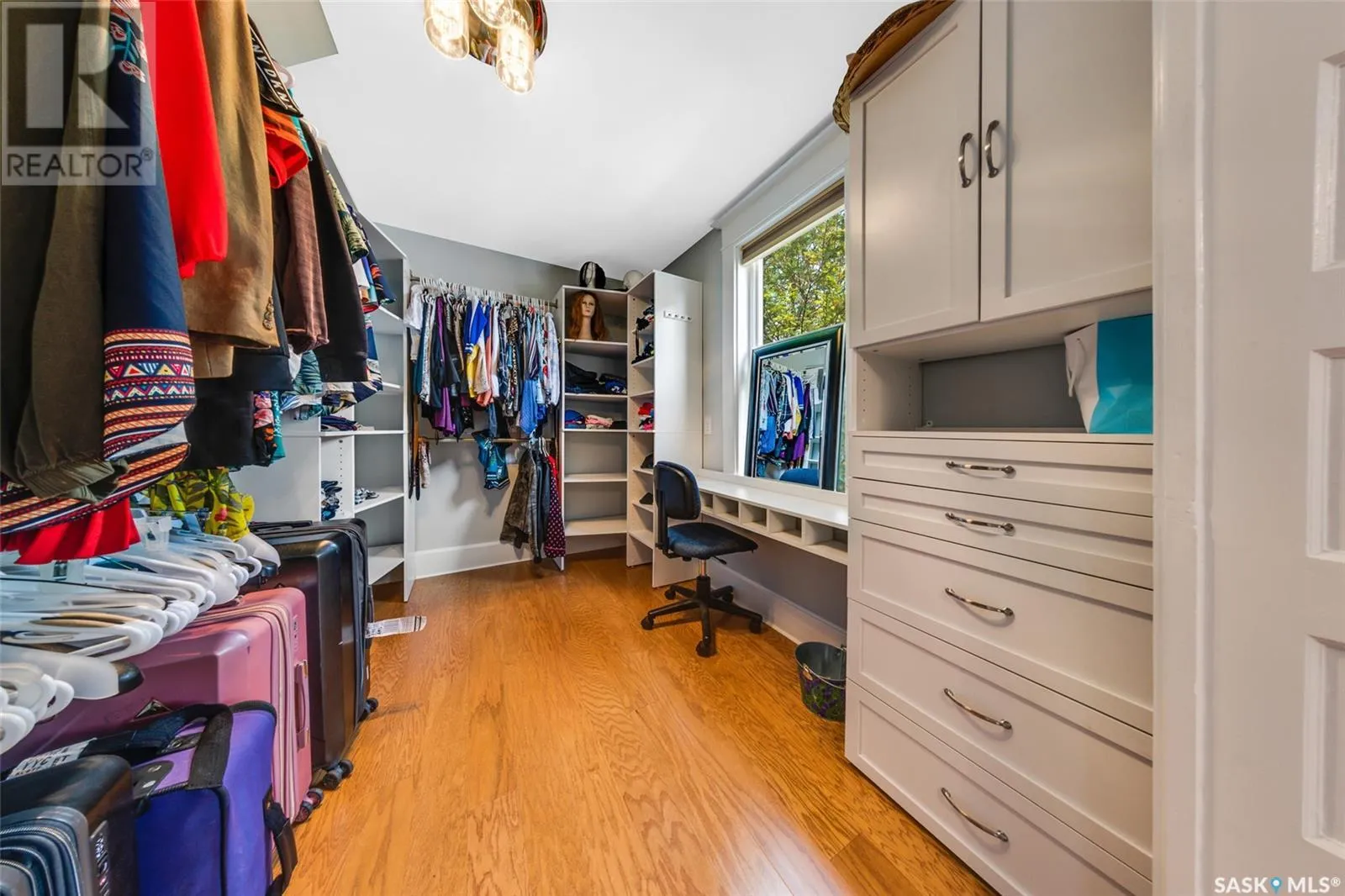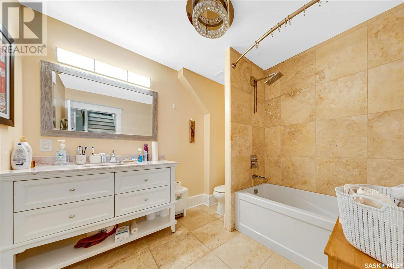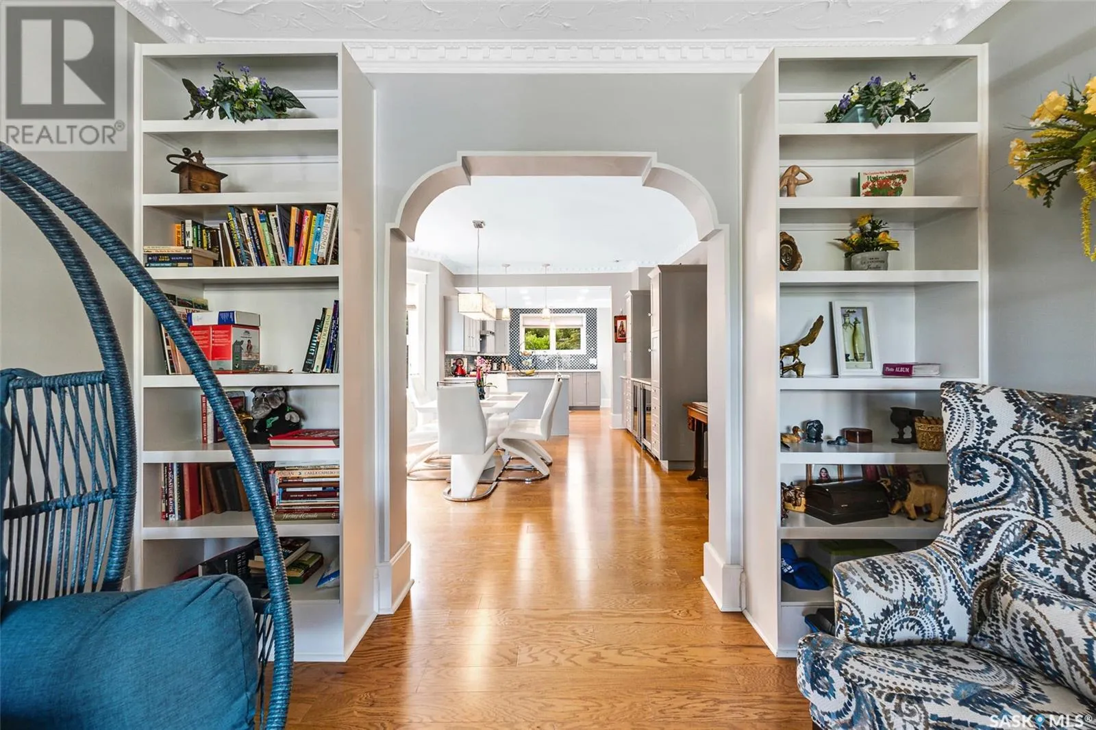 Just steps from the Saskatchewan River, tucked into the historic Nutana Neighbourhood, this Character 1911 home has been lovingly restored for clients who appreciate the history and location of this property. This spacious home has a completely renovated kitchen with quartz countertops, new cupboards and backsplash, under counter lighting, all new appliances, including a newer large wine and beer fridge and a nice open floorplan flowing through to the dining room and living room. An office space and main floor laundry are a great convenience on the main floor. Four- piece bathrooms on each of first two floors and half bath on third floor are convenient. Three large bedrooms on the second floor, one with a very large walk-in closet with window. (Could be used as a nursery.) One of the bedrooms on the second floor can also be used as a Sunroom. A new staircase leads to the third floor where the primary bedroom could be located. This room could also be used as a bonus room or very large office. Owner has replaced much of the crown molding to return this property to its original glory. There are South facing decks off the second and third floor as well as a back deck off the kitchen, also South facing. Most windows are new. Furnace, water heater and reverse osmosis recently changed. New paint everywhere and new engineered hardwood flooring make this is a turnkey property (Vinyl planking on the 3rd floor). Arches, tall baseboards, bay windows and glass doors complete the historic look of this home. This property has a completely fenced in backyard with board sidewalk leading to parking off the back alley. There is room for a garage. The owner has also created a small oasis of gardening boxes tucked around the back yard which is drenched in sunshine most of the day. Come and visit this beautifully renovated historic home, youâll be glad you did. (id:27476)