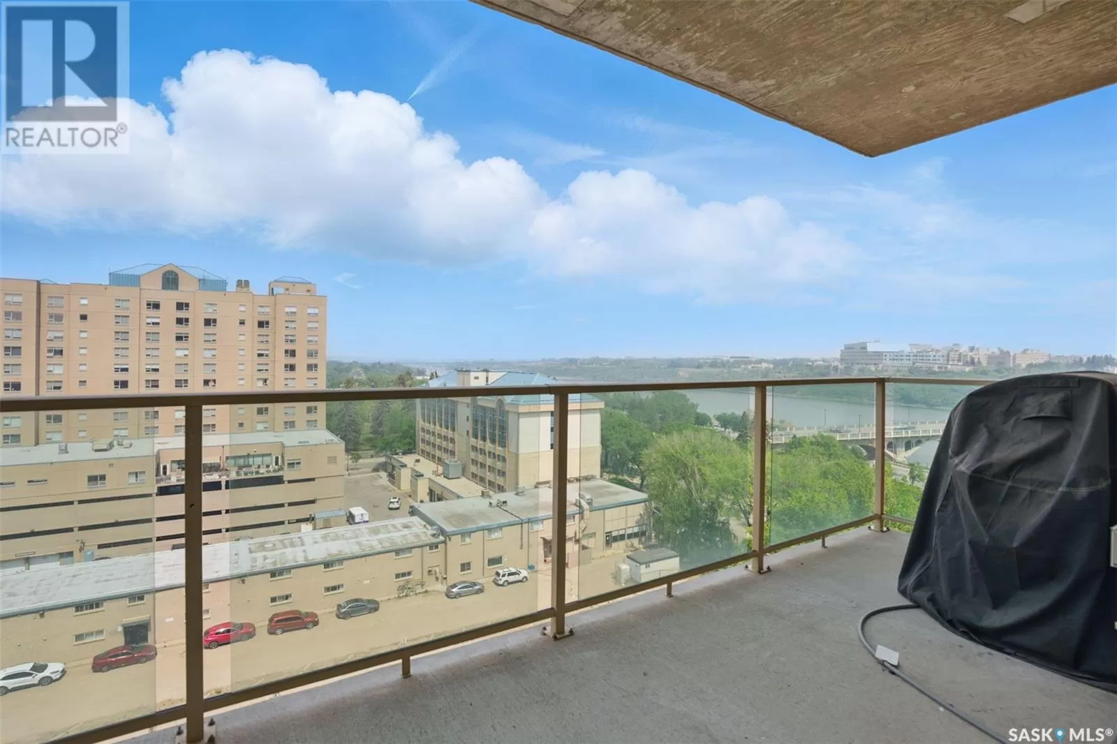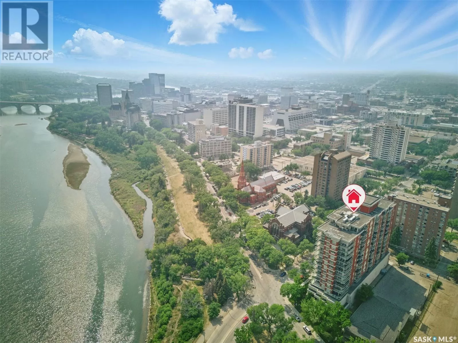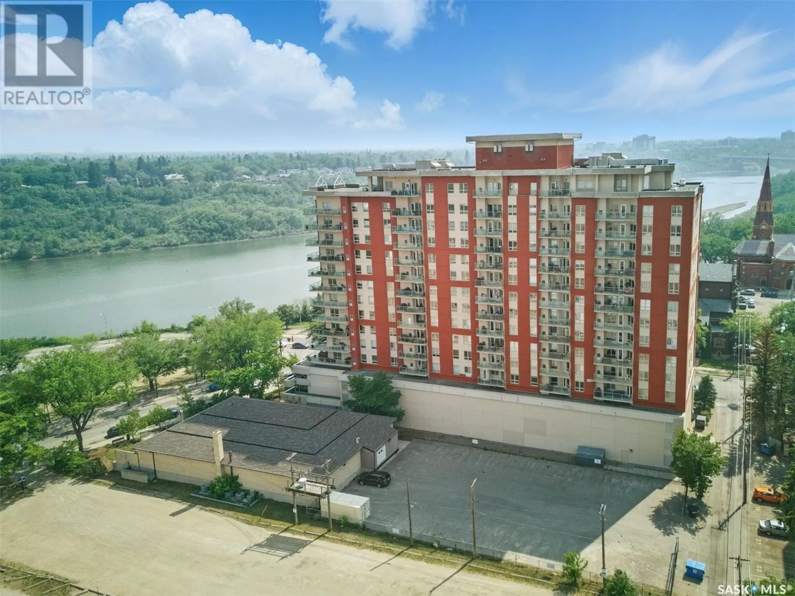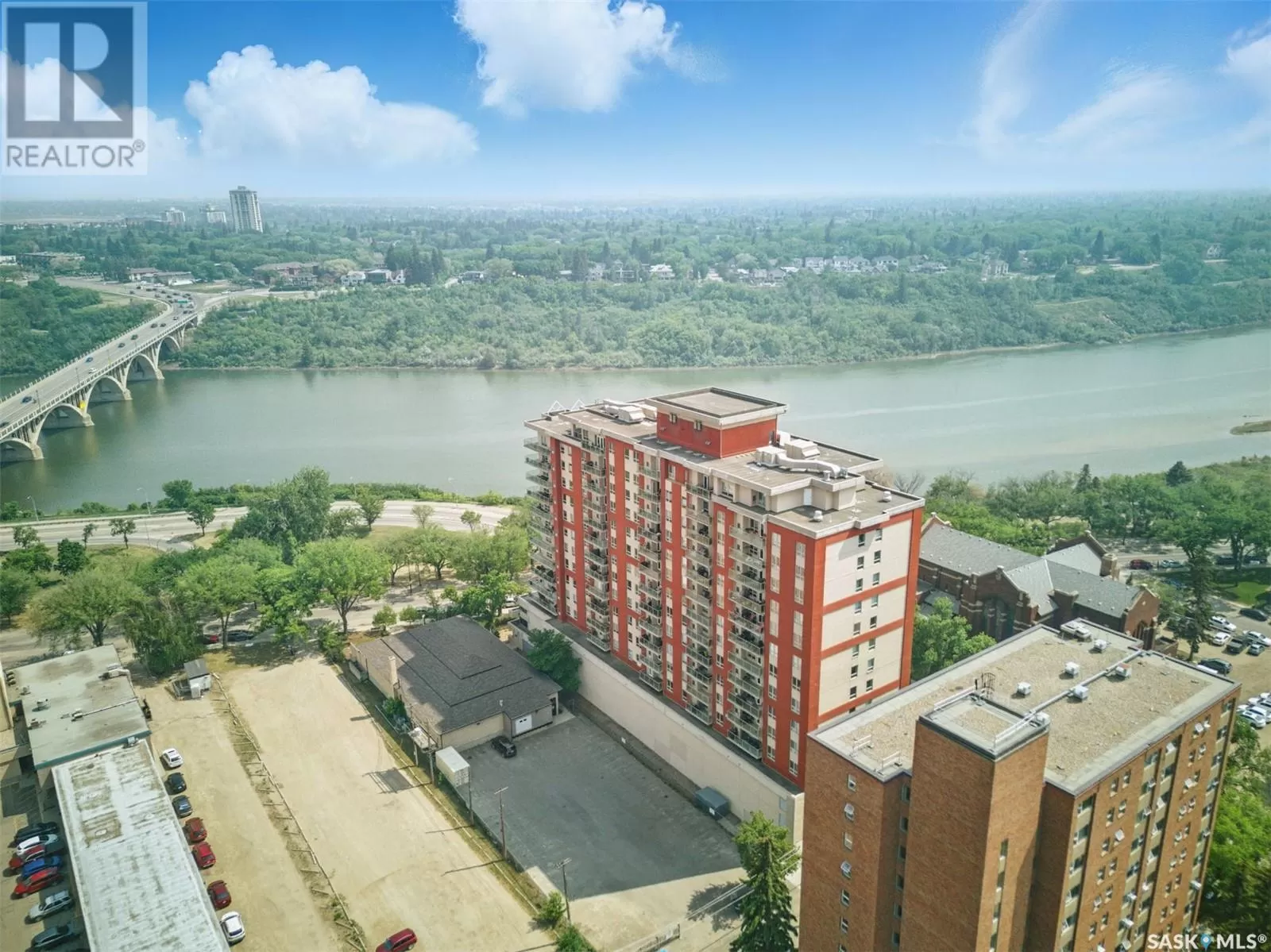 Welcome to the Riverfront! One the best locations in Saskatoon. This prestigious 10th floor condo has spectacular views of the river, Kinsmen Park, University Bridge, and the Children's Hospital. This move in ready 2 bed, 2bath suite, boasts maple shaker cabinets, island kitchen, open, bright living and dining rooms, huge master bedroom with walk-in closet, and en-suite bathroom. There's in-suite laundry, a spacious balcony with natural gas BBQ, central air, heated underground parking, and two storage lockers. The building offers extra perks such as exercise room with new equipment, pool table, meeting room, rentable guest suites, security cameras, and an on-site caretaker. Just steps from all the riverfront activities, downtown, and RUH. Condo fees include heat, insurance, water, sewer, garbage, and building maintenance. Newer fridge and microwave. Can remain fully furnished if desired. Don't miss this deal today! (id:27476)