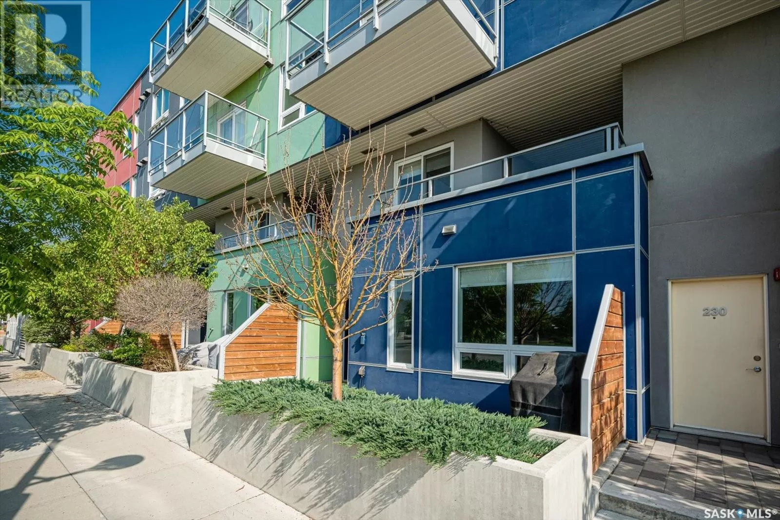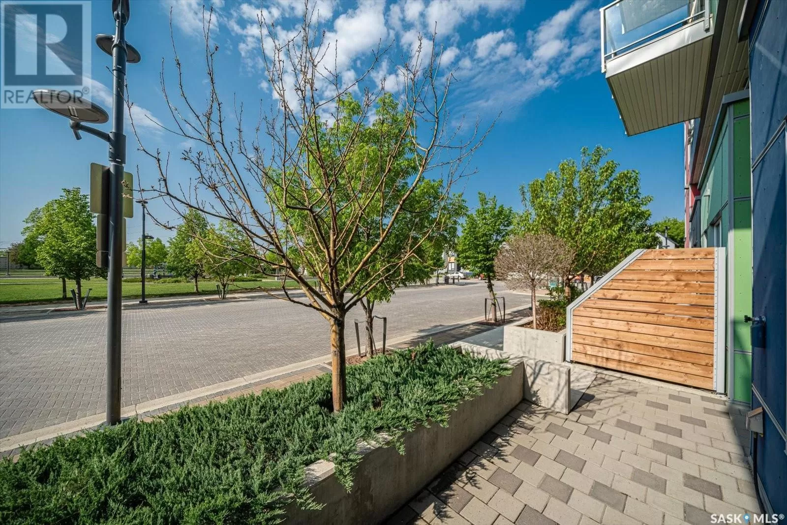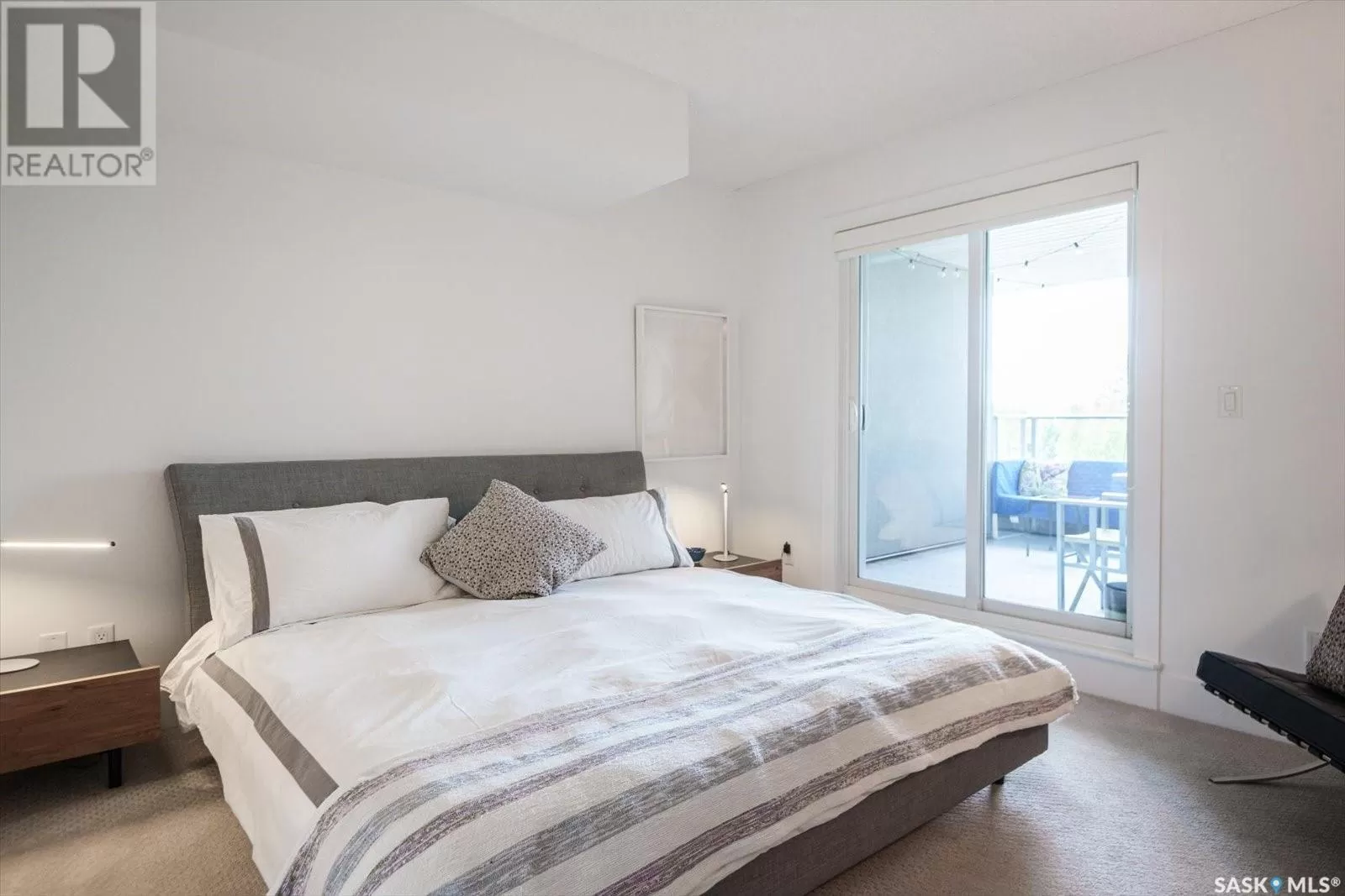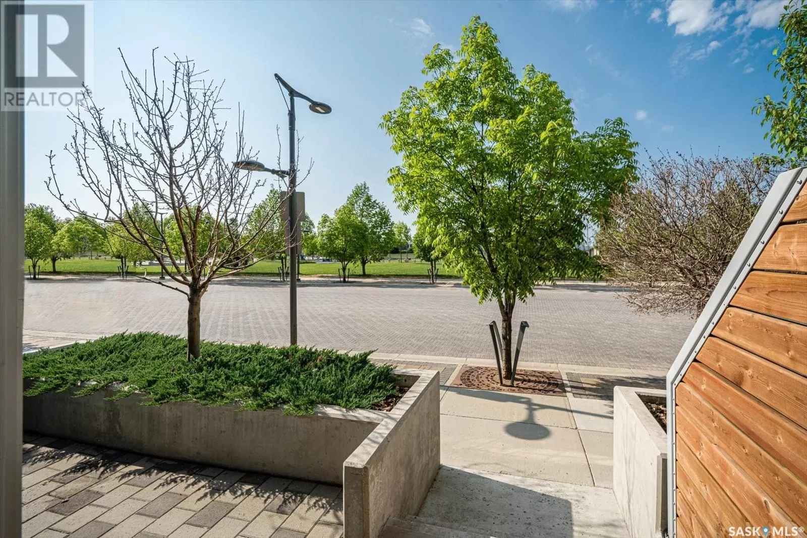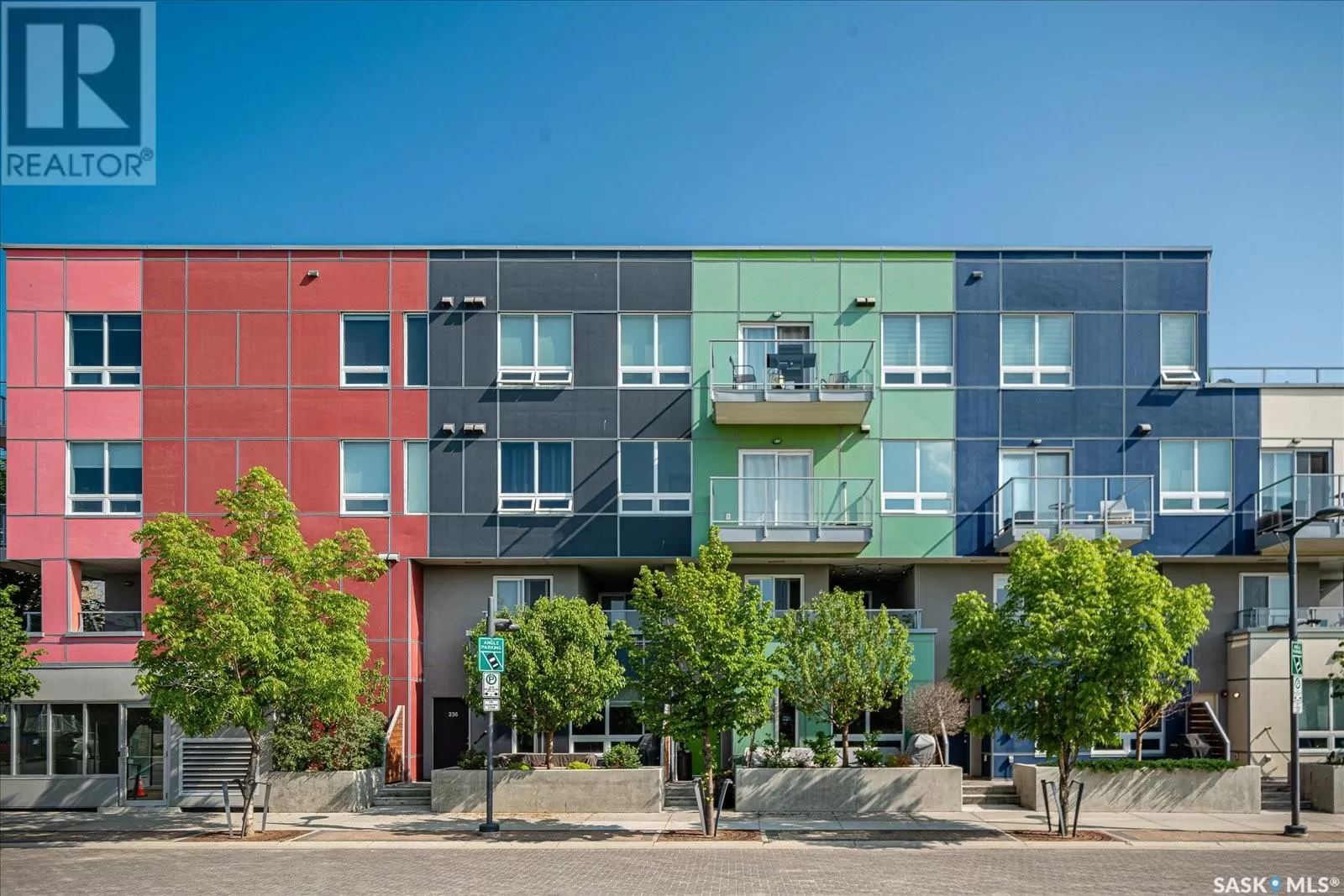 Sophisticated architecture and functional design come together in this centrally located, modern two-storey condominium. Located in River Landingâjust steps from the Remai Modern, Meewasin Trail, and the cityâs best cafésâthis home is ideal for an active professional or as a revenue property alike. Facing a lovely park and next to the Gather Local Market, the unit offers rare outdoor living with two private balconiesâeach accessible from the upper-level bedroomsâand a private, landscaped patio on the main floor. The main level features open, well-proportioned, and light-filled living spaces. A central kitchen with island, stainless steel appliances, dedicated dining area, and a bright living room with large windows anchor the space. A generous den on this level makes for an ideal home office or flex space. A walk-in pantry, powder room, and enclosed storage room complete the floor. Upstairs, two spacious bedrooms each have access to their own private terrace. The primary includes a walk-in closet and its own ensuite, while the second bedroom is steps from another full bath and the in-suite laundry. Two underground parking stalls, a storage locker, in-suite ventilation system, and access to bike storage round out the offering. Pets permitted with restrictions. Condos of this caliber rarely come to marketâwell-positioned for both lifestyle and long-term value. (id:27476)