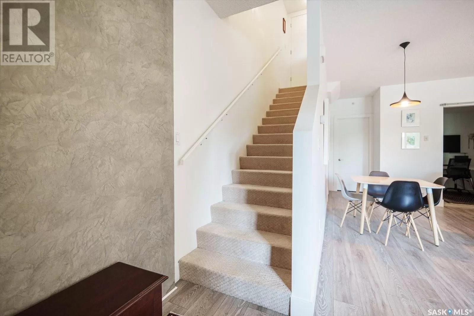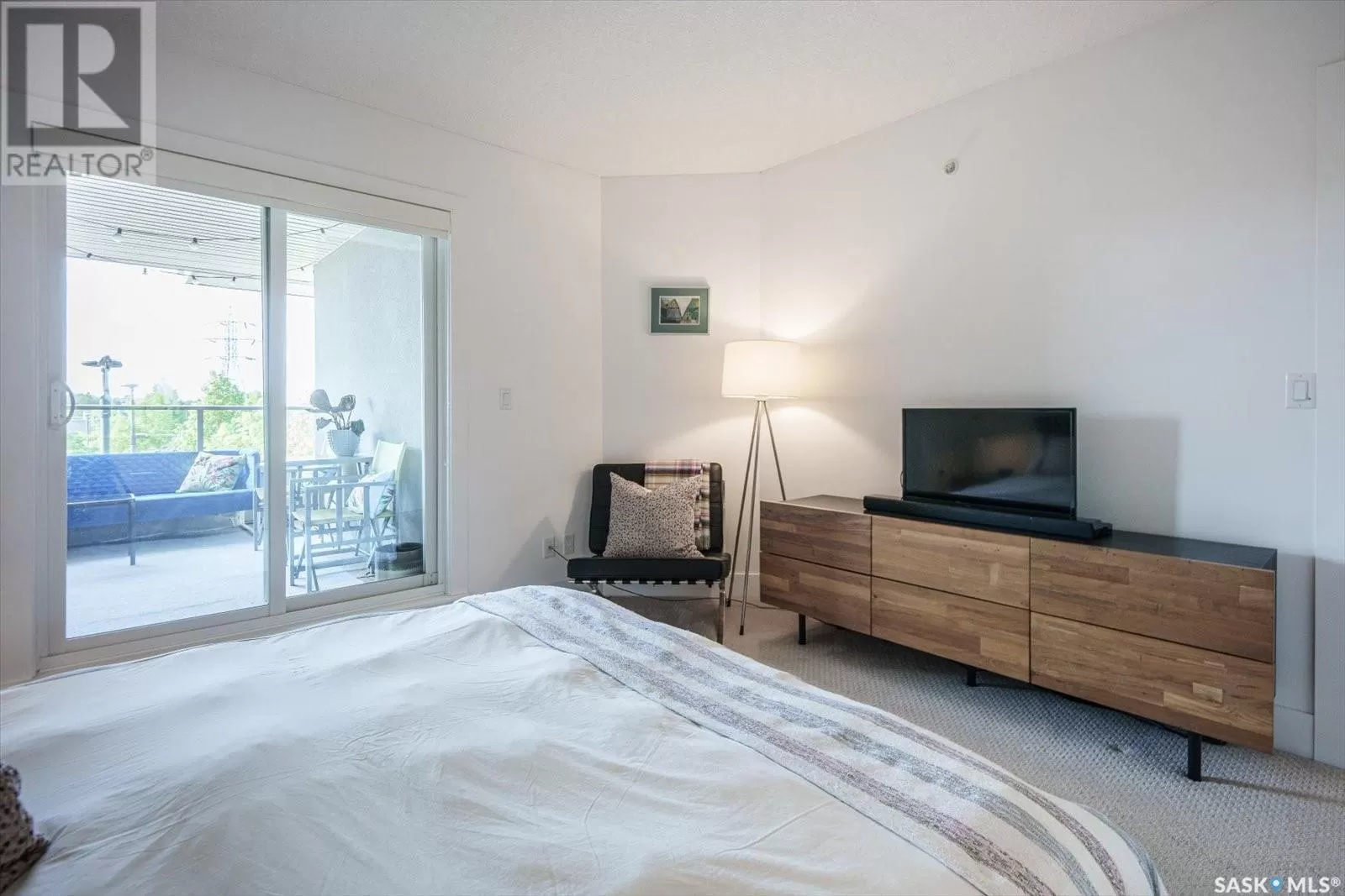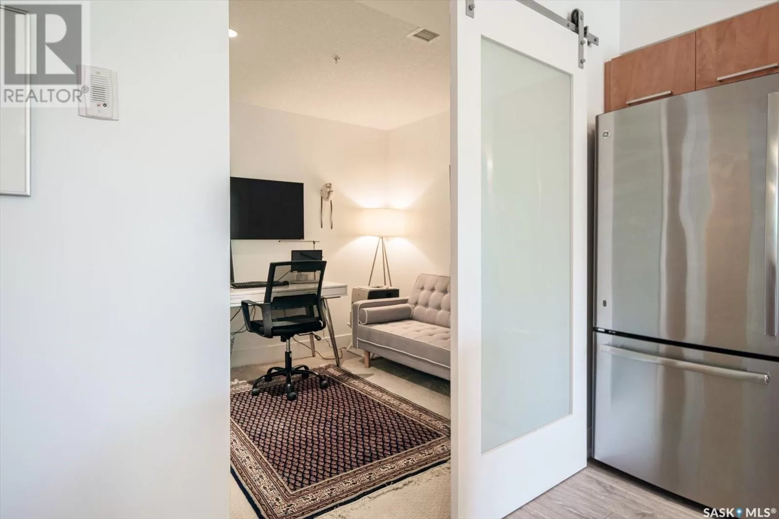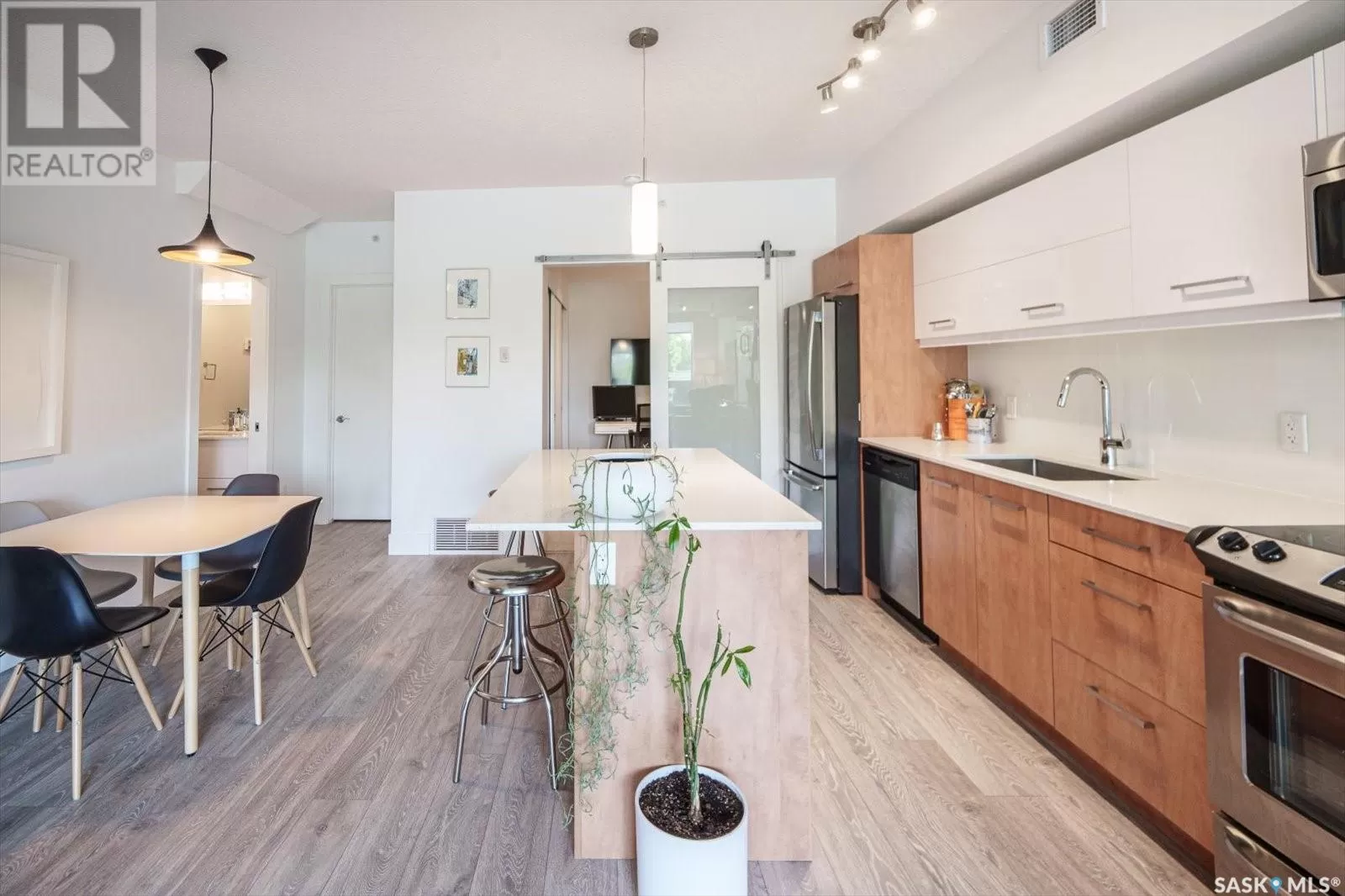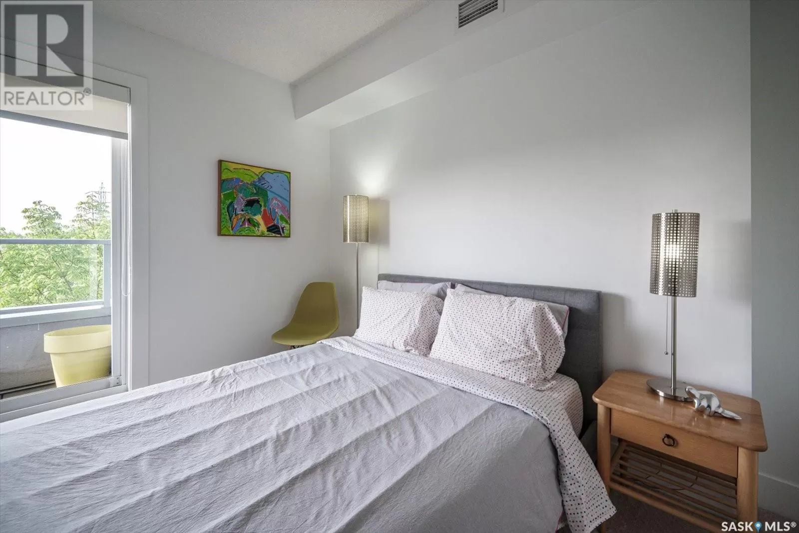 Sophisticated architecture and functional design come together in this centrally located, modern two-storey condominium. Located in River Landingâjust steps from the Remai Modern, Meewasin Trail, and the cityâs best cafésâthis home is ideal for an active professional or as a revenue property alike. Facing a lovely park and next to the Gather Local Market, the unit offers rare outdoor living with two private balconiesâeach accessible from the upper-level bedroomsâand a private, landscaped patio on the main floor. The main level features open, well-proportioned, and light-filled living spaces. A central kitchen with island, stainless steel appliances, dedicated dining area, and a bright living room with large windows anchor the space. A generous den on this level makes for an ideal home office or flex space. A walk-in pantry, powder room, and enclosed storage room complete the floor. Upstairs, two spacious bedrooms each have access to their own private terrace. The primary includes a walk-in closet and its own ensuite, while the second bedroom is steps from another full bath and the in-suite laundry. Two underground parking stalls, a storage locker, in-suite ventilation system, and access to bike storage round out the offering. Pets permitted with restrictions. Condos of this caliber rarely come to marketâwell-positioned for both lifestyle and long-term value. (id:27476)