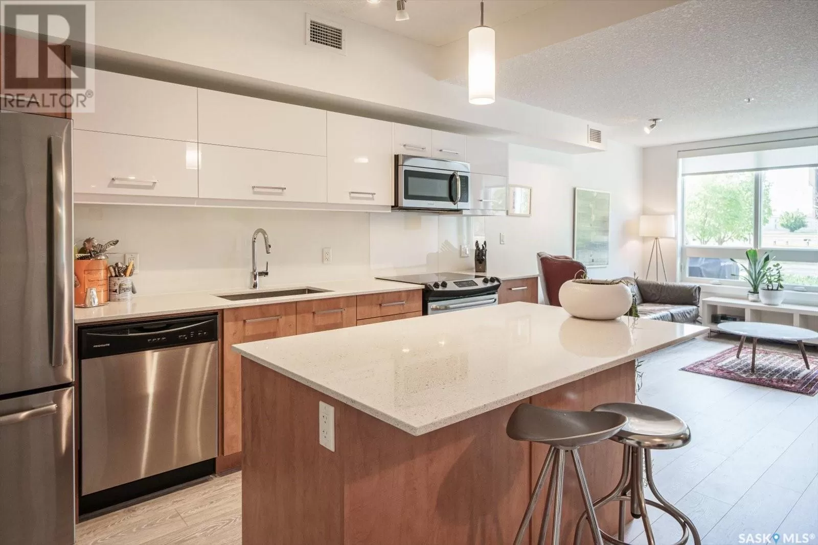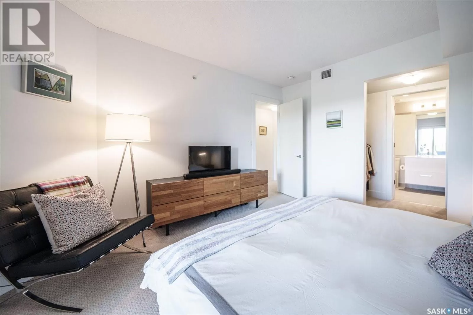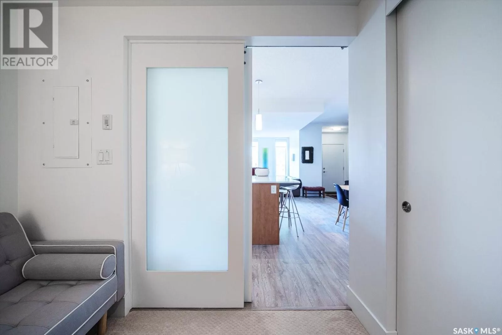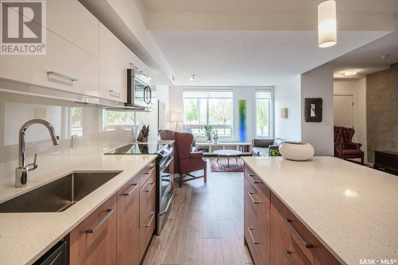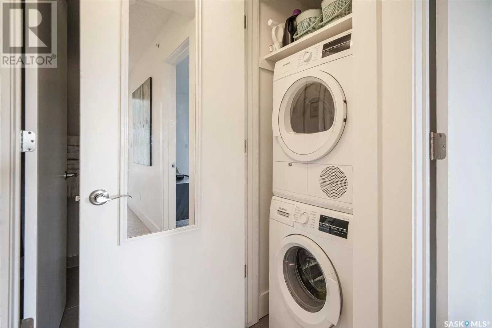 Sophisticated architecture and functional design come together in this centrally located, modern two-storey condominium. Located in River Landingâjust steps from the Remai Modern, Meewasin Trail, and the cityâs best cafésâthis home is ideal for an active professional or as a revenue property alike. Facing a lovely park and next to the Gather Local Market, the unit offers rare outdoor living with two private balconiesâeach accessible from the upper-level bedroomsâand a private, landscaped patio on the main floor. The main level features open, well-proportioned, and light-filled living spaces. A central kitchen with island, stainless steel appliances, dedicated dining area, and a bright living room with large windows anchor the space. A generous den on this level makes for an ideal home office or flex space. A walk-in pantry, powder room, and enclosed storage room complete the floor. Upstairs, two spacious bedrooms each have access to their own private terrace. The primary includes a walk-in closet and its own ensuite, while the second bedroom is steps from another full bath and the in-suite laundry. Two underground parking stalls, a storage locker, in-suite ventilation system, and access to bike storage round out the offering. Pets permitted with restrictions. Condos of this caliber rarely come to marketâwell-positioned for both lifestyle and long-term value. (id:27476)
