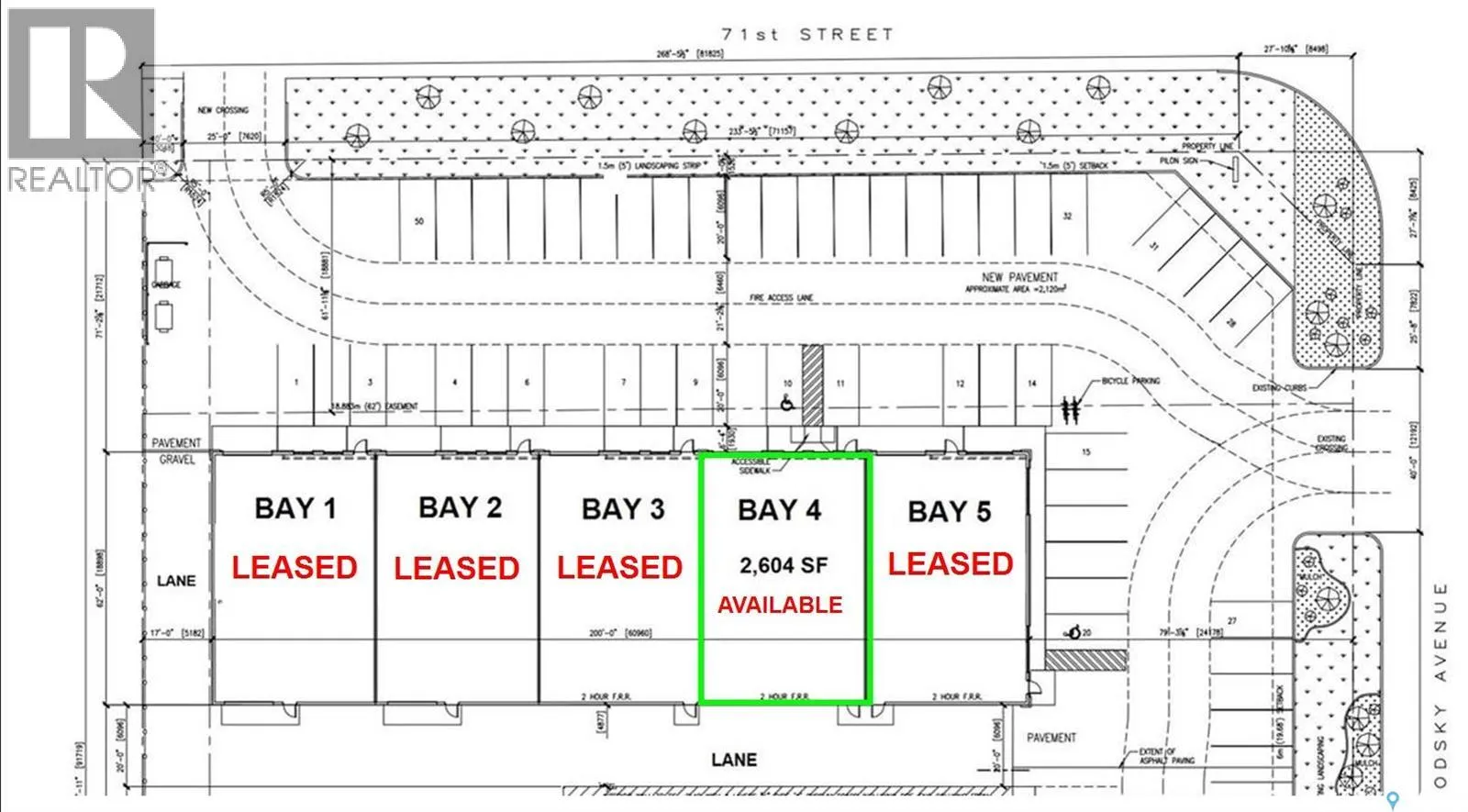 LAST REMAINING BAY AVAILABLE FOR LEASE. Bay #40, 4023 Brodsky Ave. (2,604 SF). Warehouse bay features clear span construction; floor drains with interceptor pits; 12'x12' automatic grade level over head doors; high bay LED lighting; ample paved parking available (50 stalls); 62' deep bays; 100 A, 230/208 V, 3 Phase electrical panel. Office build outs to Tenants specifications can be included with Lease for qualified Tenants. Excellent exposure on 71st St., conveniently located on the Northwest corner of Brodsky Ave. and 71st St. E. This property has great access to all north end roadways and the Chief Mistawasis bridge provides easy access to the east side. Bay #40 - 2604 SF. $16.00 PSF Net Rent; $4.35 PSF Occupancy Cost (inc. Property Tax) Net Rent ($3,472.00) + Occupancy Costs ($943.95) = $4,415.95 + GST per month. (id:27476)