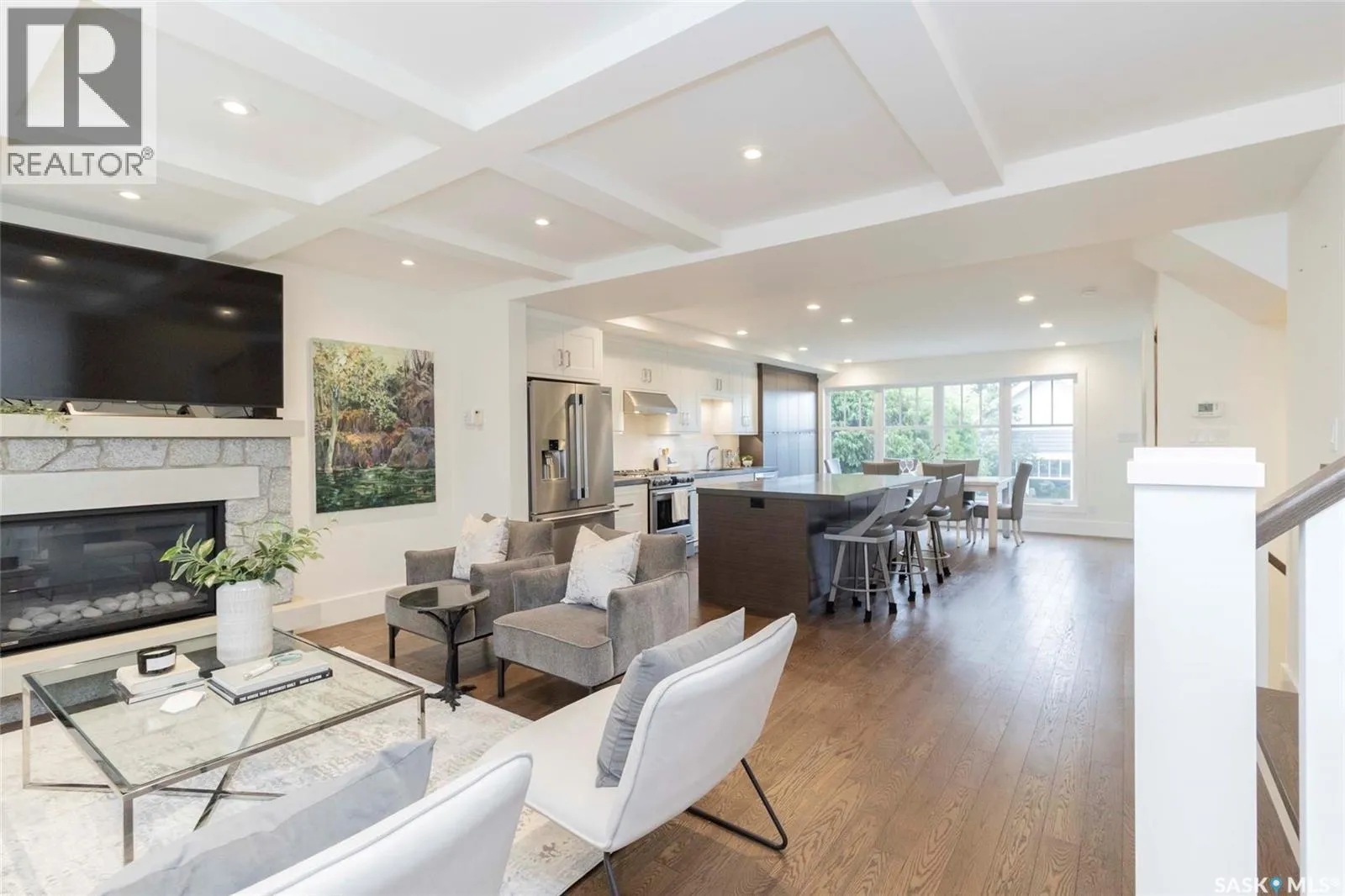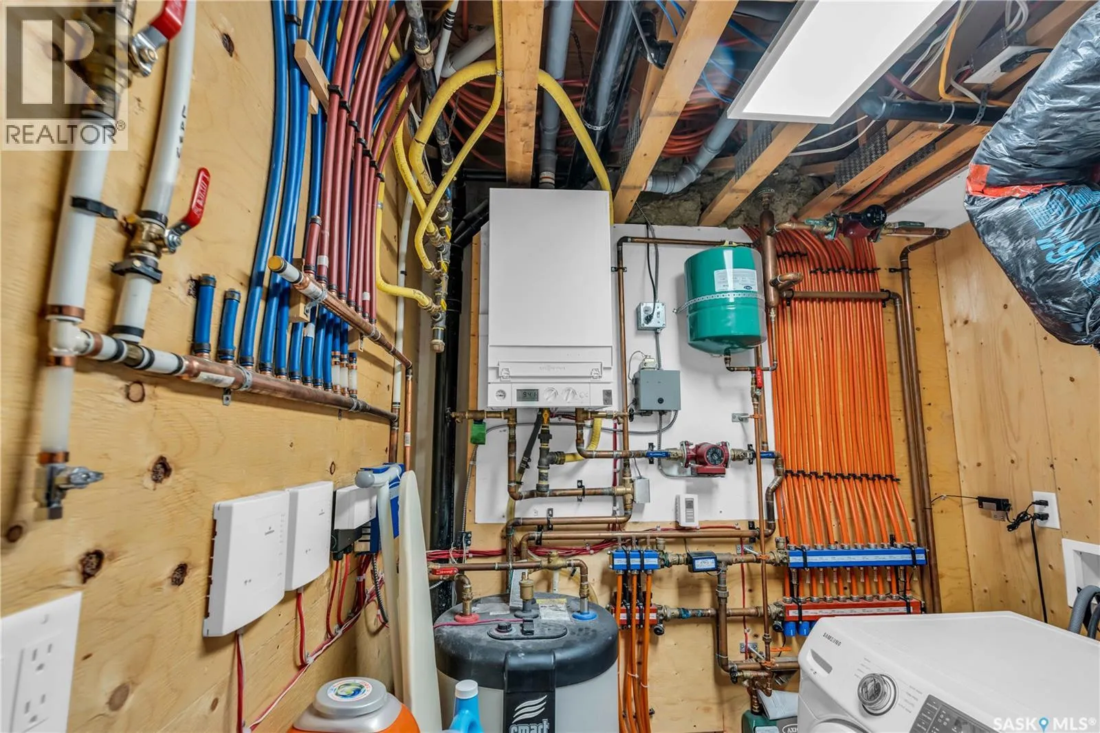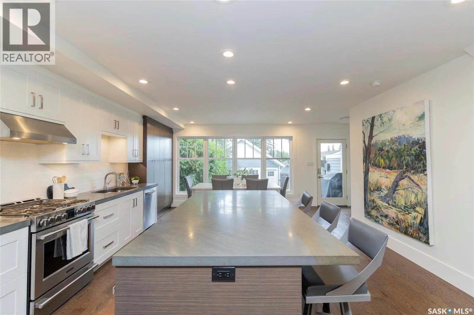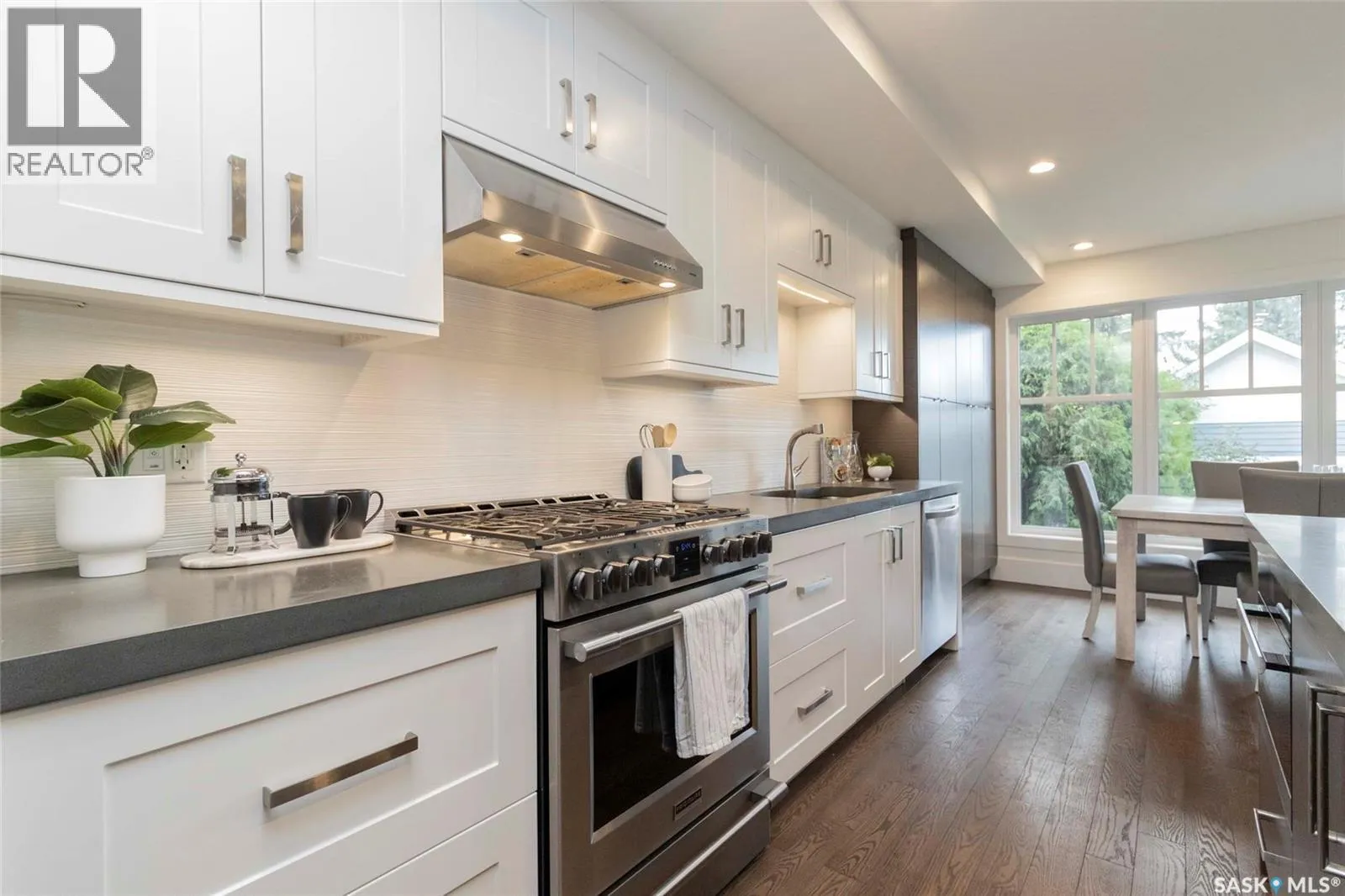 Welcome to 1315A 11th St E, a thoughtfully designed Craftsman-style home that blends timeless elegance with modern energy efficiency. This home is built with high quality finishes, and you can see it in the details. The main floor boasts a chefâs kitchen with custom cabinetry, a large island topped with 2" bluestone, and premium appliances including a gas range, and Miele speed and steam ovens. The bright living room features coffered ceilings, a gas fireplace with masonry surround, and large south-facing windows. Upstairs, the primary suite includes vaulted ceilings, skylights, and a spa-inspired ensuite with a walk-in tile shower. The bathrooms feature floating bluestone vanities, with a jet tub in the main bath. The spacious secondary bedrooms offer ample storage with built-in shelving and in-closet lighting. The basement is filled with natural light thanks to oversized windows and timber-framed window wells, and includes a home office, family room, and generous storage. Oriented to maximize passive solar gain, the home features natural materials, radiant in-floor heating on all levels, dual insulation (spray foam and reflective), and an offset stud wall system to eliminate thermal bridging. The professionally landscaped yard is finished with bluestone tile, LED lighting, and low-maintenance micro-drip irrigation. A heated, insulated double garage provides space for two vehicles, plus an additional driveway in front and parking behind the garage. A rare blend of beauty, efficiency, and craftsmanship in a prime location! (id:27476)