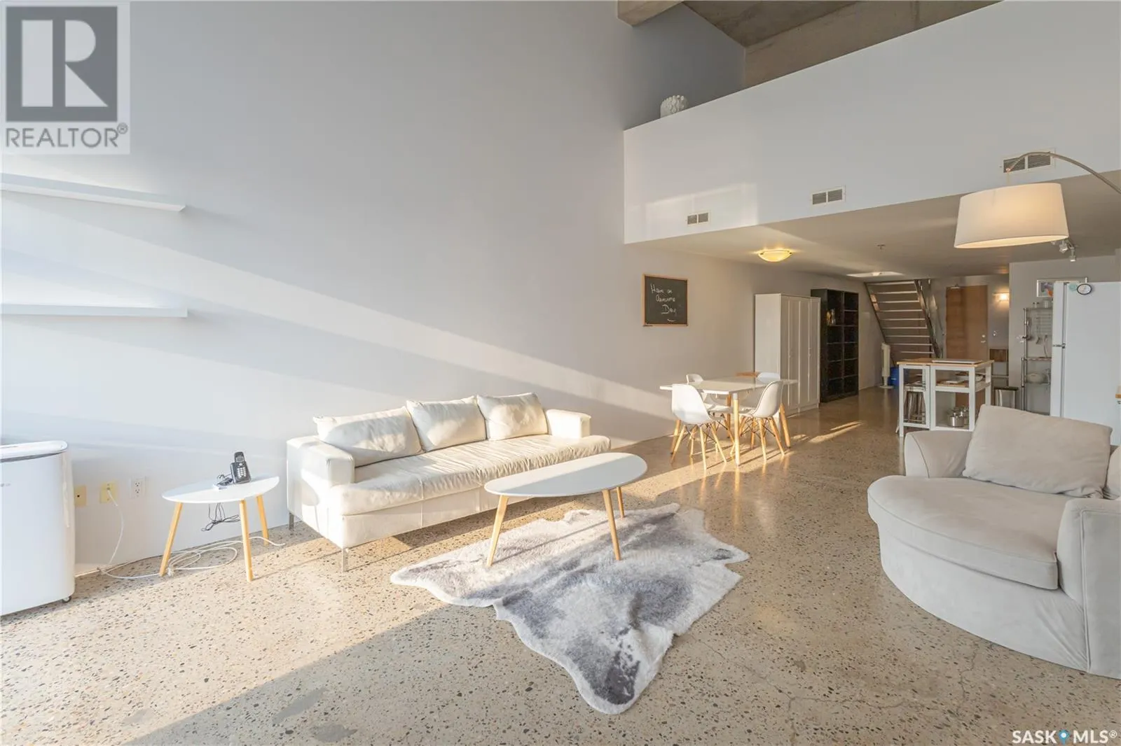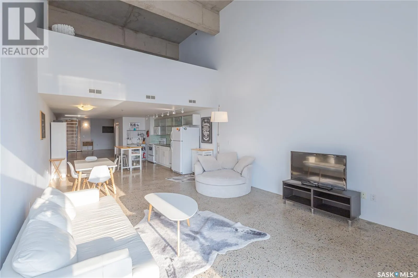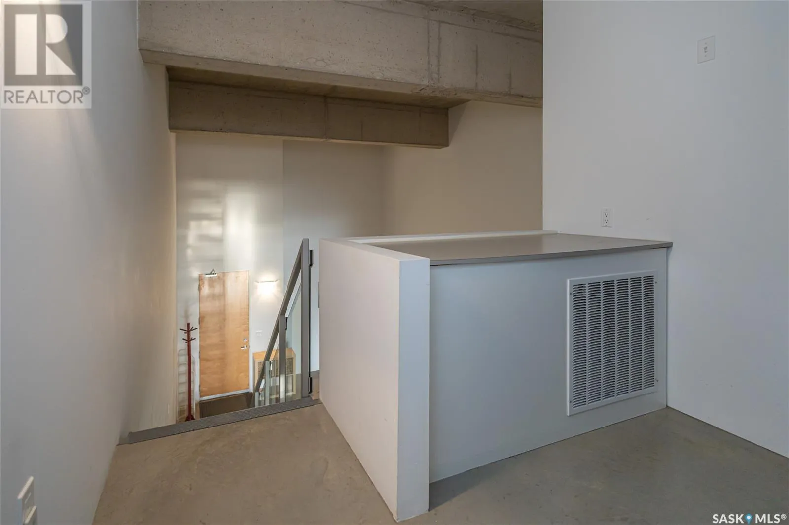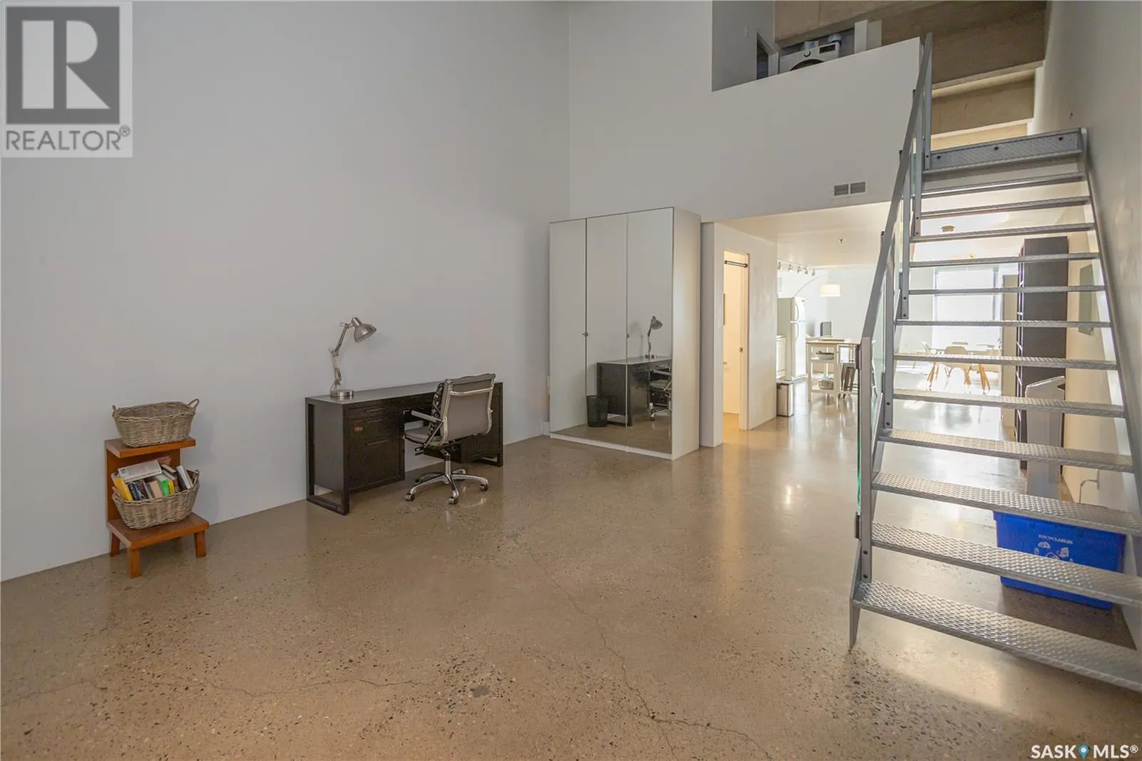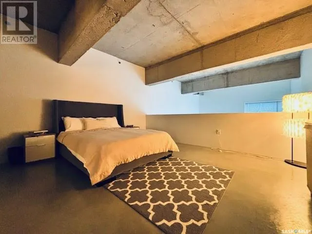 Experience the best of downtown living in this spacious and modern 1,268 sq ft loft condo, located in the sought-after 2nd Ave Lofts. With its industrial-chic design, polished concrete floors, stainless steel accents, and soaring ceilings, this 4th floor unit blends urban style with everyday comfort. The open-concept layout features a sleek kitchen with a center island perfect for entertaining. Upstairs features a large open loft bedroom, a 4 pc bathroom and laundry. A 2nd bedroom could be added to the left of the foyer. The building itself is just as impressive, with open-air corridors, accented by glass railings, a dramatic skylight-filled atrium, and a contemporary lobby that makes a statement. Enjoy the rooftop terrace complete with a pergola-covered BBQ area, perfect for relaxing or hosting friends. Additional perks include a fitness centre, elevator, and secure underground heated parking. One underground parking stall included. Quick possession is available, just move in and start enjoying downtown living at its finest! Condo fees include power and heat! Buyer/Buyer's Agent to verify all measurements. Call to book your viewing today. (id:27476)