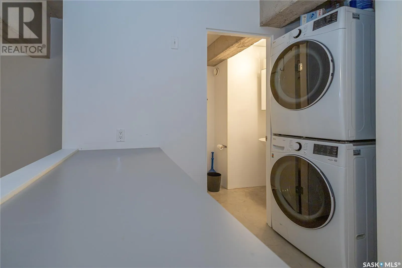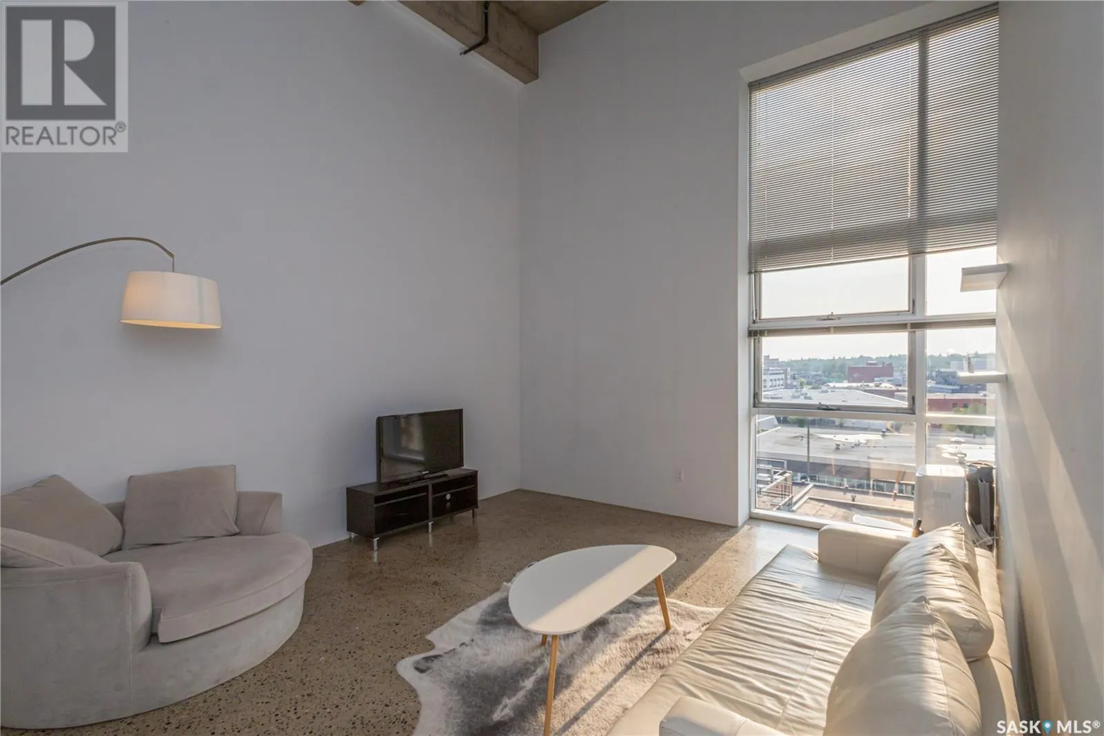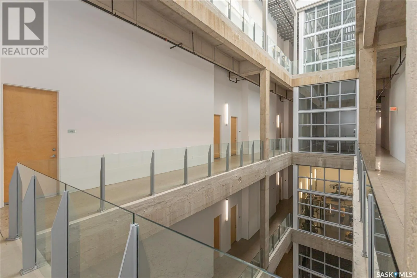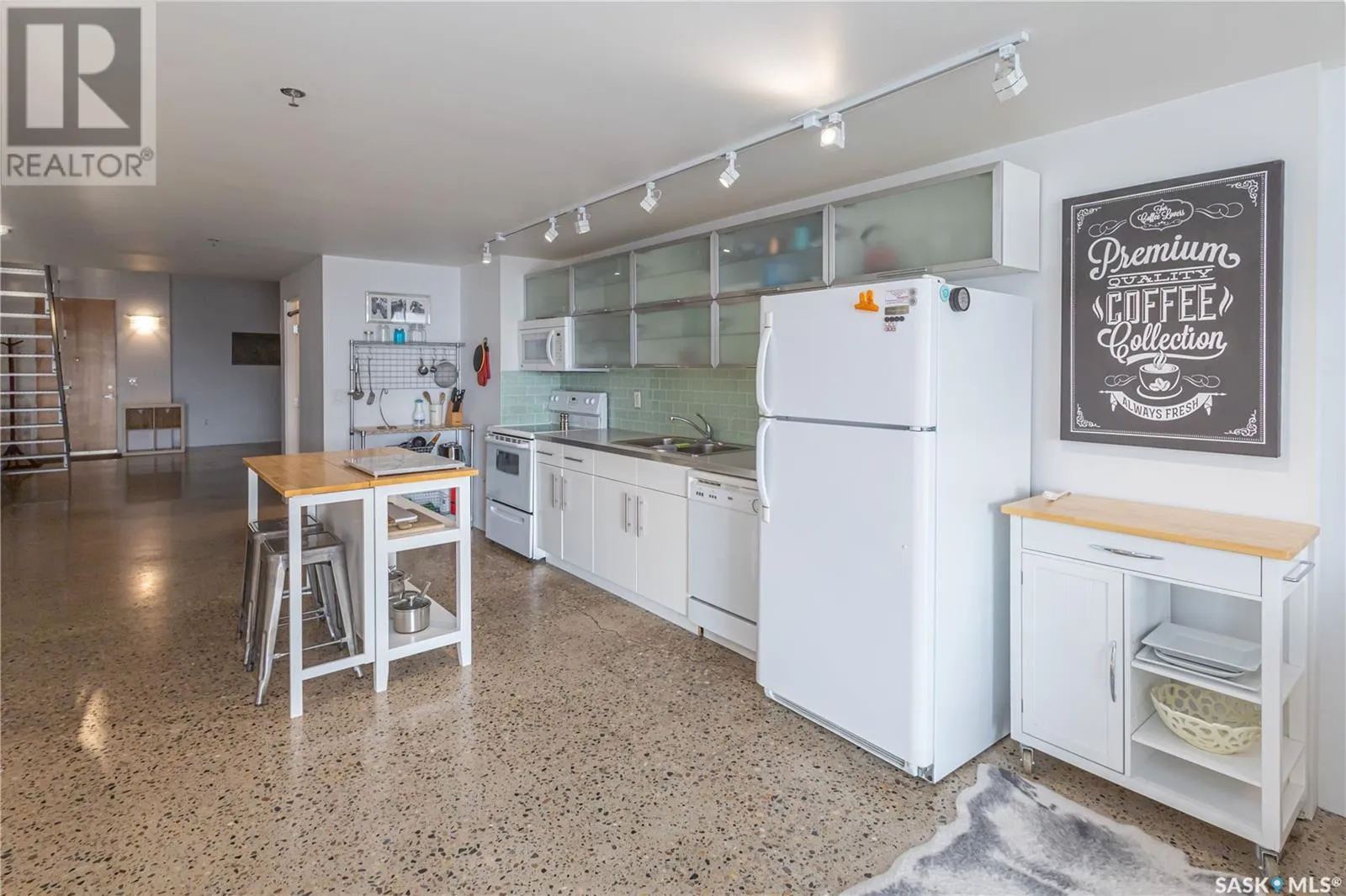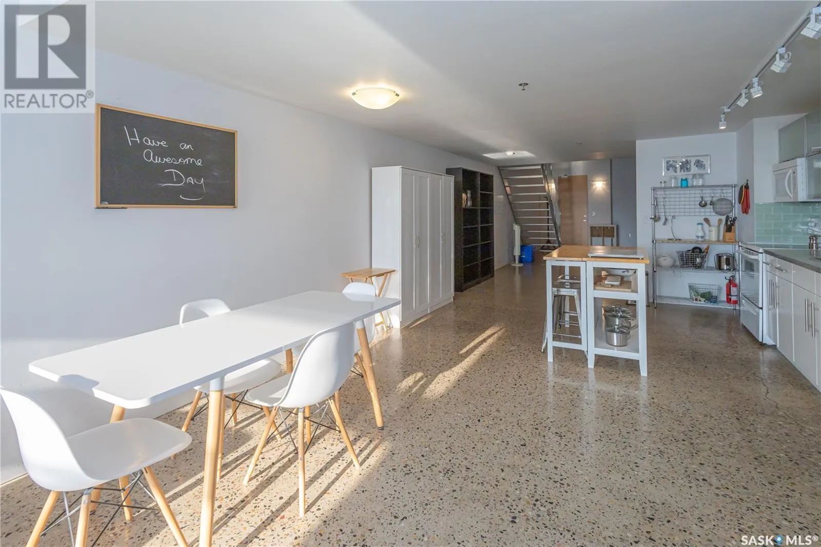 Experience the best of downtown living in this spacious and modern 1,268 sq ft loft condo, located in the sought-after 2nd Ave Lofts. With its industrial-chic design, polished concrete floors, stainless steel accents, and soaring ceilings, this 4th floor unit blends urban style with everyday comfort. The open-concept layout features a sleek kitchen with a center island perfect for entertaining. Upstairs features a large open loft bedroom, a 4 pc bathroom and laundry. A 2nd bedroom could be added to the left of the foyer. The building itself is just as impressive, with open-air corridors, accented by glass railings, a dramatic skylight-filled atrium, and a contemporary lobby that makes a statement. Enjoy the rooftop terrace complete with a pergola-covered BBQ area, perfect for relaxing or hosting friends. Additional perks include a fitness centre, elevator, and secure underground heated parking. One underground parking stall included. Quick possession is available, just move in and start enjoying downtown living at its finest! Condo fees include power and heat! Buyer/Buyer's Agent to verify all measurements. Call to book your viewing today. (id:27476)