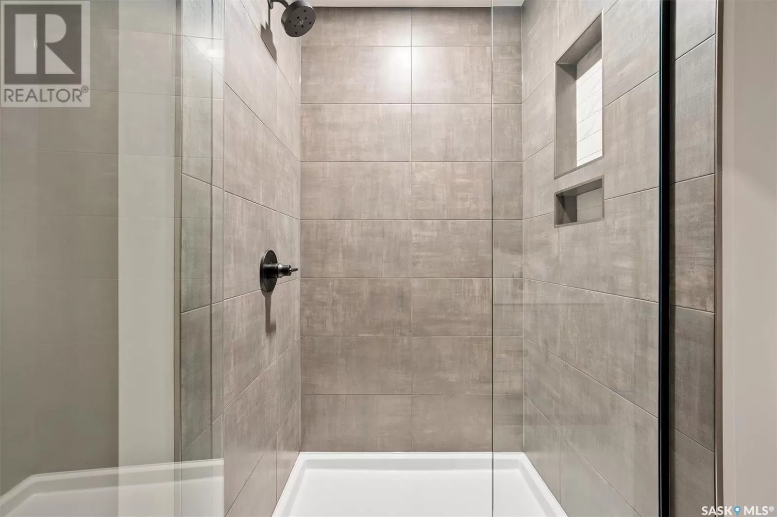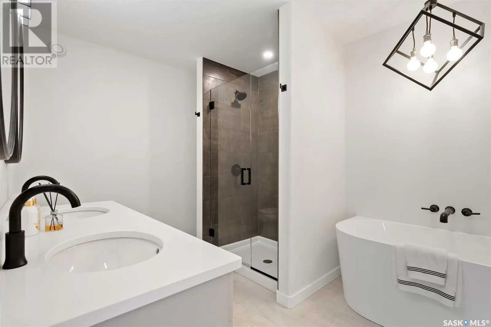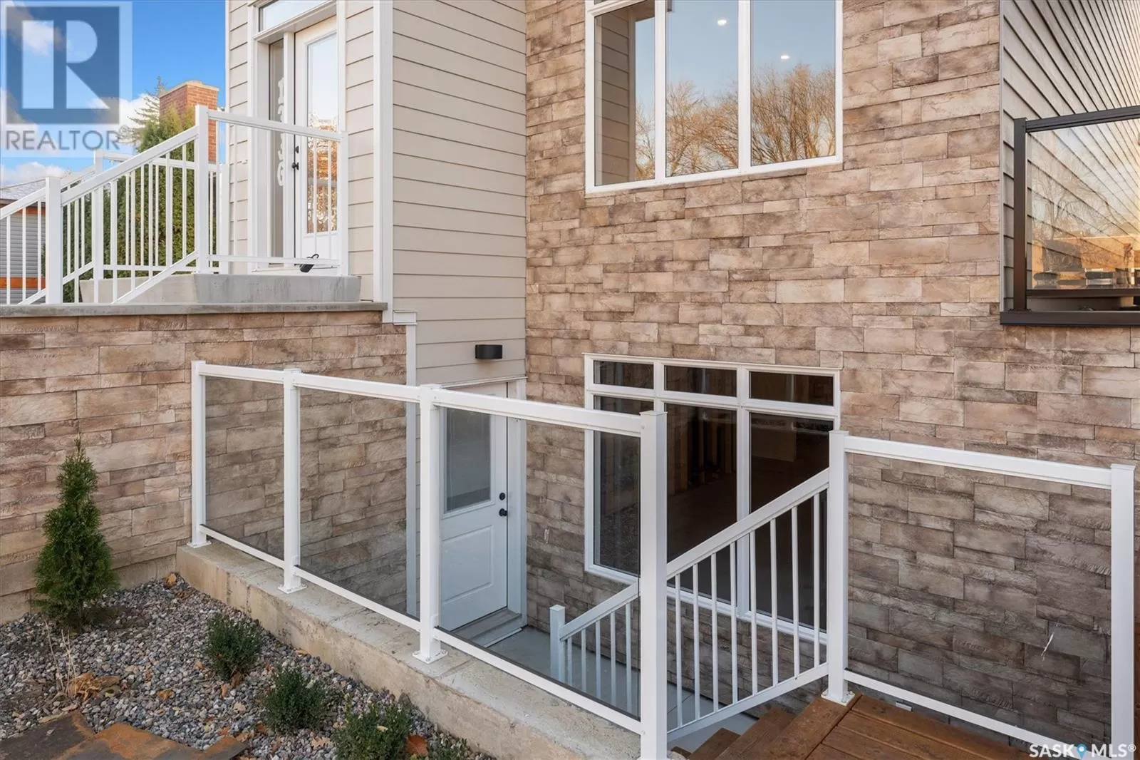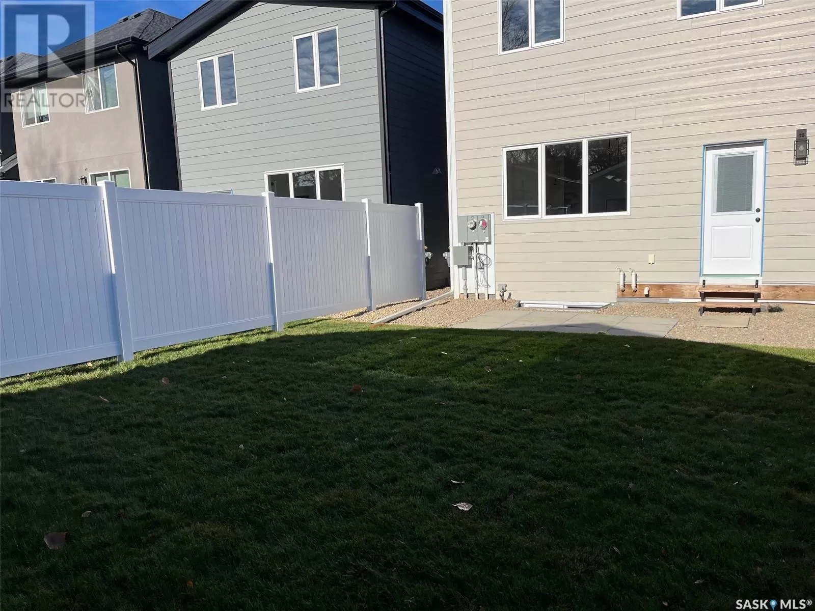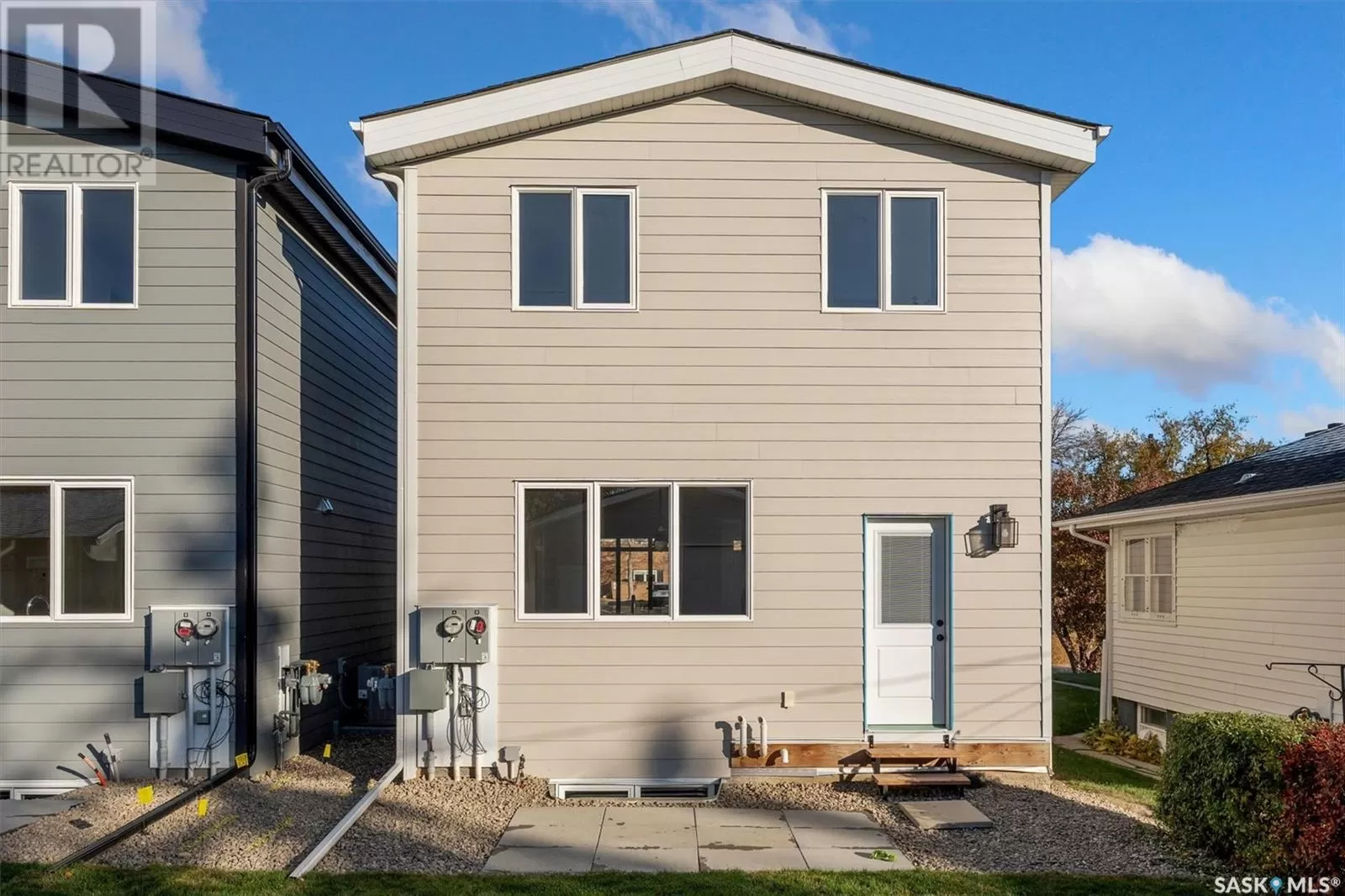 This free standing custom built 2 storey walkout home was built by Capilano Developments and is located in prime Varsity View. Given the unique opportunity of being within walking distance to the University of Saskatchewan the vision was to design a flexible plan appealing to professionals looking to be close to the hospital or University, & even students looking to get into the real estate market. The landscape of this street provided an opportunity to allow access to the basement from the front of the home, which is ideally set up for a suite, home based business, area for extended family visiting, or to use for your own enjoyment. With 1700 sqft on the 2 floors, the main level is spacious and offers a living room with feature gas fireplace with Venetian Plaster surround, dinging room, 2 tone staggered height kitchen cabinets with soft close features / tiled backsplash / garbage/recycle pullout, walk-in pantry, 2 Pc bathroom, and rear mud room with bench seating/storage. The second floor has 3 bedrooms, with the primary bedroom featuring vaulted ceilings, 5 Pc ensuite with soaker tub, walk-in tiled shower, dual sinks, and a walk-in closet. There are two more bedrooms with vaulted ceilings, 4 Pc bathroom, and walk-in laundry area with built-in cabinetry. The basement level is already set up with a secondary electrical panel, future kitchen and laundry rough-ins if a basement suite is of interest, Air B and B, Other features include: luxury waterproof laminate, quartz ctops, A/C, 20âx26â double detached garage with utility door access, majority of yard fenced, rear landscaping with underground sprinklers, front driveway for additional parking. (id:27476)