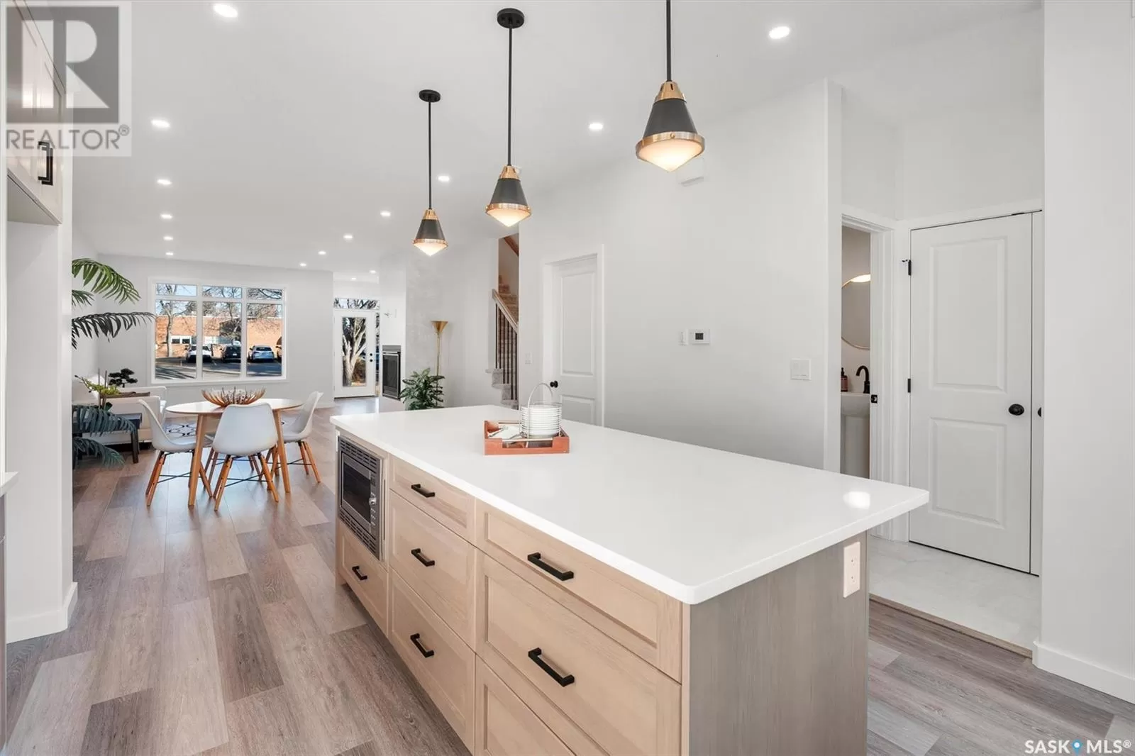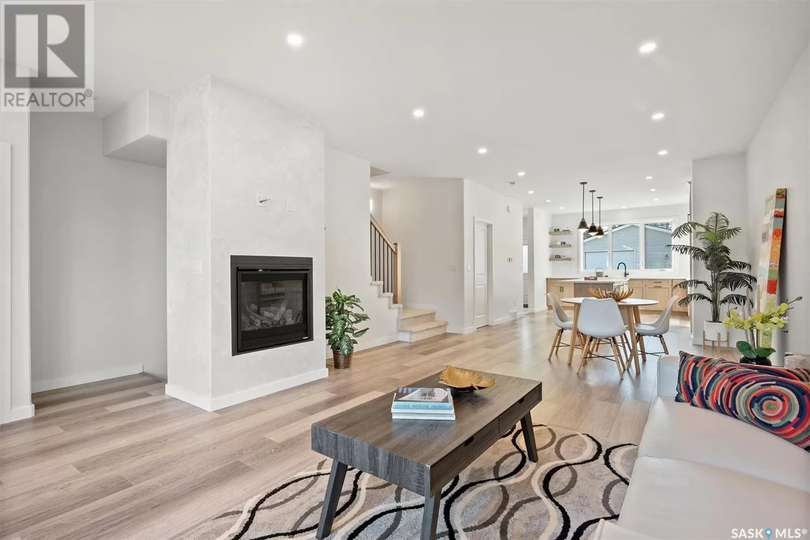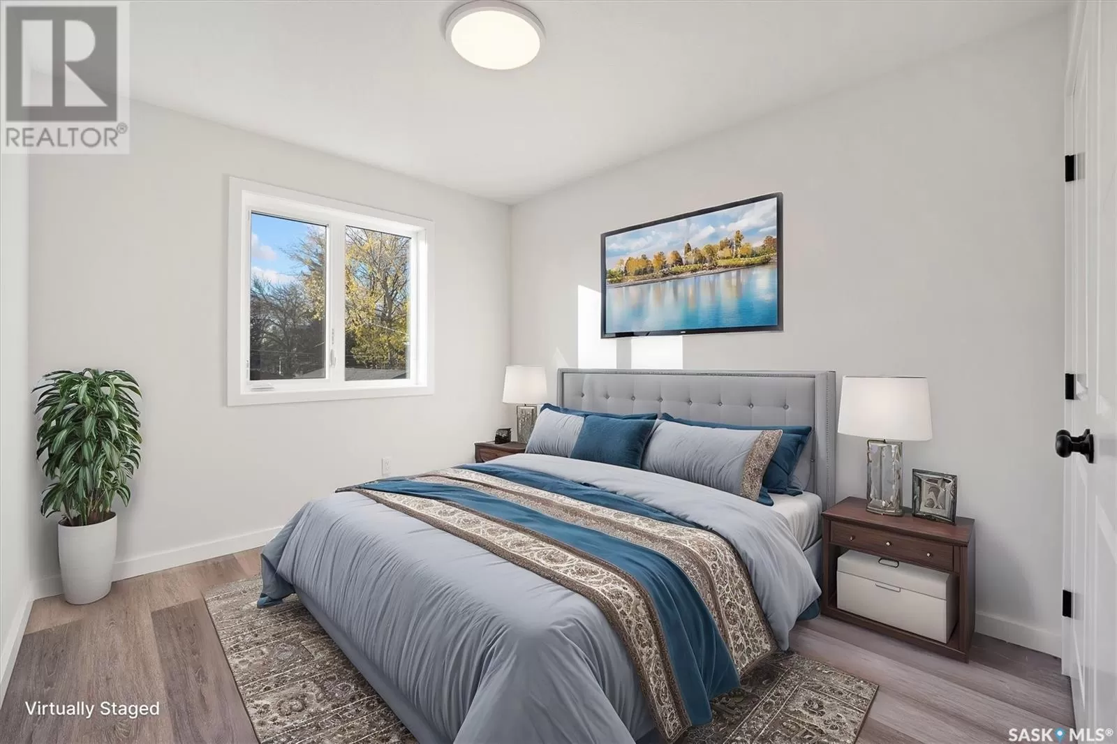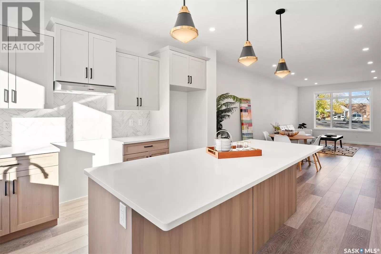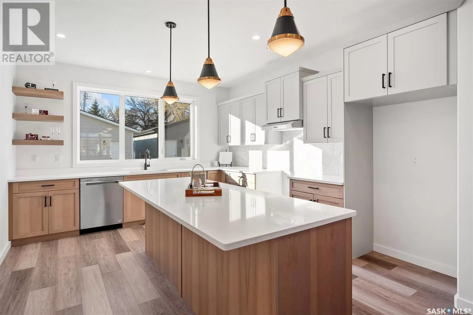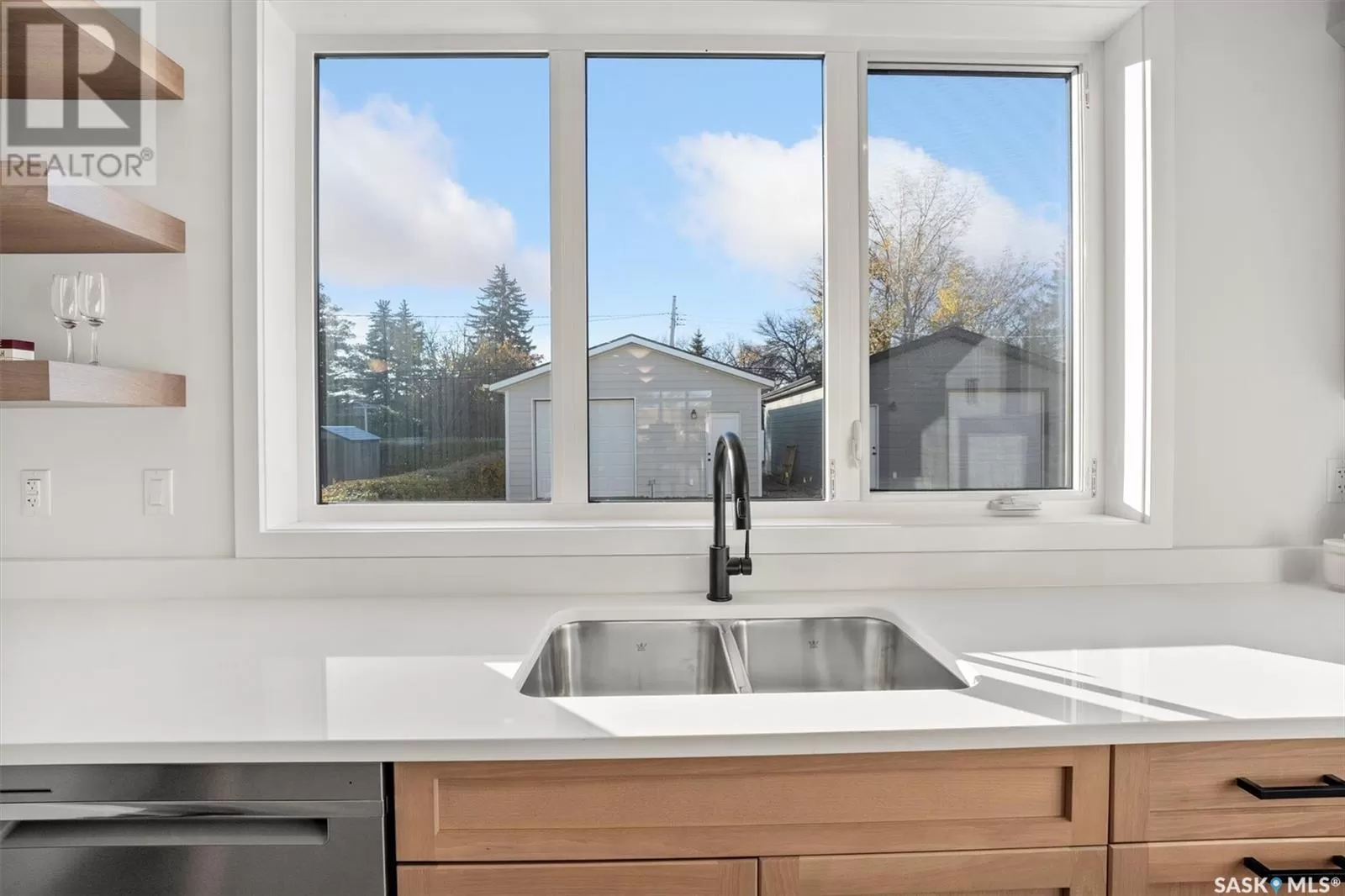 This free standing custom built 2 storey walkout home was built by Capilano Developments and is located in prime Varsity View. Given the unique opportunity of being within walking distance to the University of Saskatchewan the vision was to design a flexible plan appealing to professionals looking to be close to the hospital or University, & even students looking to get into the real estate market. The landscape of this street provided an opportunity to allow access to the basement from the front of the home, which is ideally set up for a suite, home based business, area for extended family visiting, or to use for your own enjoyment. With 1700 sqft on the 2 floors, the main level is spacious and offers a living room with feature gas fireplace with Venetian Plaster surround, dinging room, 2 tone staggered height kitchen cabinets with soft close features / tiled backsplash / garbage/recycle pullout, walk-in pantry, 2 Pc bathroom, and rear mud room with bench seating/storage. The second floor has 3 bedrooms, with the primary bedroom featuring vaulted ceilings, 5 Pc ensuite with soaker tub, walk-in tiled shower, dual sinks, and a walk-in closet. There are two more bedrooms with vaulted ceilings, 4 Pc bathroom, and walk-in laundry area with built-in cabinetry. The basement level is already set up with a secondary electrical panel, future kitchen and laundry rough-ins if a basement suite is of interest, Air B and B, Other features include: luxury waterproof laminate, quartz ctops, A/C, 20âx26â double detached garage with utility door access, majority of yard fenced, rear landscaping with underground sprinklers, front driveway for additional parking. (id:27476)