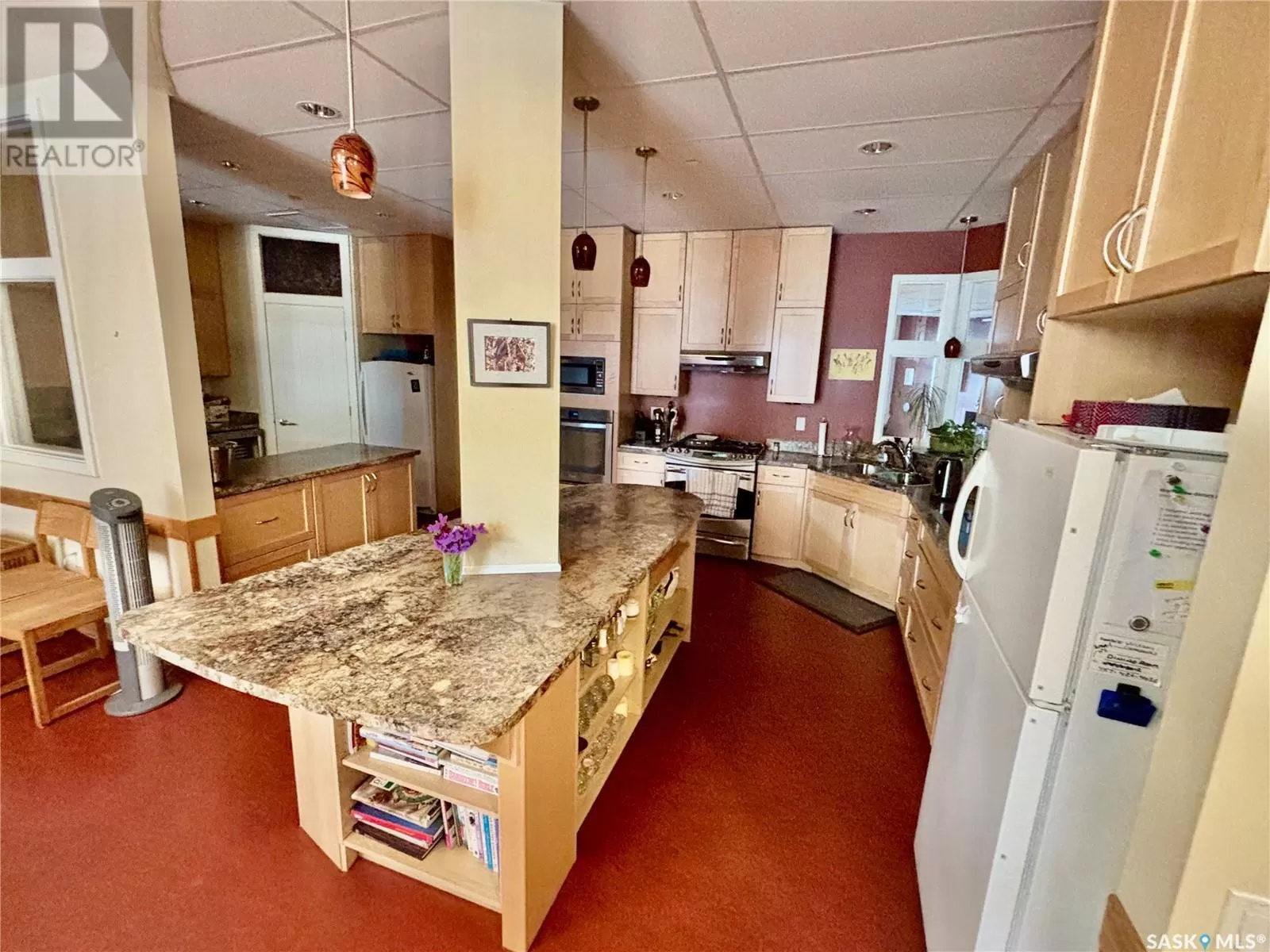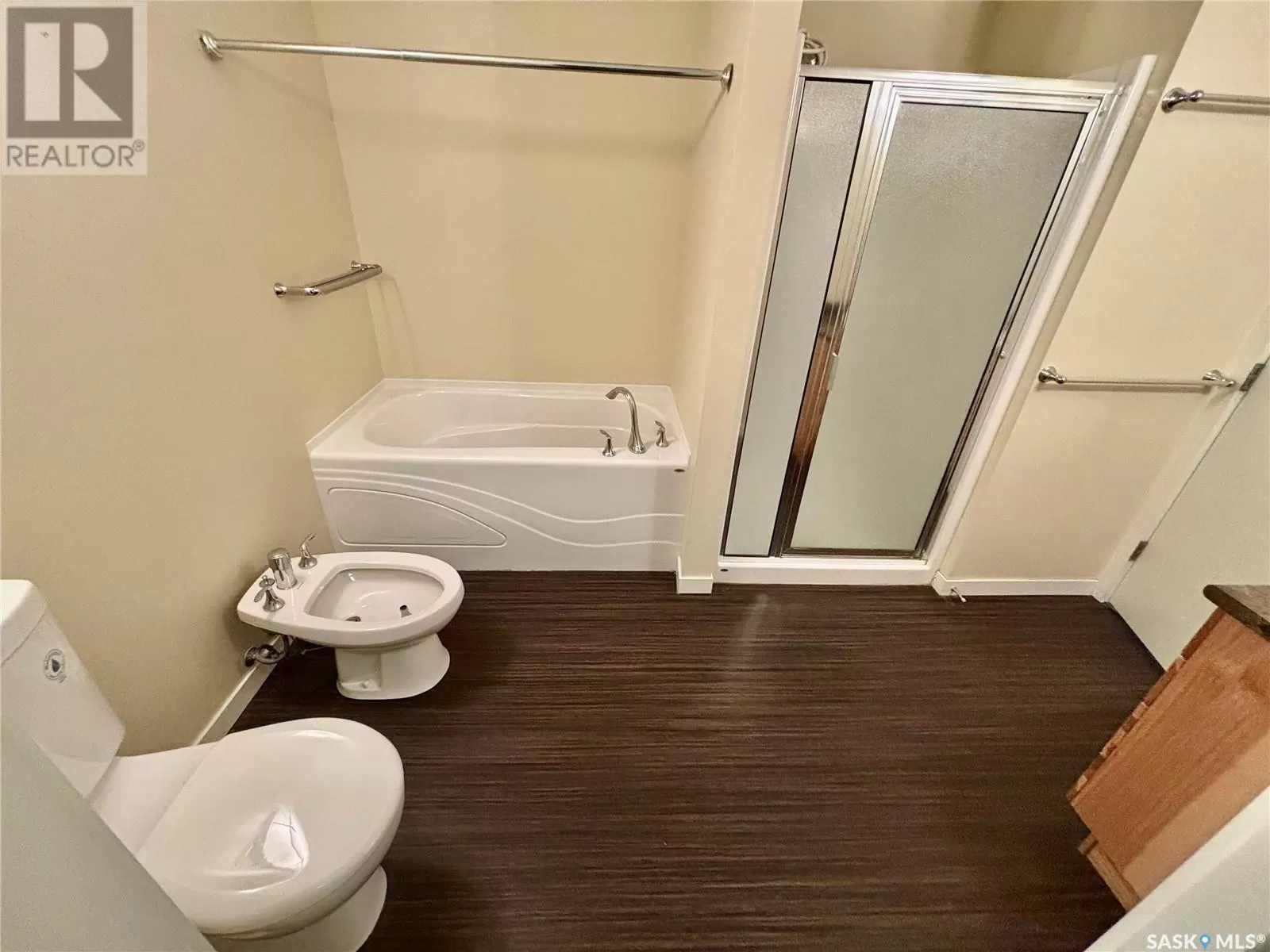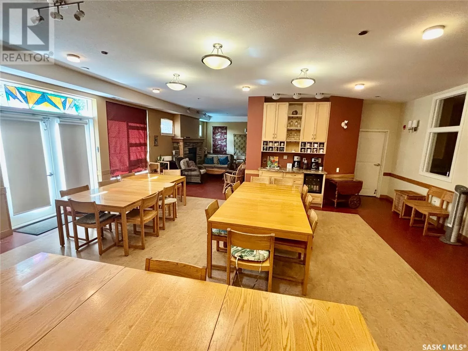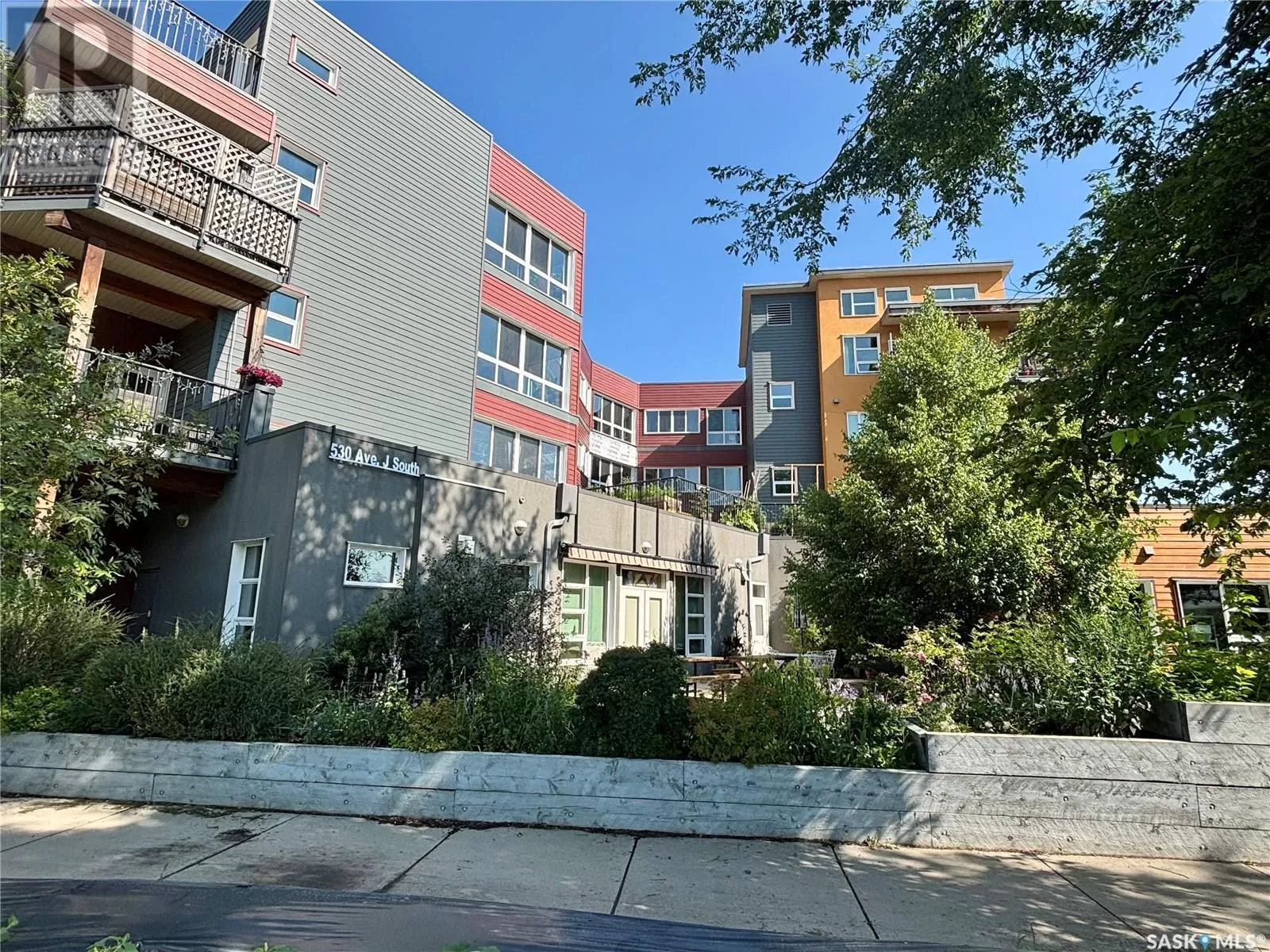 Welcome to Wolf Willow Co housing â a vibrant community offering a lifestyle that embraces both comfort and connection. This thoughtfully designed development is perfect for those looking to right-size without sacrificing hobbies, green space, or social engagement. Located just minutes from Saskatoon's downtown core and within walking distance of the scenic riverbank, Riversdale shops, and the Spadina Avenue Legion Hall, Wolf Willow offers convenience in a thriving and inclusive setting. This beautifully appointed northeast-facing unit features an open-concept layout with oversized windows that flood the space with natural light. The spacious kitchen boasts ample cabinetry, a large peninsula with included counter stools, and a seamless view into the living and dining areasâideal for entertaining indoors or out on your generous private balcony, large enough to host guests in style. Two well-sized bedrooms, including a primary with door to large bathroom.A large bathroom complete with separate tub and walk-in shower Cork floors, wide doorways, and lower switch plates, making the unit easily wheelchair accessible In-suite laundry hookups and extensive closet space, there is common use laundry as well. Secure, climate-controlled ground floor heated parking and storage Rooftop solar panels, LED lighting, 2"x8" wall construction, and energy-efficient fixtures Beautifully landscaped terrace and fenced garden with raised beds, Bright hallways with floor-to-ceiling windows for natural light and garden views Wolf Willow isn't just a place to liveâitâs a community of like-minded, mature adults who value sustainability, collaboration, and a vibrant shared lifestyle. (id:27476)