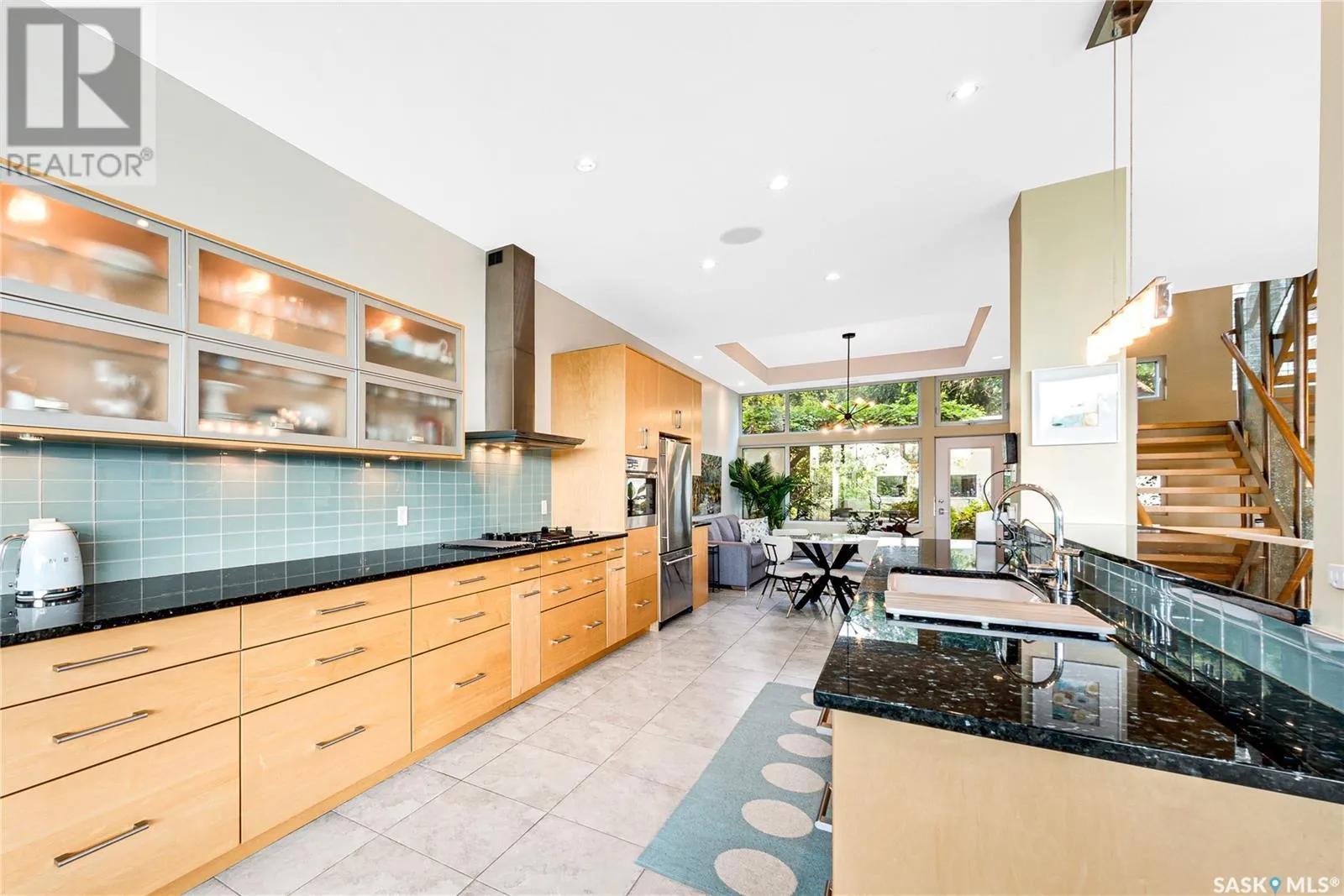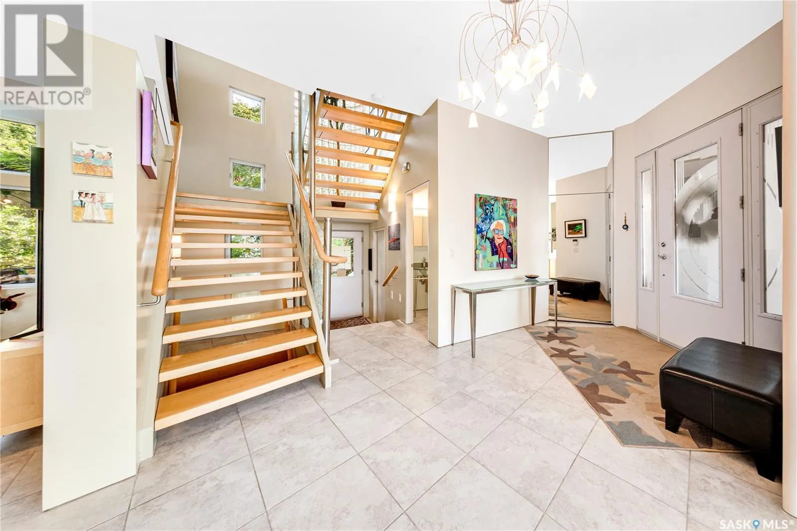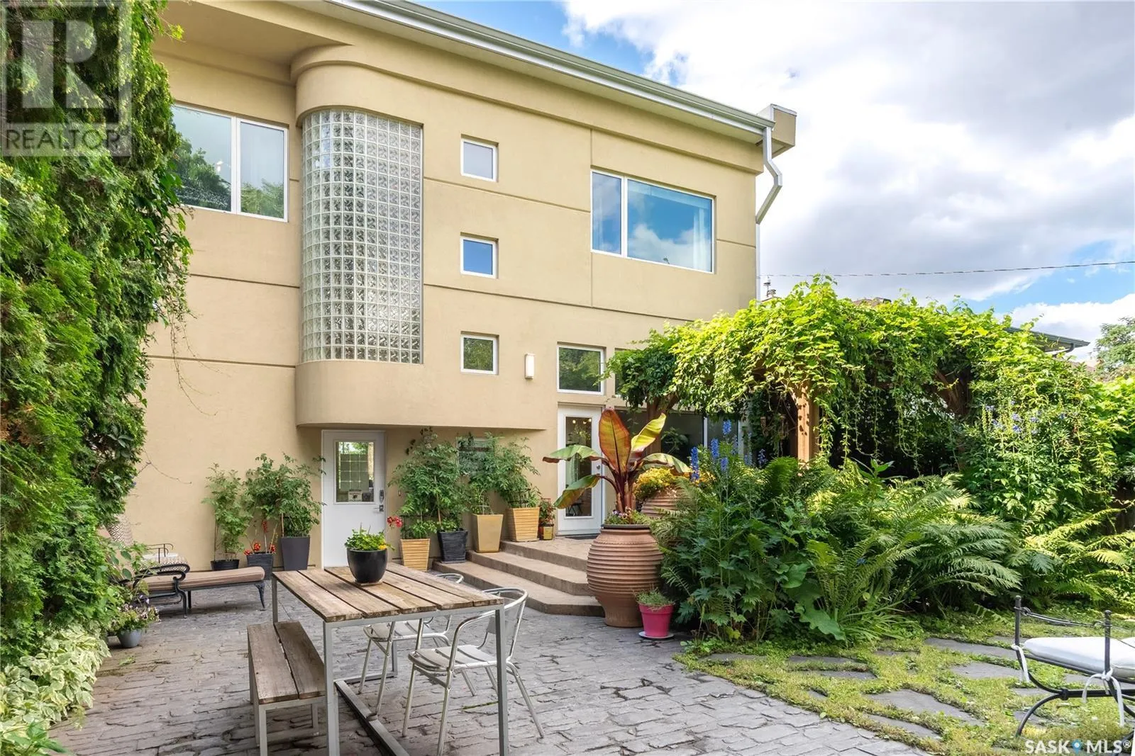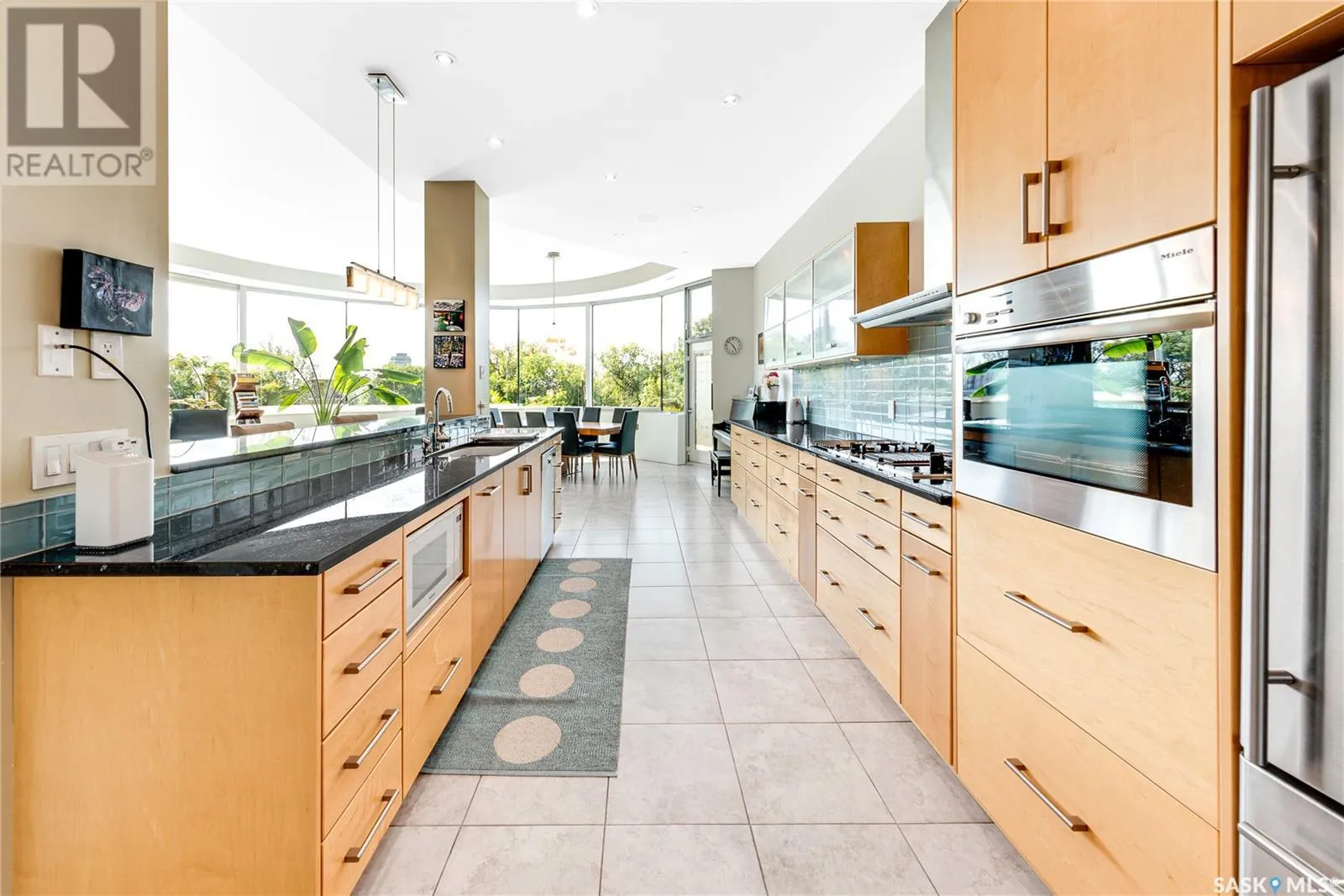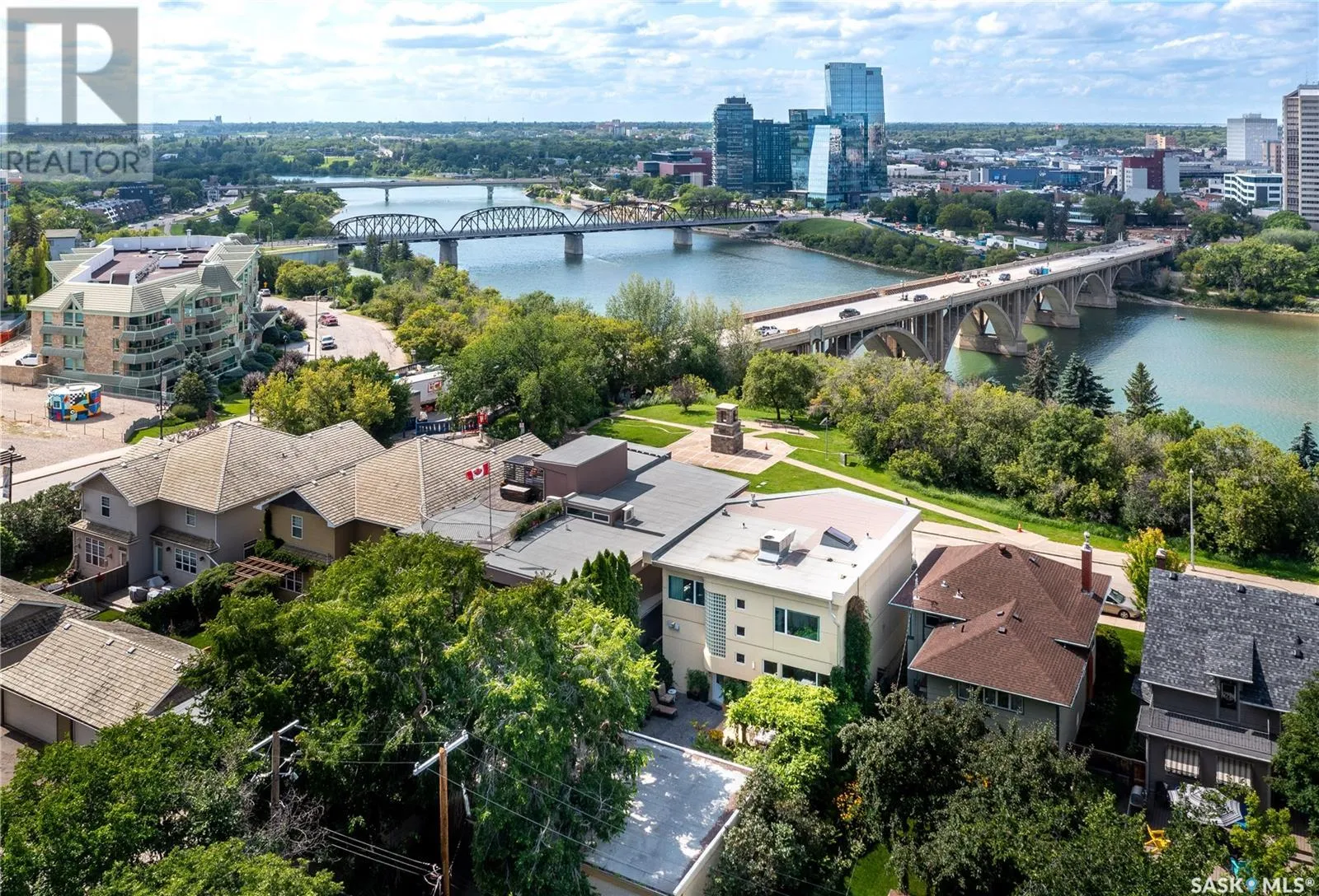 Riverfront with sweeping views of downtown Saskatoon. Welcome to 616 Saskatchewan Crescent East, an extraordinary residence perched on Saskatoonâs most iconic street. Panoramic views stretch from the Broadway Bridge to the historic Bessborough Hotel, offering a daily backdrop of stillness and beauty. Designed with intention and built to last, this home is a rare blend of enduring structure, refined comfort, and timeless serenity. Crafted with concrete core floors and ICF block construction up to the second storey, and framed with steel studs above, its strength is unmistakable. The exterior is wrapped in a 7-layer acrylic stucco system by Sask Stucco, with a restored balcony by Al Ro and a durable Flynn torch-on roof supporting commercial-grade rooftop HVAC and a dedicated makeup air unit. Inside, a Viessmann boiler quietly warms all three levels, supported by an air exchanger and Culligan RO system. The kitchen features solid maple cabinetry by Ben McNee, a Miele stove and charcoal grill, Miele dishwasher, hood fan, and built-in Jennair fridge. Elegant finishes are found throughoutâsolid core doors, Creative Closets blinds, Unique Lighting fixtures, and a Russound audio system with in-ceiling speakers. In the lower-level family room, 5.1 surround sound by Speakercraft, subwoofer, and wet bar invite effortless entertaining. The sculptural staircase, built with steel and solid wood, is paired with railings by R&B Bannister and glasswork by Dynamic Glass. Outdoors, unwind beneath the grapevine-draped pergola, enjoy cherry and apple trees, or relax on the stamped concrete patio. A triple detached garage offers one double, one oversized single, and a rear overhead door to the yard. Gas BBQ hookup and Simplex keyless locks provide everyday ease. This is more than a homeâitâs a peaceful rhythm, a grounded retreat, and a rare offering in Saskatoonâs most sought-after location. (id:27476)