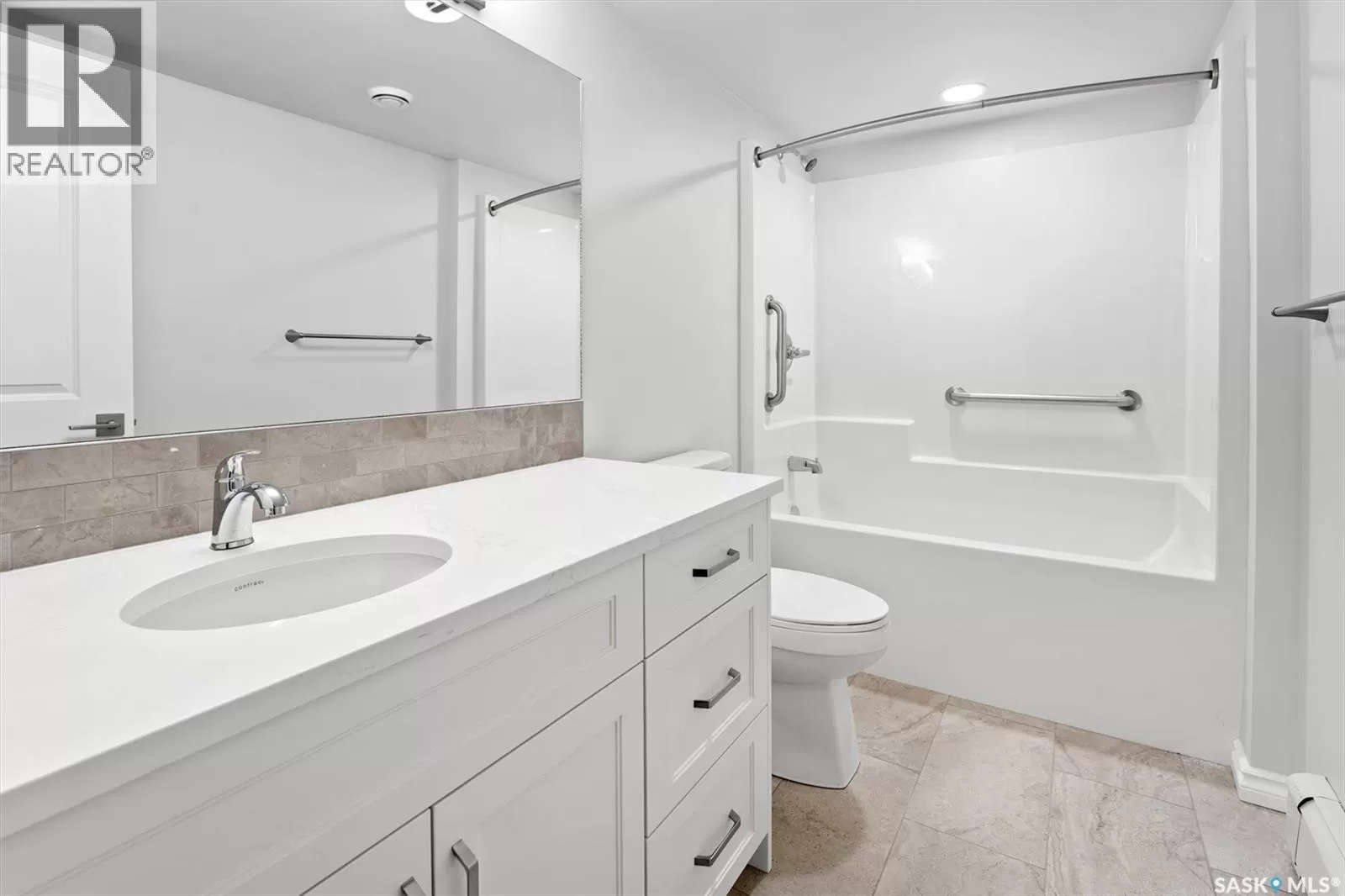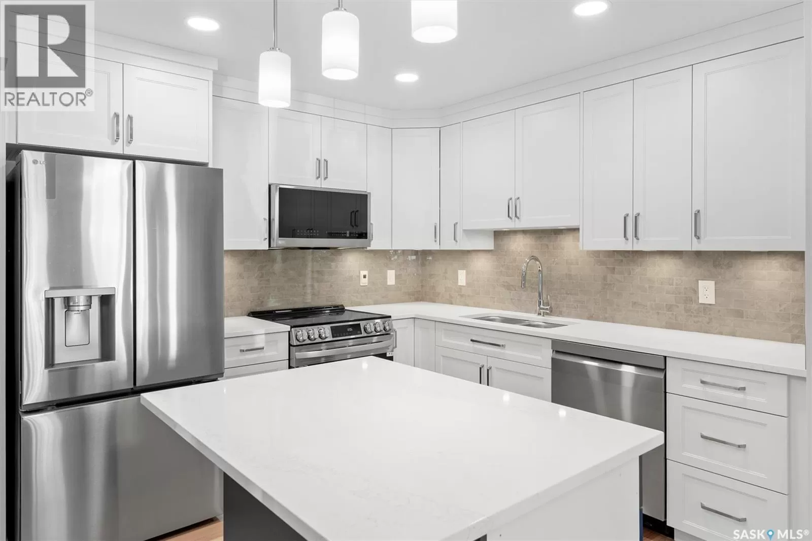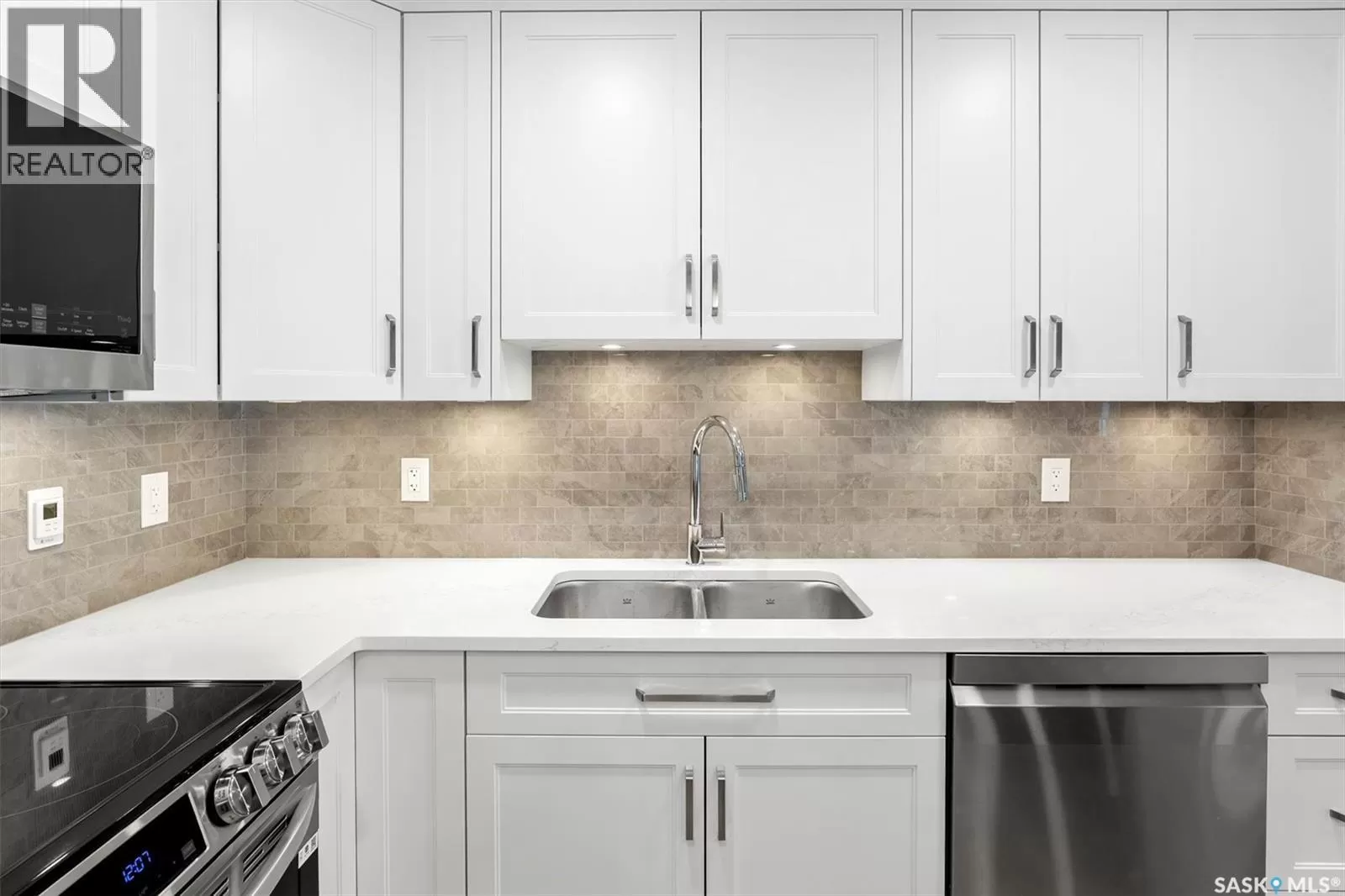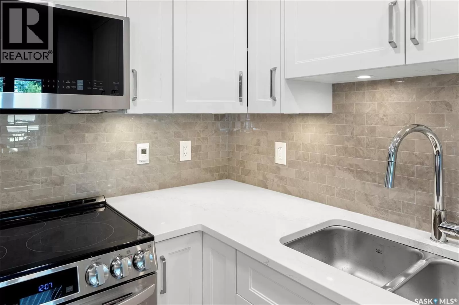 Welcome to #102 - 318 108th Street in Sutherland! This main floor, corner unit has two large bedrooms, the master having it's own 2pc bathroom and walk-in closet! The kitchen has tons of drawers with full extension pull outs. You'll see gorgeous quartz countertops with tiled backsplash and undercabinet lighting. The stainless steel appliance package has been upgraded to include: convection oven, waterline to the fridge with ice maker in freezer, quiet dishwasher with 3rd rack and 1 hr wash. As you enter this beautiful condo, you'll see travertine tile in the foyer and into the laundry room with washer and dryer included. This same tile has been used in both bathrooms for a continuity. Hickory hardwood has been laid throughout the remainder of the condo and, honestly, it's gorgeous! Wand controlled shades have been added for privacy and a triple pane garden door insert with integrated blinds has been ordered for the patio door. This newly built condo is located within 20 mins walking distance to the U of S Campus and future SaskPolytech Campus and, with a bus stop across the street, it's a 5 minute bus ride to Place Riel. Please note: there may be a few touchup taking place but everything will be complete prior to possession date! This entire complex suffered a total loss fire in May of 2022 and has now been rebuilt and is ready for occupancy! The original date of construction is 1997 and only the foundation remains from that date - Everything else is new! Call today to view this outstanding home! (id:27476)