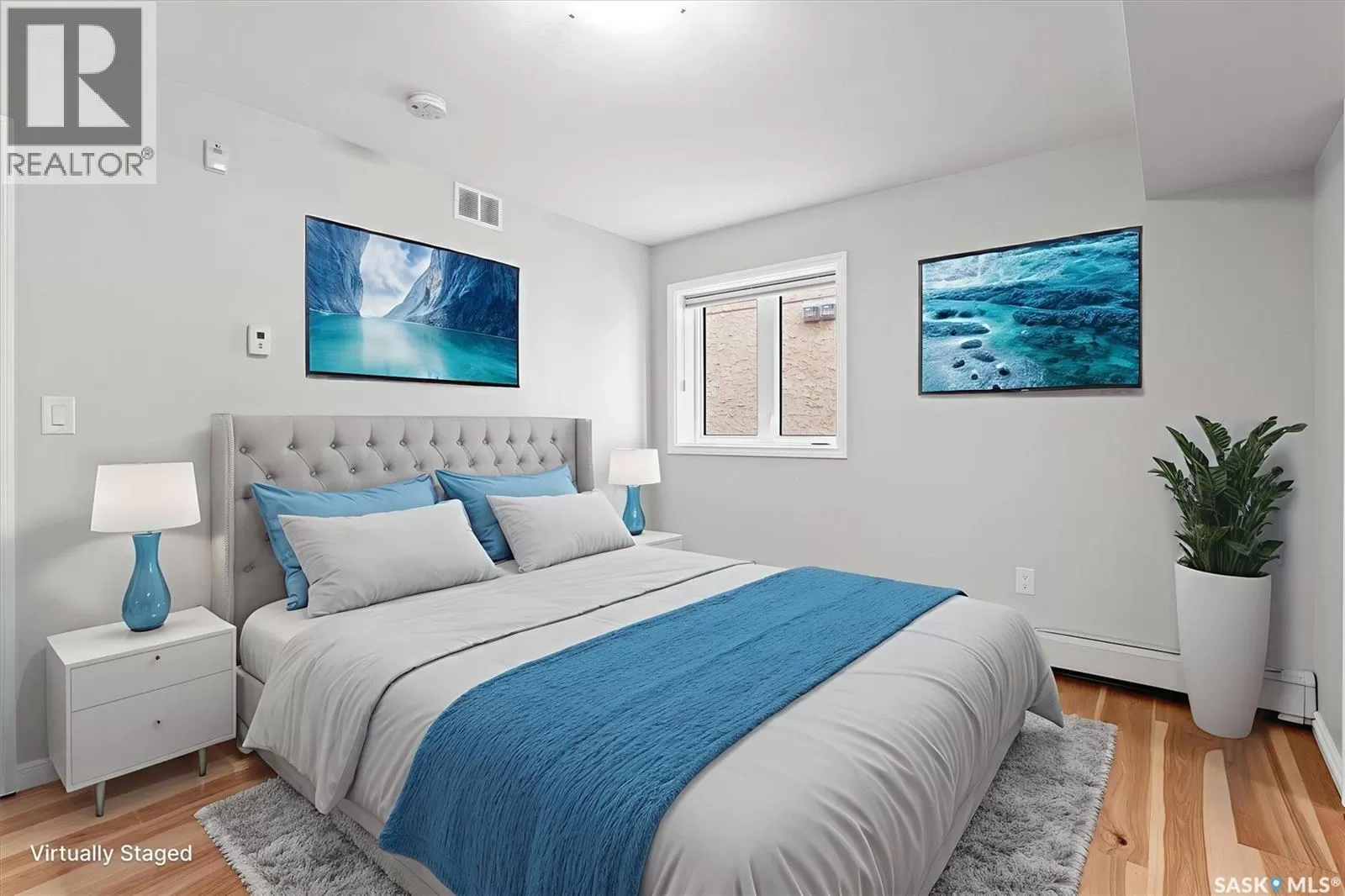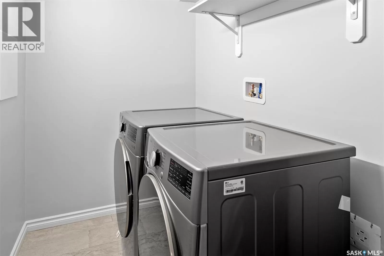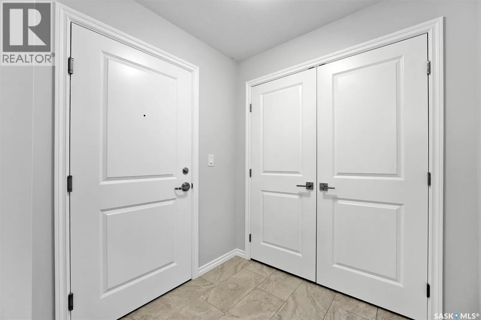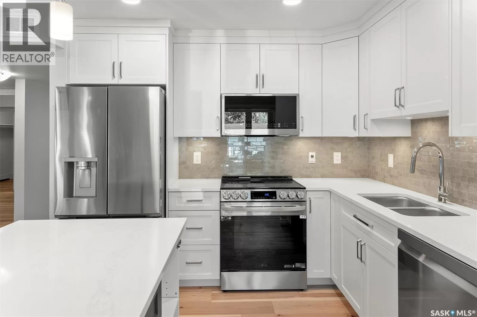 Welcome to #102 - 318 108th Street in Sutherland! This main floor, corner unit has two large bedrooms, the master having it's own 2pc bathroom and walk-in closet! The kitchen has tons of drawers with full extension pull outs. You'll see gorgeous quartz countertops with tiled backsplash and undercabinet lighting. The stainless steel appliance package has been upgraded to include: convection oven, waterline to the fridge with ice maker in freezer, quiet dishwasher with 3rd rack and 1 hr wash. As you enter this beautiful condo, you'll see travertine tile in the foyer and into the laundry room with washer and dryer included. This same tile has been used in both bathrooms for a continuity. Hickory hardwood has been laid throughout the remainder of the condo and, honestly, it's gorgeous! Wand controlled shades have been added for privacy and a triple pane garden door insert with integrated blinds has been ordered for the patio door. This newly built condo is located within 20 mins walking distance to the U of S Campus and future SaskPolytech Campus and, with a bus stop across the street, it's a 5 minute bus ride to Place Riel. Please note: there may be a few touchup taking place but everything will be complete prior to possession date! This entire complex suffered a total loss fire in May of 2022 and has now been rebuilt and is ready for occupancy! The original date of construction is 1997 and only the foundation remains from that date - Everything else is new! Call today to view this outstanding home! (id:27476)