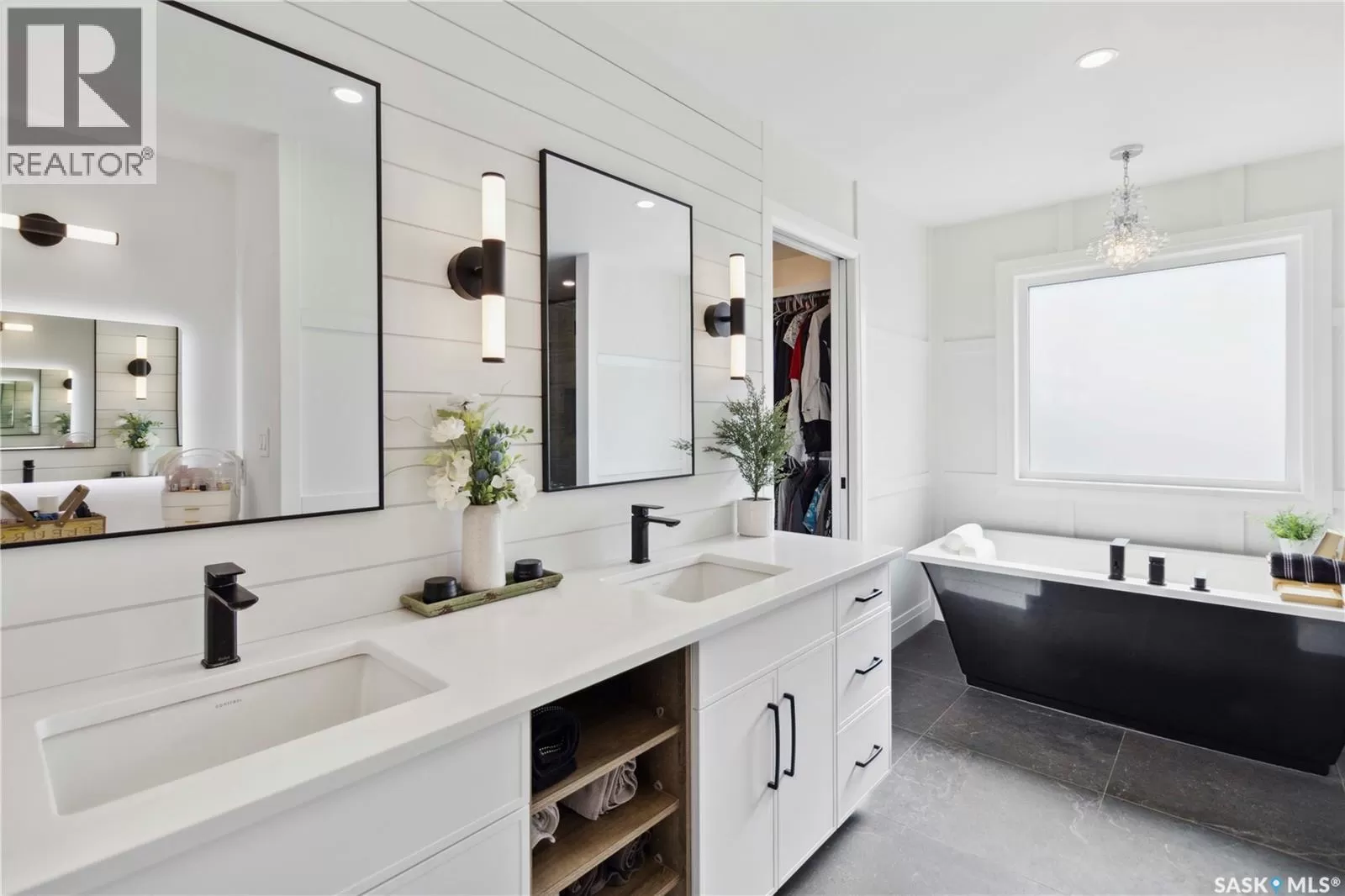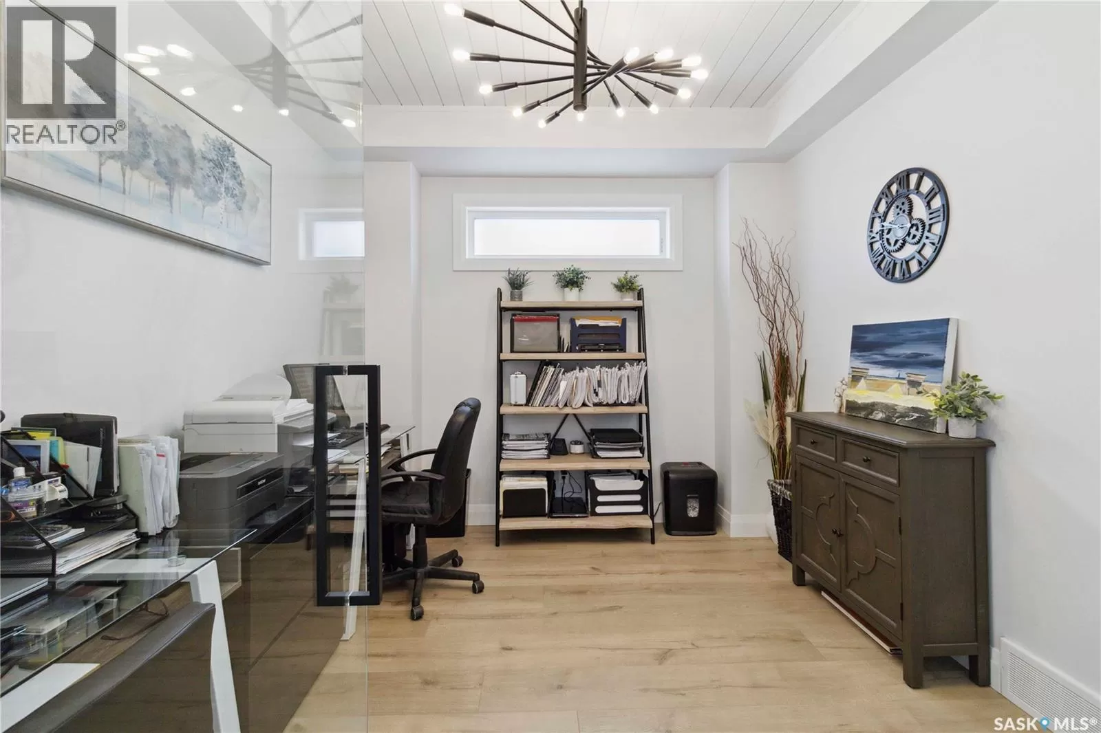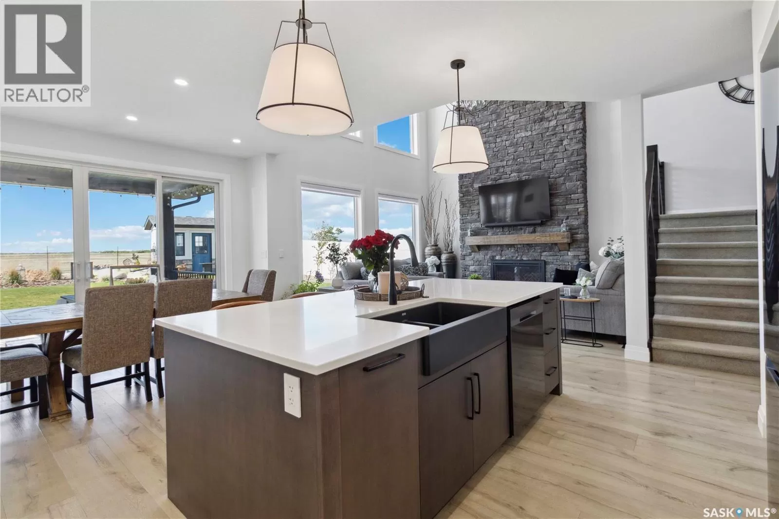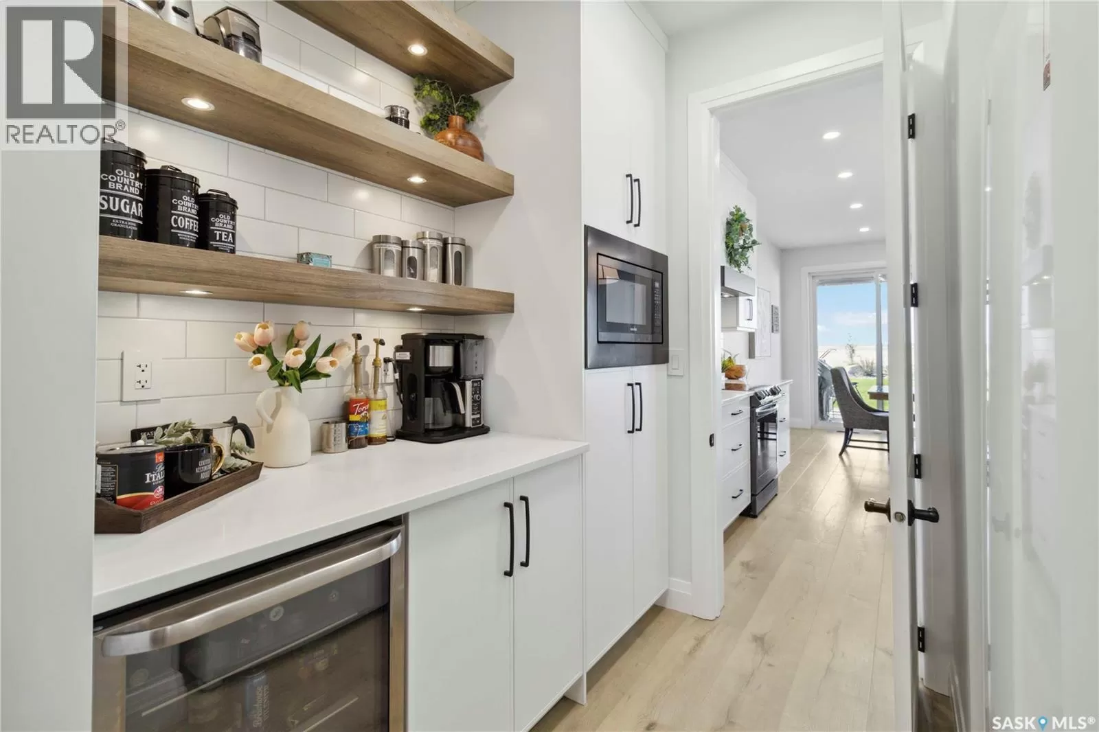 Welcome to this stunning, meticulously designed home in one of Saskatoon's most sought-after neighbourhoods. From the moment you step inside, youâre greeted by soaring ceilings, abundant natural light, and a beautifully open-concept main floor thatâs perfect for both everyday living and entertaining. The spacious kitchen is a chefâs dream, featuring sleek quartz countertops, black stainless steel appliances, a separate walk-in pantry, and a convenient bar fridge for added functionality. The adjacent living room is a showstopper, centered around a gas fireplace with a dramatic floor-to-ceiling feature wall, creating a cozy yet sophisticated ambiance. A dedicated main floor office provides the perfect space for working from home. The fully developed basement extends your living space with a family room, wet bar, additional bedroom, and full bathroomâideal for guests or entertaining. Situated on a huge, fully landscaped lot, this home offers privacy and tranquility with no neighbours behind. A garden shed adds extra outdoor storage, and the yard is perfect for enjoying Saskatoon's beautiful seasons. This home truly has it allâstyle, space, and a prime location. (id:27476)