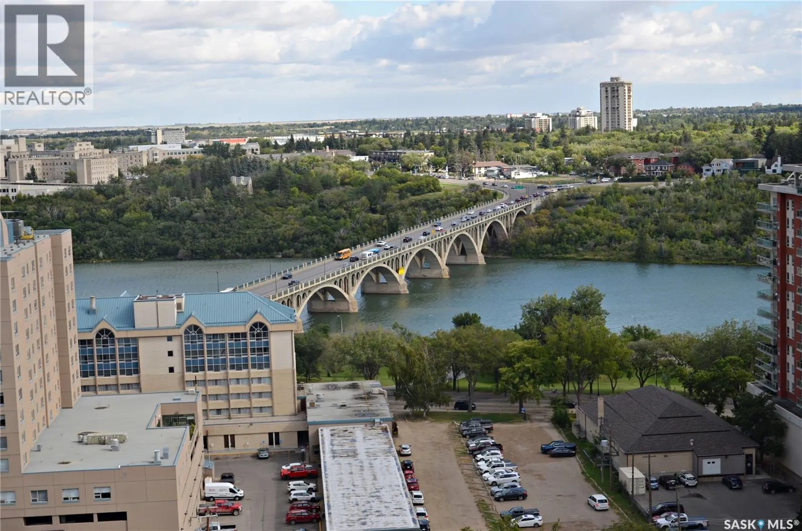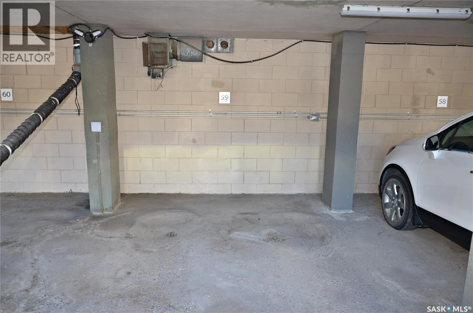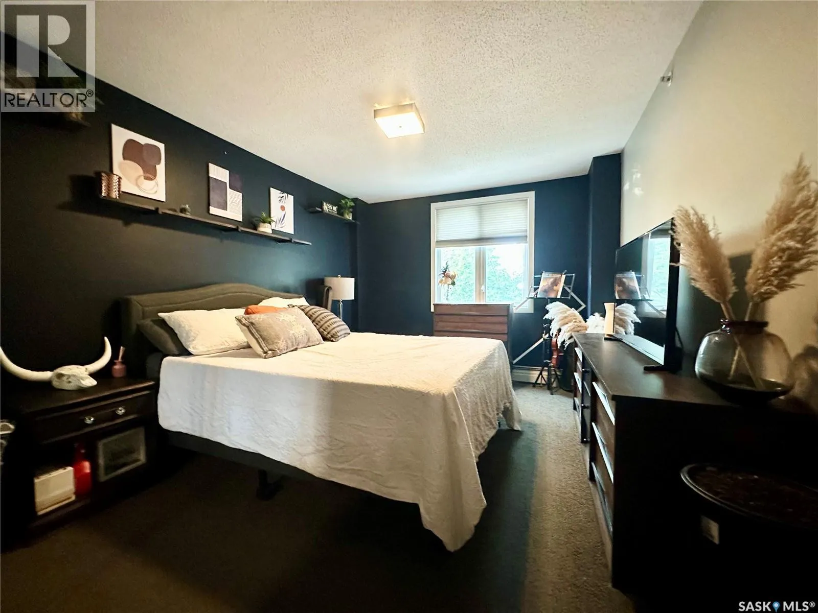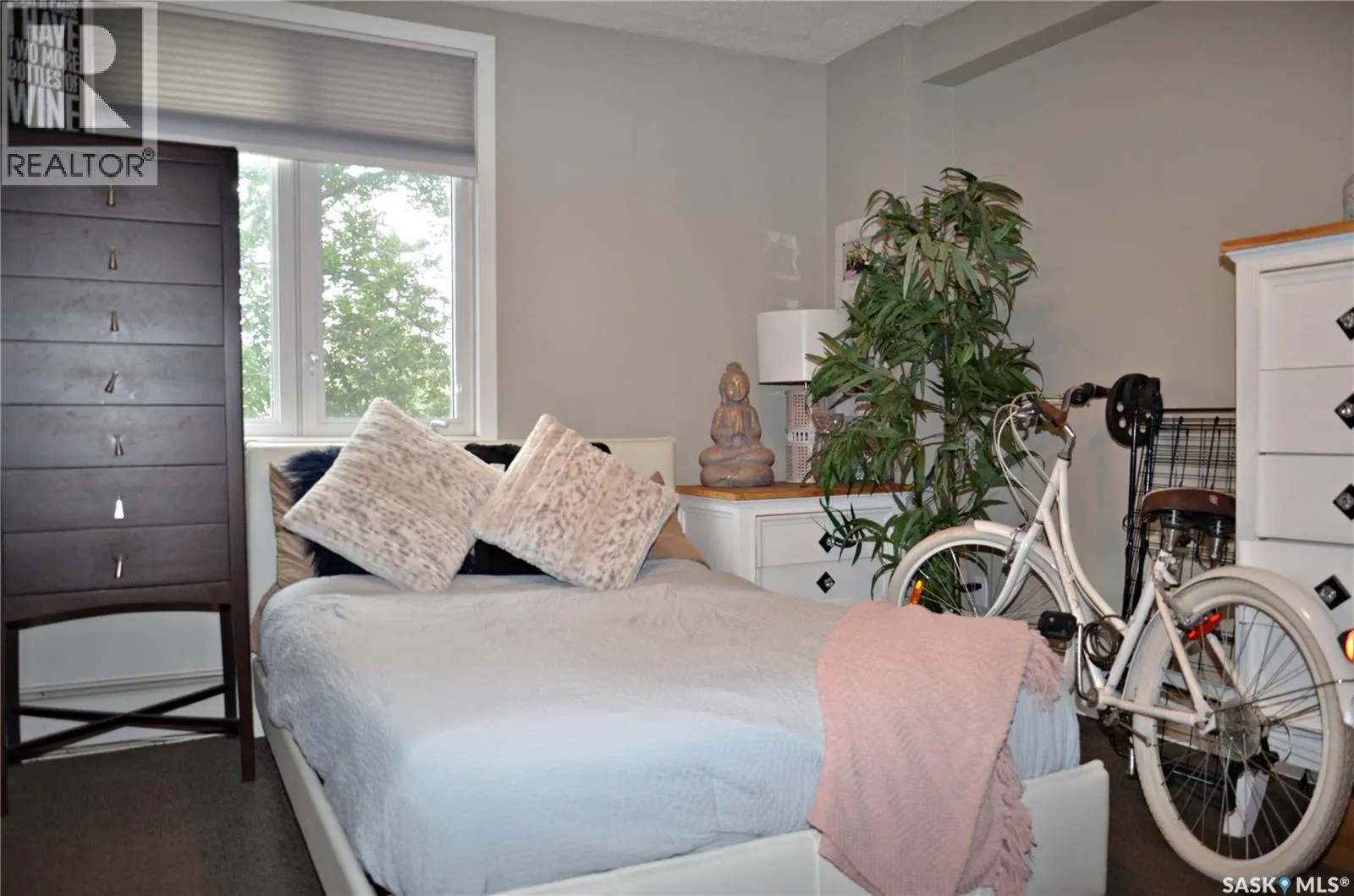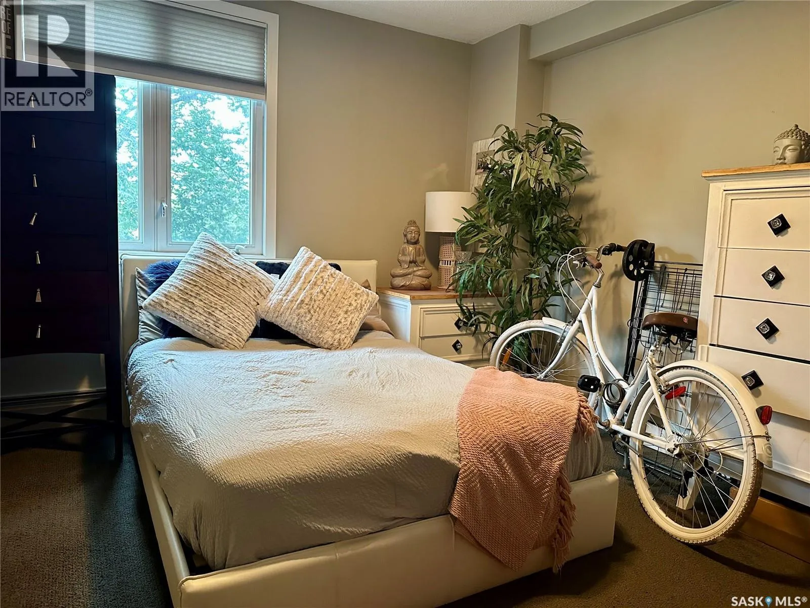 Welcome to The View on Fifth, where urban living meets comfort and convenience in this beautifully maintained 965 sq. ft. apartment-style condo located in the heart of downtown Saskatoon. This spacious unit features two large bedrooms, one full bathroom with a big soaker tub, an open living area, and a west-facing balcony perfect for enjoying sunsets. This unit comes with a prime covered parking stall which is only steps away from the building entrance. The home is move-in ready with no work needed and includes hookups for in-suite laundry, while free shared laundry is also available on every floor. Building amenities include two stunning rooftop patios with breathtaking views, a fully equipped gym, and a nice amenities room for gatherings which includes a pool table. Condo fees include heat, water, and power, offering excellent value. With its prime location just steps from the river, walking trails, transit, shops, restaurants, and entertainment, this is an ideal choice for first-time buyers, downsizers, or investors seeking a low-maintenance home in a vibrant downtown setting. (id:27476)