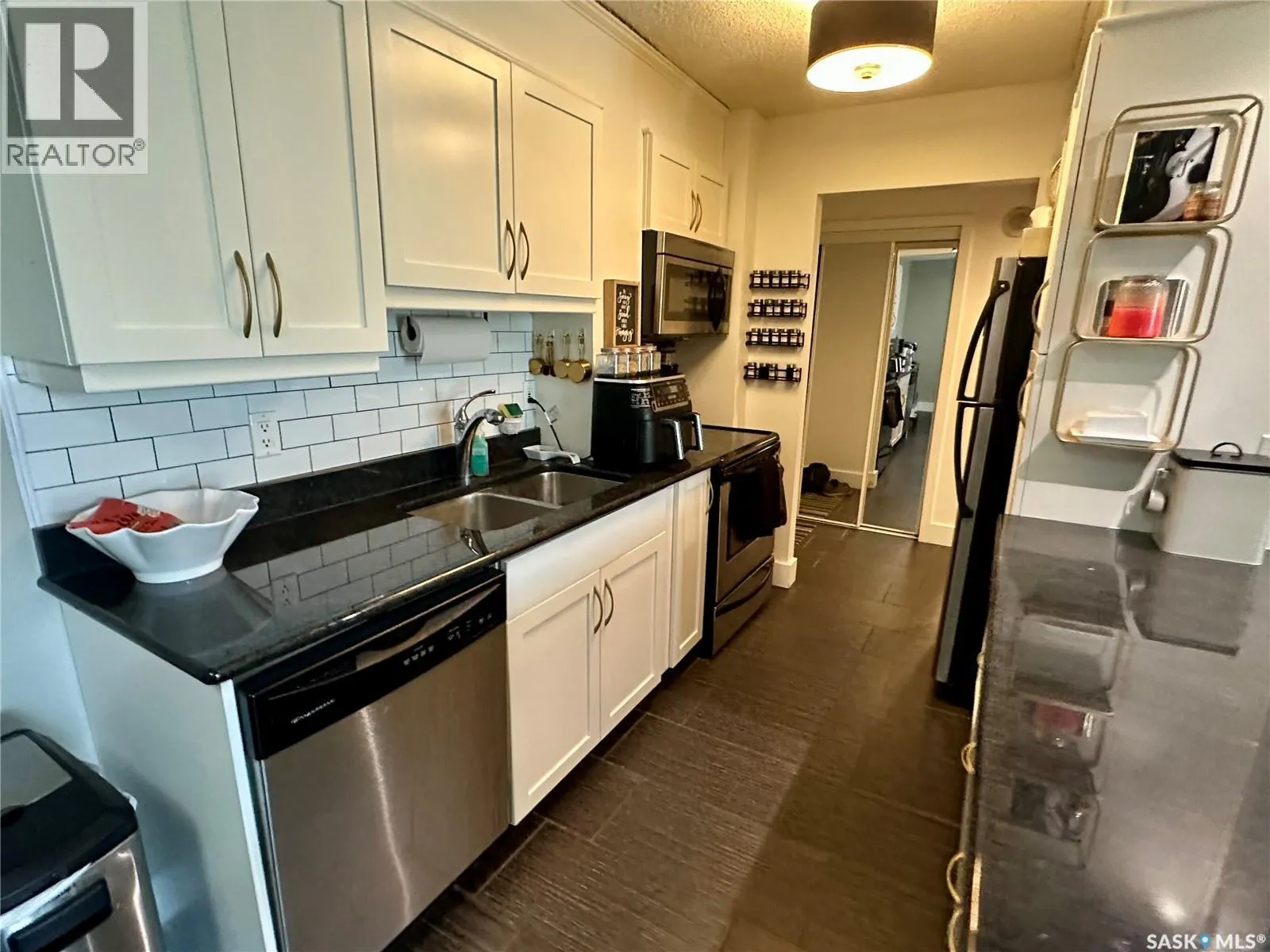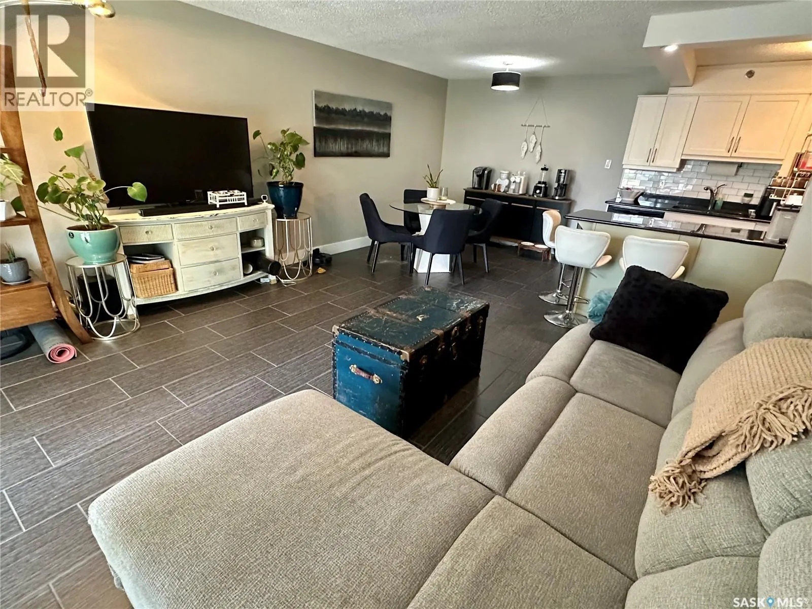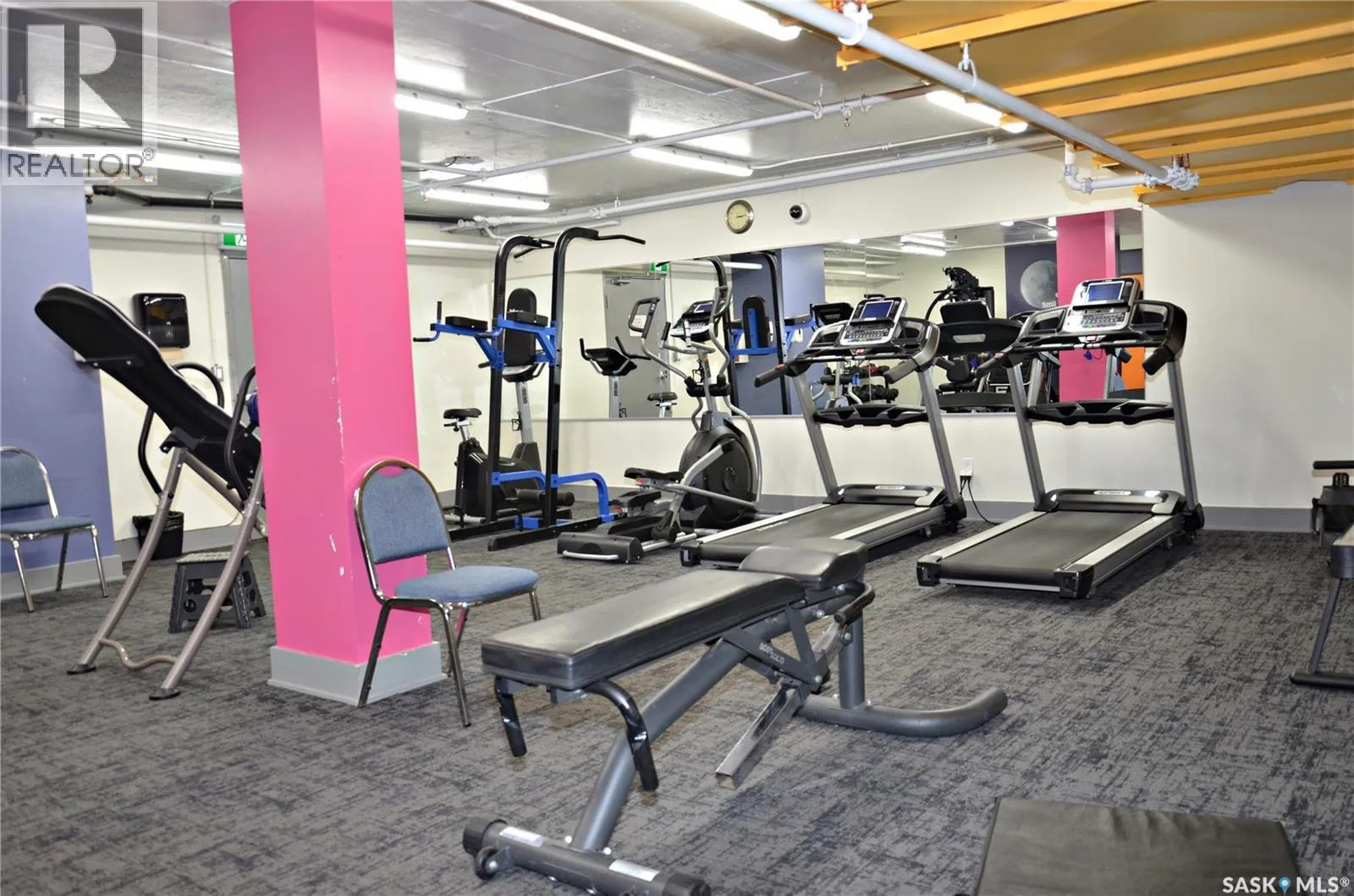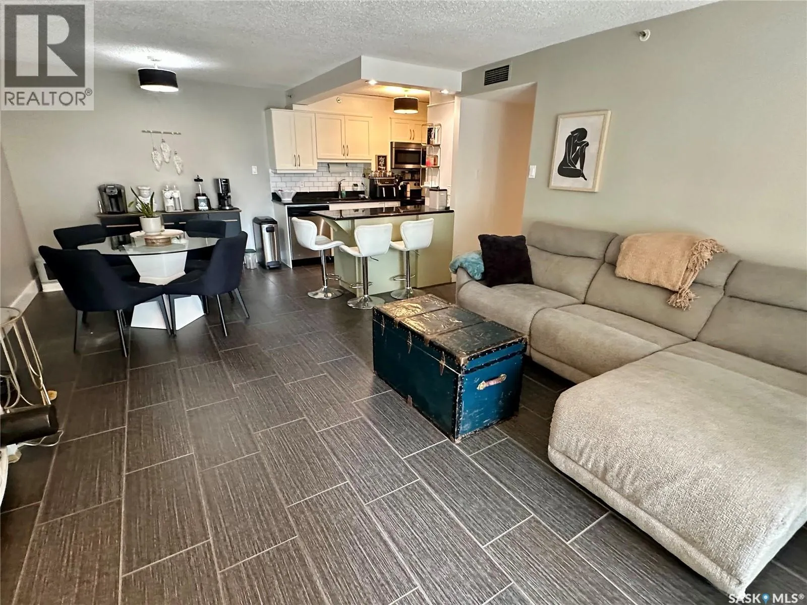 Welcome to The View on Fifth, where urban living meets comfort and convenience in this beautifully maintained 965 sq. ft. apartment-style condo located in the heart of downtown Saskatoon. This spacious unit features two large bedrooms, one full bathroom with a big soaker tub, an open living area, and a west-facing balcony perfect for enjoying sunsets. This unit comes with a prime covered parking stall which is only steps away from the building entrance. The home is move-in ready with no work needed and includes hookups for in-suite laundry, while free shared laundry is also available on every floor. Building amenities include two stunning rooftop patios with breathtaking views, a fully equipped gym, and a nice amenities room for gatherings which includes a pool table. Condo fees include heat, water, and power, offering excellent value. With its prime location just steps from the river, walking trails, transit, shops, restaurants, and entertainment, this is an ideal choice for first-time buyers, downsizers, or investors seeking a low-maintenance home in a vibrant downtown setting. (id:27476)