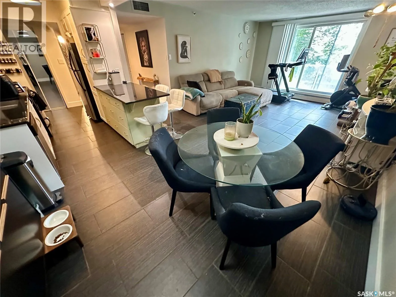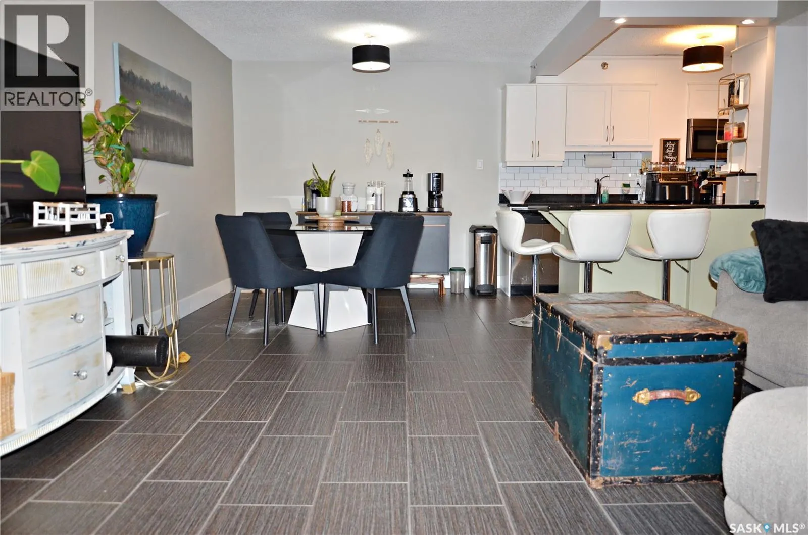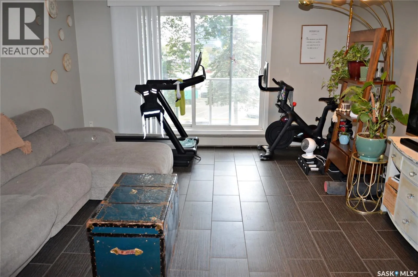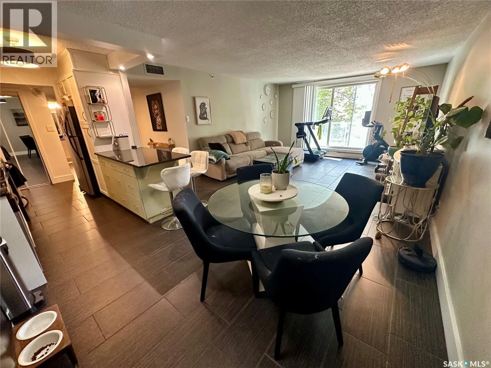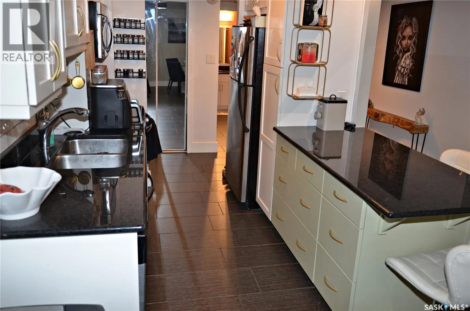 Welcome to The View on Fifth, where urban living meets comfort and convenience in this beautifully maintained 965 sq. ft. apartment-style condo located in the heart of downtown Saskatoon. This spacious unit features two large bedrooms, one full bathroom with a big soaker tub, an open living area, and a west-facing balcony perfect for enjoying sunsets. This unit comes with a prime covered parking stall which is only steps away from the building entrance. The home is move-in ready with no work needed and includes hookups for in-suite laundry, while free shared laundry is also available on every floor. Building amenities include two stunning rooftop patios with breathtaking views, a fully equipped gym, and a nice amenities room for gatherings which includes a pool table. Condo fees include heat, water, and power, offering excellent value. With its prime location just steps from the river, walking trails, transit, shops, restaurants, and entertainment, this is an ideal choice for first-time buyers, downsizers, or investors seeking a low-maintenance home in a vibrant downtown setting. (id:27476)