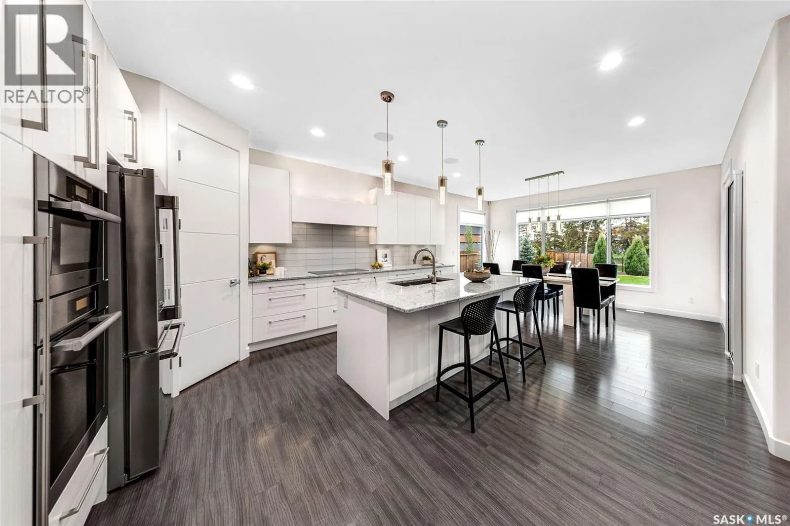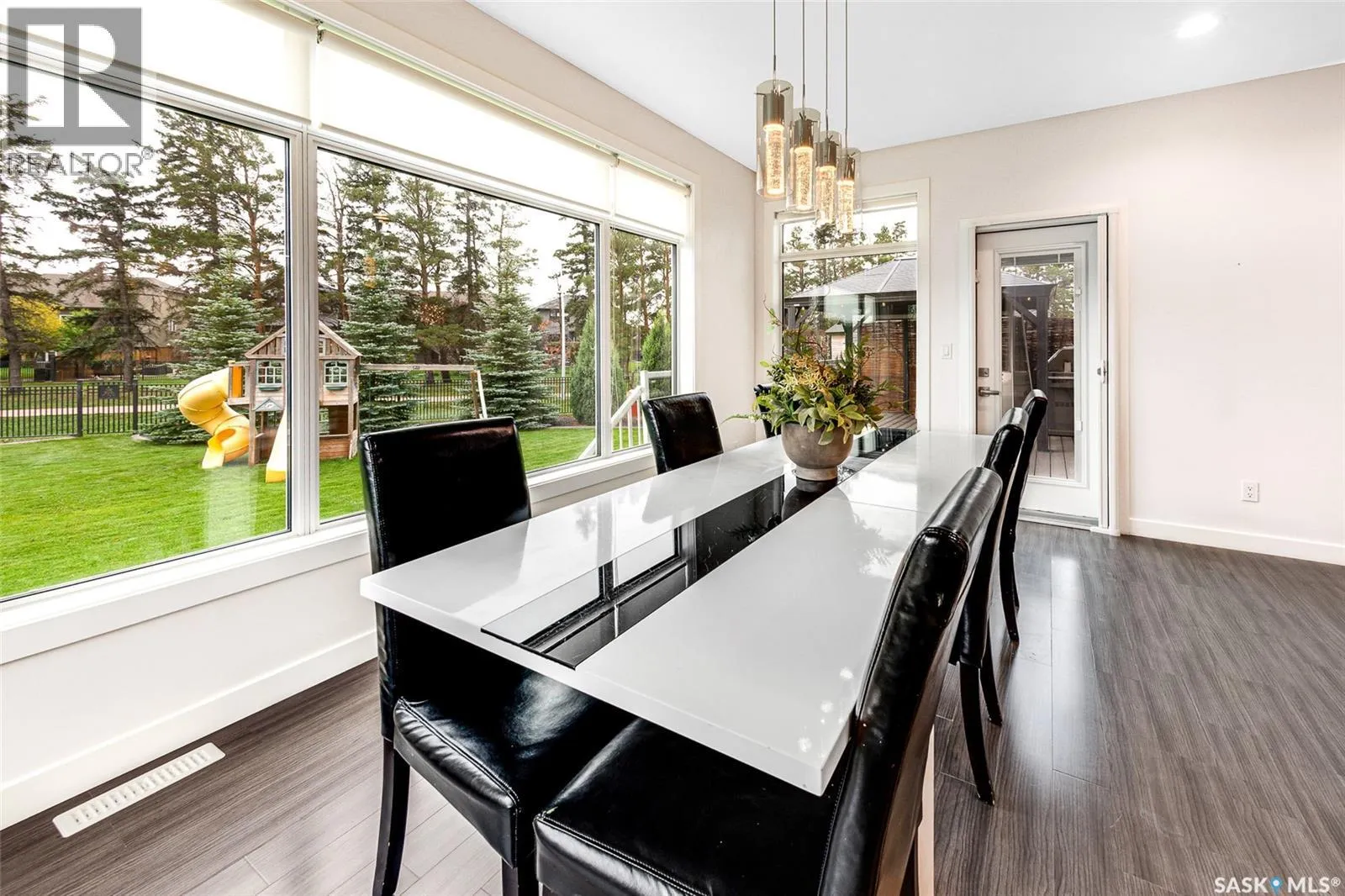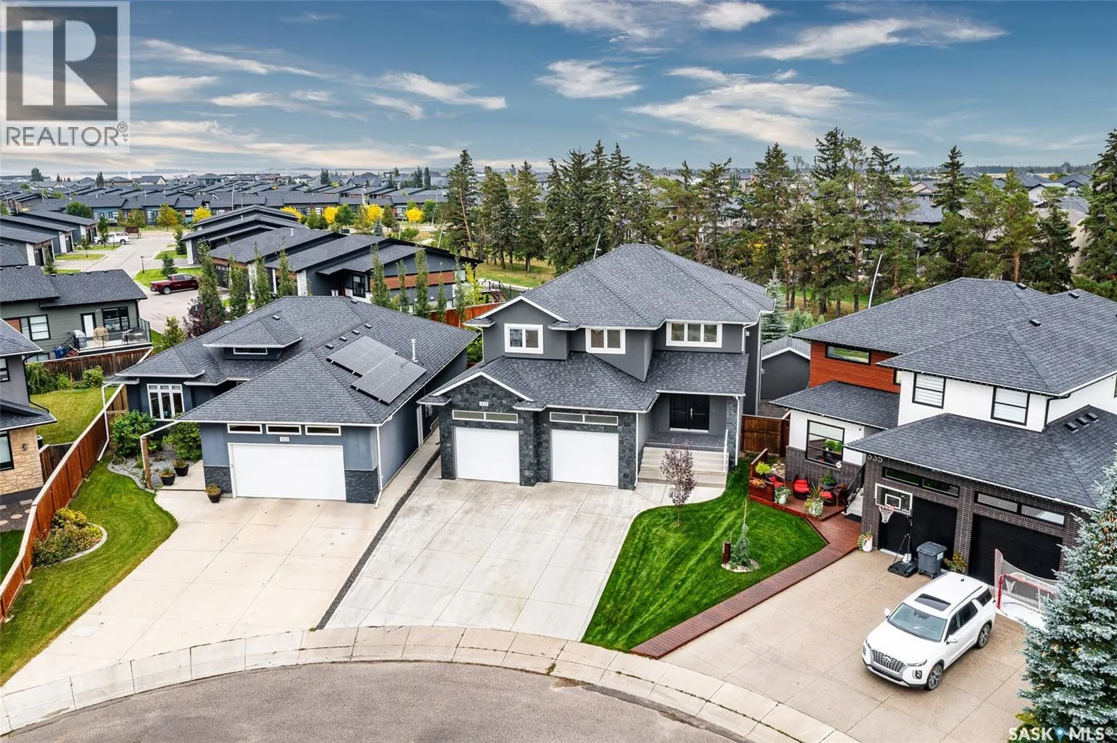 Tucked away on one of Evergreenâs most desirable crescents, this exceptional two-storey home blends luxury, function, and timeless elegance on a massive pie-shaped lot backing the walking trails lined with mature Scots pine trees. From the striking curb appeal to the timeless finishes and extensive list of custom upgrades, every detail has been thoughtfully designed. Inside, a grand foyer leads into a living room with soaring ceilings and expansive windows that fill the space with natural light. At the heart of the home, the gourmet kitchen showcases Redl custom cabinetry, built-in Miele dual ovens with induction cooktop, quartz countertops, tile backsplash, and a large island with additional seating, seamlessly connected to the dining area overlooking the private backyard. The main floor also offers a dedicated office, a 2-piece bath, and a mudroom with direct access to the oversized heated staggered bay garage ( 28â x 22â/26â) with 220v plug and hot/cold water taps. Upstairs, four spacious bedrooms await, including a luxurious primary suite with a custom walk-in closet and a spa-inspired ensuite featuring a jetted tub and steam showerâthe perfect retreat after a long day. A full bathroom and convenient second-floor laundry complete this level. The fully developed basement adds versatility with a large family room and games area, a fifth bedroom, 4-piece bath, storage, mechanical room, and a future wet bar nook. Notable extras include central AC, HRV, HEPA air filter, âhide-a-hoseâ central vac, Control4 audio with built-in speakers throughout, and more. Outside, the expansive backyard offers endless potential for entertaining, a future pool, or simply enjoying the serenity of your private outdoor escape. Ideally situated near the Forestry Farm and zoo, an array of amenities, school bus pick up, elementary and high schools, this rare property offers the perfect balance of comfort and lifestyle in one of Saskatoonâs most coveted neighbourhoods. (id:27476)