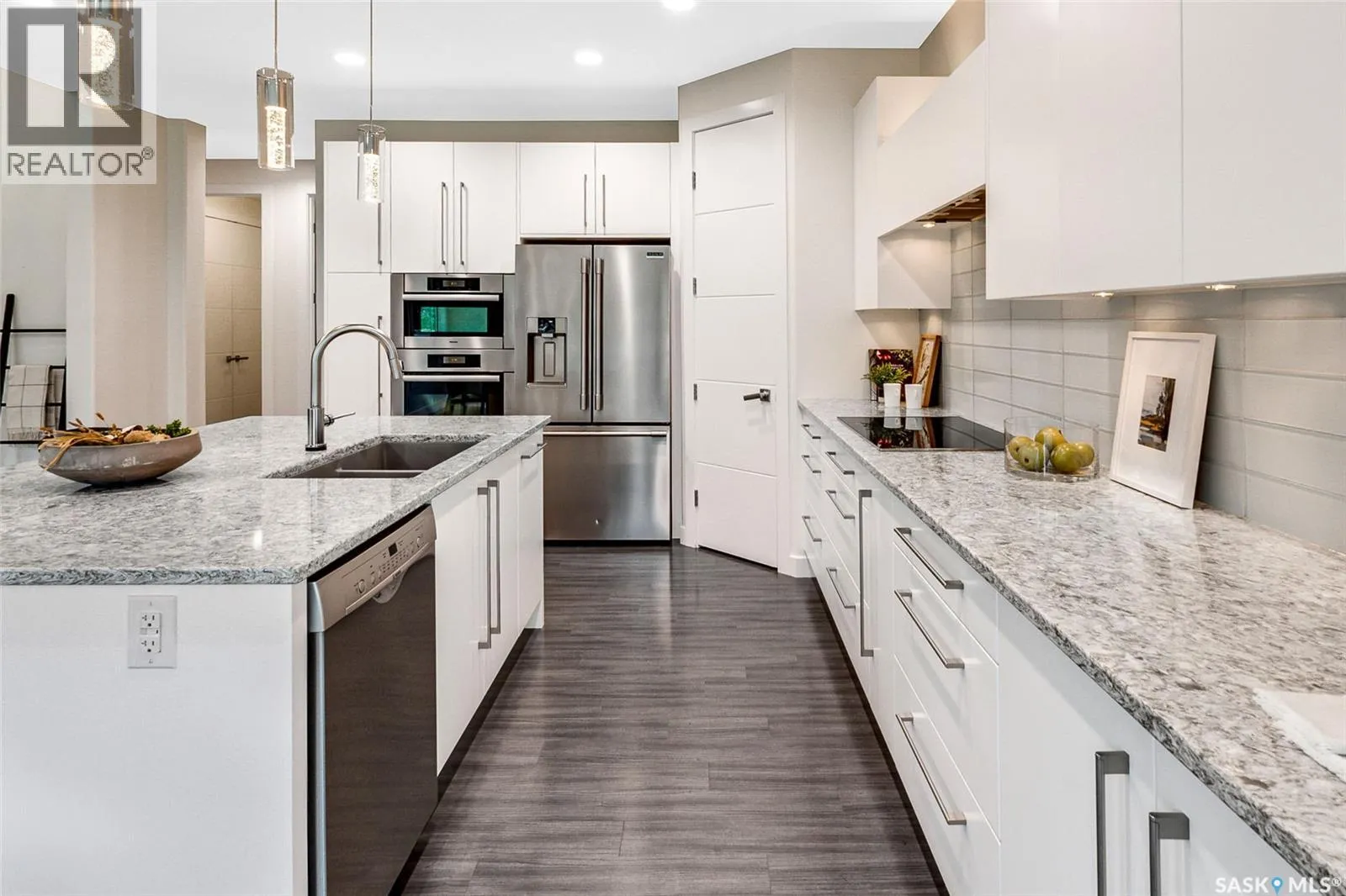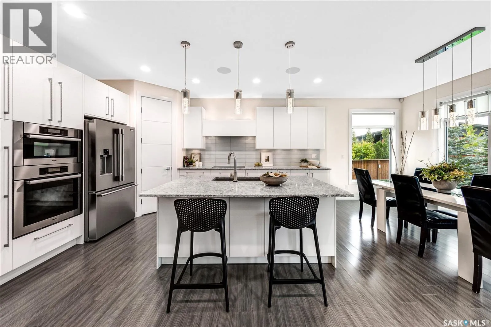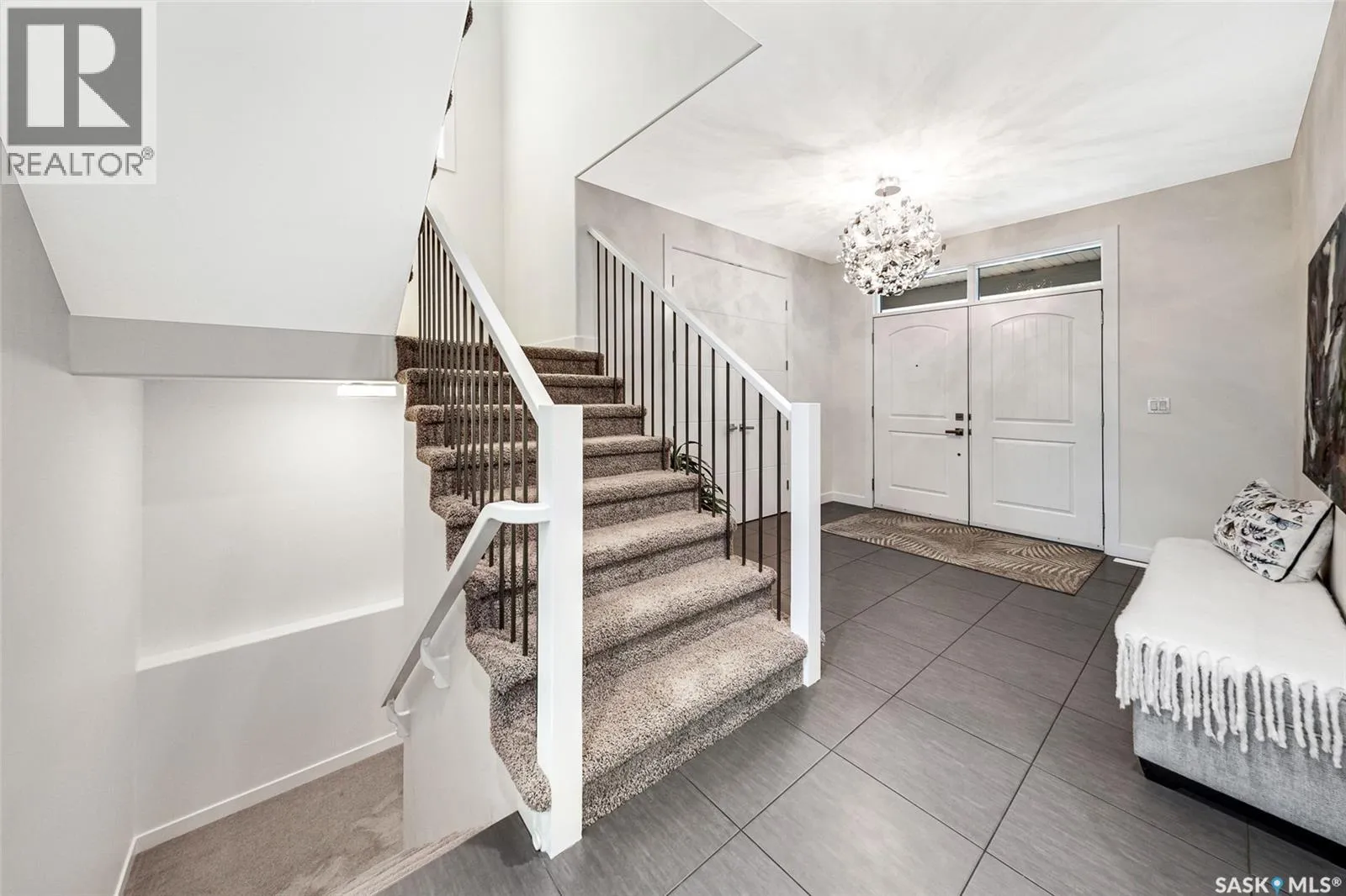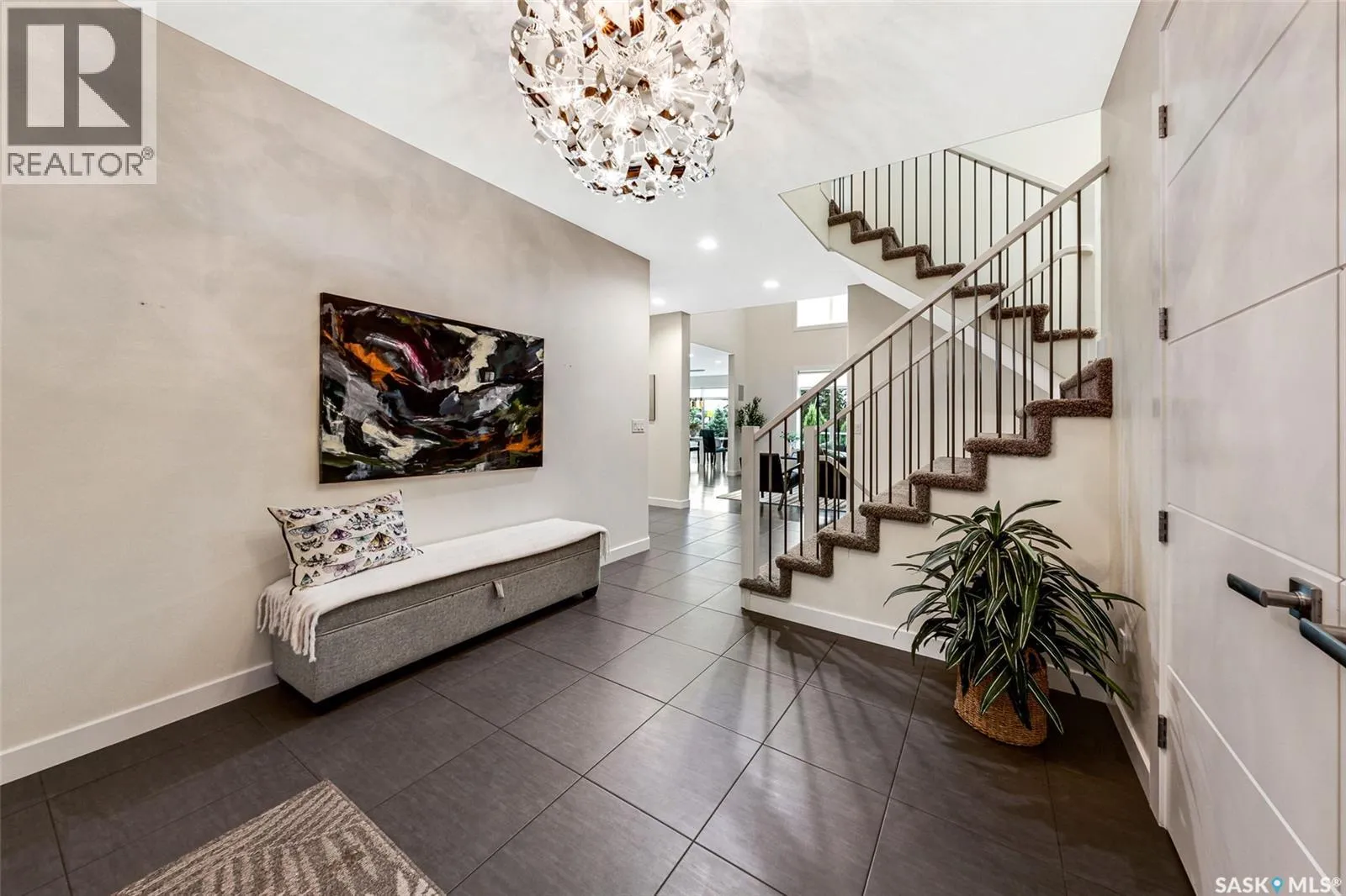 Tucked away on one of Evergreenâs most desirable crescents, this exceptional two-storey home blends luxury, function, and timeless elegance on a massive pie-shaped lot backing the walking trails lined with mature Scots pine trees. From the striking curb appeal to the timeless finishes and extensive list of custom upgrades, every detail has been thoughtfully designed. Inside, a grand foyer leads into a living room with soaring ceilings and expansive windows that fill the space with natural light. At the heart of the home, the gourmet kitchen showcases Redl custom cabinetry, built-in Miele dual ovens with induction cooktop, quartz countertops, tile backsplash, and a large island with additional seating, seamlessly connected to the dining area overlooking the private backyard. The main floor also offers a dedicated office, a 2-piece bath, and a mudroom with direct access to the oversized heated staggered bay garage ( 28â x 22â/26â) with 220v plug and hot/cold water taps. Upstairs, four spacious bedrooms await, including a luxurious primary suite with a custom walk-in closet and a spa-inspired ensuite featuring a jetted tub and steam showerâthe perfect retreat after a long day. A full bathroom and convenient second-floor laundry complete this level. The fully developed basement adds versatility with a large family room and games area, a fifth bedroom, 4-piece bath, storage, mechanical room, and a future wet bar nook. Notable extras include central AC, HRV, HEPA air filter, âhide-a-hoseâ central vac, Control4 audio with built-in speakers throughout, and more. Outside, the expansive backyard offers endless potential for entertaining, a future pool, or simply enjoying the serenity of your private outdoor escape. Ideally situated near the Forestry Farm and zoo, an array of amenities, school bus pick up, elementary and high schools, this rare property offers the perfect balance of comfort and lifestyle in one of Saskatoonâs most coveted neighbourhoods. (id:27476)