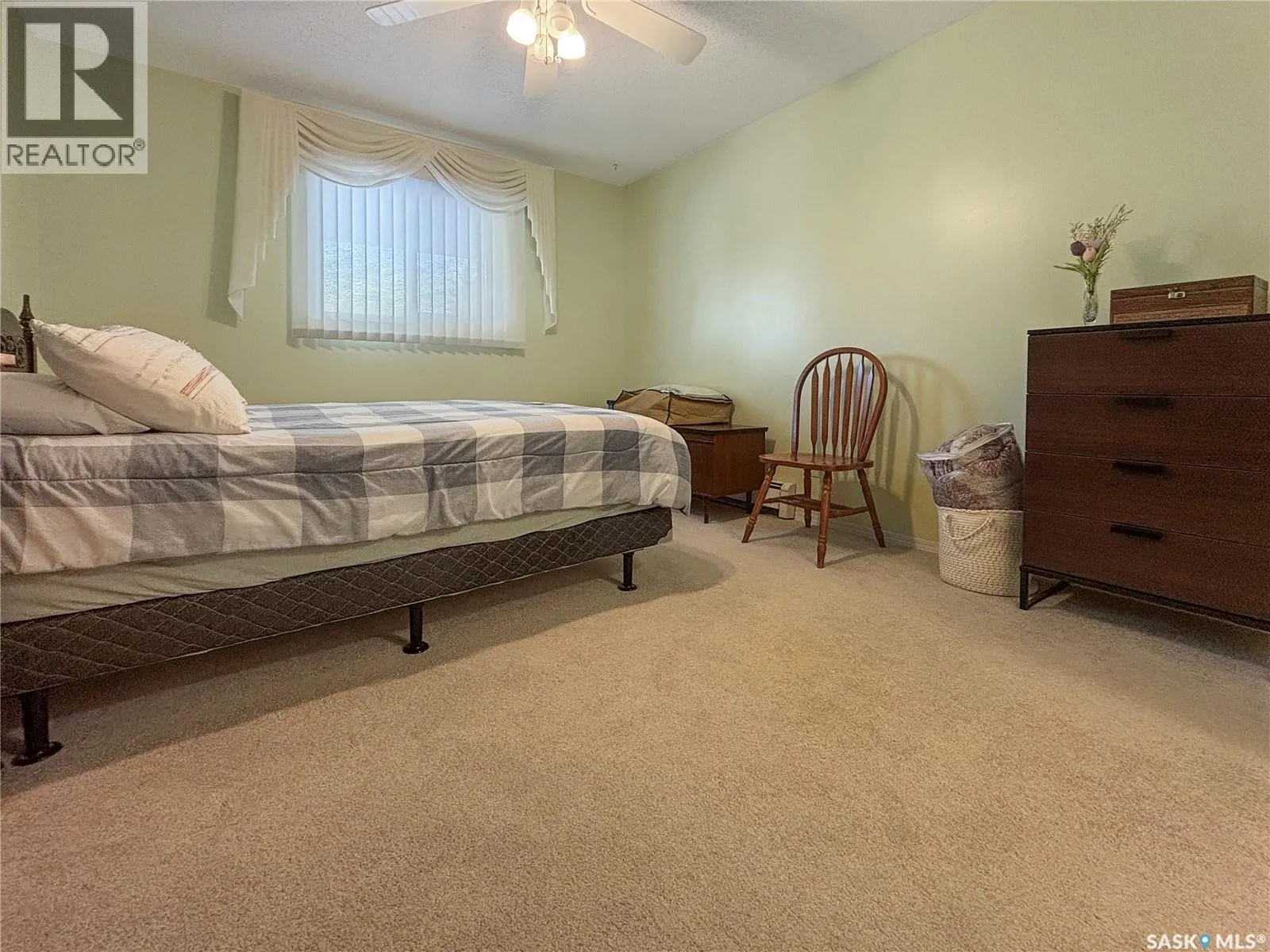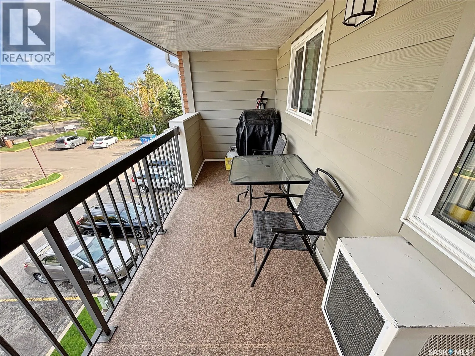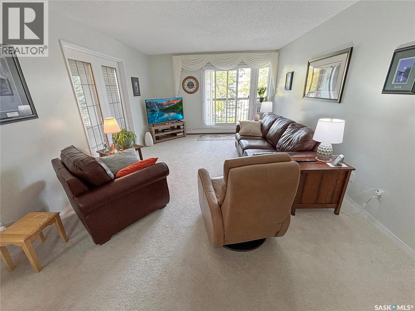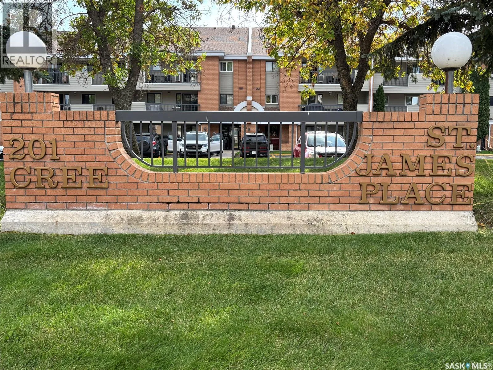 Immaculate top floor, 2 bed, 2 bath condo at St James Place on Cree Crescent in Lawson Heights. This bright unit features many upgrades such as windows and window coverings, newer carpet in the living room and primary bedroom, a newer washing machine, updated kitchen cupboards and backsplash, and newer linoleum in bathroom and laundry room. Very open design with bedrooms and bathrooms on either side of the living room. The 2nd bedroom has glass doors to the living room for potential as a den. Storage on the balcony. 2 year old wall air conditioner. Full bath off the primary bedroom with walk-through closets. One electrified parking stall. The building has a new elevator. No pets. End of October/early November possession date. (id:27476)