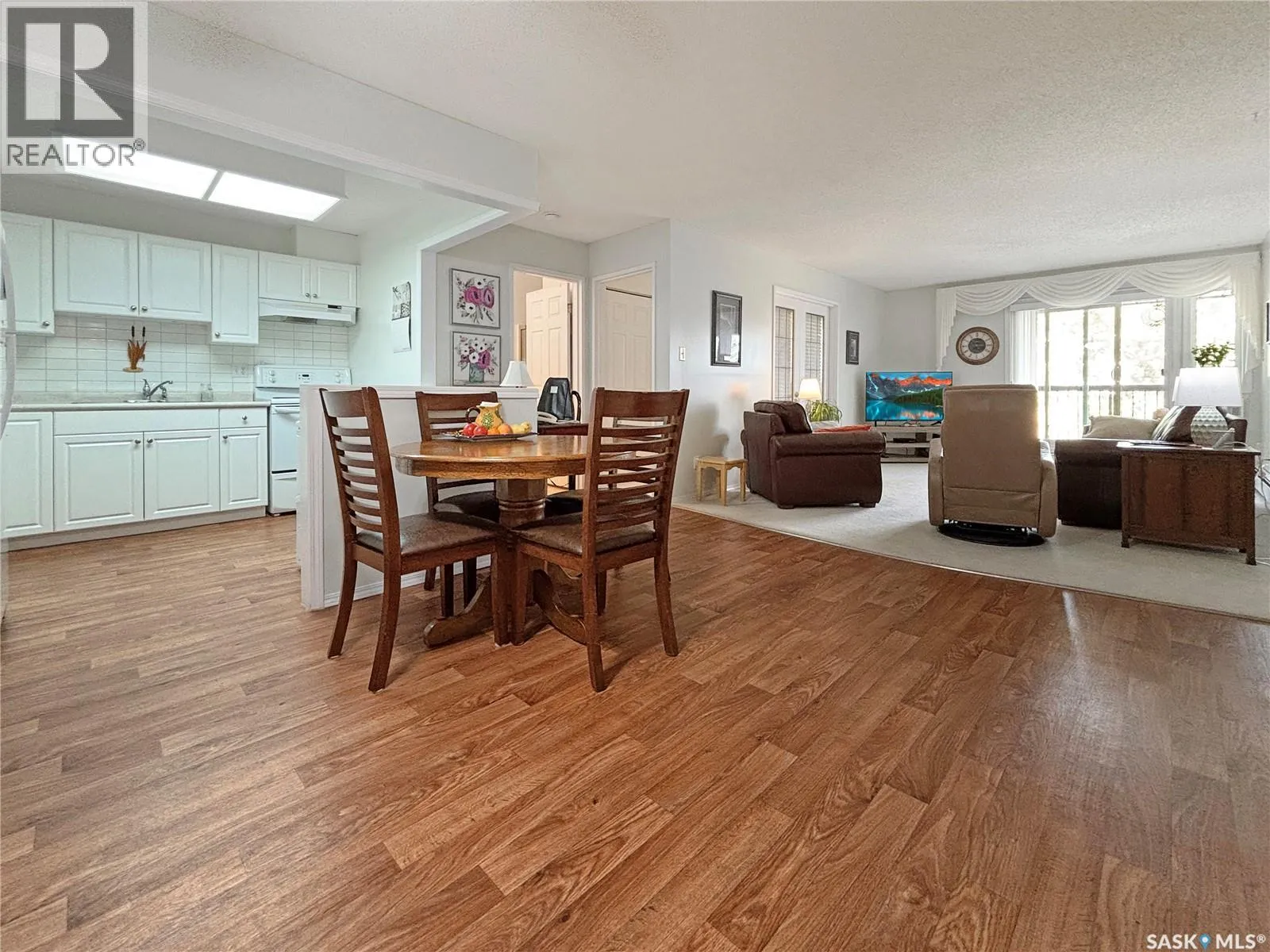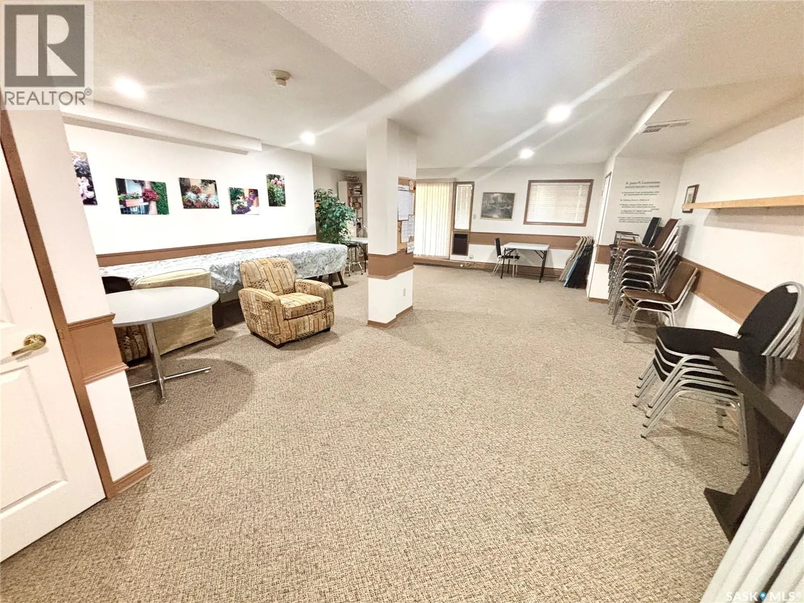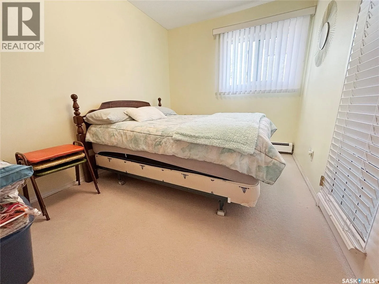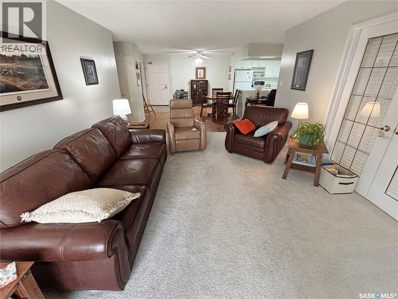 Immaculate top floor, 2 bed, 2 bath condo at St James Place on Cree Crescent in Lawson Heights. This bright unit features many upgrades such as windows and window coverings, newer carpet in the living room and primary bedroom, a newer washing machine, updated kitchen cupboards and backsplash, and newer linoleum in bathroom and laundry room. Very open design with bedrooms and bathrooms on either side of the living room. The 2nd bedroom has glass doors to the living room for potential as a den. Storage on the balcony. 2 year old wall air conditioner. Full bath off the primary bedroom with walk-through closets. One electrified parking stall. The building has a new elevator. No pets. End of October/early November possession date. (id:27476)