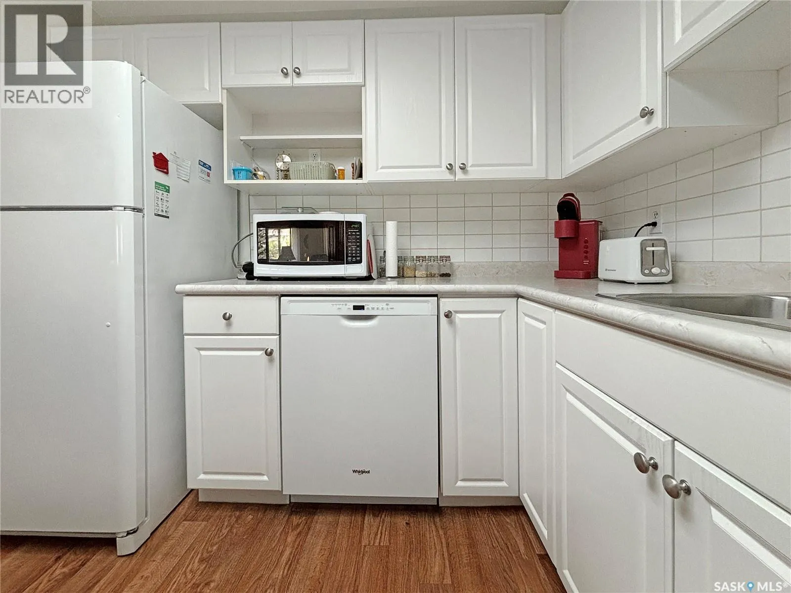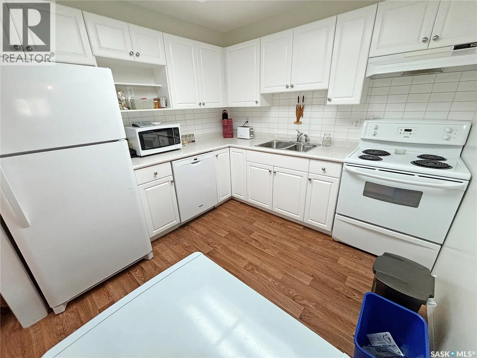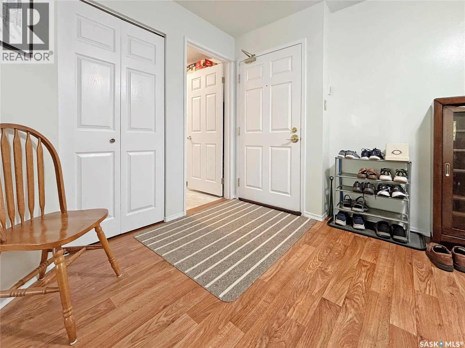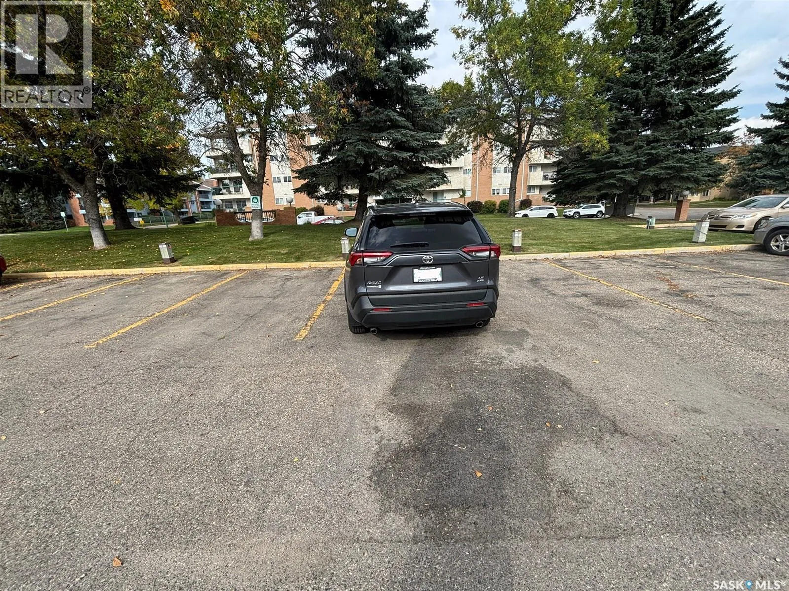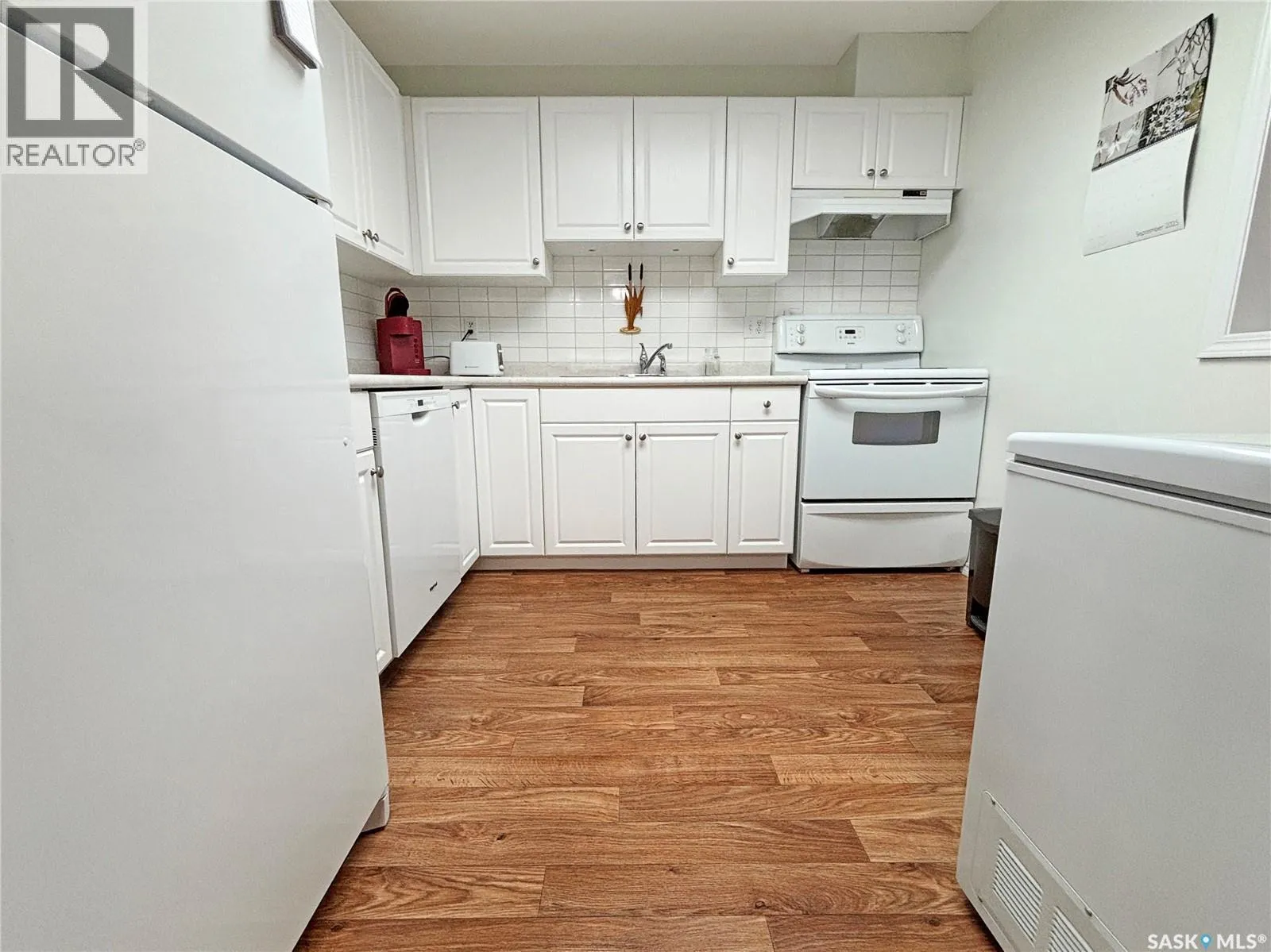 Immaculate top floor, 2 bed, 2 bath condo at St James Place on Cree Crescent in Lawson Heights. This bright unit features many upgrades such as windows and window coverings, newer carpet in the living room and primary bedroom, a newer washing machine, updated kitchen cupboards and backsplash, and newer linoleum in bathroom and laundry room. Very open design with bedrooms and bathrooms on either side of the living room. The 2nd bedroom has glass doors to the living room for potential as a den. Storage on the balcony. 2 year old wall air conditioner. Full bath off the primary bedroom with walk-through closets. One electrified parking stall. The building has a new elevator. No pets. End of October/early November possession date. (id:27476)