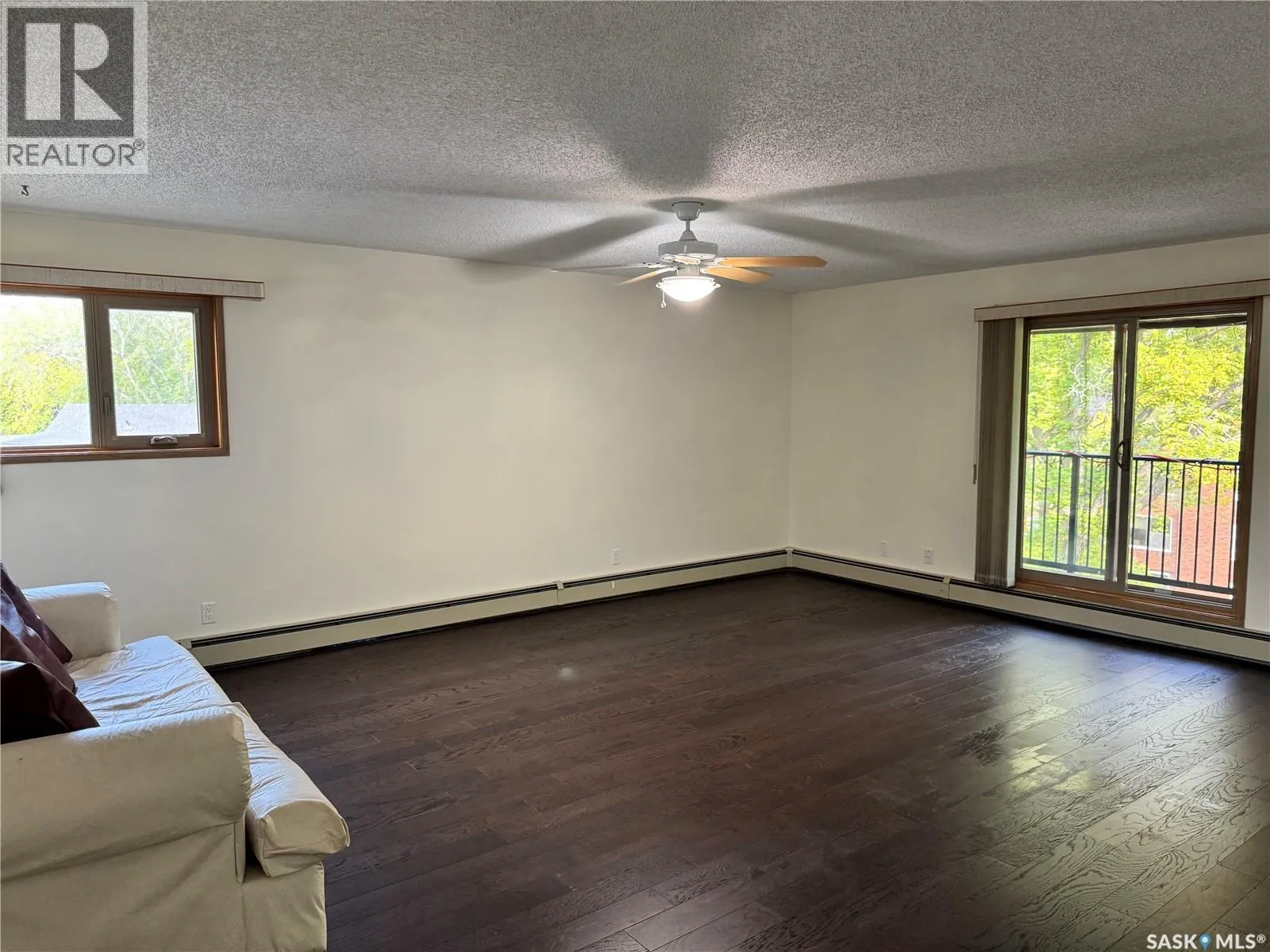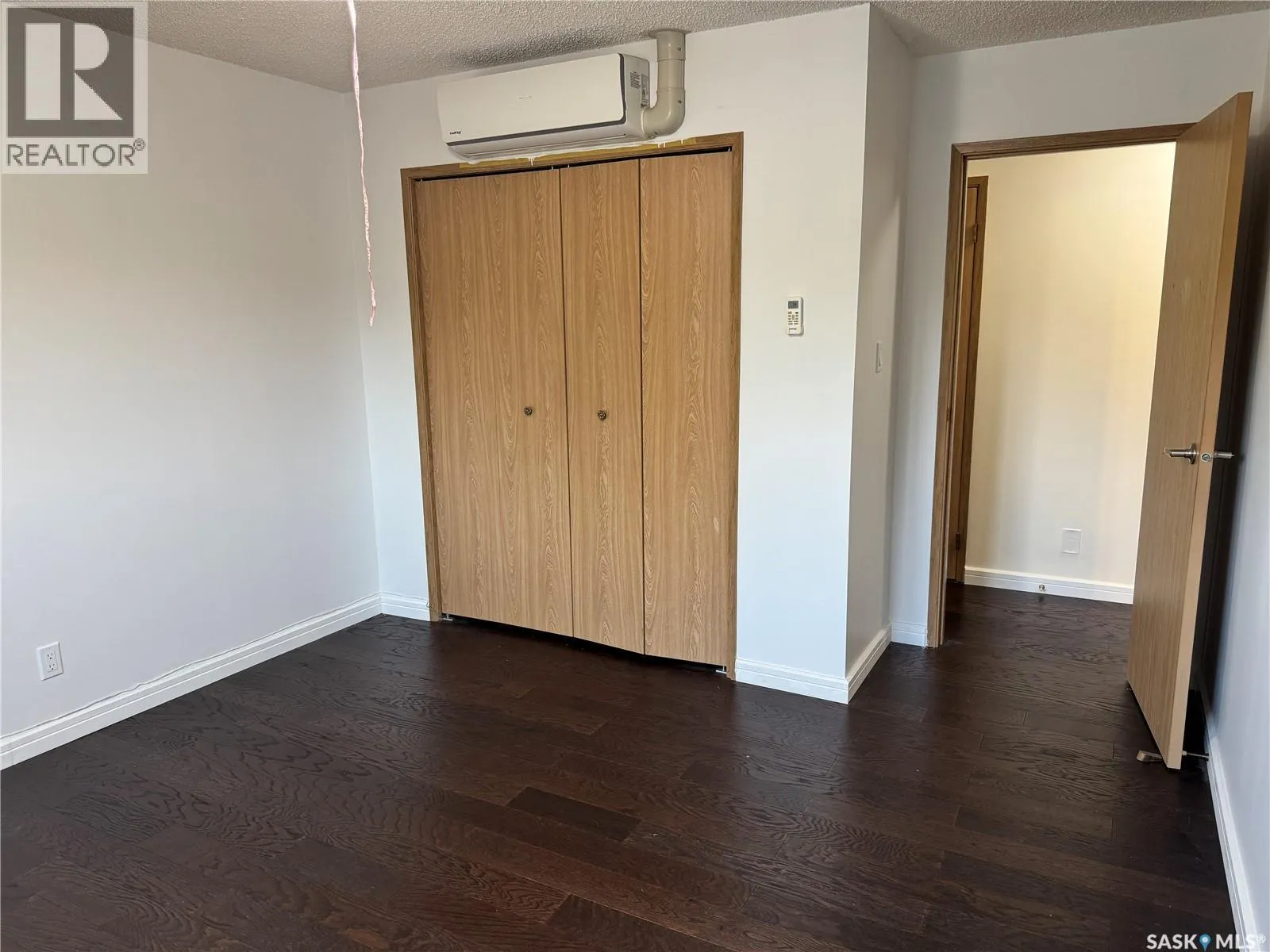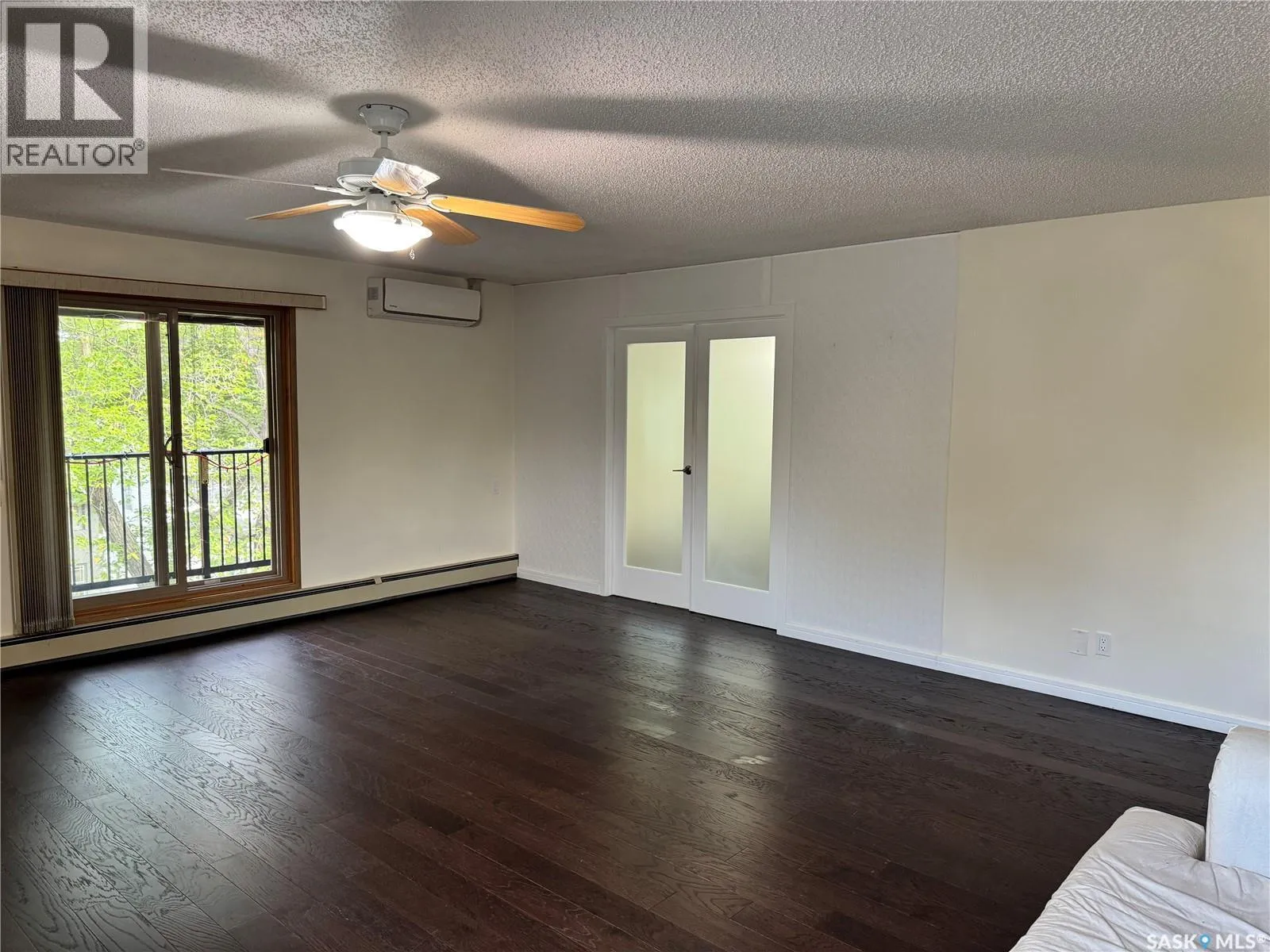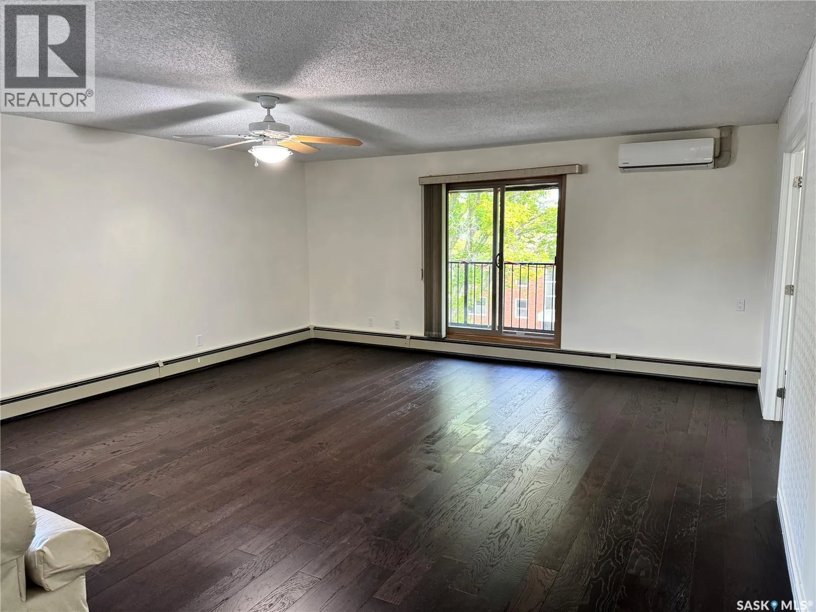 Spacious Top-Floor Condo in Prestigious Varsity View! Offering an impressive 1,267 sq ft of stylish living space, this sprawling 2-bedroom plus den unit combines size, comfort, and an unbeatable location just three blocks from the river. Step inside to find fresh paint, engineered hardwood floors, and an airy open layout designed for both relaxation and function. The generous bedrooms are paired with a versatile denâperfect for a home office or guest roomâwhile the large laundry and storage room add everyday convenience. A roomy screened-in balcony provides a private outdoor retreat, overlooking the quiet, tree-lined street below. Practical updates include central air conditioning with individually controlled units in both bedrooms and the family room, ensuring personalized comfort. This secure, 12-unit building (with only 4 units per floor) offers underground parking with additional storage & an amenities room. Also currently included is 1 surface parking stall already paid for until August 31, 2026 but not beyond. Perfectly situated within walking distance to Royal University Hospital, with an easy commute to downtown, City Hospital, and the University, this condo delivers a rare blend of tranquility and accessibility. Move-in ready and waiting for youâbook your showing today! (id:27476)