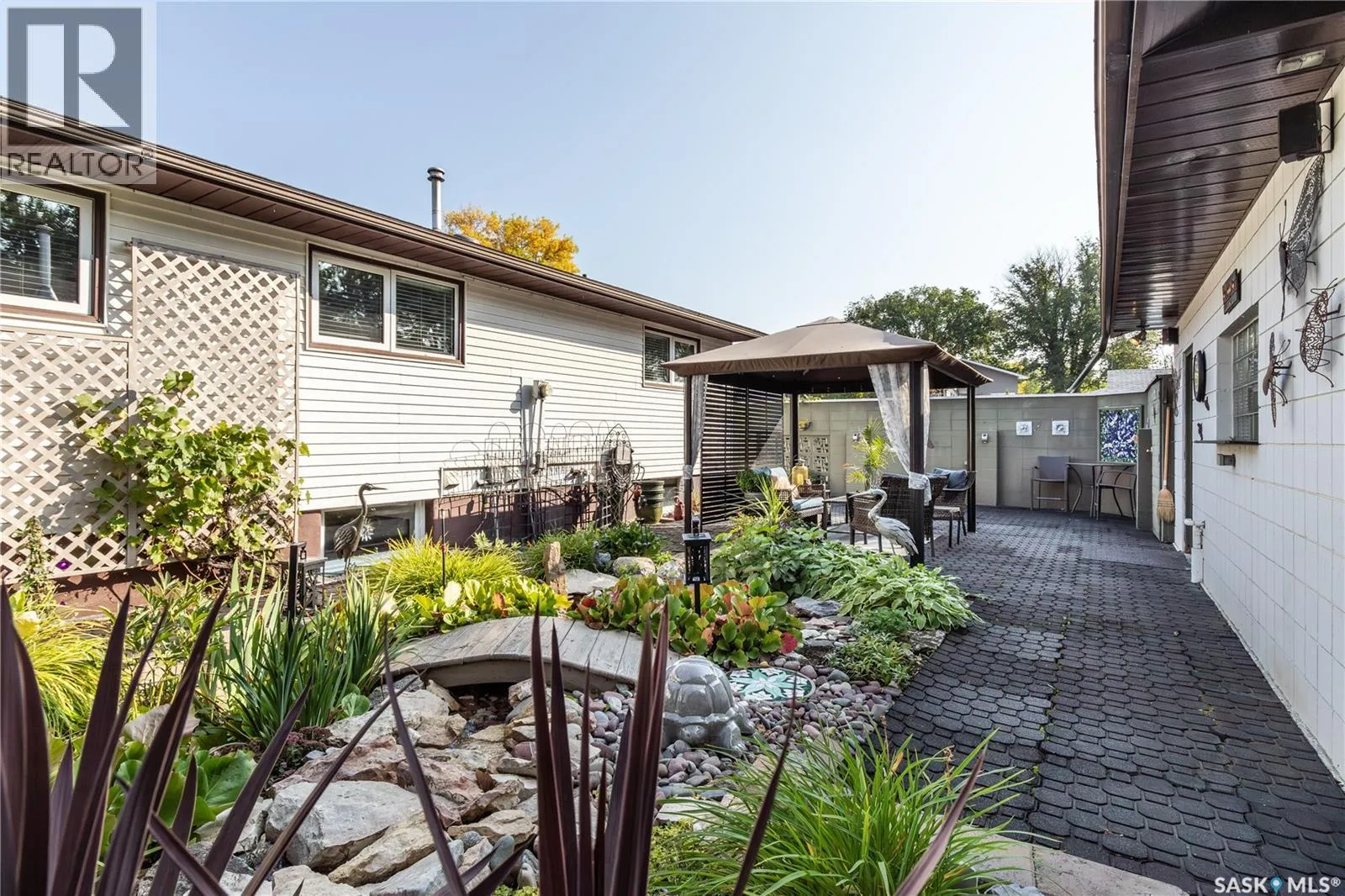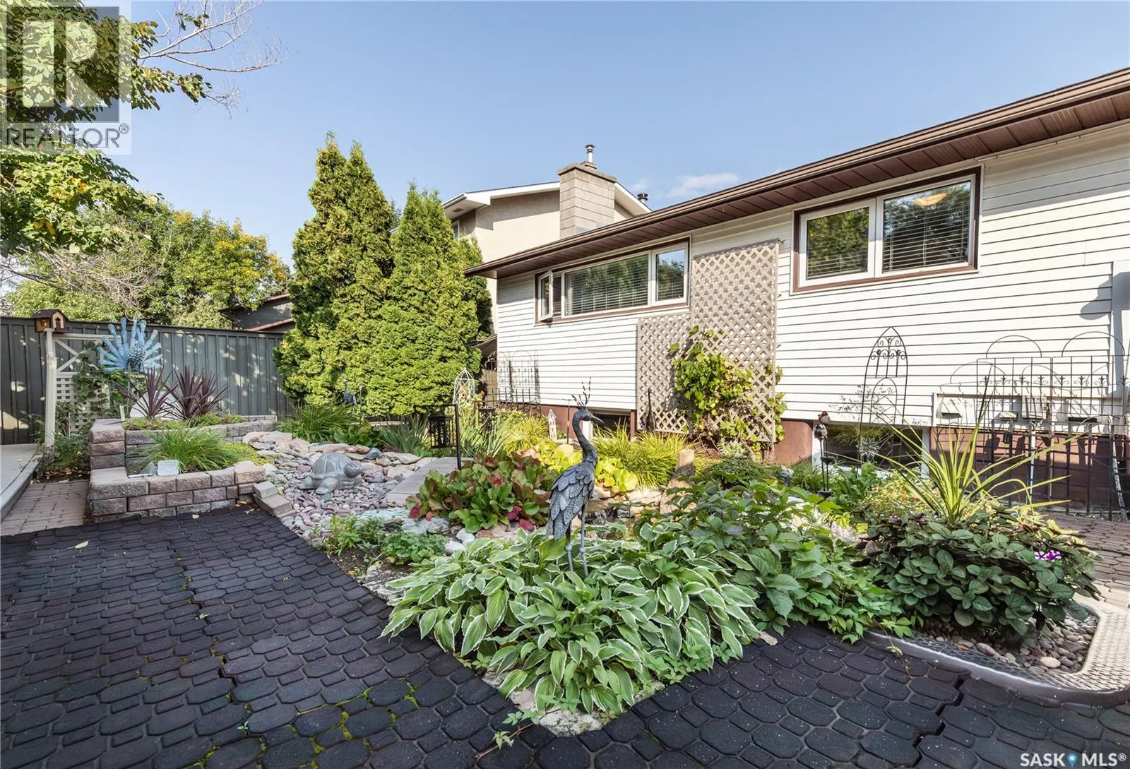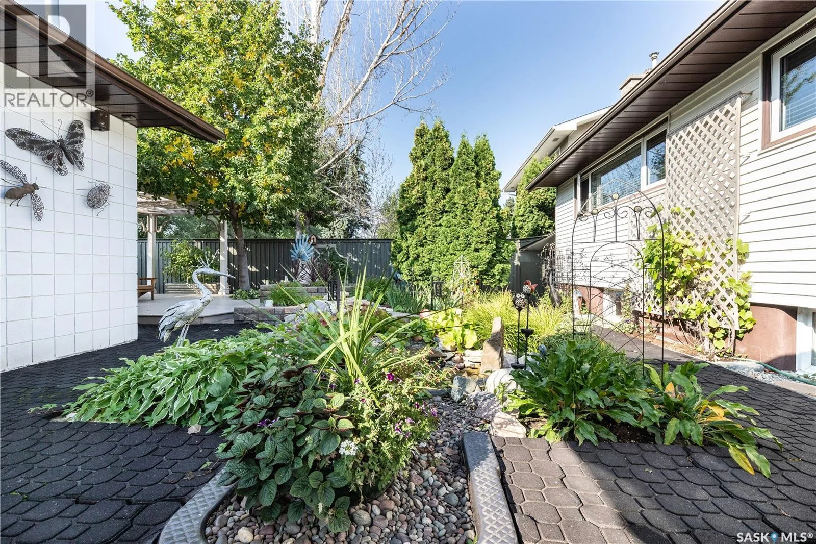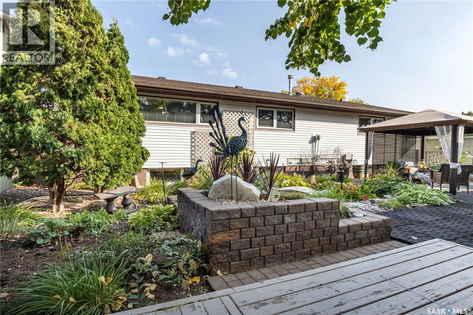 Parcel 120250279 Houses like this donât come along every day! This beautifully renovated 1,536 sq. ft. bungalow offers 3 bedrooms and 2 bathrooms, with upgrades from top to bottom, inside and out. Nestled on a quiet crescent, the home is just minutes from shopping, schools, and quick freeway access to anywhere in Saskatoon. Step inside to find stunning hardwood floors throughout the main level, a sunken living room, and a designer kitchen featuring dark maple cabinetry, quartz countertops, a bar area, custom china cabinet, built-in pet station, eating bar, walk-in pantry, and stainless steel appliancesâall open to the dining and living space. The bedrooms are all generously sized, providing comfort and functionality. The fully developed basement is bright and inviting, thanks to large windows that fill the space with natural light. Enjoy the family room with a cozy gas fireplace and wet bar, plus French doors leading to a versatile multipurpose room ideal for a gym, playroom, or office, all with cork flooring for additional warmth. Youâll also find a bedroom/den, a 3-piece bath with heated marble floors, and a spacious laundry room with sink, storage, and clever under-landing storage. The backyard is truly an oasisârelax under the gazebo while listening to the waterfall cascading into the pond, surrounded by a lush perennial garden. The 24x24 heated garage and maintenance-free cindercrete block fence provide both security and privacy. This home is move-in readyâjust unpack and enjoy! (id:27476)