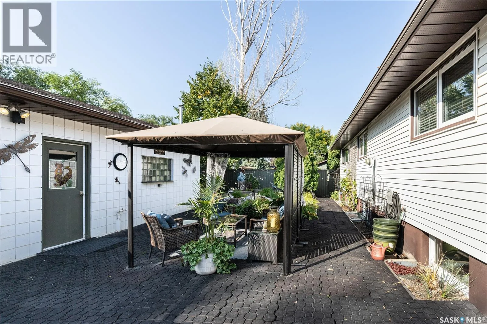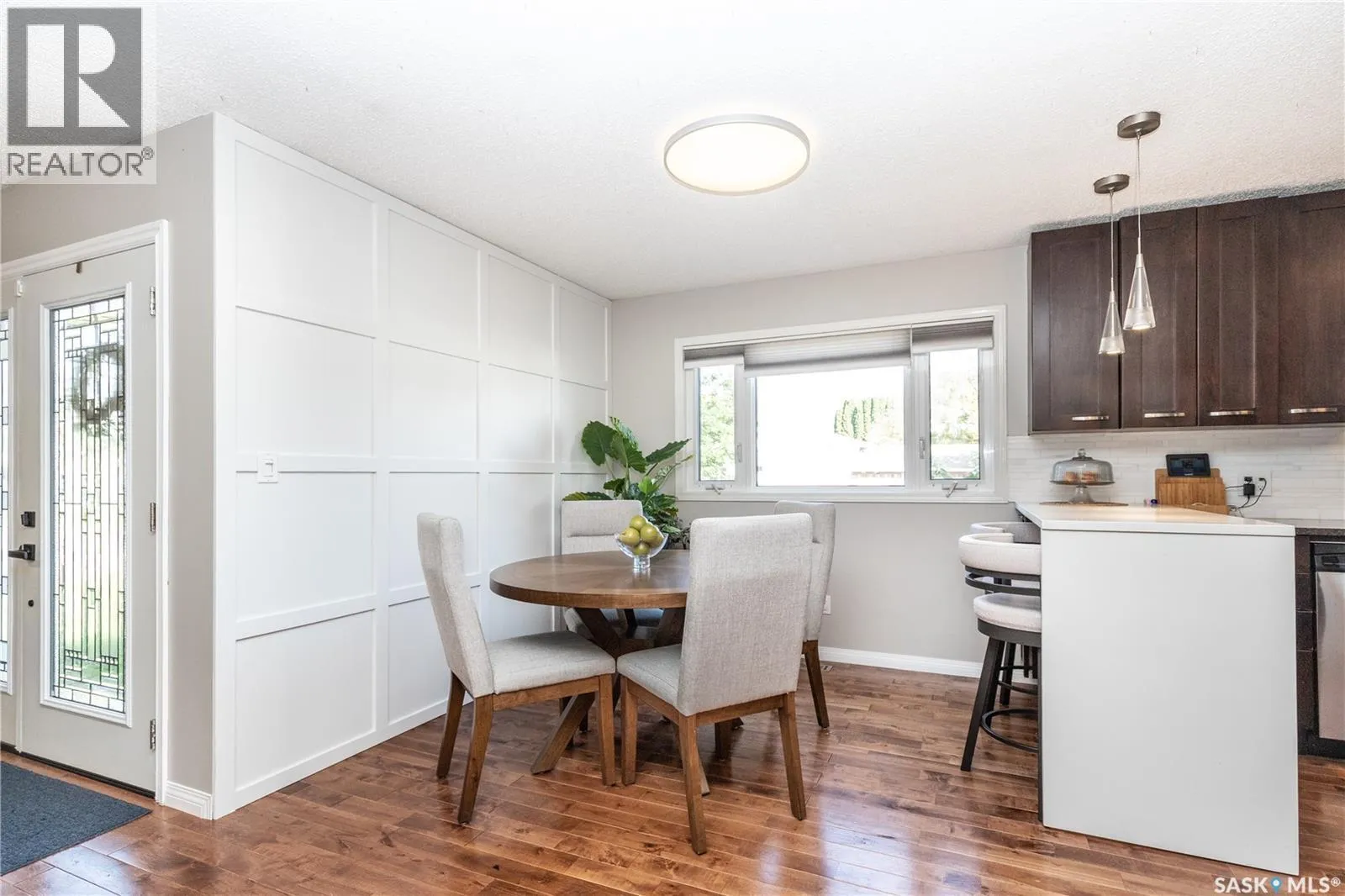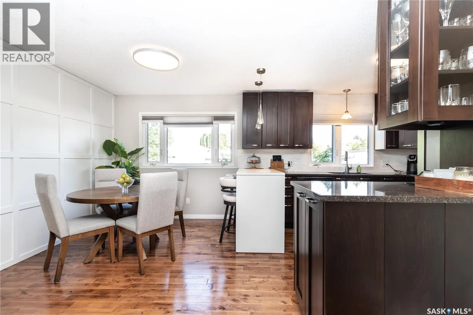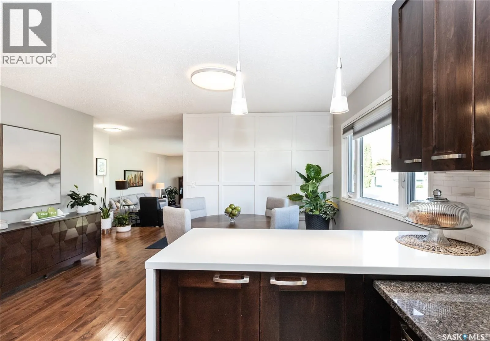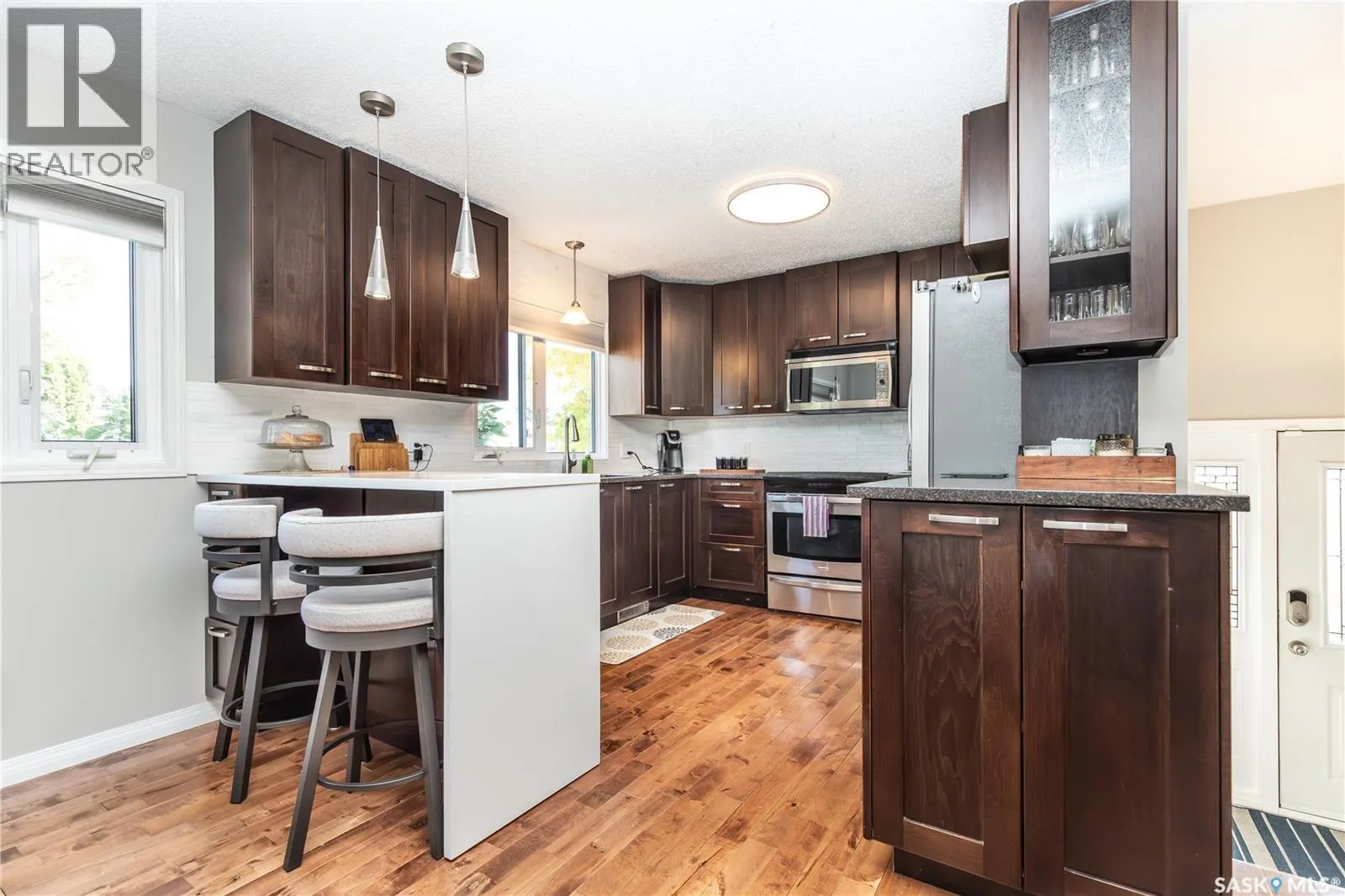 Parcel 120250279 Houses like this donât come along every day! This beautifully renovated 1,536 sq. ft. bungalow offers 3 bedrooms and 2 bathrooms, with upgrades from top to bottom, inside and out. Nestled on a quiet crescent, the home is just minutes from shopping, schools, and quick freeway access to anywhere in Saskatoon. Step inside to find stunning hardwood floors throughout the main level, a sunken living room, and a designer kitchen featuring dark maple cabinetry, quartz countertops, a bar area, custom china cabinet, built-in pet station, eating bar, walk-in pantry, and stainless steel appliancesâall open to the dining and living space. The bedrooms are all generously sized, providing comfort and functionality. The fully developed basement is bright and inviting, thanks to large windows that fill the space with natural light. Enjoy the family room with a cozy gas fireplace and wet bar, plus French doors leading to a versatile multipurpose room ideal for a gym, playroom, or office, all with cork flooring for additional warmth. Youâll also find a bedroom/den, a 3-piece bath with heated marble floors, and a spacious laundry room with sink, storage, and clever under-landing storage. The backyard is truly an oasisârelax under the gazebo while listening to the waterfall cascading into the pond, surrounded by a lush perennial garden. The 24x24 heated garage and maintenance-free cindercrete block fence provide both security and privacy. This home is move-in readyâjust unpack and enjoy! (id:27476)