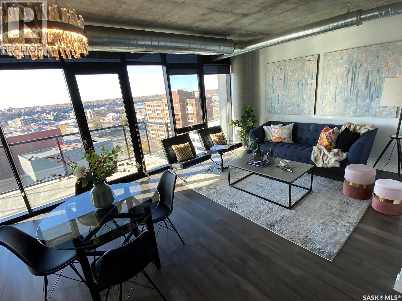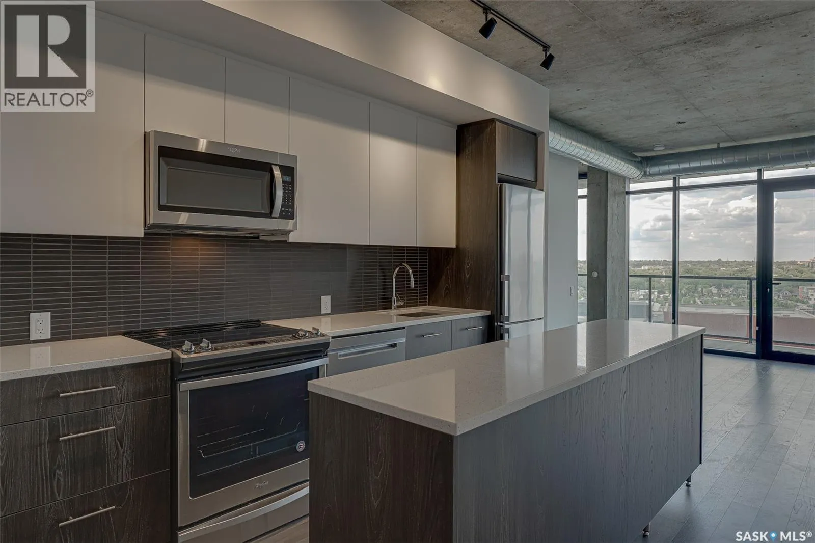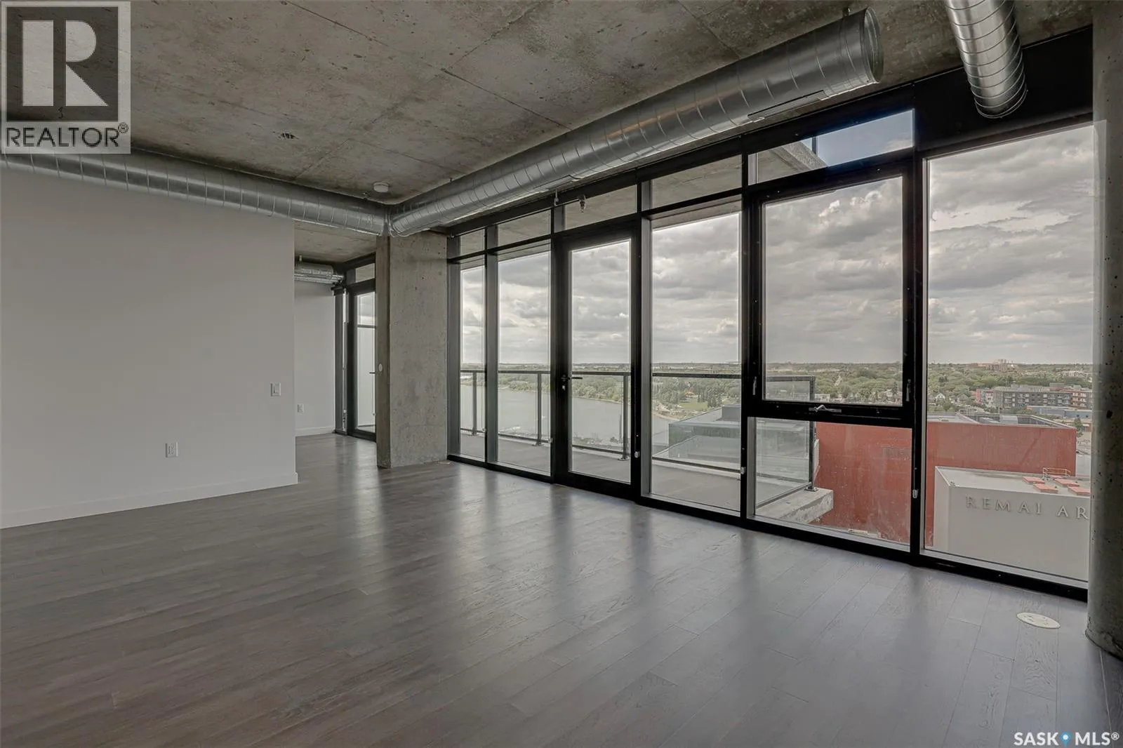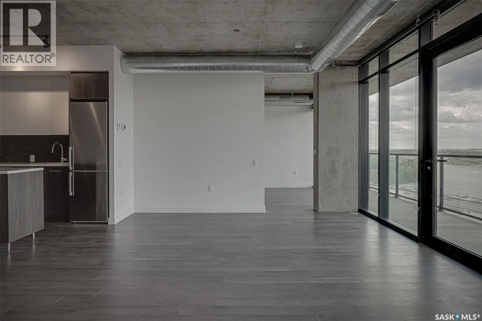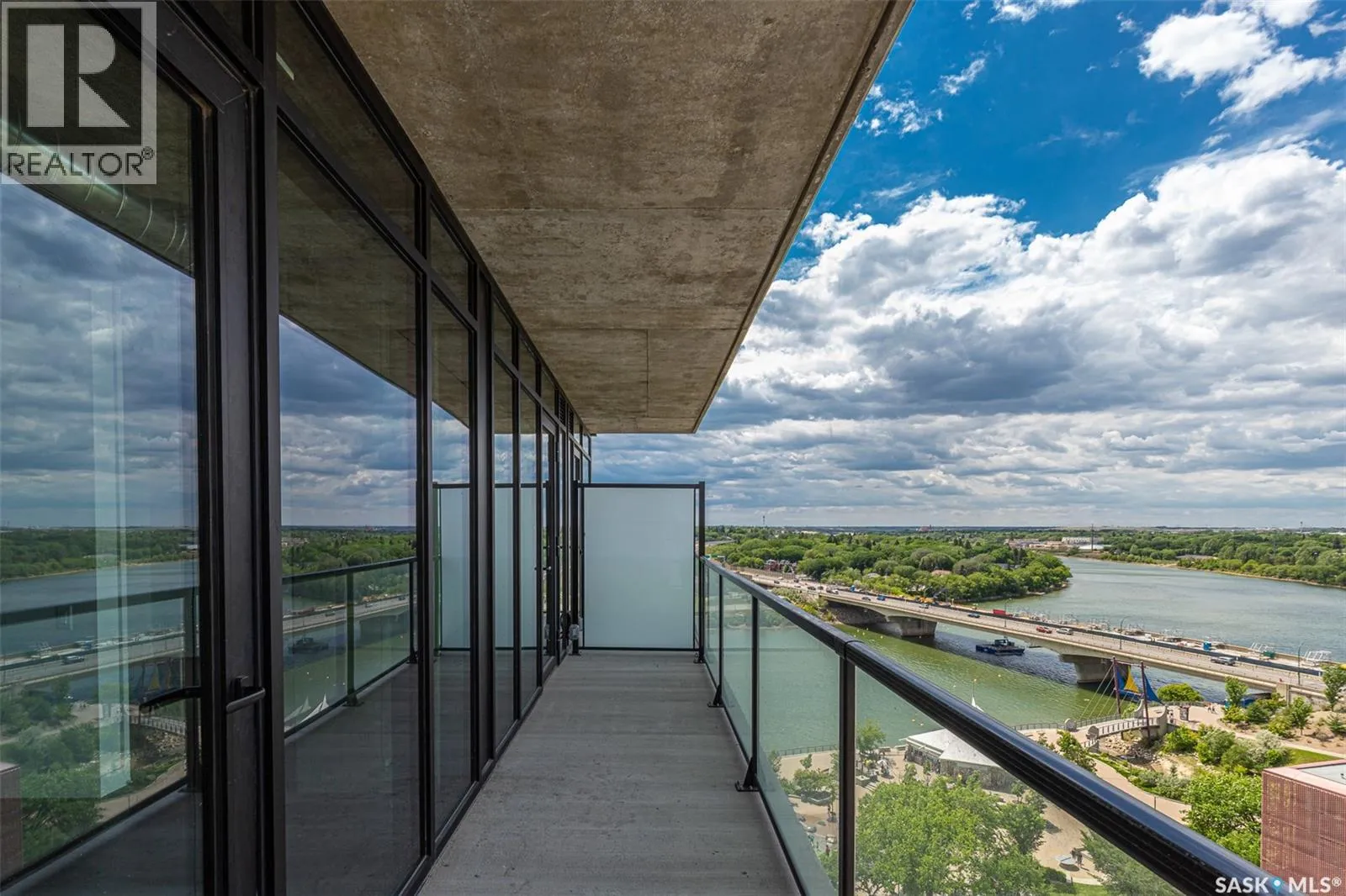 A luxurious 2 bedroom + den River Landing condo. Located on the 12th floor, this unit has amazing West facing views of the river and sunsets. The kitchen has a move-able set of lower cabinetry that can act as an island. The primary bedroom has a walkthrough closet, leading into the 3 piece bath. With exposed concrete ceilings and pillars, this industrial style building is like no other. There is an amenities room with a pool table available for private use, a gym, underground parking, and secure access. Located right on the river near walking paths, restaurants, pubs, the Remai Arts Gallery and much more. (id:27476)