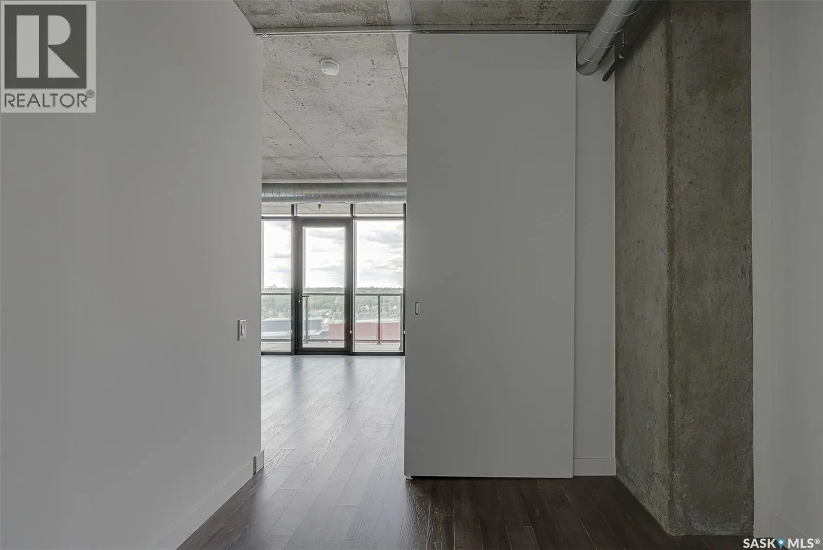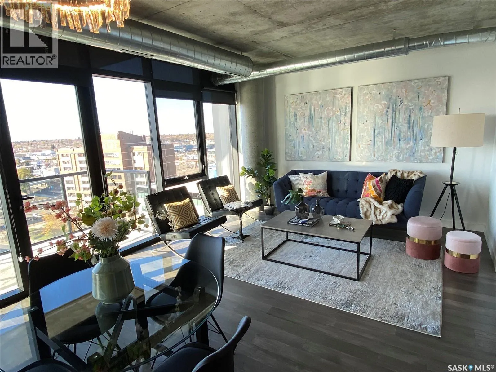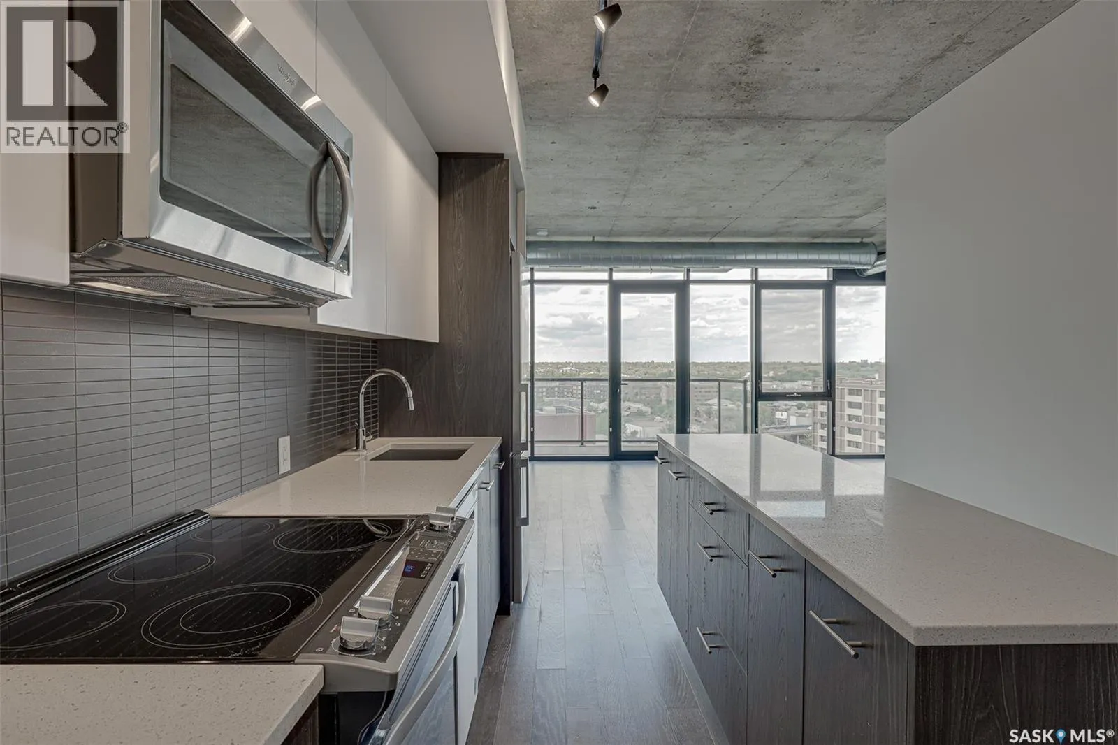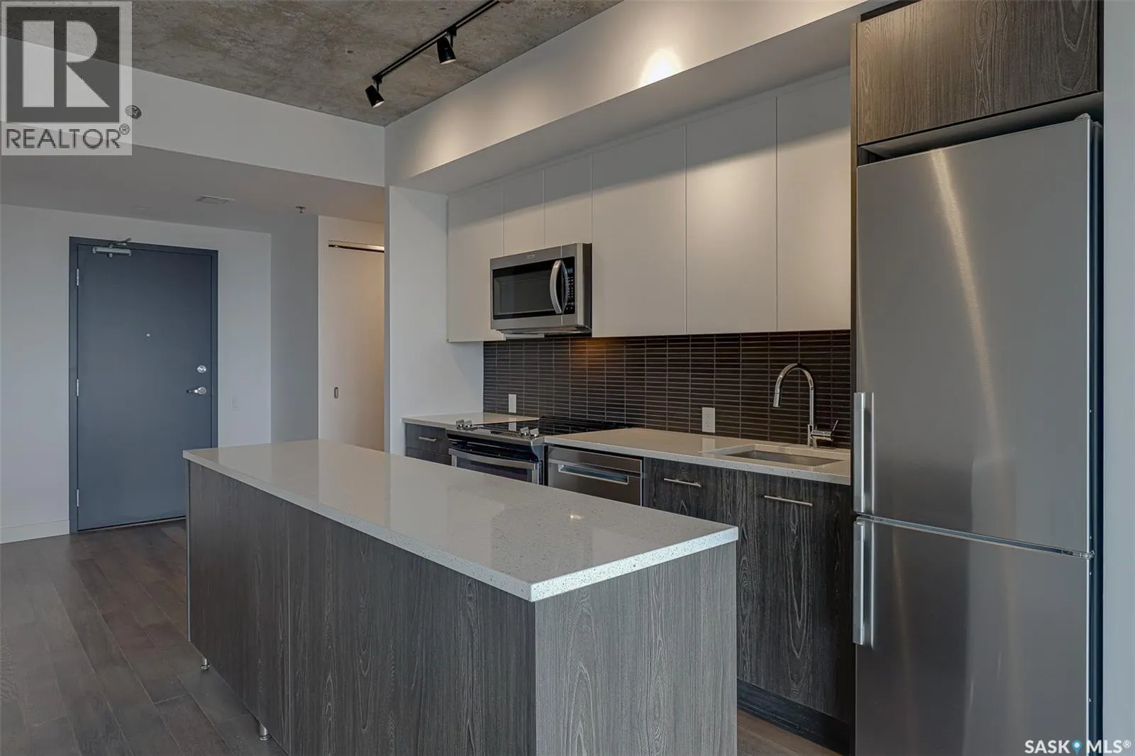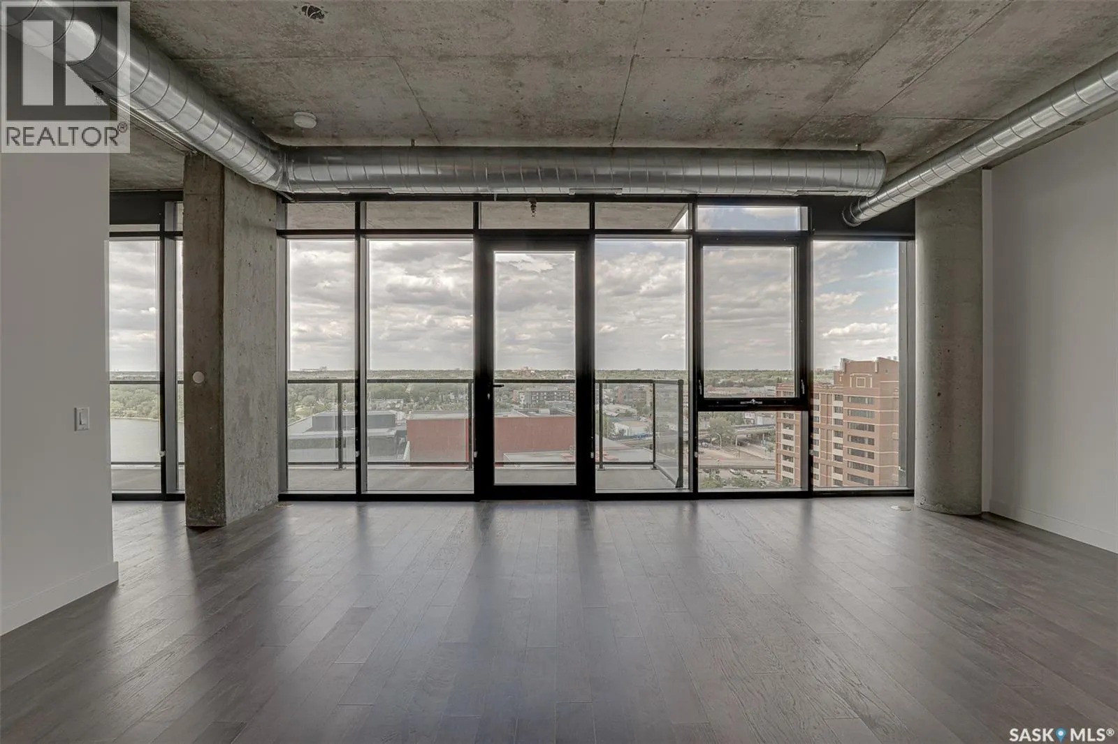 A luxurious 2 bedroom + den River Landing condo. Located on the 12th floor, this unit has amazing West facing views of the river and sunsets. The kitchen has a move-able set of lower cabinetry that can act as an island. The primary bedroom has a walkthrough closet, leading into the 3 piece bath. With exposed concrete ceilings and pillars, this industrial style building is like no other. There is an amenities room with a pool table available for private use, a gym, underground parking, and secure access. Located right on the river near walking paths, restaurants, pubs, the Remai Arts Gallery and much more. (id:27476)