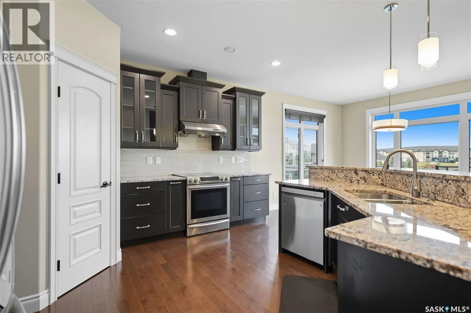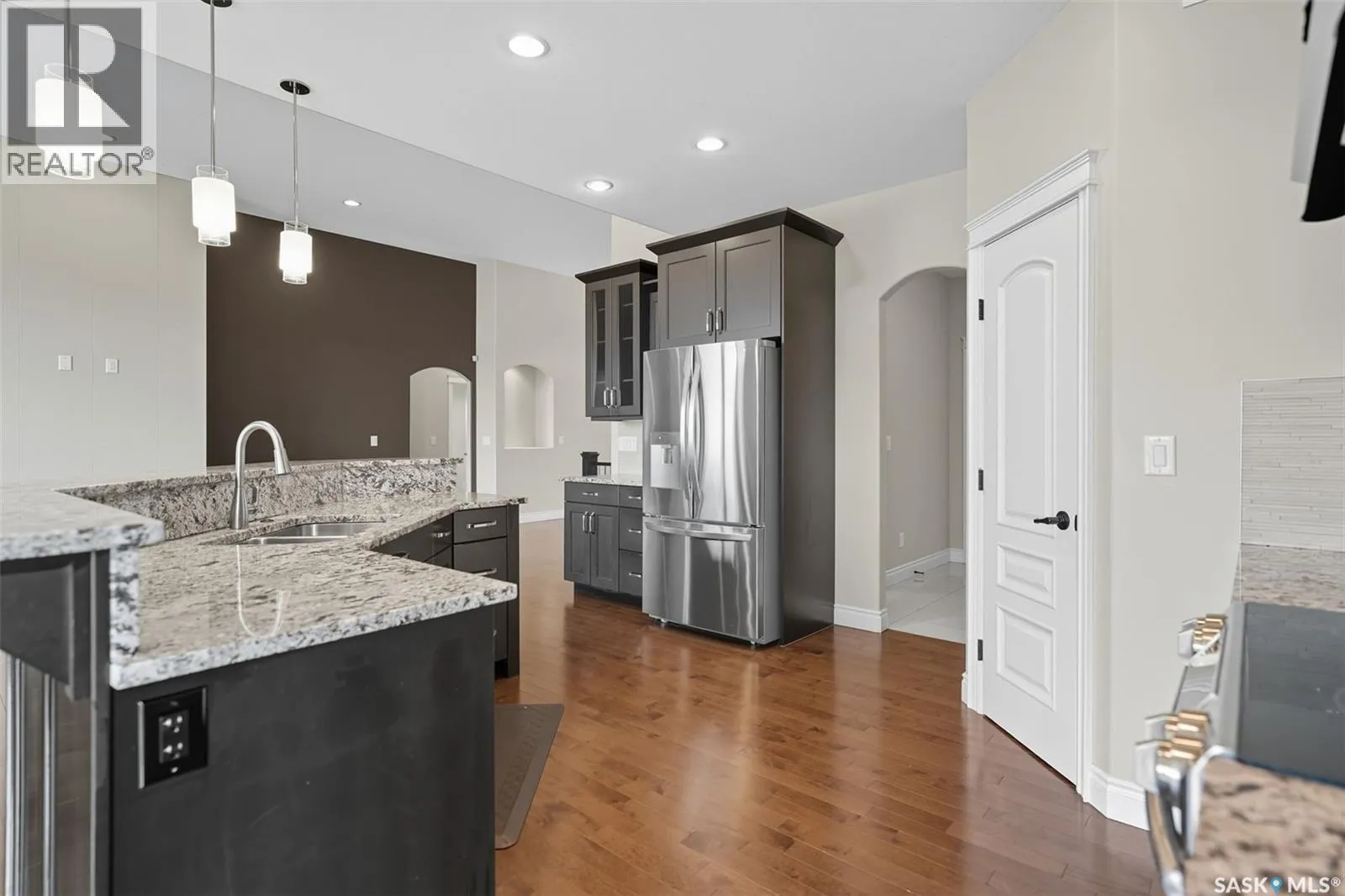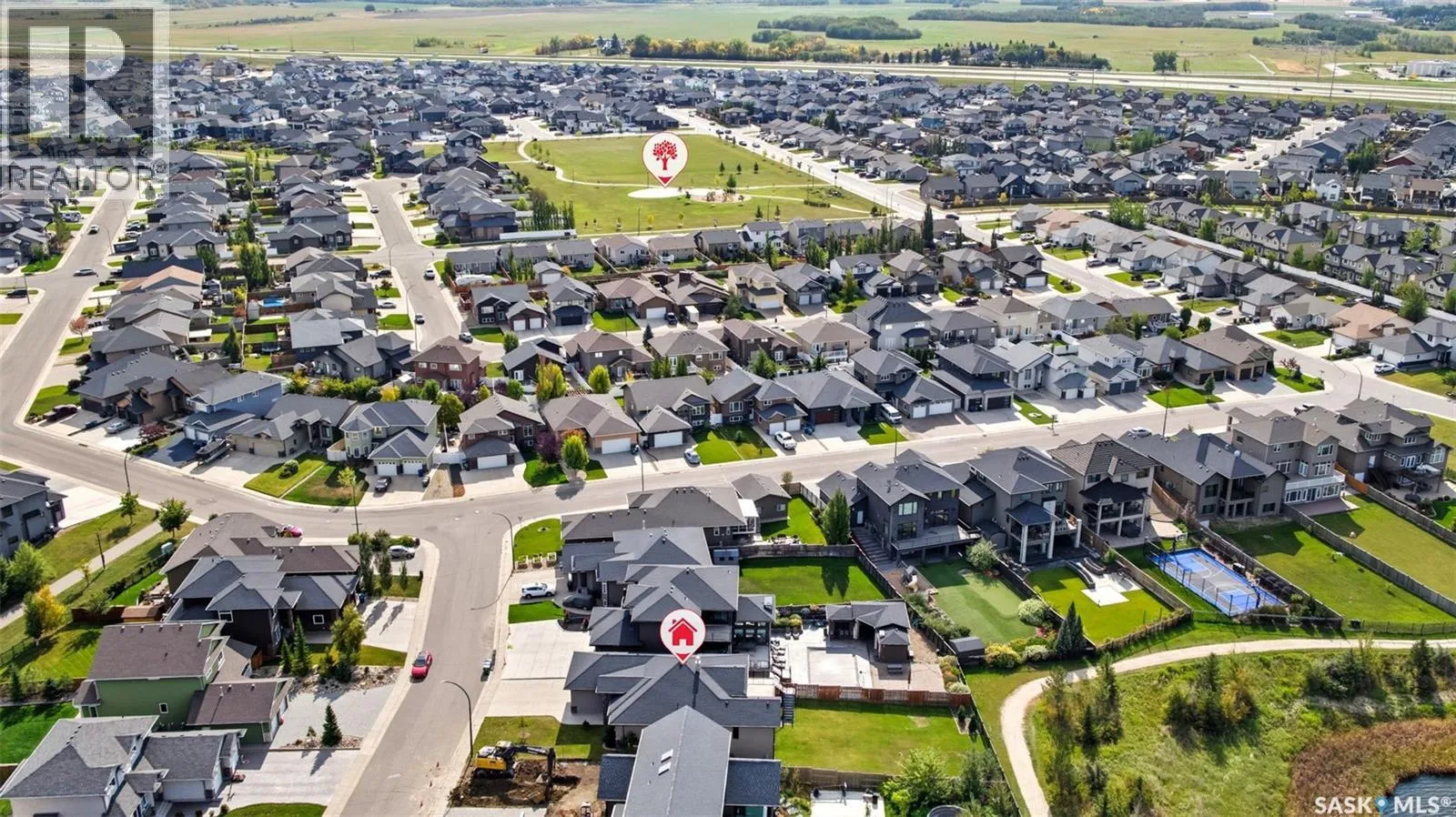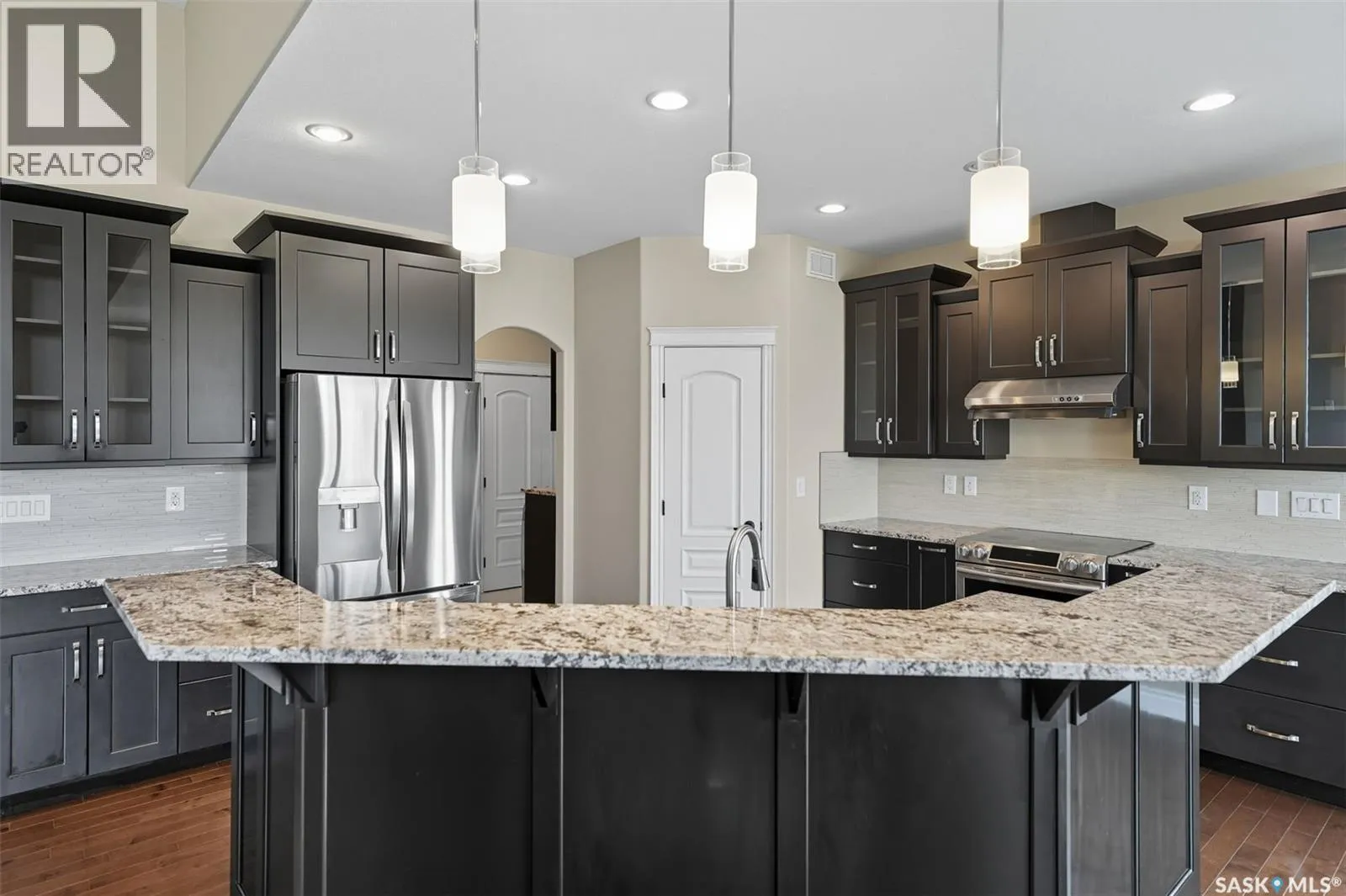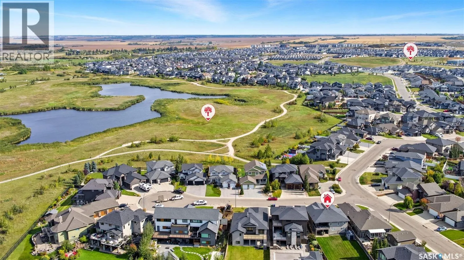 Welcome to 714 Ledingham Place, a rare find in a fantastic cul-de-sac location backing onto Hyde Park with breathtaking water views. Situated on a massive 9,559 sq. ft. lot with a sunny southwest-facing backyard, this D&Sâbuilt walkout bungalow offers over 3,600 sq. ft. of luxurious living space with top-quality finishes inside and out. The striking stone and stucco exterior, oversized driveway accommodating up to five vehicles, and impressive curb appeal set the tone. Inside, the main floor boasts soaring 12-ft ceilings, a spacious foyer with tile flooring, open-concept living with a tiled feature wall and gas fireplace, and a chefâs dream kitchen with abundant maple cabinetry, granite countertops, tiled backsplash, corner pantry, and a generous dining area overlooking the park and pond. Hardwood flooring flows throughout, complementing three large bedrooms, including a primary suite with walk-in closet and spa-like ensuite featuring dual sinks and a tiled shower. Main floor laundry adds convenience. The bright walkout basement expands the living space with a large games room, family room, office, two additional bedrooms with walk-in closets, a 5-piece bath with jetted tub, and durable laminate flooring. Outdoor living shines with a composite deck, glass railing, and stairs leading to the park-like yard with underground sprinklers on a timer. Additional upgrades include triple-pane windows, central vac, HRV, new central A/C (2025), dishwasher (2023), and fridge (2021). Close to schools, shopping, and all amenities, this home truly shows 10/10. (id:27476)