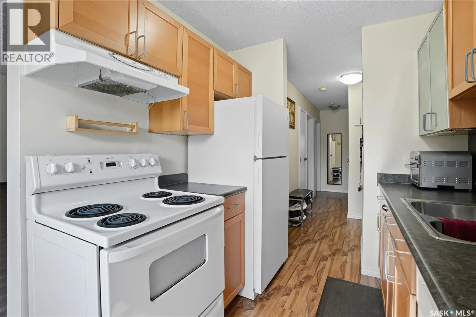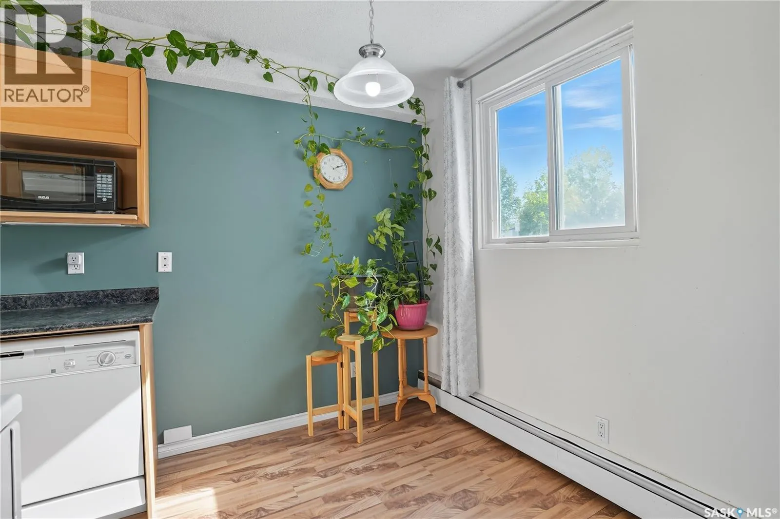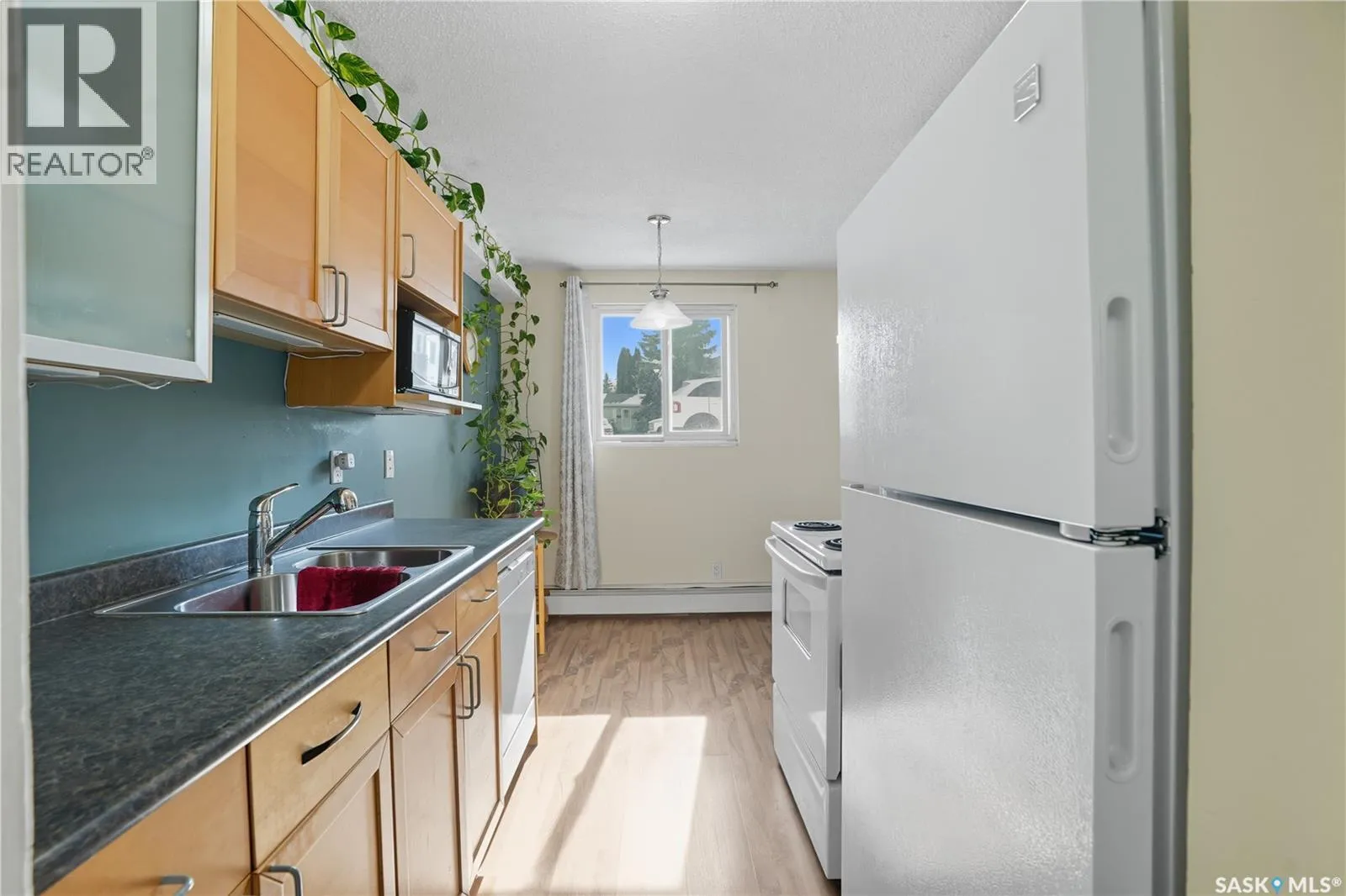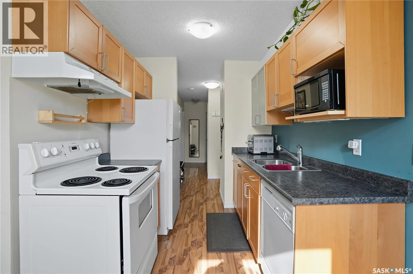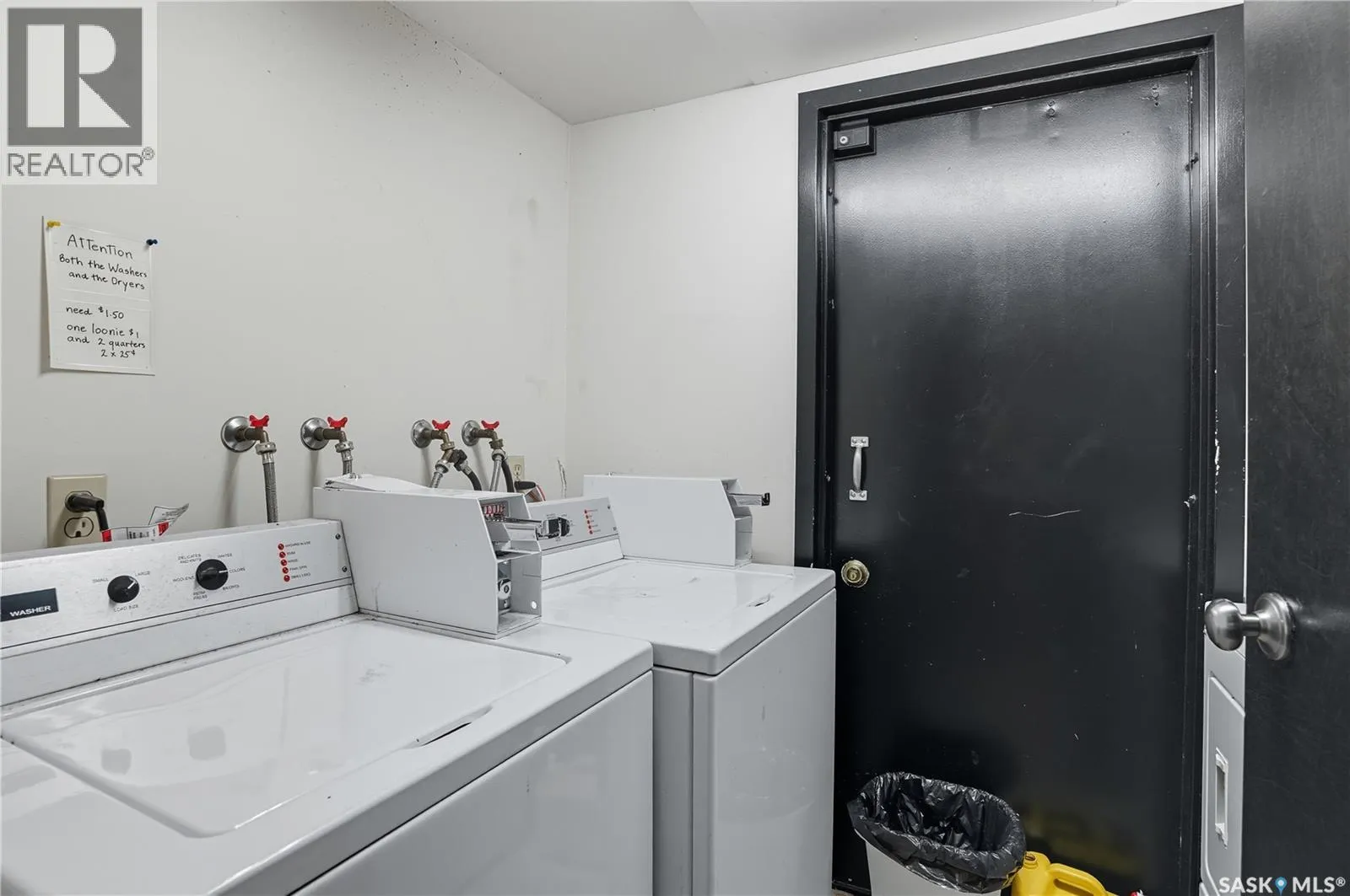 Great West College Park Condo! This bright corner unit condo features two bedrooms, a full bathroom, and an in-suite washer for your convenience, plus a common laundry room just down the hall. The upgraded kitchen and laminate flooring throughout add a modern touch. Includes an electrified parking stall and pet are allowed. Easy access to the U of S, public transit and all amenities nearbyâperfect condo for students, first-time buyers, downsizing or investors! (id:27476)