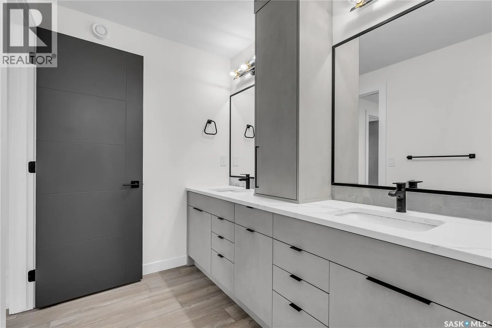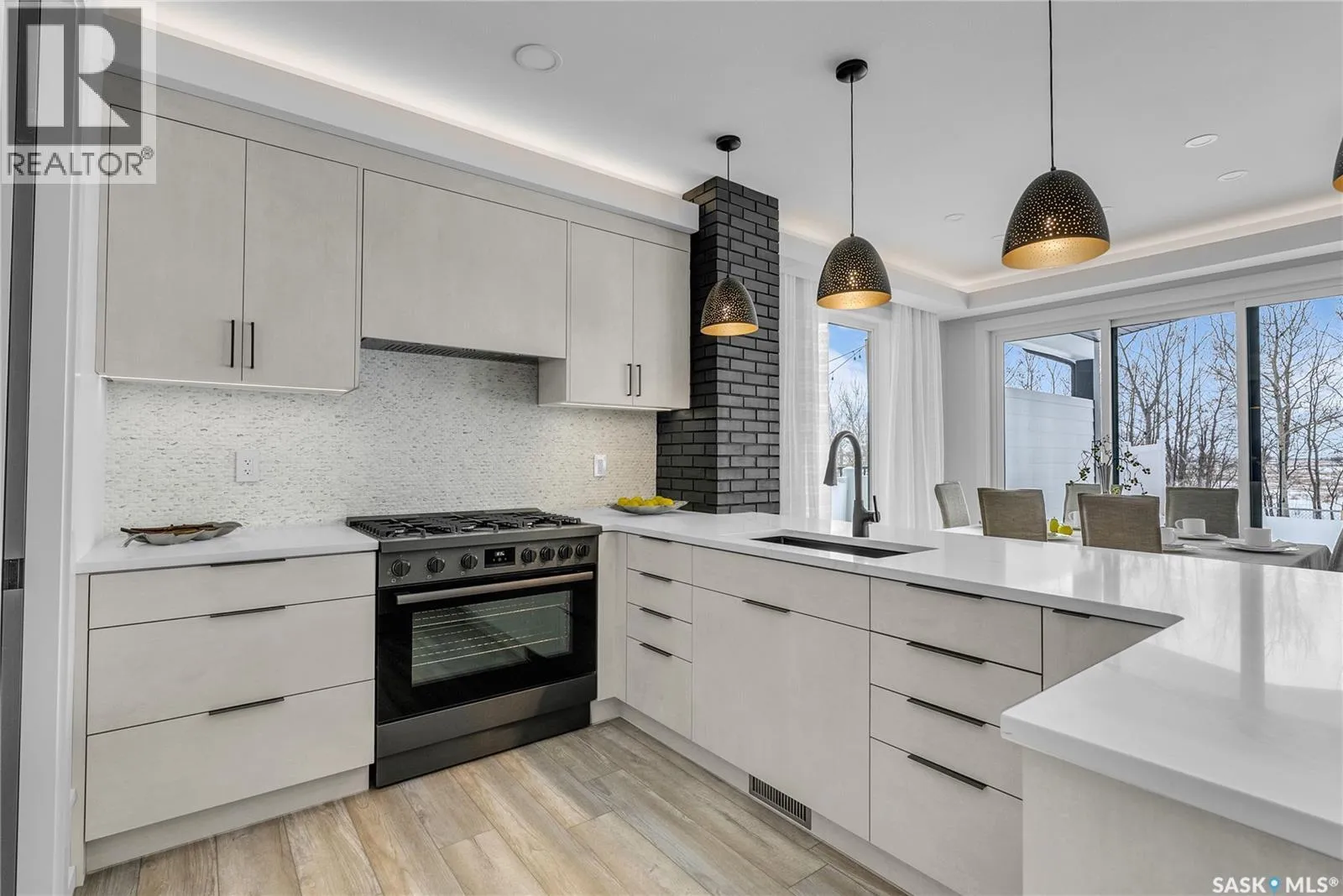 Homes by Norwood located at 428 Woolf Bend in Saskatoonâs Aspen Ridge, featuring luxury finishes and expert craftsmanship. The spacious foyer welcomes you, stained wood railings and glass staircase inserts lead to 2nd floor. Engineered Vinyl Plank flooring throughout home. The main floor boasts 8â interior doors, 9â ceilings with LED-lit tray designs, a great room with a brick feature wall, large south-facing windows, and a dining area with sliding doors to a 12âx12â covered deck. The gourmet kitchen includes modern cabinetry, a 6-burner gas convection range, warming tray, range hood, LED strip lighting, tile backsplash, quartz countertops, and a peninsula bar, with an adjoining butlerâs pantry offering a fridge/freezer, dishwasher, microwave, prep sink, spice rack, and ample storage. The primary bedroom features a custom feature wall and insulated walls for sound comfort, while the ensuite offers dual vanities, a custom walk-in shower, abundant storage, a stacking washer/dryer, and a private commode. Additional main-floor spaces include a 2-piece powder room and mudroom with extensive storage. The second floor has three large bedrooms with interior insulated walls, a second laundry room with a sink, and a split main bathroom with dual vanities, a soaker tub/shower with tile, and separate lavatory. The basementâs exterior walls are framed, insulated, and wired, with interior walls framed and wired as well. Mechanical features include a high-efficiency furnace with zoned heating and thermostats on each floor, a power vent hot water heater with a circulating pump, an HRV system, central air, and 200-amp electrical service. The 27âW x 26âD double attached garage is insulated, wired, drywalled, has LED lighting, and is nearly 14â high for future car lifts. The exterior features Hardie board siding, composite finishes, and a maintenance-free covered deck with a privacy wall and natural gas outlet. Enjoy breathtaking south views of Kernen Prairieâschedule a viewing today (id:27476)