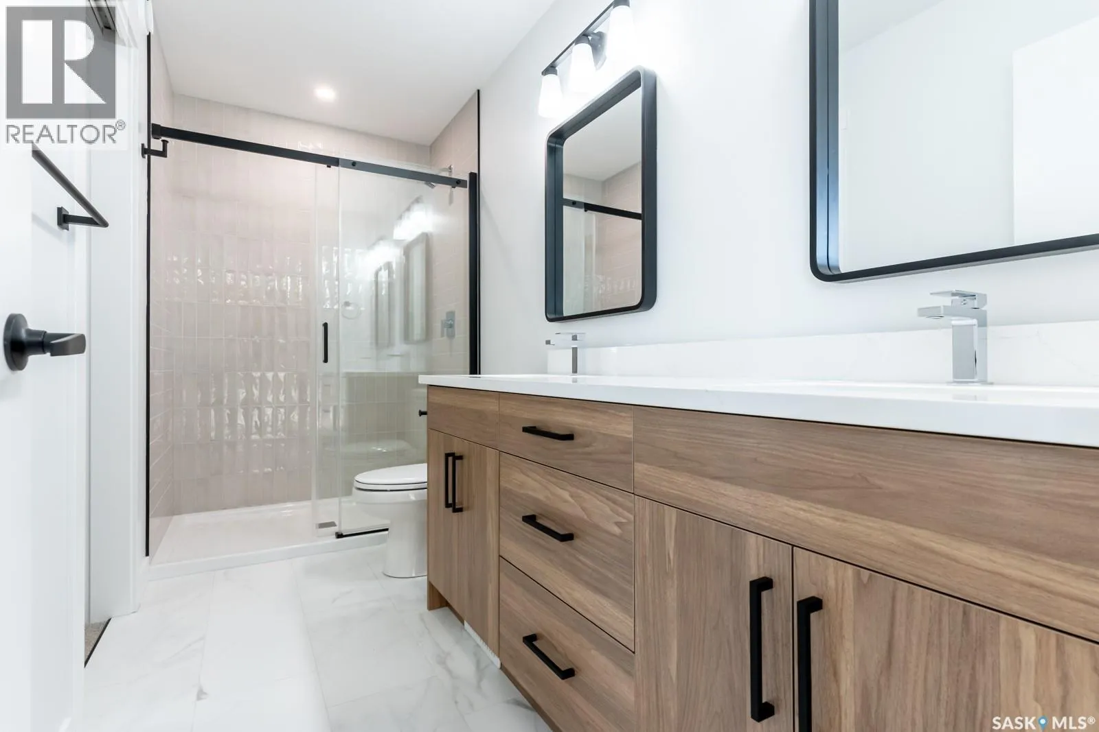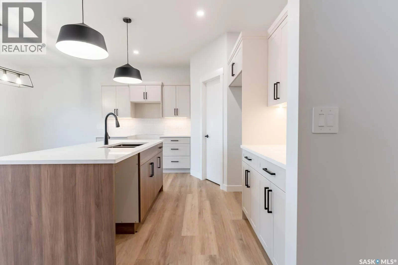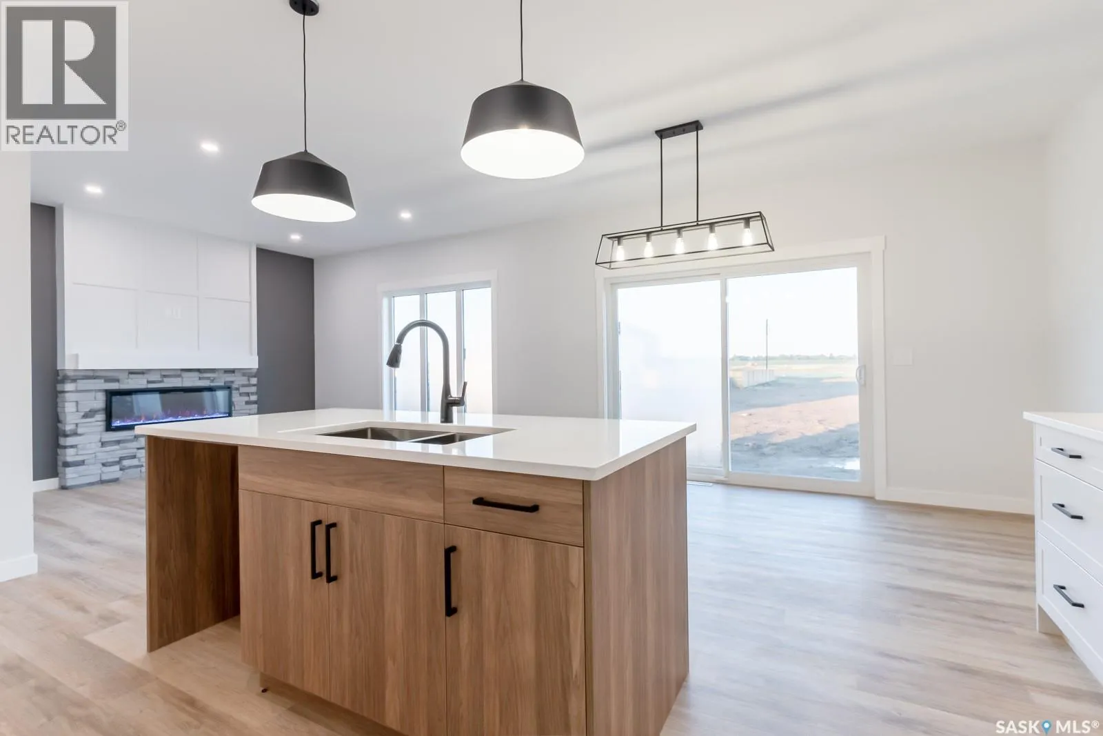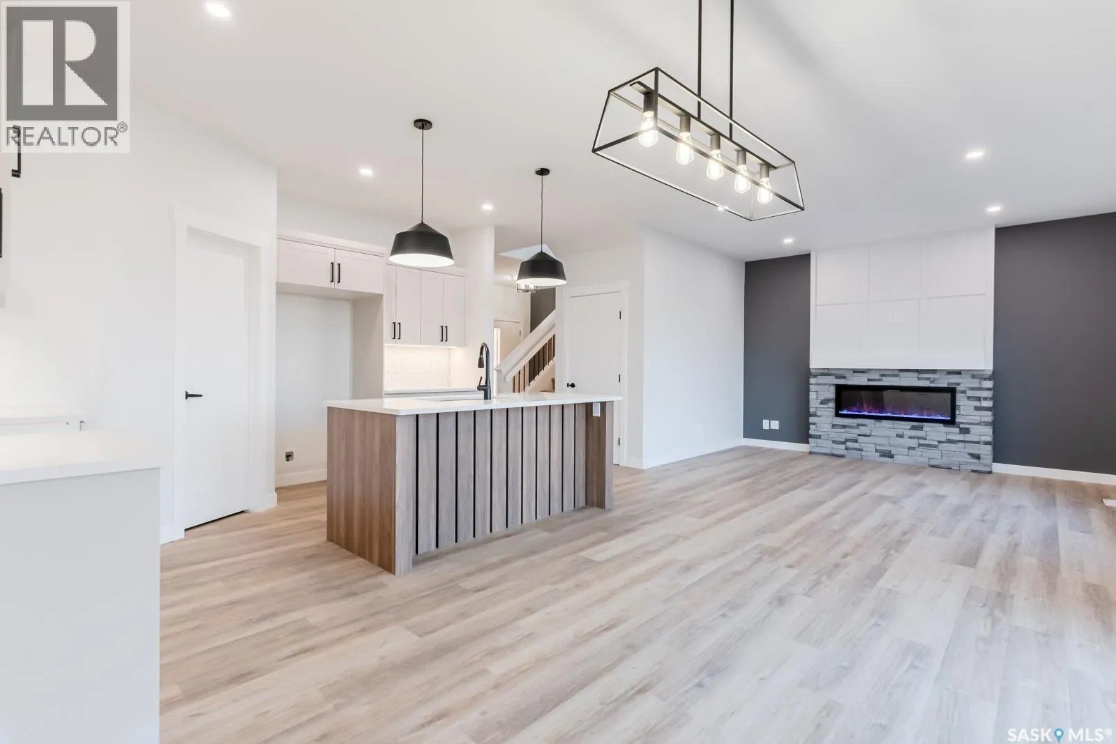 Welcome to The Escada! This beautifully designed 1,848 sq. ft. Step inside from the fully insulated garage into a convenient mudroom that leads directly to the walk-through pantry. The modern kitchen features custom cabinetry, quartz countertops, a stylish backsplash, and a spacious island. An oversized patio door in the dining area and large living room windows fill the space with natural light, while the fireplace creates a cozy atmosphere for winter evenings. Upstairs, a bonus room at the front of the home offers additional living space. The primary bedroom, located at the back, boasts a spacious walk-in closet and a 5' custom tiled shower in the ensuite, complete with dual sinks and extra vanity storage. Two additional bedrooms, a laundry area with a cabinet and sink, and a well-appointed main bath complete the second floor. Outside, the home includes a concrete driveway and front landscaping. Built by Edgewater Homes, this property is covered under the Sask New Home Warranty for peace of mind. Please note: Photos may not be exact representations of the home and are for reference only. Errors and omissions excluded. Prices, plans, and specifications are subject to change without notice. PST & GST included with rebate to builder. (id:27476)