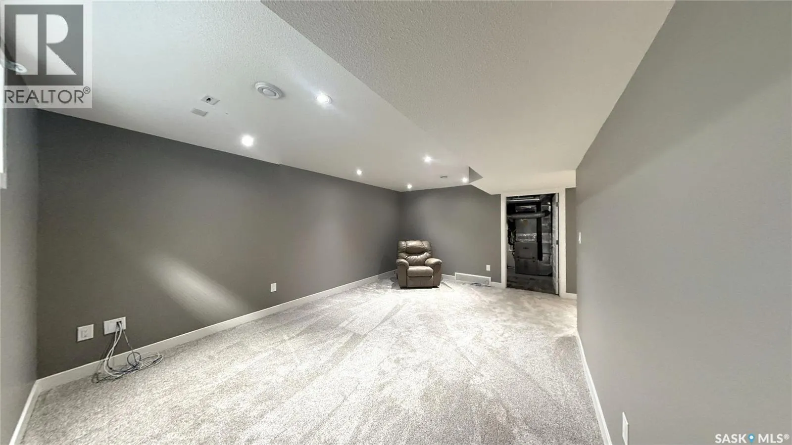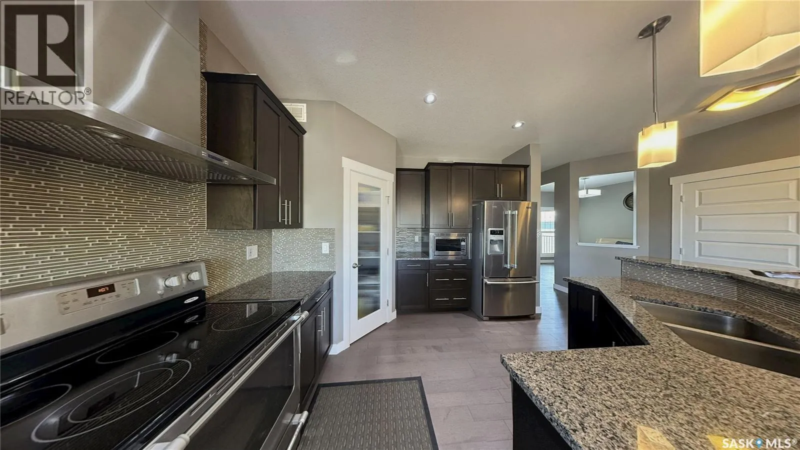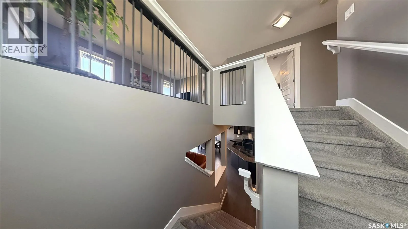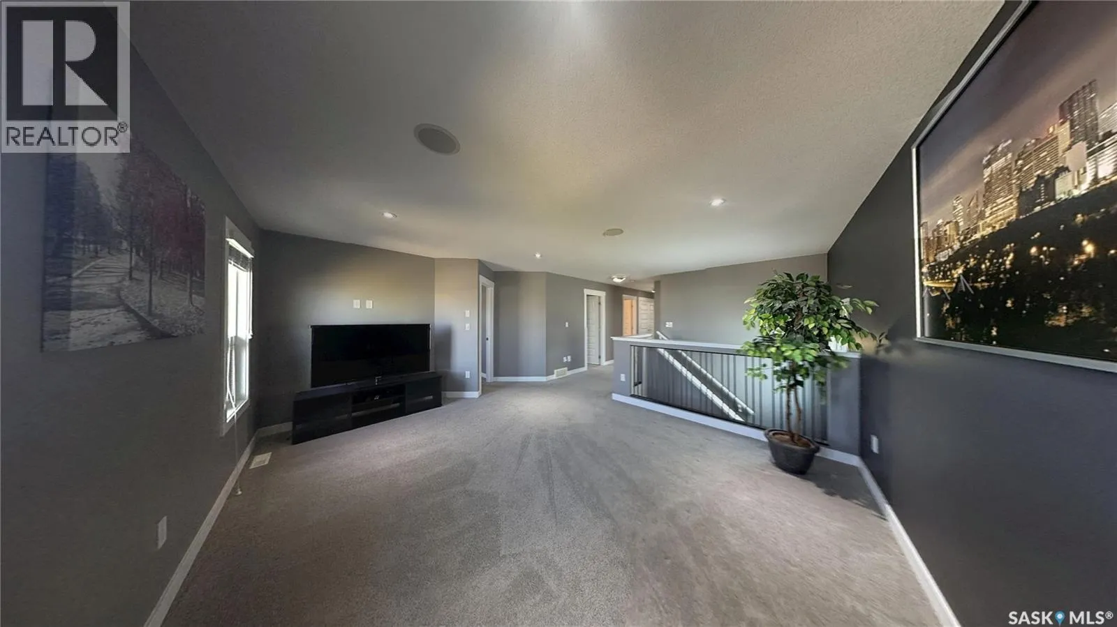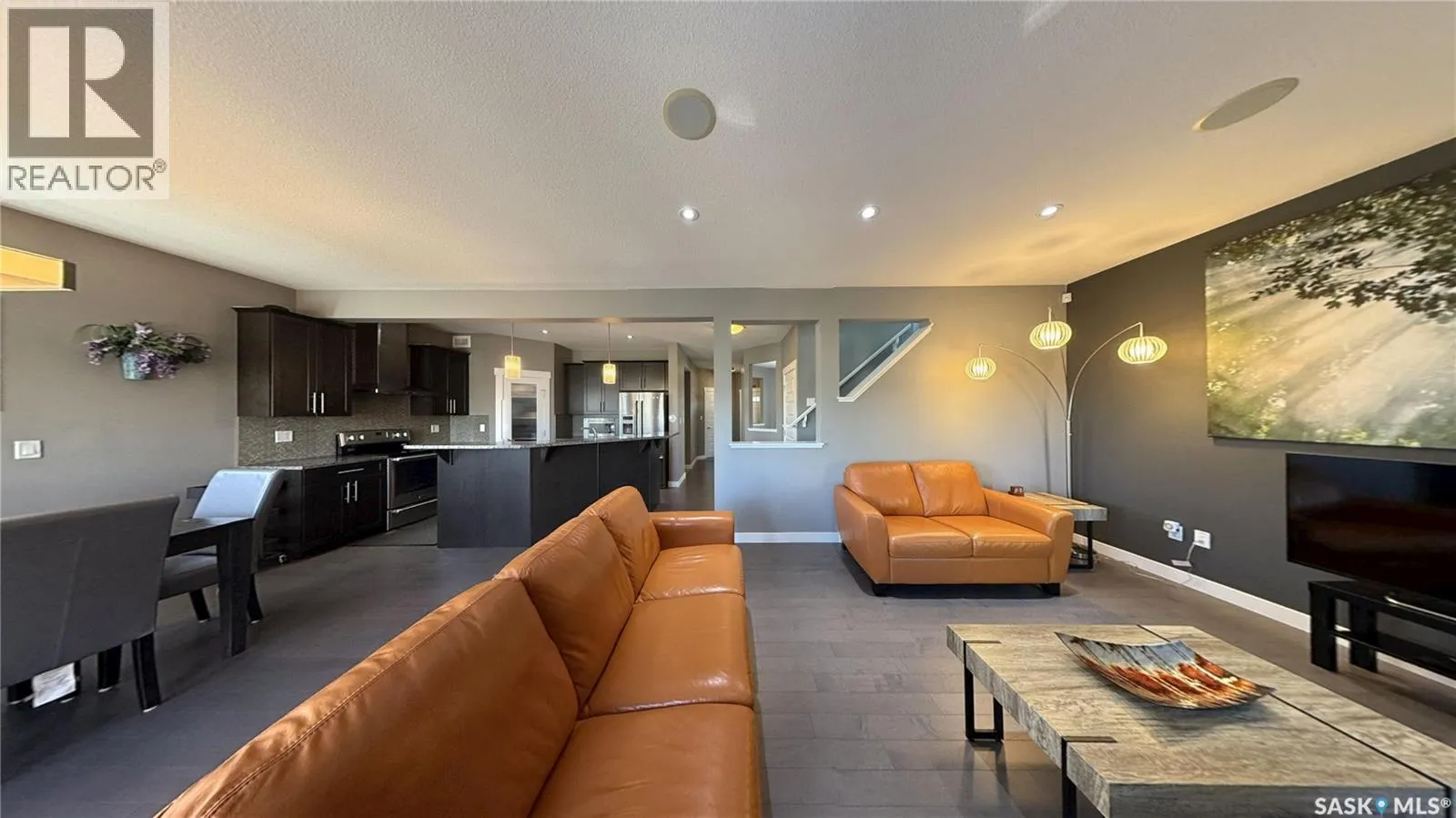 Rosewood,Saskatoon Experience elevated living in this exquisitely crafted executive CUSTOM BUILT home, offering over 2,200 sq ft of impeccably designed space in Saskatoonâs prestigious ROSEWOOD community. From the striking curb appeal with turf and a covered COMPOSITE DECK entry to the show home-level finishes throughout, every detail exudes LUXURY. The main floor features rich HARDWOOD FLOORS, 9 FEET ceilings, a private DEN, designer powder room, and stainless steel appliances equipped kitchen with GRANITE COUNTERTOPS, SOFT-CLOSE SUPERIOR CABINETRY, walk-in pantry, and a TWO-TIER ISLAND. The open-concept dining and living areas flow to a composite deck and professionally landscaped yard backing onto both Public and Catholic schools. Upstairs, retreat to a vaulted-ceiling PRIMARY BEDROOM with a 5 piece ensuite and walk-in closet. Comfort of a Laundry area with storage on 2nd floor next to Primary bedroom. Central Vac system. THREE ADDITIONAL BEDROOMS on the second level, a stylish main bath (DOUBLE VANITY), bonus room, and upper laundry. The fully developed basement includes a sound-insulated home theatre wired for projector and surround sound, a bedroom, 4 Piece bath, gym/flex space, and extensive storage The Basement has new upgraded carpet installed. With central A/C, built-in speakers, triple-pane windows, Hunter Douglas blinds, a fully finished oversized garage, and high-end upgrades throughout, this move-in-ready home is an opportunity for those who demand comfort, function, and refined designâall in one. Buyers & Buyers' Realtor® to verify all measurements (id:27476)