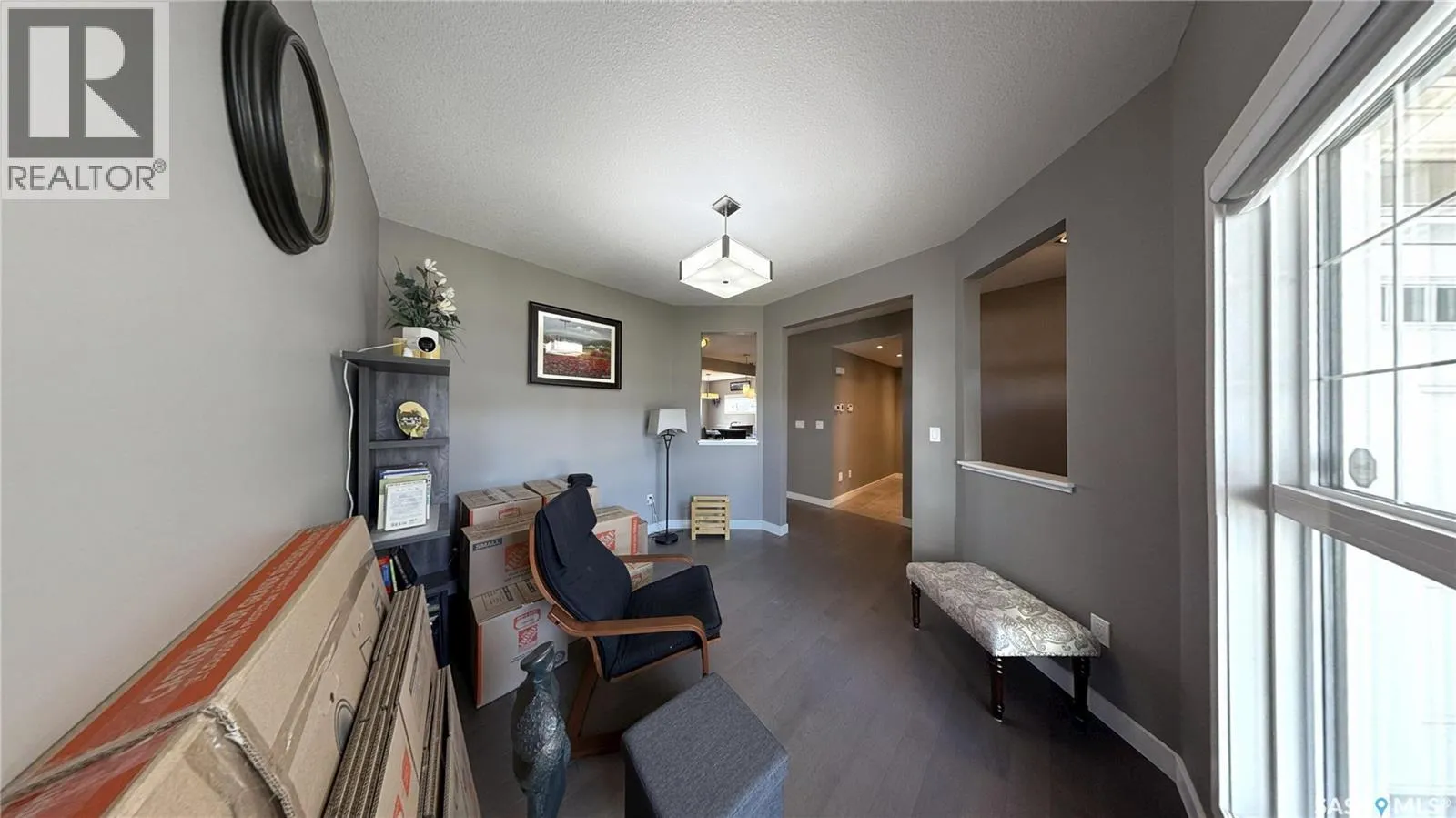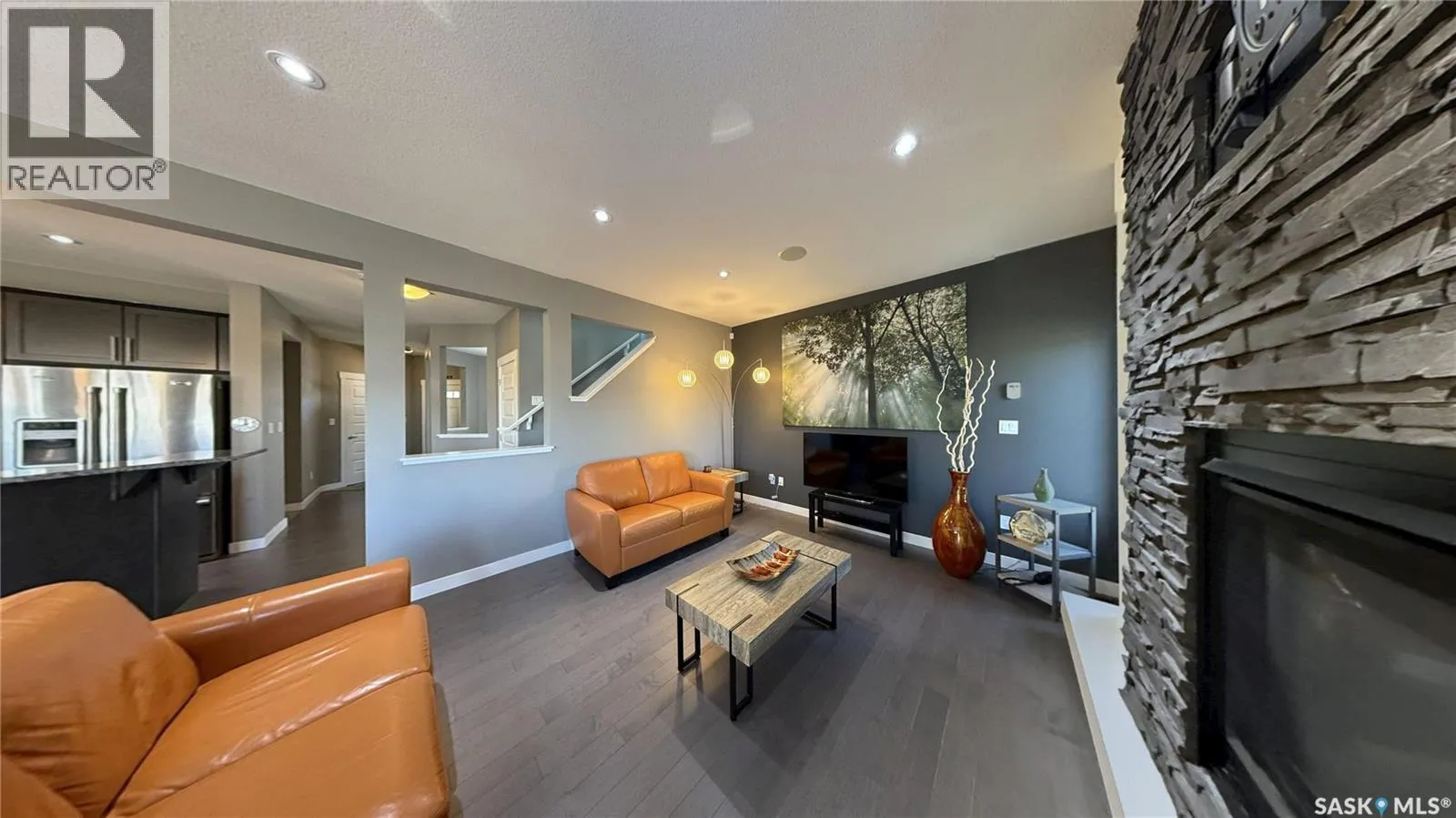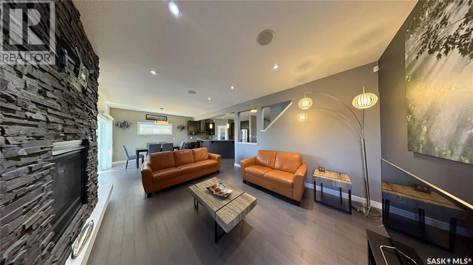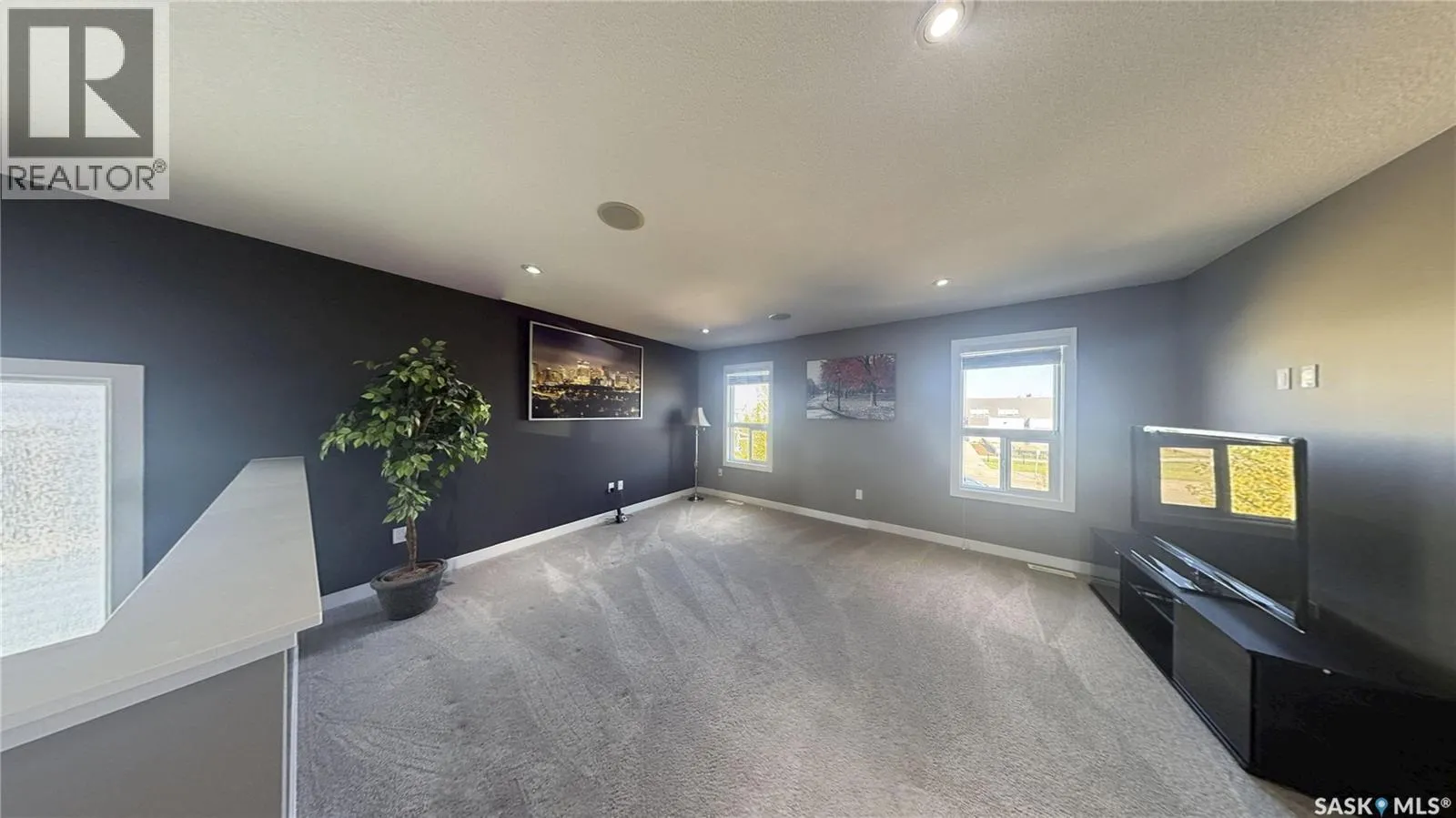 Rosewood,Saskatoon Experience elevated living in this exquisitely crafted executive CUSTOM BUILT home, offering over 2,200 sq ft of impeccably designed space in Saskatoonâs prestigious ROSEWOOD community. From the striking curb appeal with turf and a covered COMPOSITE DECK entry to the show home-level finishes throughout, every detail exudes LUXURY. The main floor features rich HARDWOOD FLOORS, 9 FEET ceilings, a private DEN, designer powder room, and stainless steel appliances equipped kitchen with GRANITE COUNTERTOPS, SOFT-CLOSE SUPERIOR CABINETRY, walk-in pantry, and a TWO-TIER ISLAND. The open-concept dining and living areas flow to a composite deck and professionally landscaped yard backing onto both Public and Catholic schools. Upstairs, retreat to a vaulted-ceiling PRIMARY BEDROOM with a 5 piece ensuite and walk-in closet. Comfort of a Laundry area with storage on 2nd floor next to Primary bedroom. Central Vac system. THREE ADDITIONAL BEDROOMS on the second level, a stylish main bath (DOUBLE VANITY), bonus room, and upper laundry. The fully developed basement includes a sound-insulated home theatre wired for projector and surround sound, a bedroom, 4 Piece bath, gym/flex space, and extensive storage The Basement has new upgraded carpet installed. With central A/C, built-in speakers, triple-pane windows, Hunter Douglas blinds, a fully finished oversized garage, and high-end upgrades throughout, this move-in-ready home is an opportunity for those who demand comfort, function, and refined designâall in one. Buyers & Buyers' Realtor® to verify all measurements (id:27476)