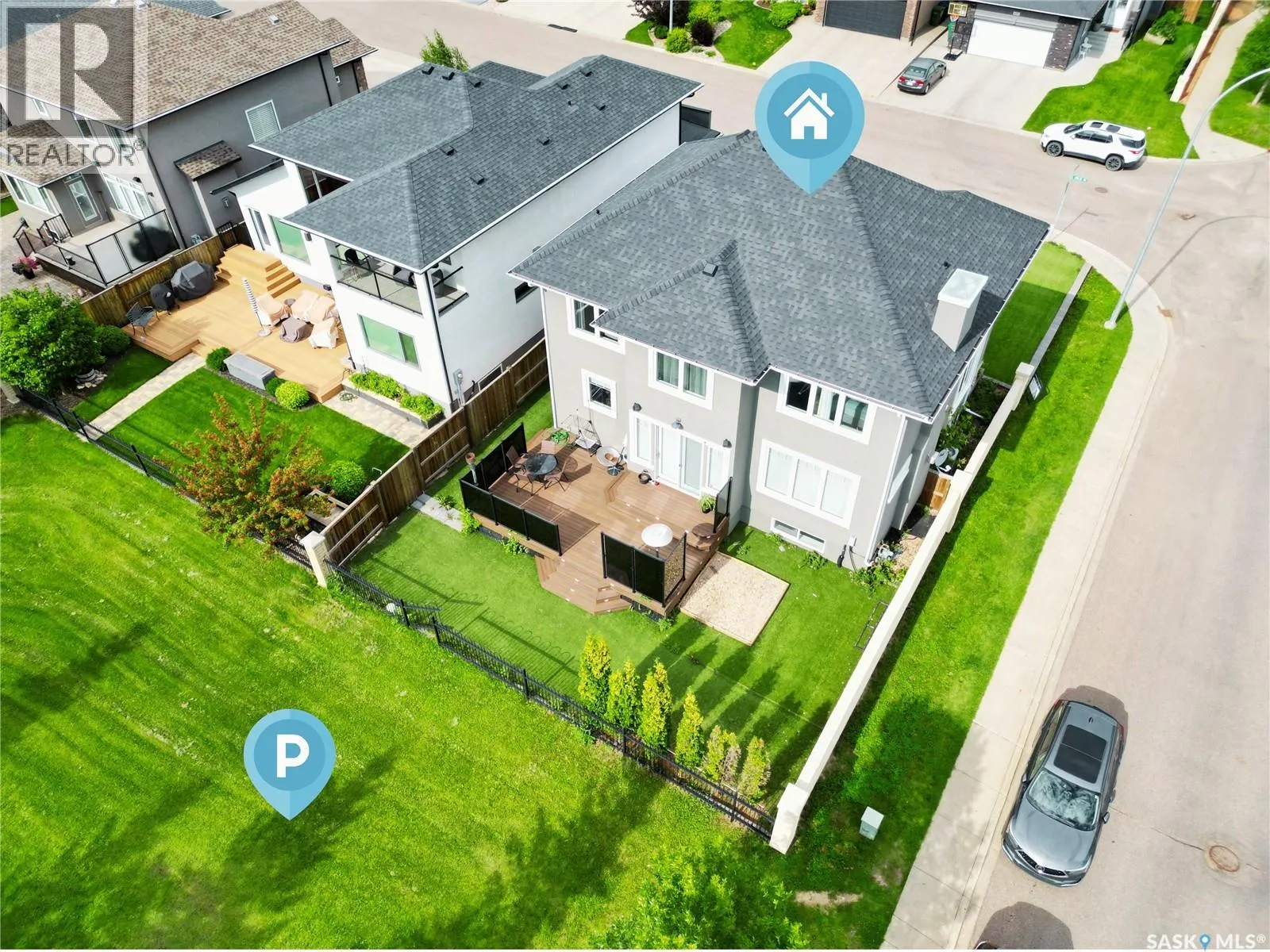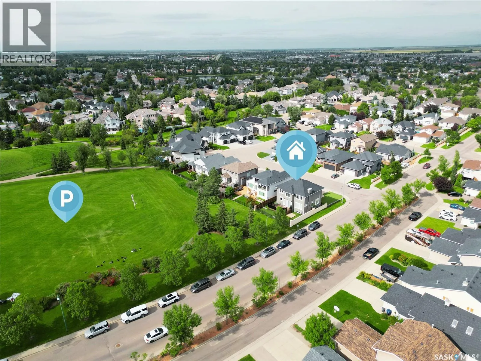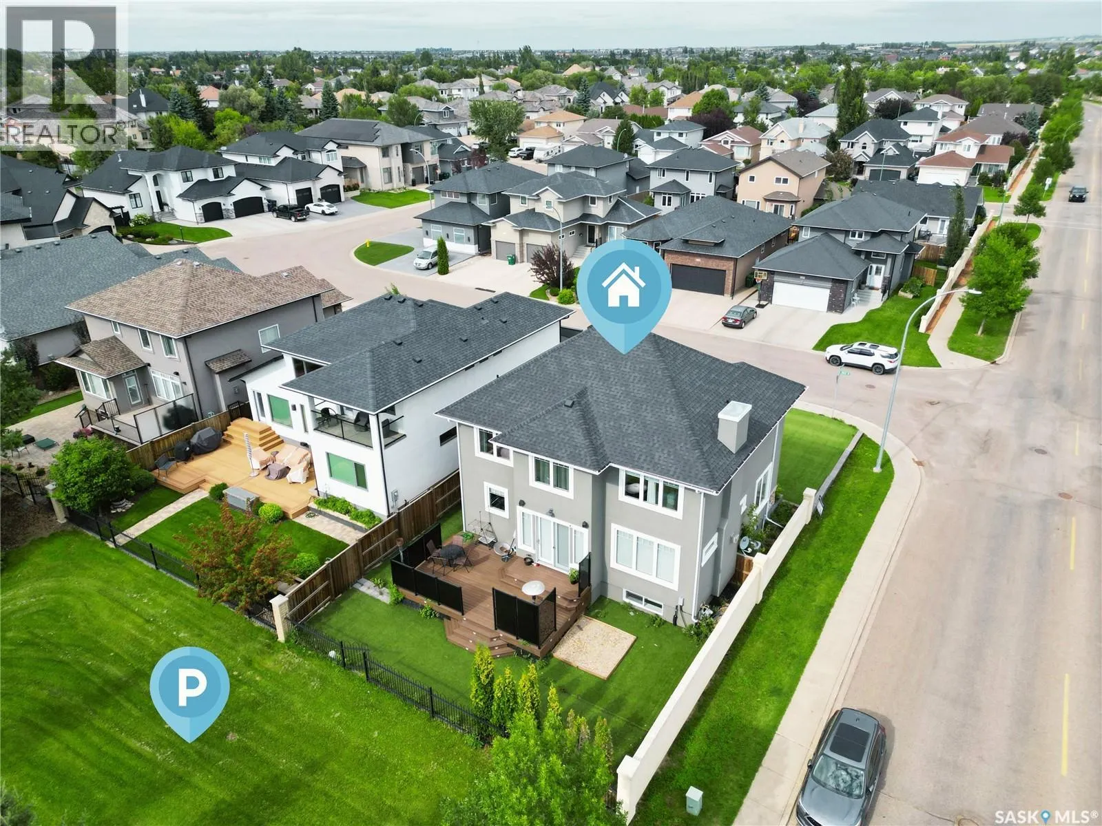 Welcome to this beautifully designed 2,434 sq. ft. two-storey home, custom built by Valentino Homes, offering timeless elegance, high-end finishes, and a premium location backing directly onto Arbor Creek Park. Upon entry, you are greeted by 9-foot ceilings, solid 8-foot core interior doors, Restoration Hardware lighting, and an abundance of natural light flowing through wide windows. The open-concept main floor showcases a spacious living room with a natural gas fireplace and custom cabinetry, seamlessly connected to the dining area and a stunning white kitchen featuring quartz countertops, island with seating, corner pantry, and premium JennAir appliances. A main floor office with French doors, a powder room, and a functional mudroom with direct access to the heated 24x25 double garage (10â ceiling) complete this level. Upstairs, the luxurious primary suite offers a walk-in closet the size of a room and a spa-like ensuite with heated tile floors, dual vanities, an oversized walk-in shower, and private water closet. Two additional large bedrooms with park views and hardwood floors, a 4-piece bath, and a bright laundry room with a window provide comfort and convenience for family living. The fully finished basement is designed for entertainment and relaxation, featuring a massive family room with projection screen, custom wet bar, a fourth bedroom, full bathroom, and plenty of storage space. Additional highlights include hand-scraped hardwood floors, built-in audio with Control4 system, custom blinds, and 9-foot ceilings on all three levels. The low-maintenance south/west-facing backyard offers private gated access to Arbor Creek Park, making it perfect for peaceful walks and enjoying stunning views year-round. This is an exceptional opportunity to own a truly remarkable home in one of Saskatoonâs most desirable neighborhoods. (id:27476)