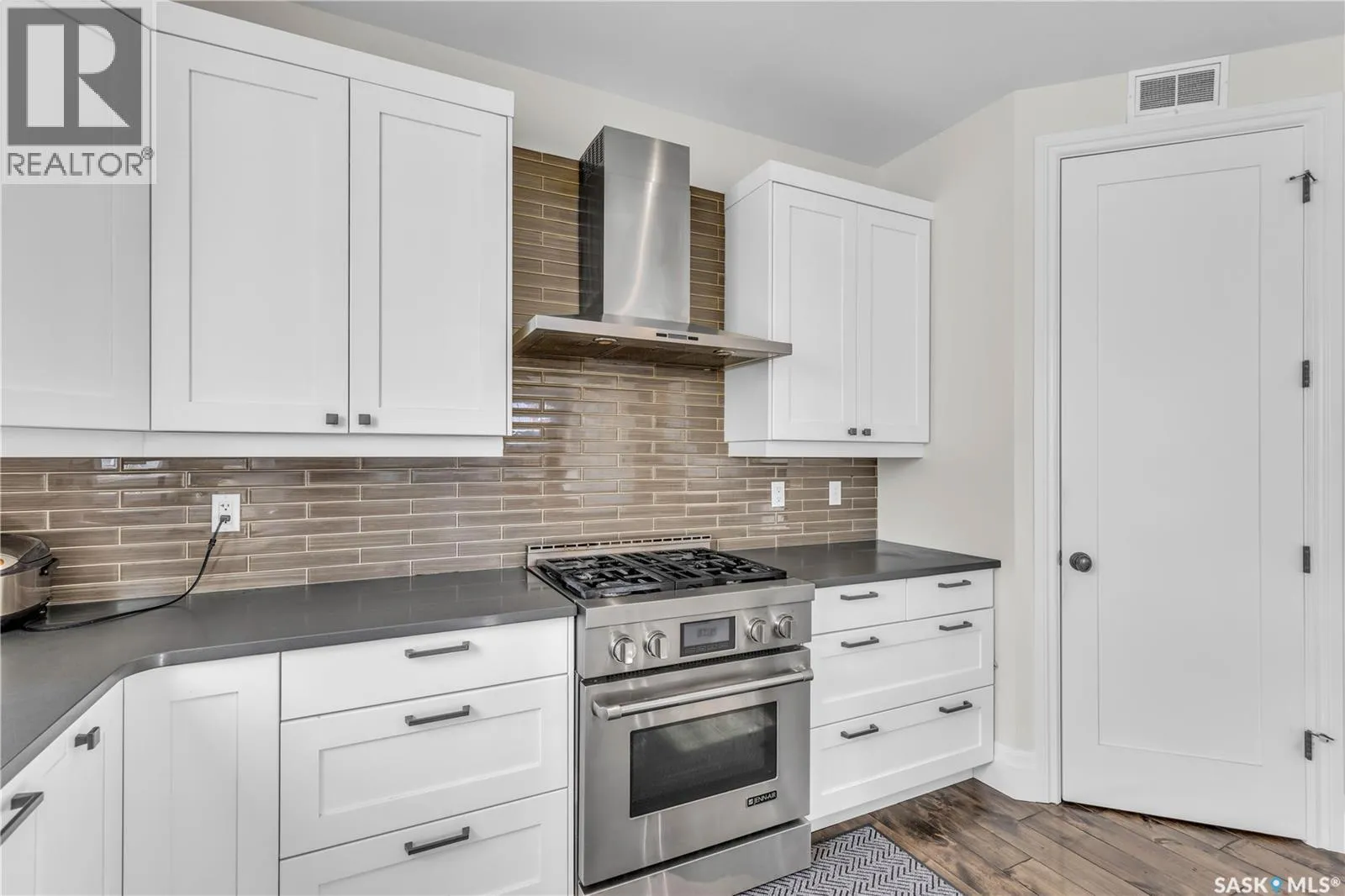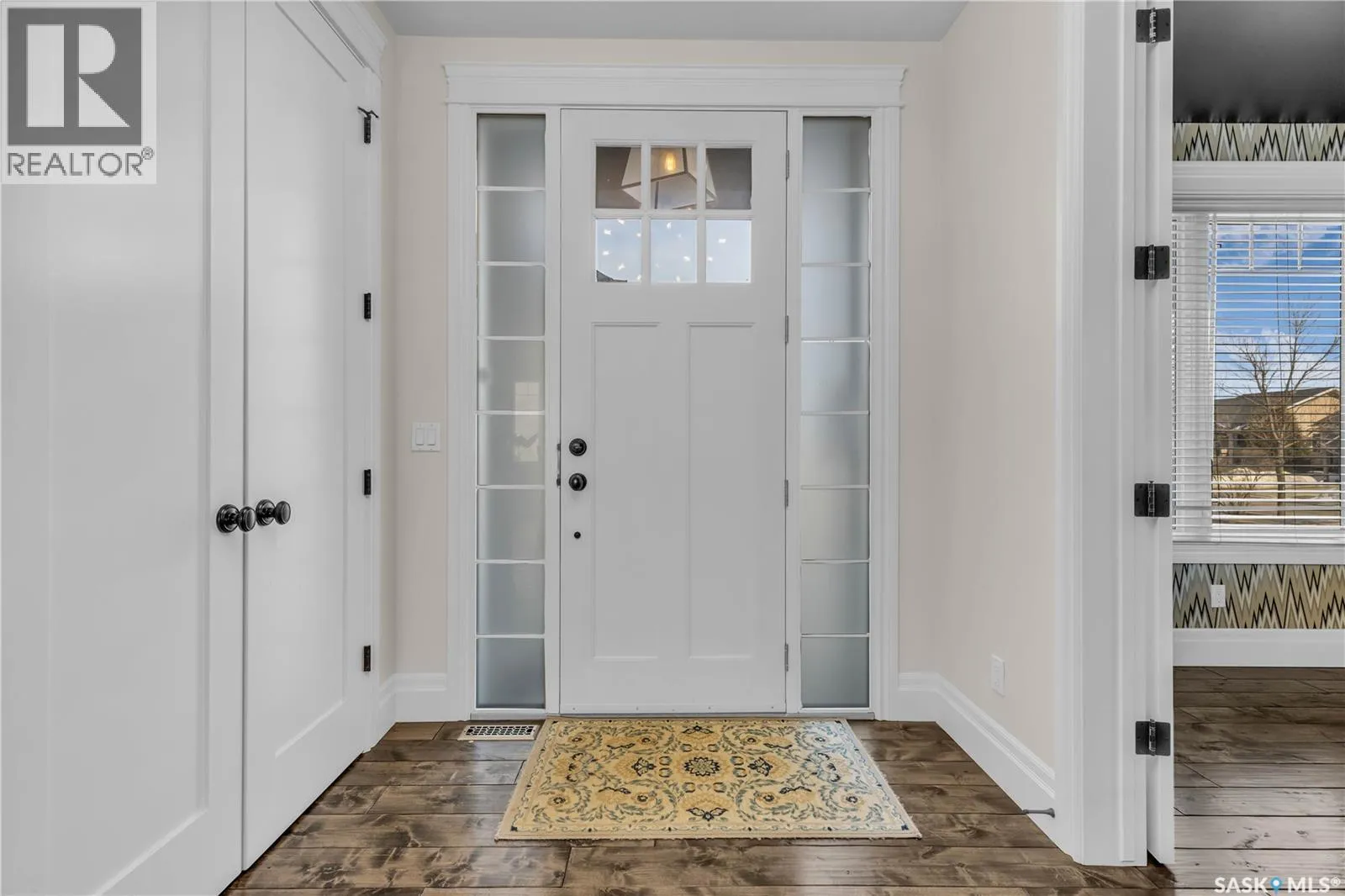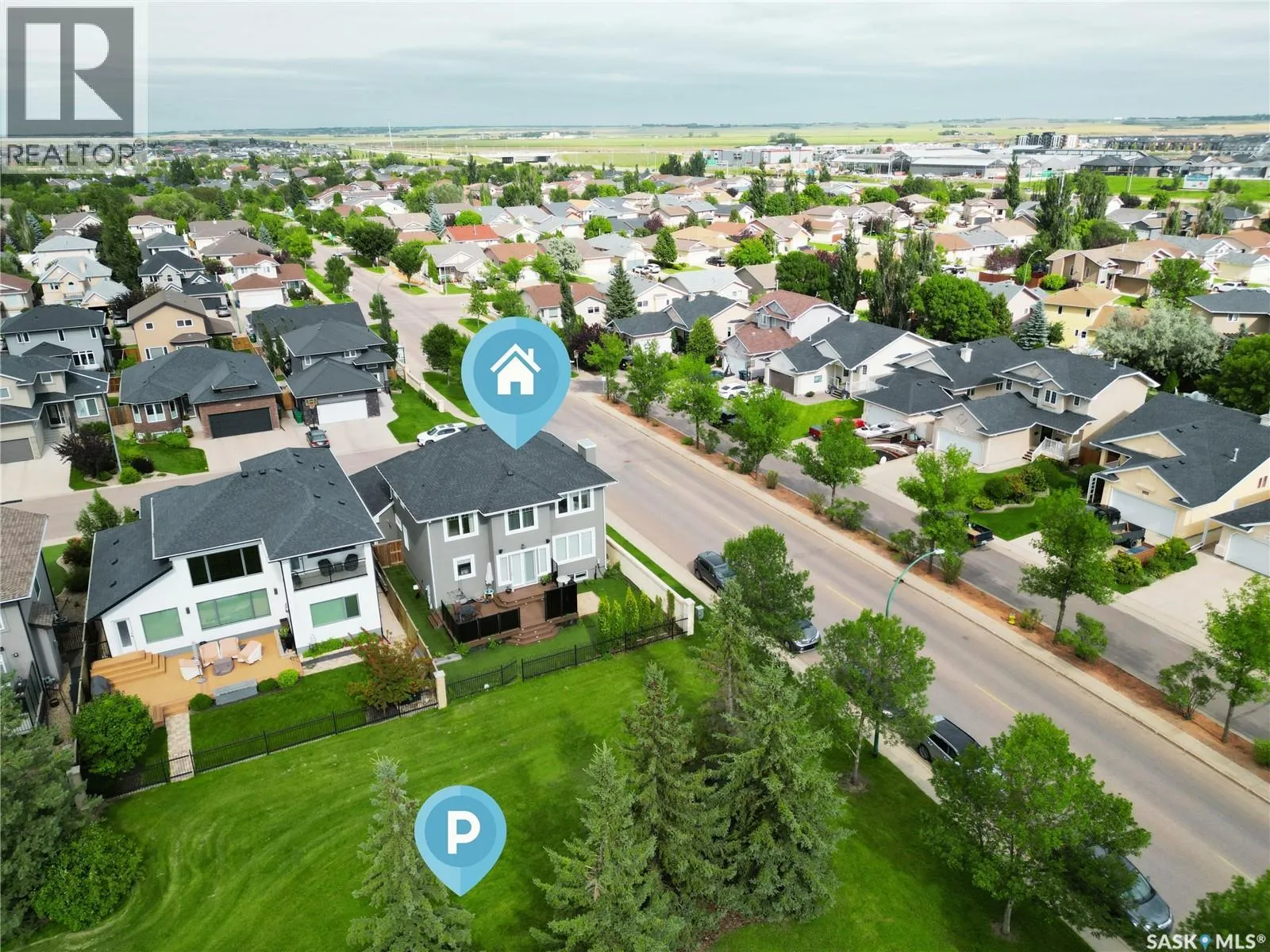 Welcome to this beautifully designed 2,434 sq. ft. two-storey home, custom built by Valentino Homes, offering timeless elegance, high-end finishes, and a premium location backing directly onto Arbor Creek Park. Upon entry, you are greeted by 9-foot ceilings, solid 8-foot core interior doors, Restoration Hardware lighting, and an abundance of natural light flowing through wide windows. The open-concept main floor showcases a spacious living room with a natural gas fireplace and custom cabinetry, seamlessly connected to the dining area and a stunning white kitchen featuring quartz countertops, island with seating, corner pantry, and premium JennAir appliances. A main floor office with French doors, a powder room, and a functional mudroom with direct access to the heated 24x25 double garage (10â ceiling) complete this level. Upstairs, the luxurious primary suite offers a walk-in closet the size of a room and a spa-like ensuite with heated tile floors, dual vanities, an oversized walk-in shower, and private water closet. Two additional large bedrooms with park views and hardwood floors, a 4-piece bath, and a bright laundry room with a window provide comfort and convenience for family living. The fully finished basement is designed for entertainment and relaxation, featuring a massive family room with projection screen, custom wet bar, a fourth bedroom, full bathroom, and plenty of storage space. Additional highlights include hand-scraped hardwood floors, built-in audio with Control4 system, custom blinds, and 9-foot ceilings on all three levels. The low-maintenance south/west-facing backyard offers private gated access to Arbor Creek Park, making it perfect for peaceful walks and enjoying stunning views year-round. This is an exceptional opportunity to own a truly remarkable home in one of Saskatoonâs most desirable neighborhoods. (id:27476)