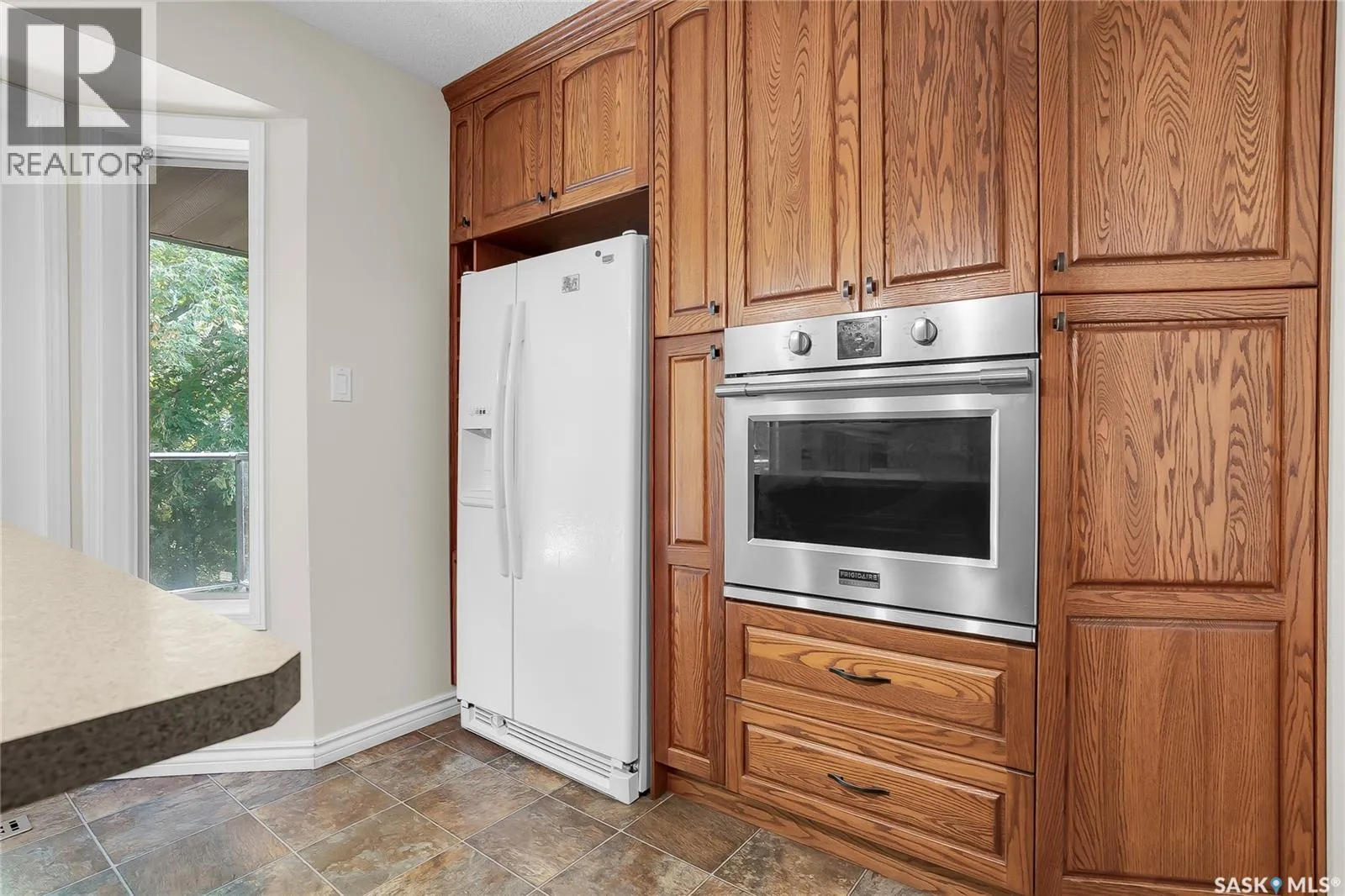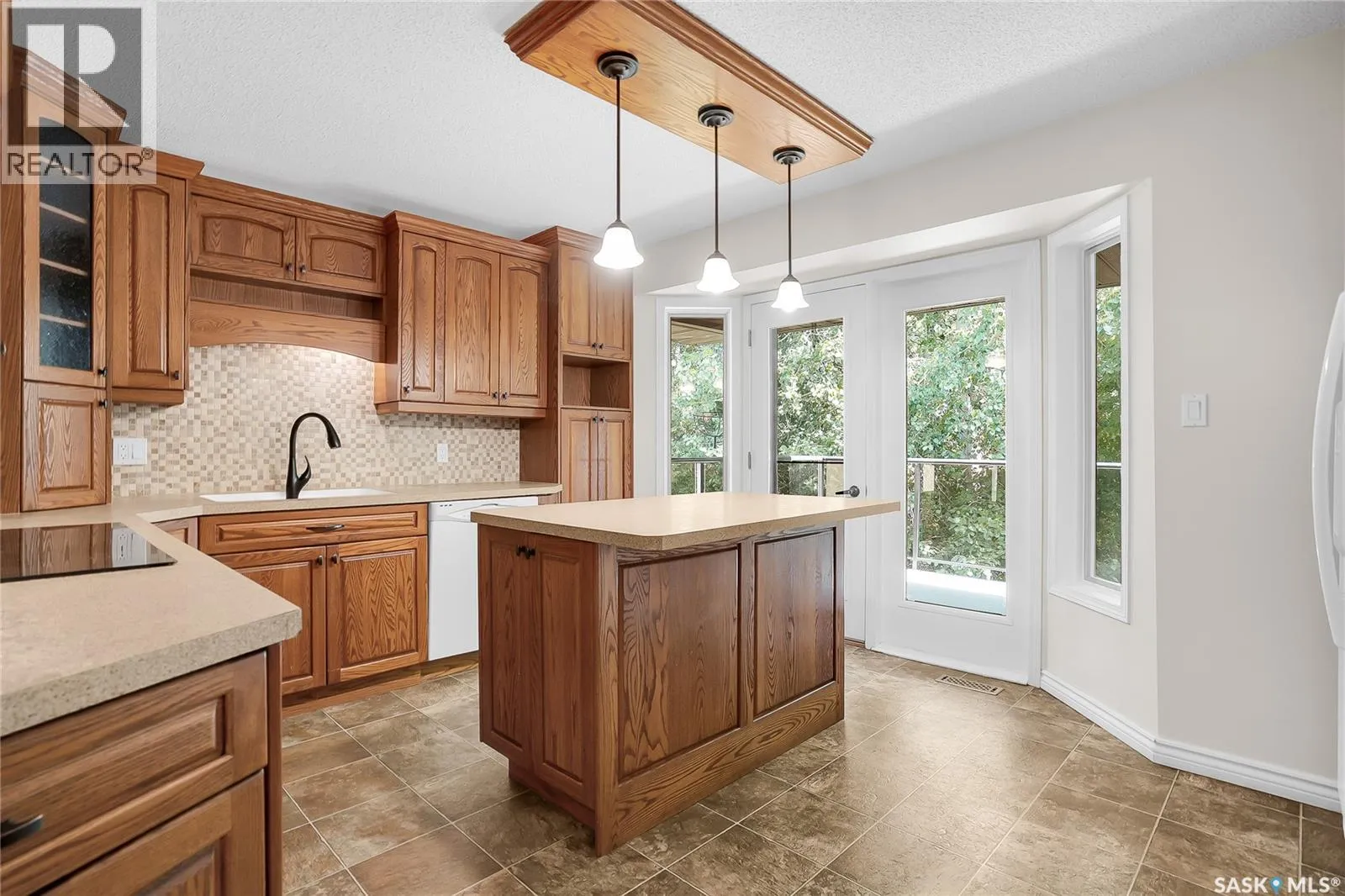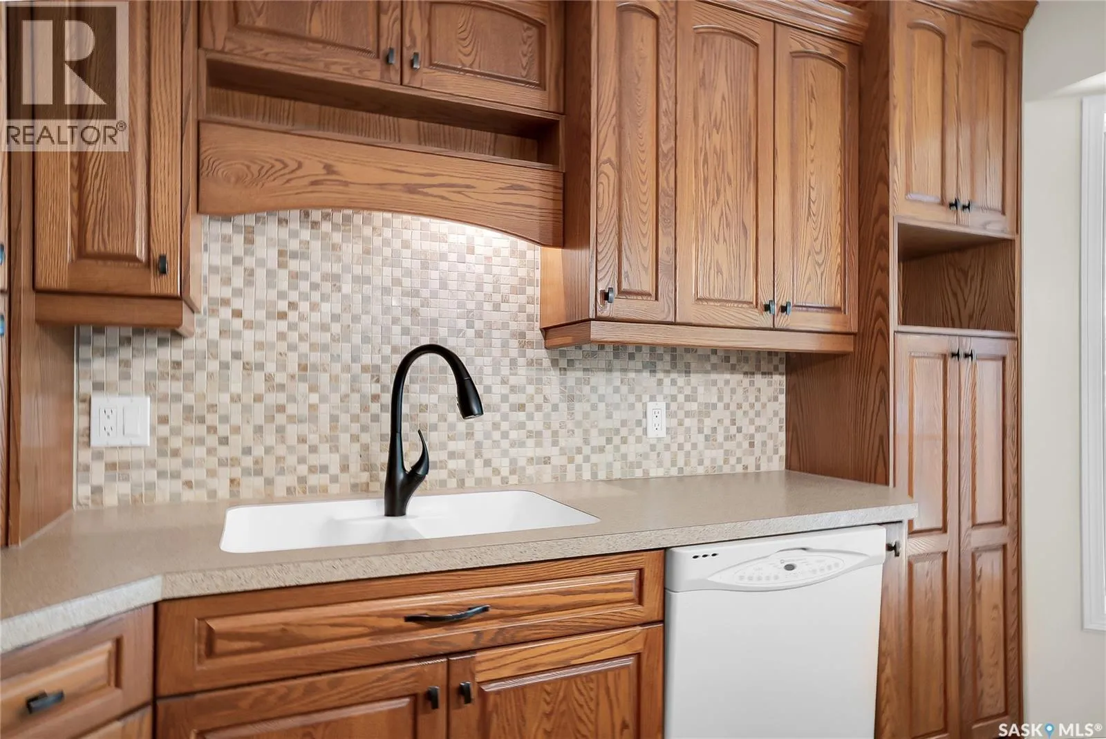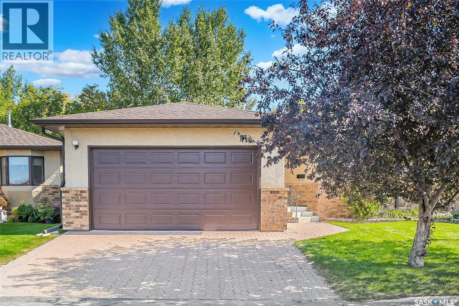 Woah! Stop the car! A walk out bungalow condo with a 2 car garage in a gated community? YES! This is a 1,488 sq. ft. stunner offering the kind of quiet, secure lifestyle that people wait years to find. Once inside the gates youâll discover a welcoming environment that feels more like a private retreat than just a development. A true highlight of this property is the full-sized 20x20 double garage, a rare and highly valued feature in condo living. Inside, the main floor is designed for ease and comfort, complete with main floor laundry, an updated, meticulously cared for oak kitchen, and thoughtful upgrades including a newer wall oven, exterior venting range hood, central vac, and water softener. The oversized deck off the kitchen has been recently resurfaced, offering an exceptional outdoor space with natural gas hookups for a BBQ or fire table which is perfect for entertaining or simply enjoying the serenity of your surroundings in bliss filled privacy. The spacious walkout basement opens directly to a lush green backdrop of mature trees and Meadowlark Park, creating a natural extension of your living space. A gas fireplace warms the basement family room on cooler evenings when company is over. The large lower-level workshop offers versatility of use for tinkering on projects or storage, plus the flexibility to take some of that space to easily divide it into an additional large bedroom with a quick wall. Living here means more than just a beautiful home, itâs about the lifestyle. A peaceful community where neighbours value privacy, security and a sense of belonging, all while enjoying convenient access to Circle Drive, shopping, dining, and essential services nearby. This is where comfort, convenience, and exclusivity decide to call home and it's ready for you. (id:27476)
