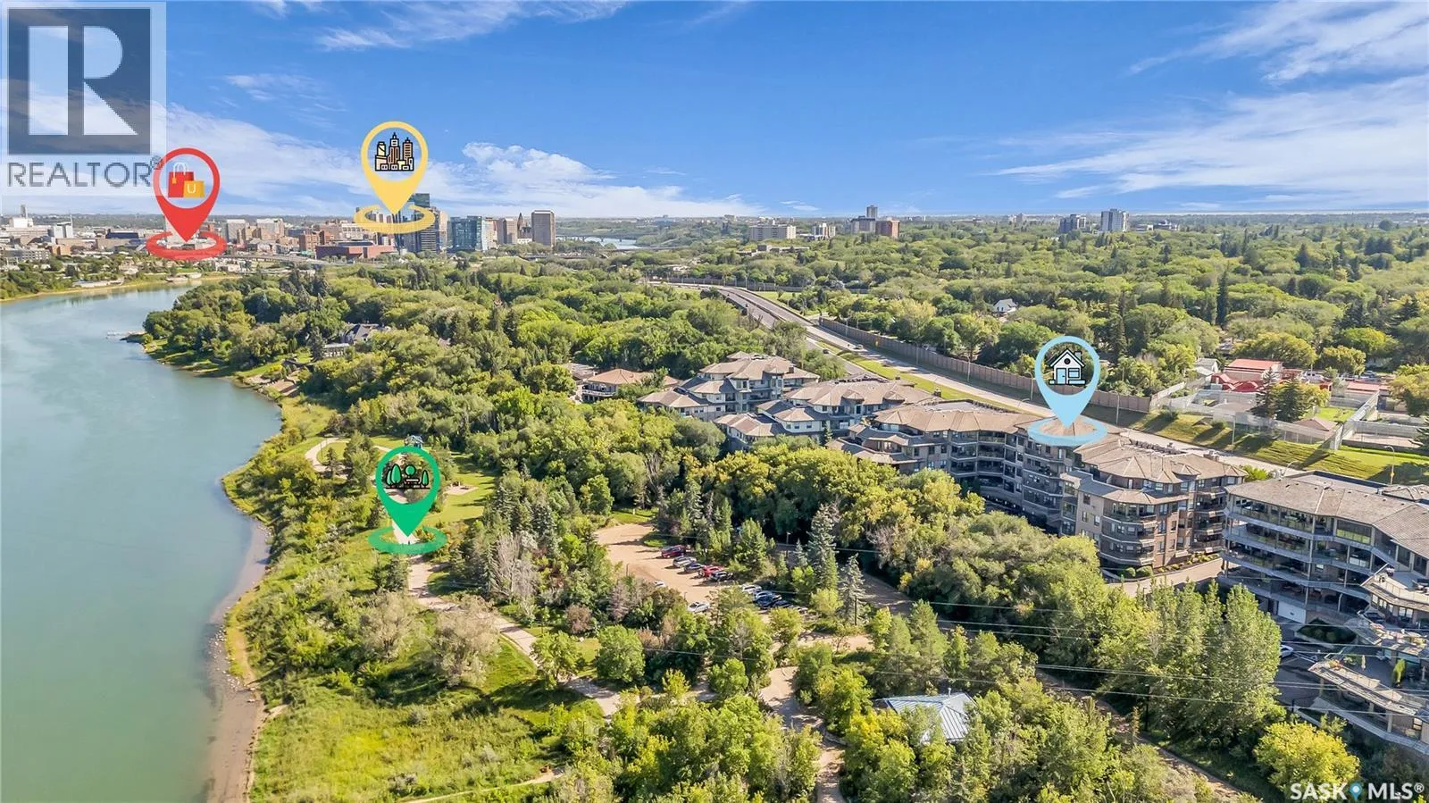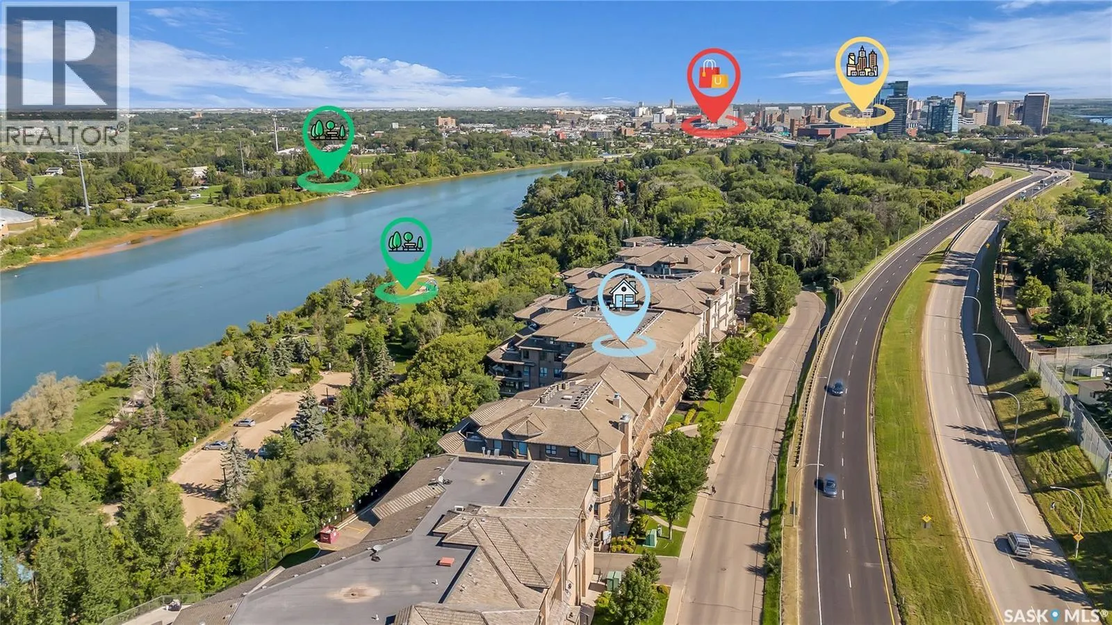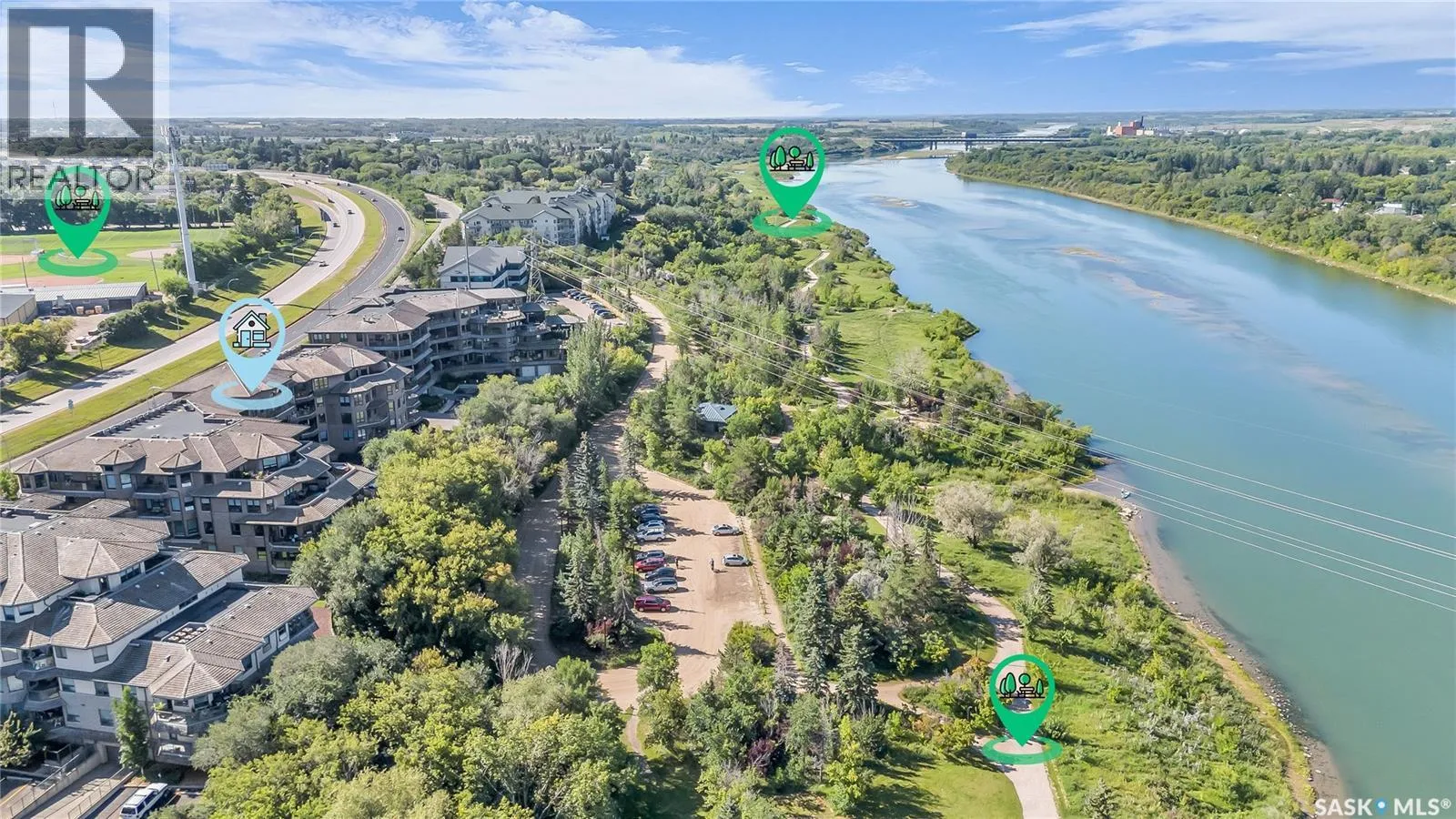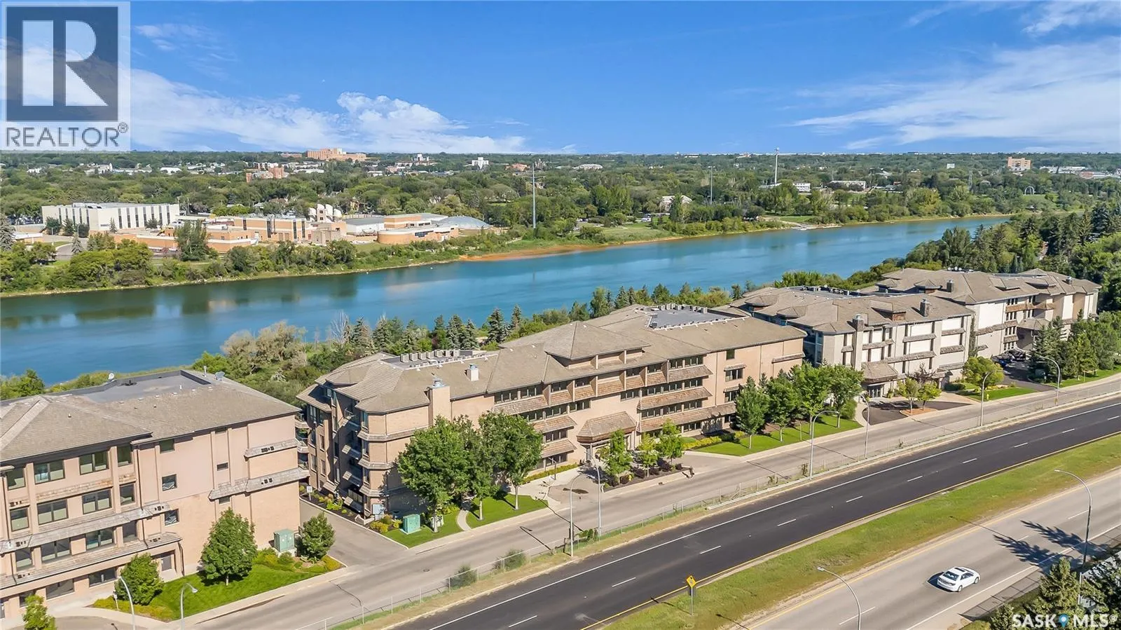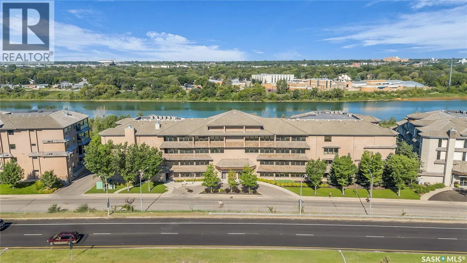 Experience the perfect blend of luxury, comfort, and convenience in this beautifully appointed condo at Waters Edge I, nestled along Saskatchewan Crescent West. Perfectly situated along the river, this home welcomes you with an open-concept design featuring a spacious kitchen with island, a dining area that flows seamlessly into the living room, and access to a southwest-facing balcony. Hardwood floors extend through the kitchen, dining, and living area, creating warmth and elegance throughout. The thoughtfully designed layout includes two bedrooms, a four-piece main bathroom, and a private three-piece ensuite off the primary bedroom with 2 large closets. Just off the kitchen, youâll find in-suite laundry with plenty of extra storage. There is an underground parking space with a storage unit directly in front of the stall. Residents enjoy the convenience of underground parking, elevator access, and a host of impressive building amenities including an exercise room, meeting room with kitchenette, pool table, foosball and guest suite. Steps from the Meewasin Valley Trail and within walking distance to Gabriel Dumont and Fred Mitchell Parks, this location offers the best of both worldsâeasy access to nature and the downtown core. Please note, pets are not permitted. (id:27476)