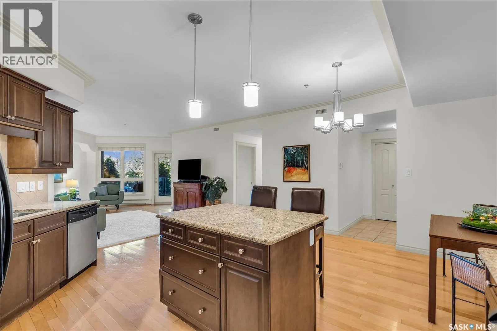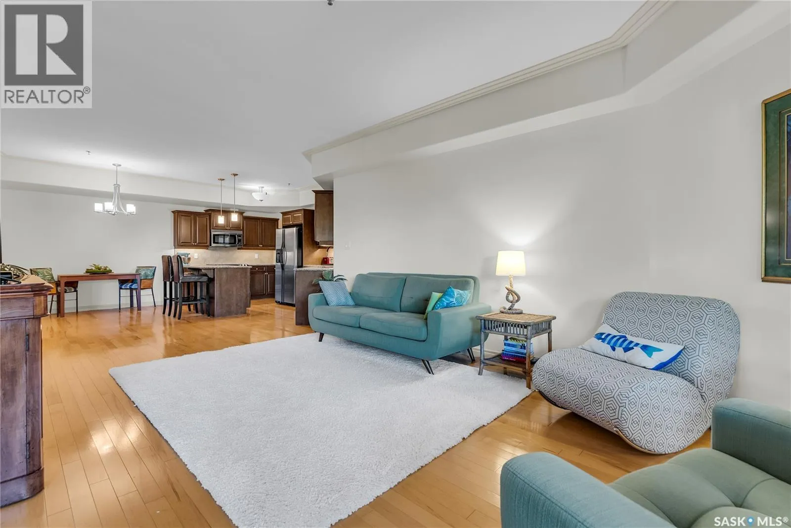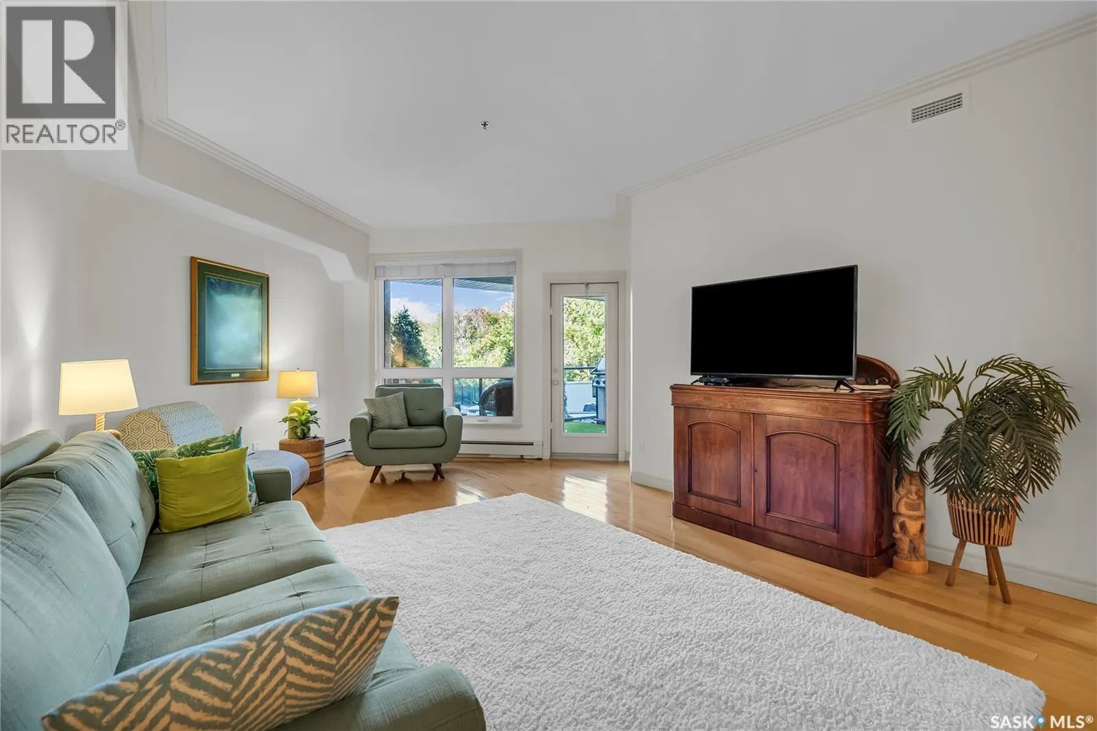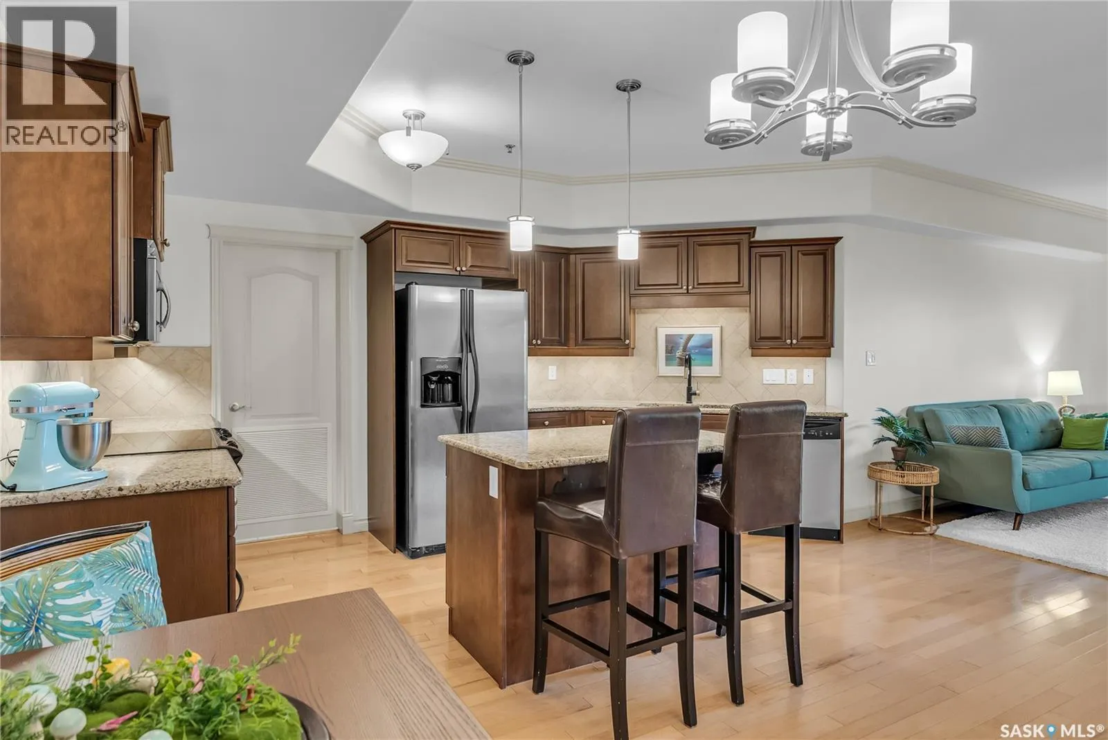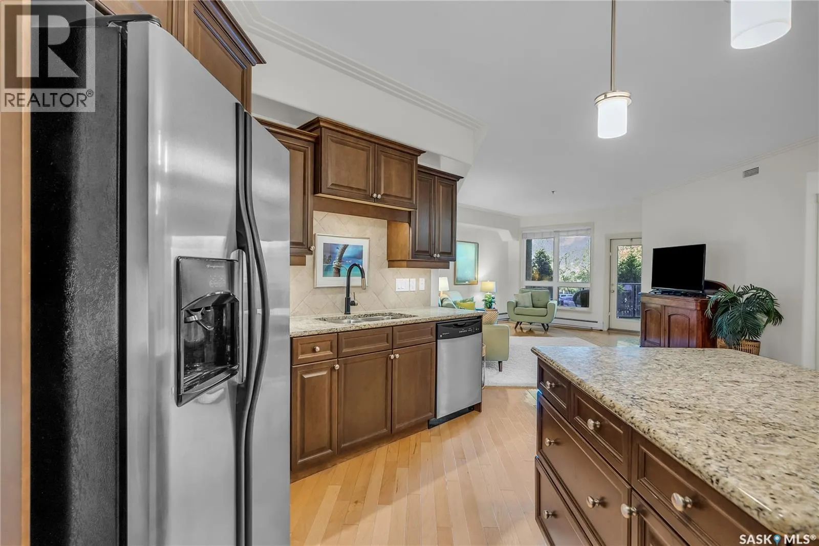 Experience the perfect blend of luxury, comfort, and convenience in this beautifully appointed condo at Waters Edge I, nestled along Saskatchewan Crescent West. Perfectly situated along the river, this home welcomes you with an open-concept design featuring a spacious kitchen with island, a dining area that flows seamlessly into the living room, and access to a southwest-facing balcony. Hardwood floors extend through the kitchen, dining, and living area, creating warmth and elegance throughout. The thoughtfully designed layout includes two bedrooms, a four-piece main bathroom, and a private three-piece ensuite off the primary bedroom with 2 large closets. Just off the kitchen, youâll find in-suite laundry with plenty of extra storage. There is an underground parking space with a storage unit directly in front of the stall. Residents enjoy the convenience of underground parking, elevator access, and a host of impressive building amenities including an exercise room, meeting room with kitchenette, pool table, foosball and guest suite. Steps from the Meewasin Valley Trail and within walking distance to Gabriel Dumont and Fred Mitchell Parks, this location offers the best of both worldsâeasy access to nature and the downtown core. Please note, pets are not permitted. (id:27476)