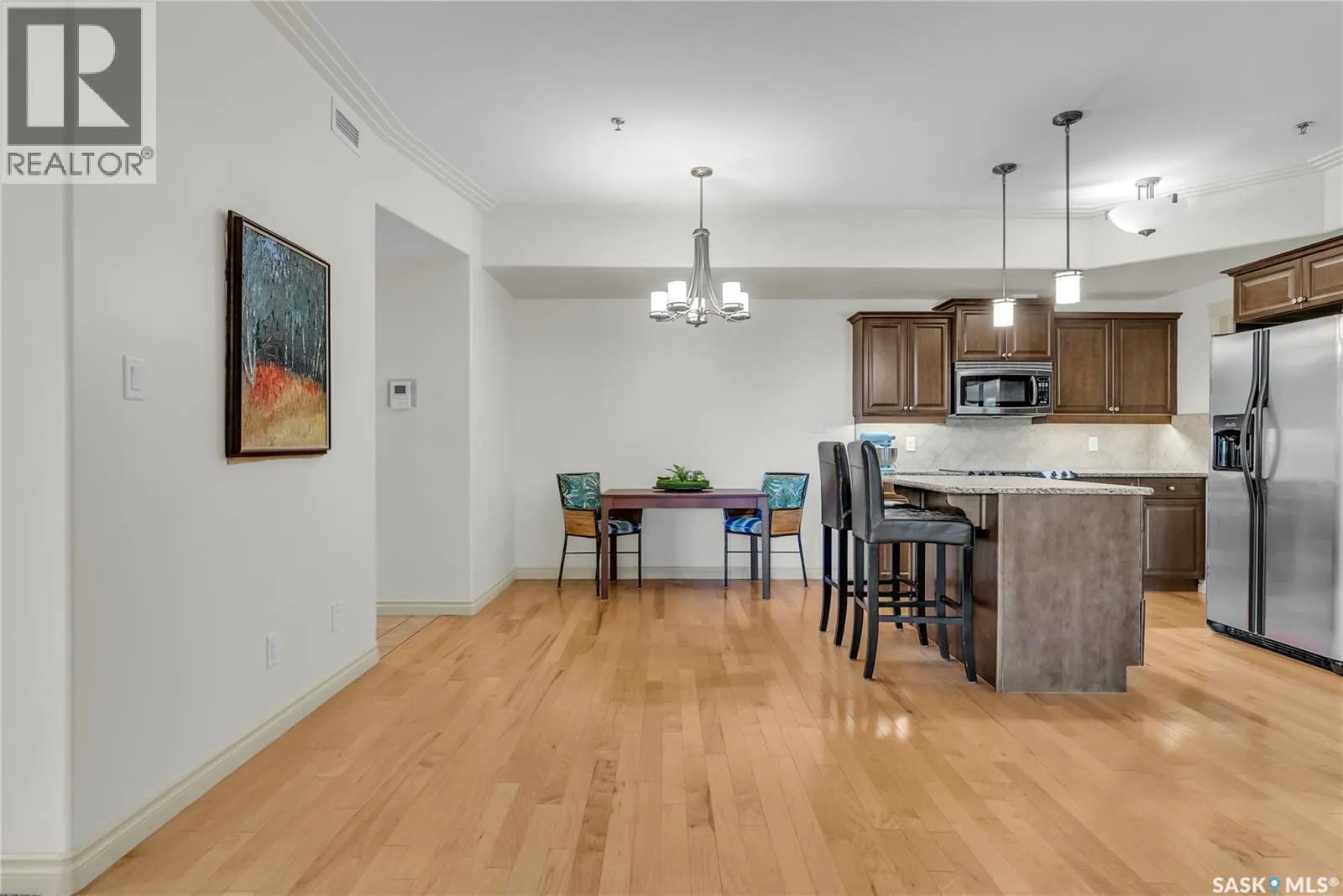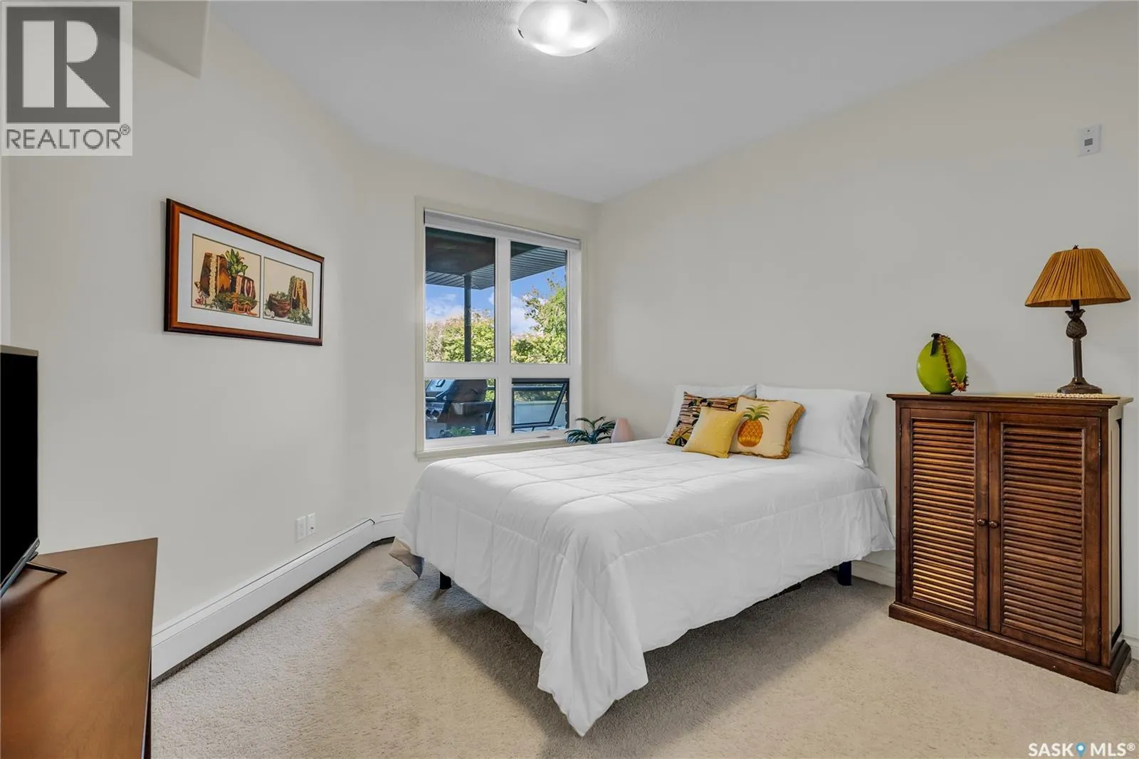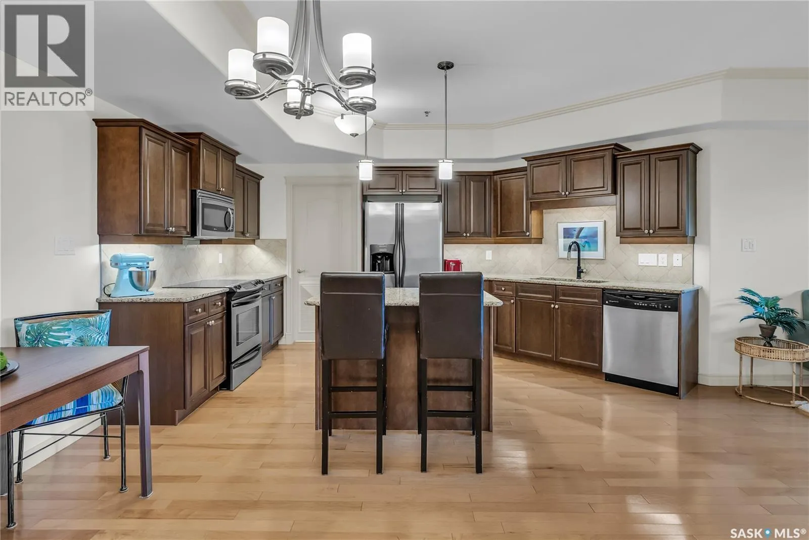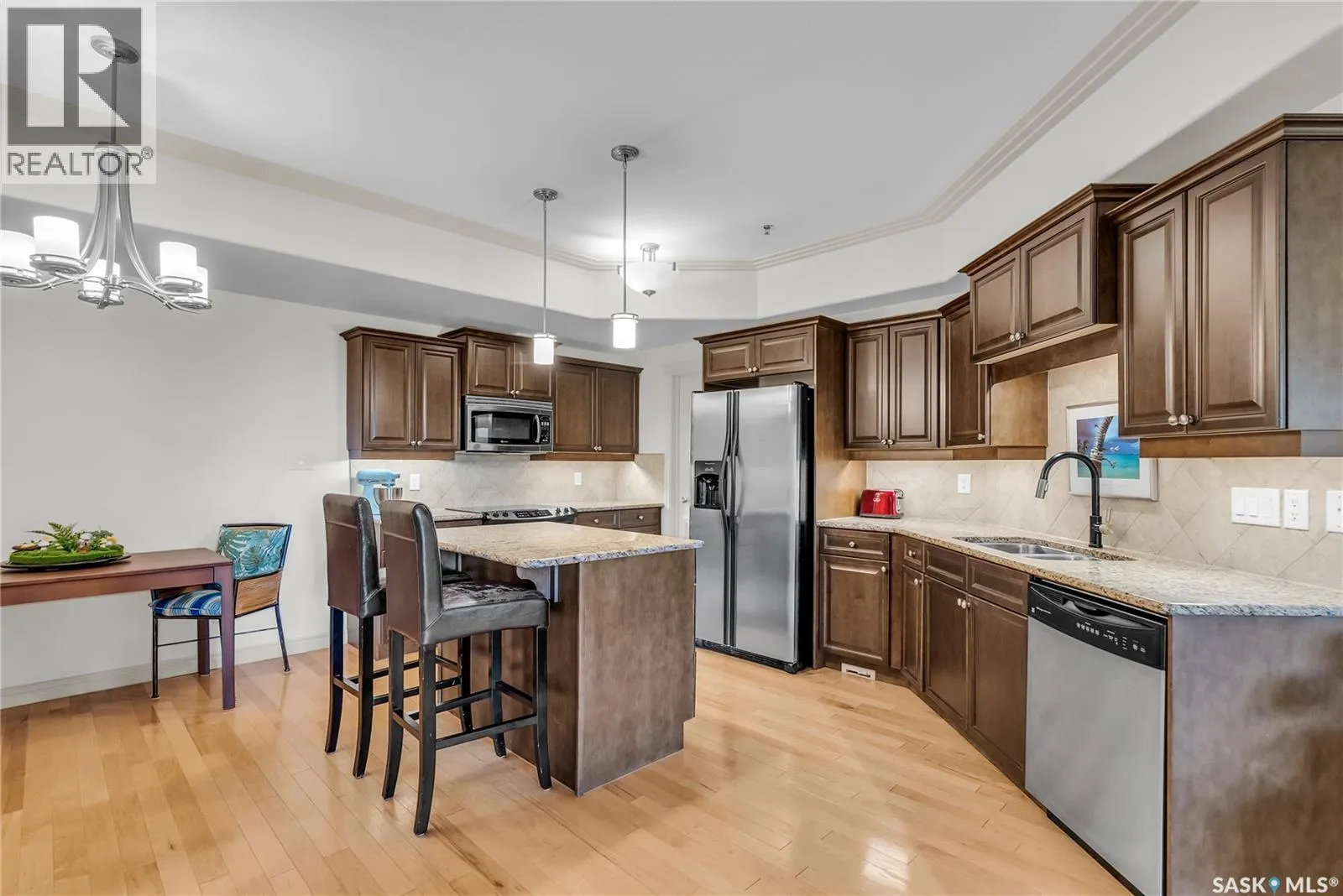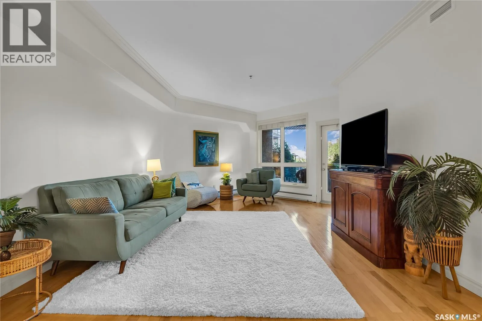 Experience the perfect blend of luxury, comfort, and convenience in this beautifully appointed condo at Waters Edge I, nestled along Saskatchewan Crescent West. Perfectly situated along the river, this home welcomes you with an open-concept design featuring a spacious kitchen with island, a dining area that flows seamlessly into the living room, and access to a southwest-facing balcony. Hardwood floors extend through the kitchen, dining, and living area, creating warmth and elegance throughout. The thoughtfully designed layout includes two bedrooms, a four-piece main bathroom, and a private three-piece ensuite off the primary bedroom with 2 large closets. Just off the kitchen, youâll find in-suite laundry with plenty of extra storage. There is an underground parking space with a storage unit directly in front of the stall. Residents enjoy the convenience of underground parking, elevator access, and a host of impressive building amenities including an exercise room, meeting room with kitchenette, pool table, foosball and guest suite. Steps from the Meewasin Valley Trail and within walking distance to Gabriel Dumont and Fred Mitchell Parks, this location offers the best of both worldsâeasy access to nature and the downtown core. Please note, pets are not permitted. (id:27476)