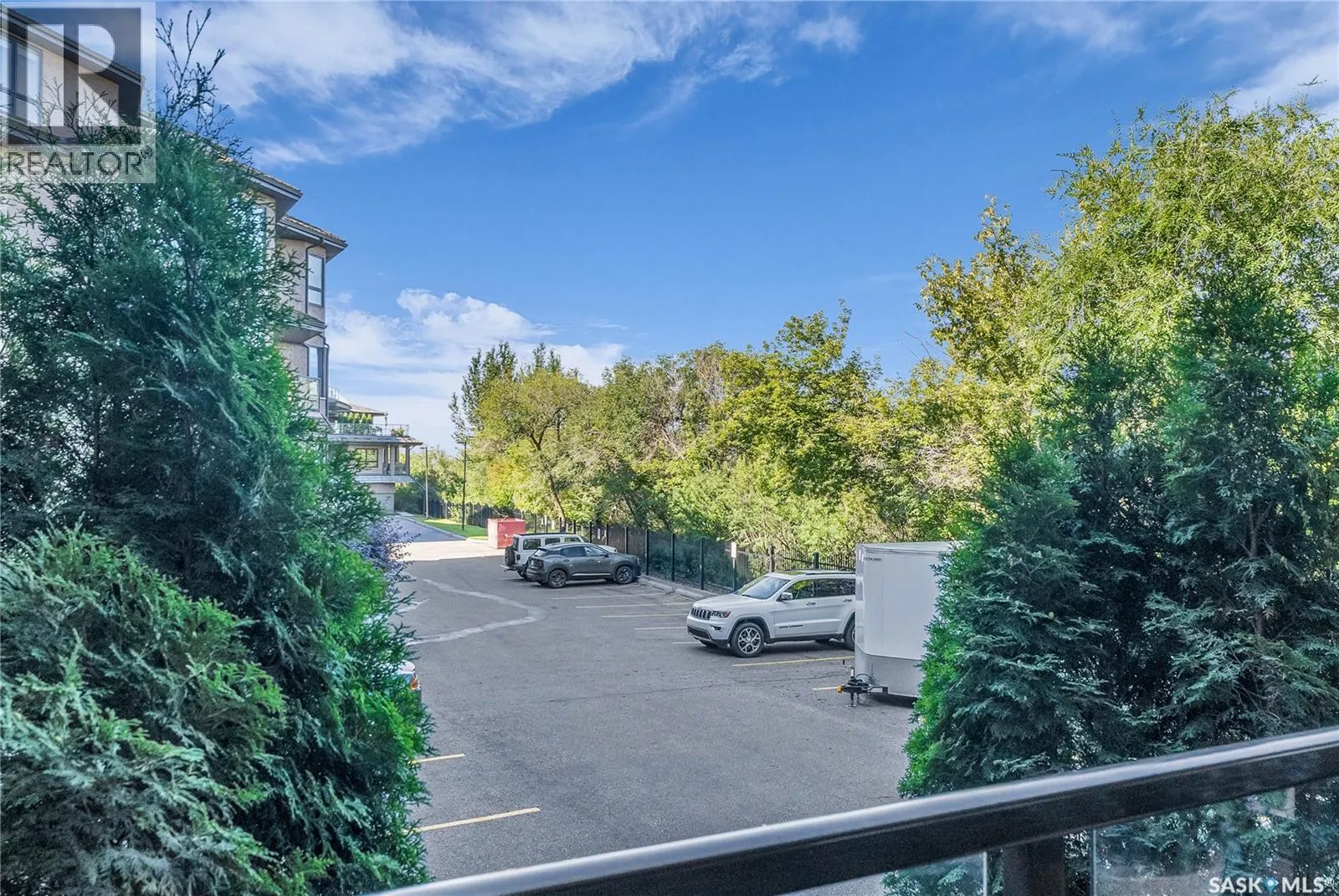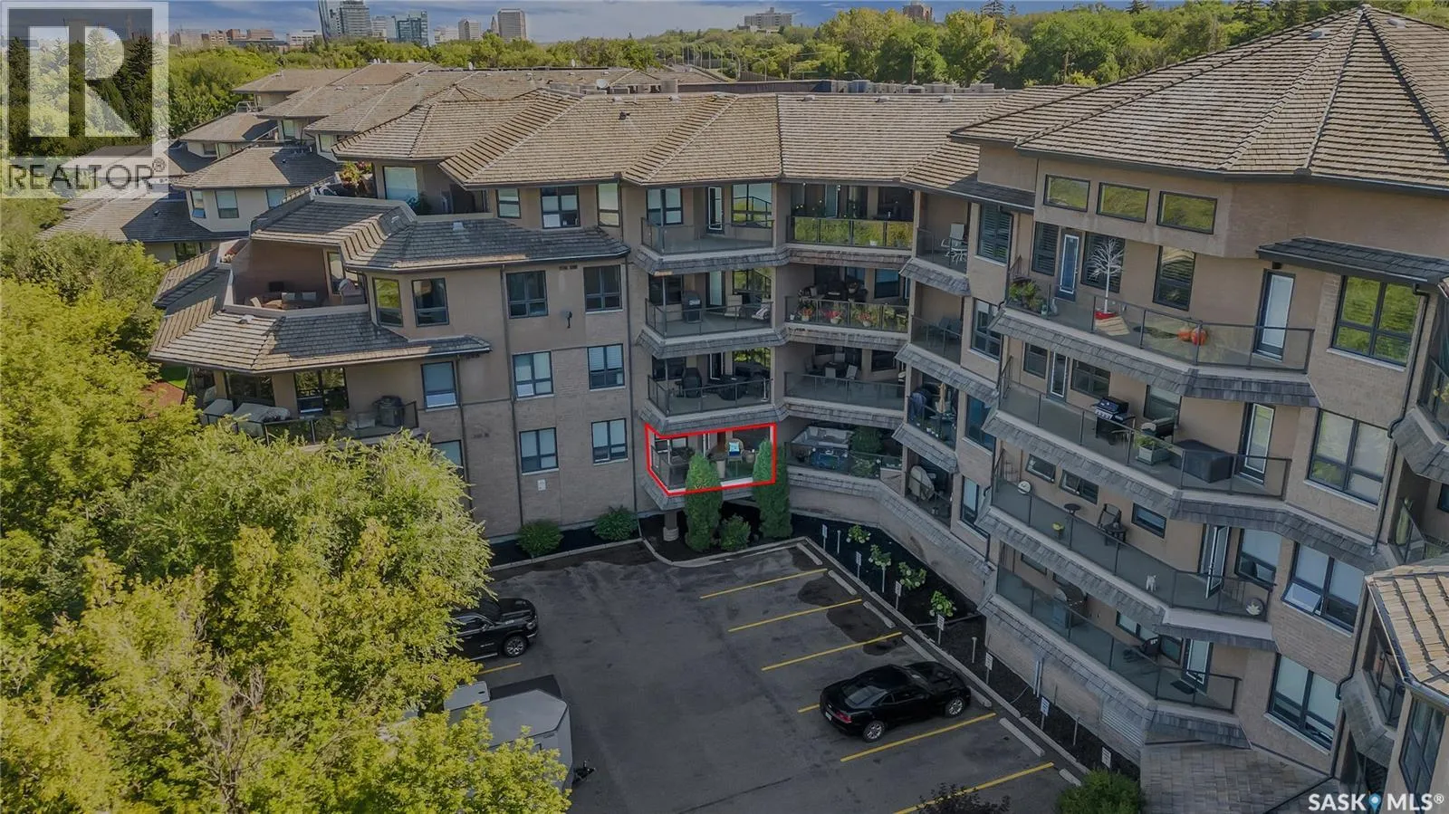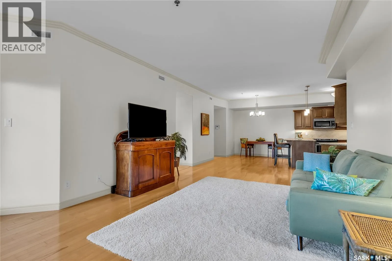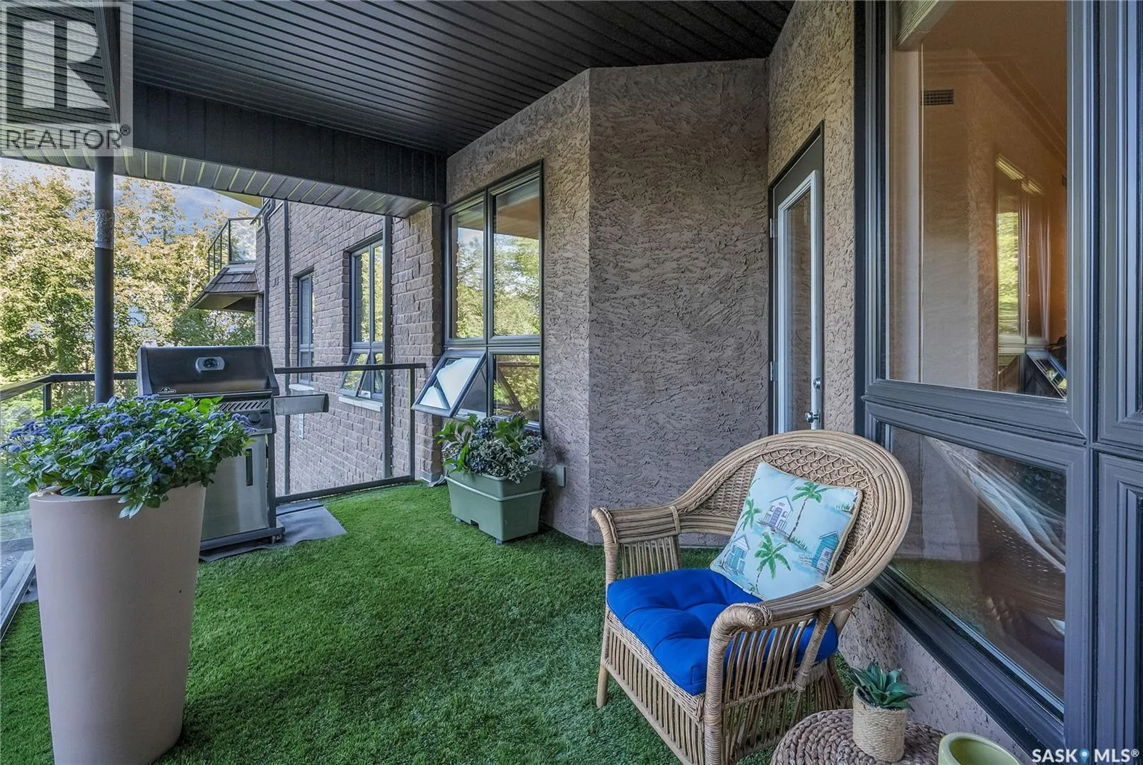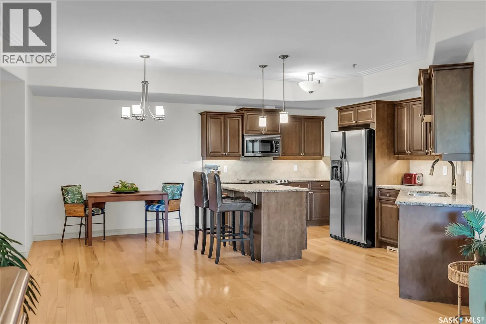 Experience the perfect blend of luxury, comfort, and convenience in this beautifully appointed condo at Waters Edge I, nestled along Saskatchewan Crescent West. Perfectly situated along the river, this home welcomes you with an open-concept design featuring a spacious kitchen with island, a dining area that flows seamlessly into the living room, and access to a southwest-facing balcony. Hardwood floors extend through the kitchen, dining, and living area, creating warmth and elegance throughout. The thoughtfully designed layout includes two bedrooms, a four-piece main bathroom, and a private three-piece ensuite off the primary bedroom with 2 large closets. Just off the kitchen, youâll find in-suite laundry with plenty of extra storage. There is an underground parking space with a storage unit directly in front of the stall. Residents enjoy the convenience of underground parking, elevator access, and a host of impressive building amenities including an exercise room, meeting room with kitchenette, pool table, foosball and guest suite. Steps from the Meewasin Valley Trail and within walking distance to Gabriel Dumont and Fred Mitchell Parks, this location offers the best of both worldsâeasy access to nature and the downtown core. Please note, pets are not permitted. (id:27476)