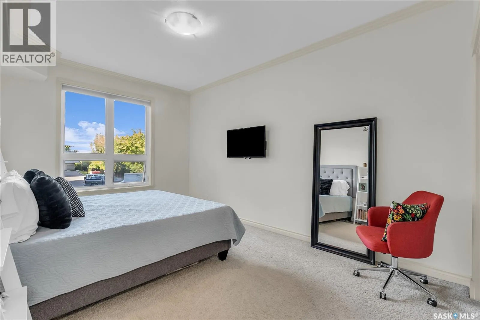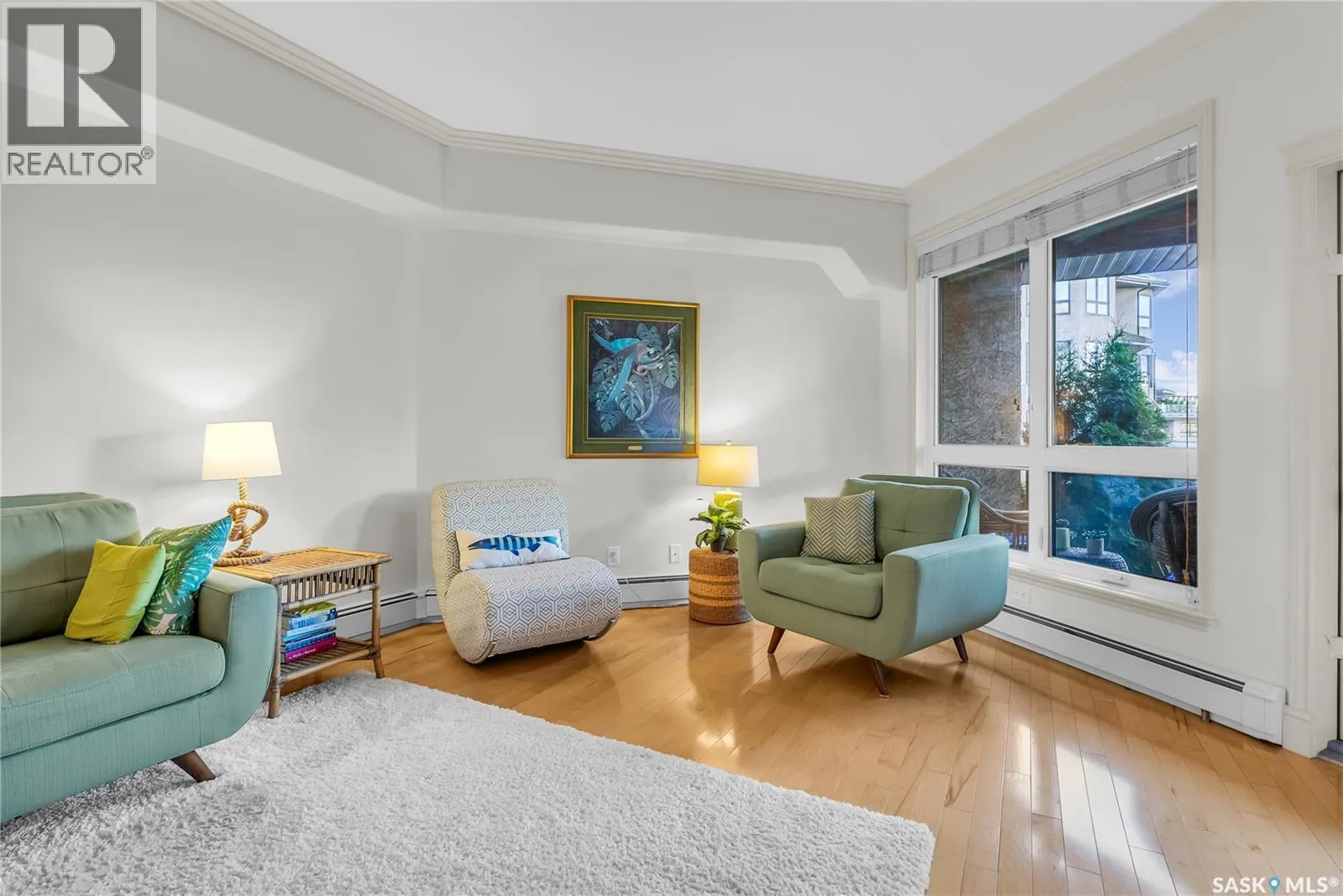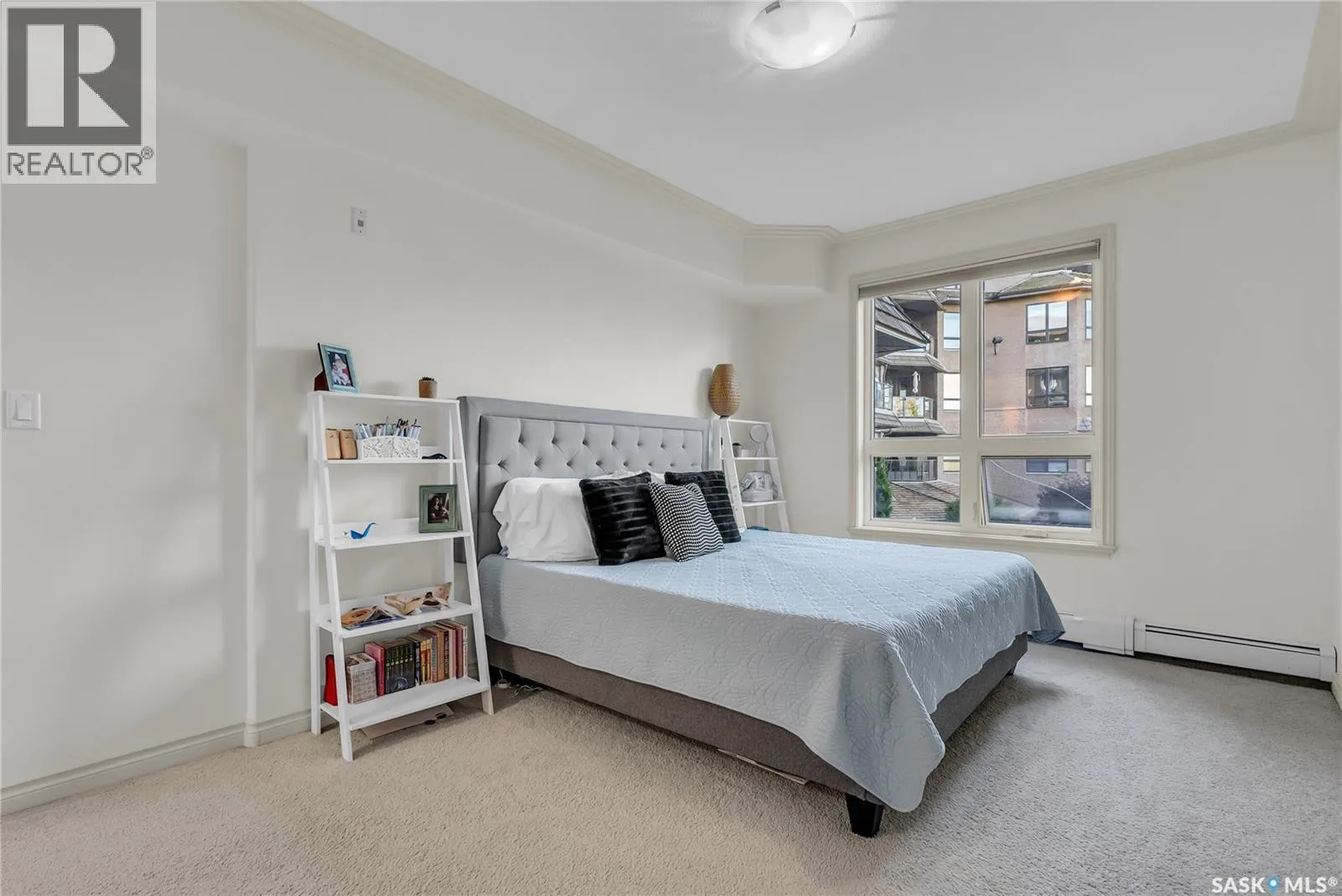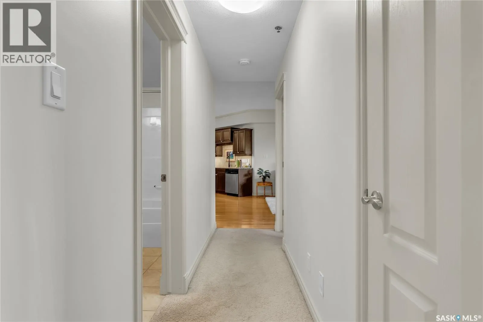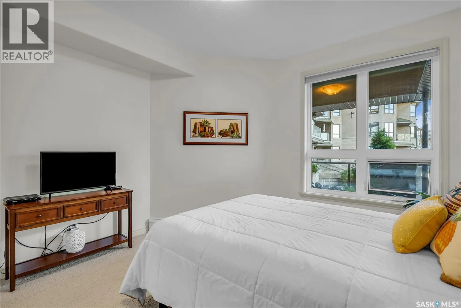 Experience the perfect blend of luxury, comfort, and convenience in this beautifully appointed condo at Waters Edge I, nestled along Saskatchewan Crescent West. Perfectly situated along the river, this home welcomes you with an open-concept design featuring a spacious kitchen with island, a dining area that flows seamlessly into the living room, and access to a southwest-facing balcony. Hardwood floors extend through the kitchen, dining, and living area, creating warmth and elegance throughout. The thoughtfully designed layout includes two bedrooms, a four-piece main bathroom, and a private three-piece ensuite off the primary bedroom with 2 large closets. Just off the kitchen, youâll find in-suite laundry with plenty of extra storage. There is an underground parking space with a storage unit directly in front of the stall. Residents enjoy the convenience of underground parking, elevator access, and a host of impressive building amenities including an exercise room, meeting room with kitchenette, pool table, foosball and guest suite. Steps from the Meewasin Valley Trail and within walking distance to Gabriel Dumont and Fred Mitchell Parks, this location offers the best of both worldsâeasy access to nature and the downtown core. Please note, pets are not permitted. (id:27476)